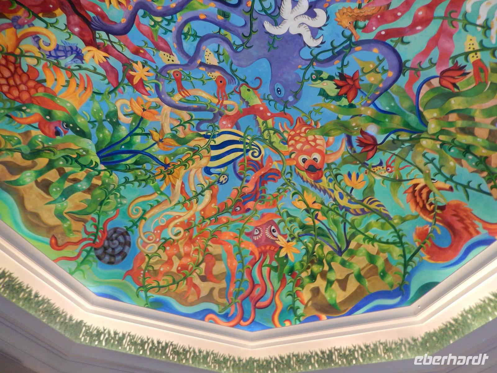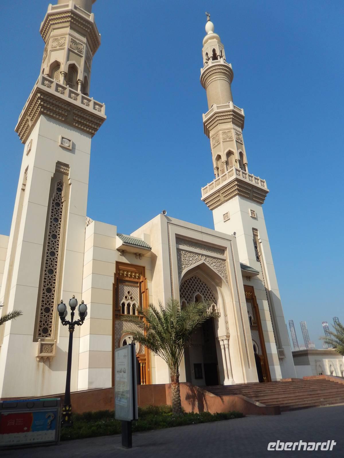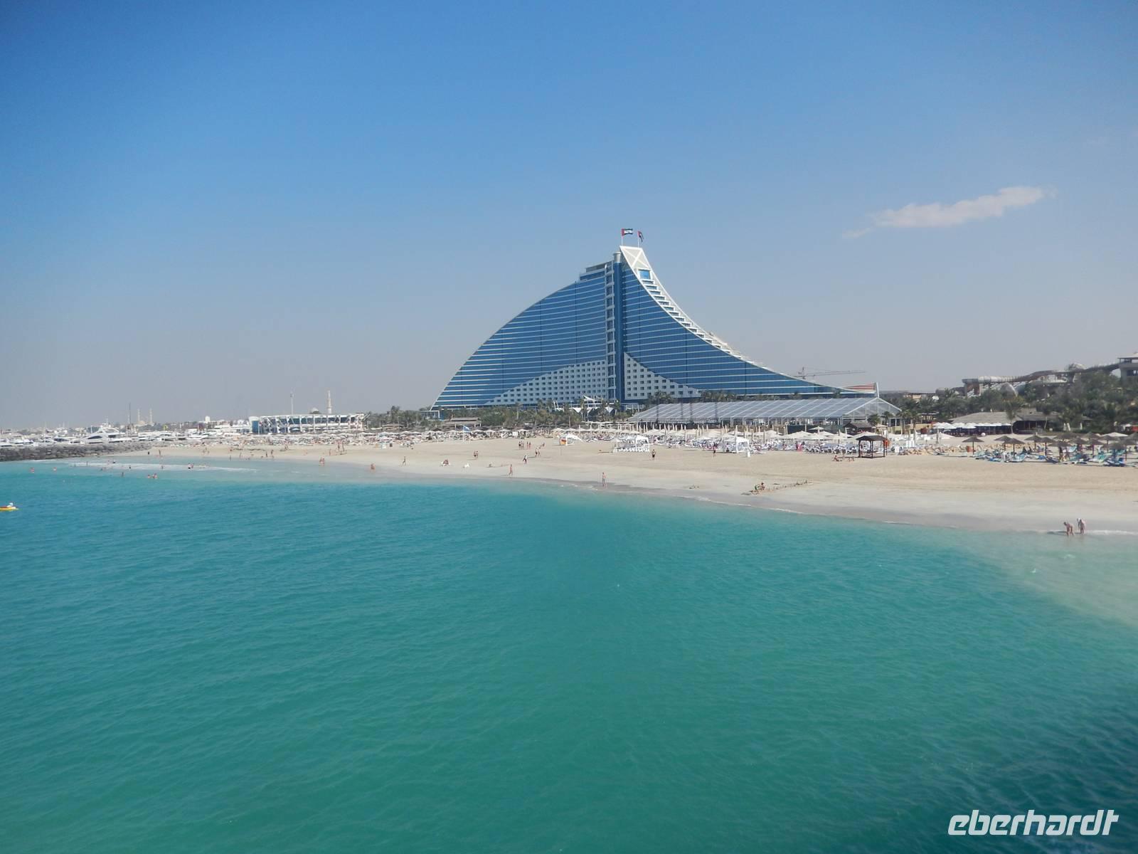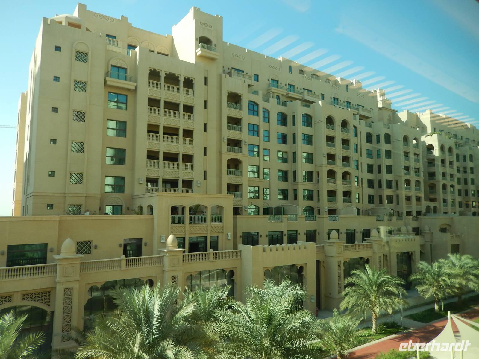 Unser Vormittag steht im Zeichen des Modernen Dubai. Zunächst halten wir für einen Fotostopp am Burj al Arab Hotel. Viele testen mit den Zehenspitzen die Wassertemperatur und empfinden diese als angenehm. Ein Höhepunkt jagt den nächsten und so erwartet uns The Palm Jumeirah - die Palme. An der Küste von Jumeirah erstreckt Sie sich 4,5 Kilometer ins Meer und ist die Erste von mehreren künstlichen Inseln, die fertiggestellt wurde. Über eine Brücke gelangt man auf den Stamm der Insel. Auf den insgesamt 16 Wedeln stehen ziemlich dicht nebeneinander Häuser und Villen, die zu den begehrtesten Immobilien des Emirats gehören. Anja erzählt uns, dass noch nicht alle der Häuser und Villen verkauft sind, so dass man diese teilweise zu sehr guten Preisen erwerben kann. Ein beinahe kreisförmiges, 150 Meter kreisförmiges Riff aus Sand und Steinen soll die Insel vor dem zerstörerischen Einfluss eines ungebremst anbrandenden Meeres schützen. Wir sehen, dass die Palme weitestgehend fertig gestellt ist, aber einige Baustellen doch noch zu bewältigen sind. Neben dieser Palme sollen noch zwei weitere geschaffen werden. Allerdings wurden diese Pläne aufgrund der Wirtschaftskrise erst einmal auf Eis gelegt. Am Scheitelpunkt der Palme sieht man das spektakuläre Themenhotel Atlantis. Ein gewaltiger rosfarbener Palast, der mit seiner Gestaltung Assoziationen an versunkene Unterwasserwelten wecken will. Leider haben Nicht-Hotelgäste keinen Zutritt aber Anja und Vicky haben sich schon etwas überlegt. So laden wir alle unseren lieben Gäste zu einer Fahrt mit der Monorail ein. Das Besondere daran ist, dass wir so zumindest in den Eingangsbereich des Hotels gelangen und dort einen Eindruck gewinnen wie es wohl ganz innen aussehen muss. So besorgen Anja und ich die Ticktes für die Monorail. Wir spazieren zusammen zu unserer Abfahrtsstation und genießen eine herrliche Fahrt mit dieser Schwebebahn über die Palme. So gewinnen wir auch wieder andere Perspektive vom Atlantis Hotel und der Palme mit ihren Wedeln als von unserem Bus aus.