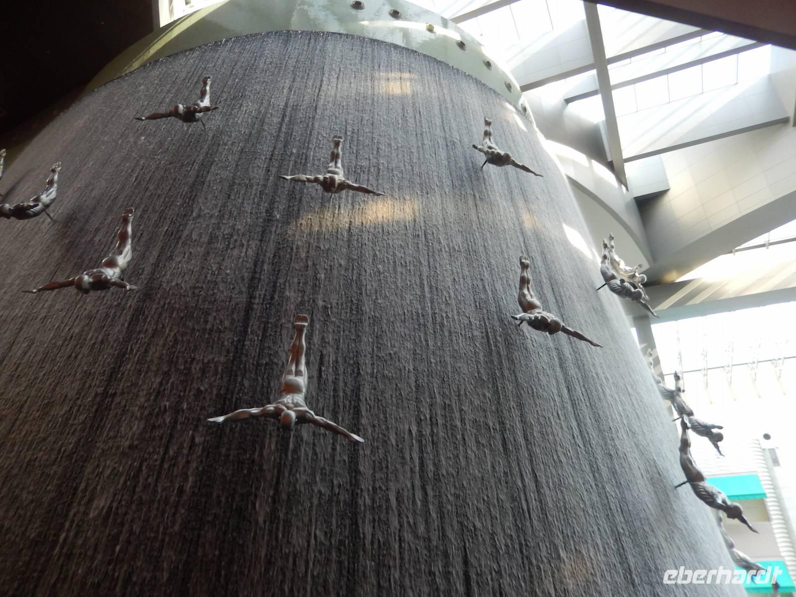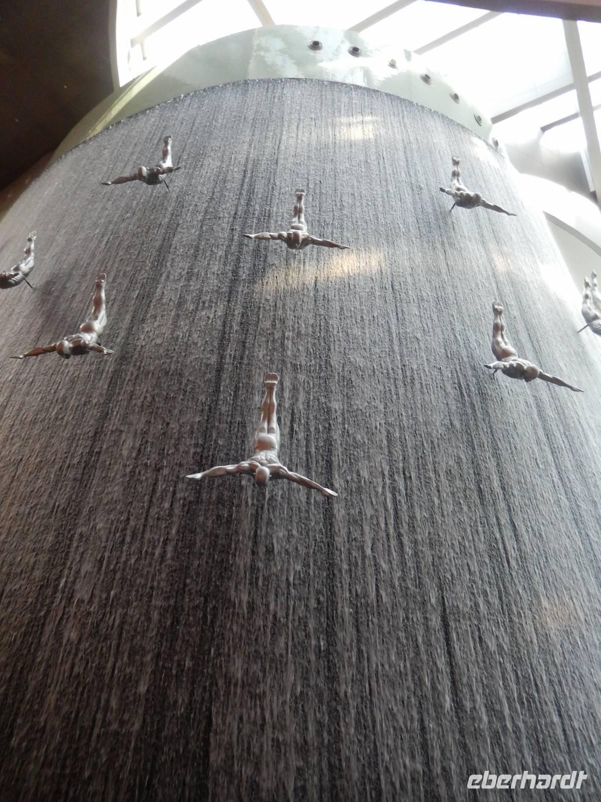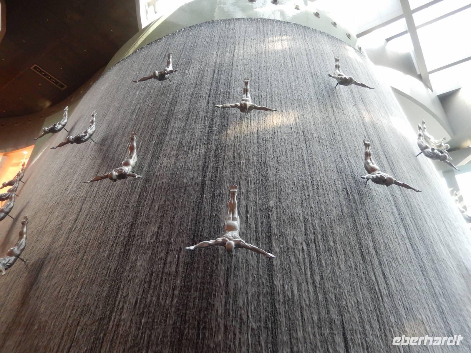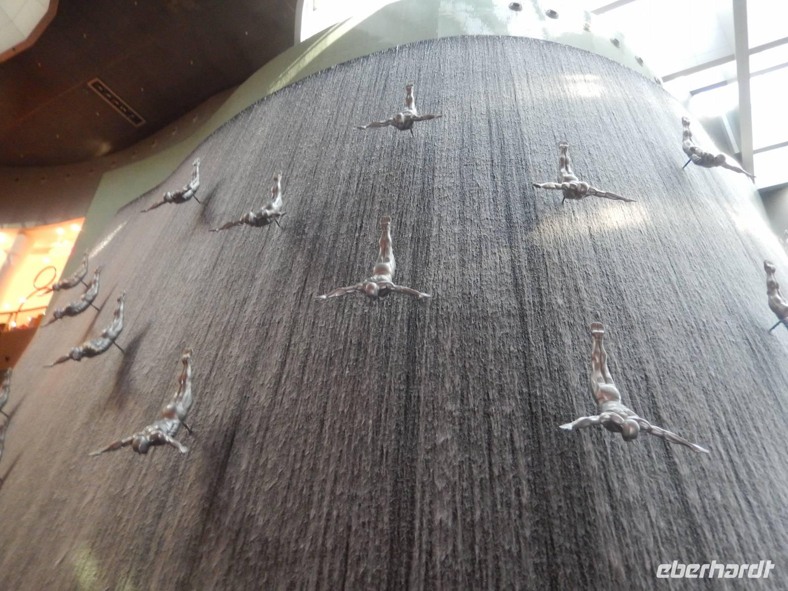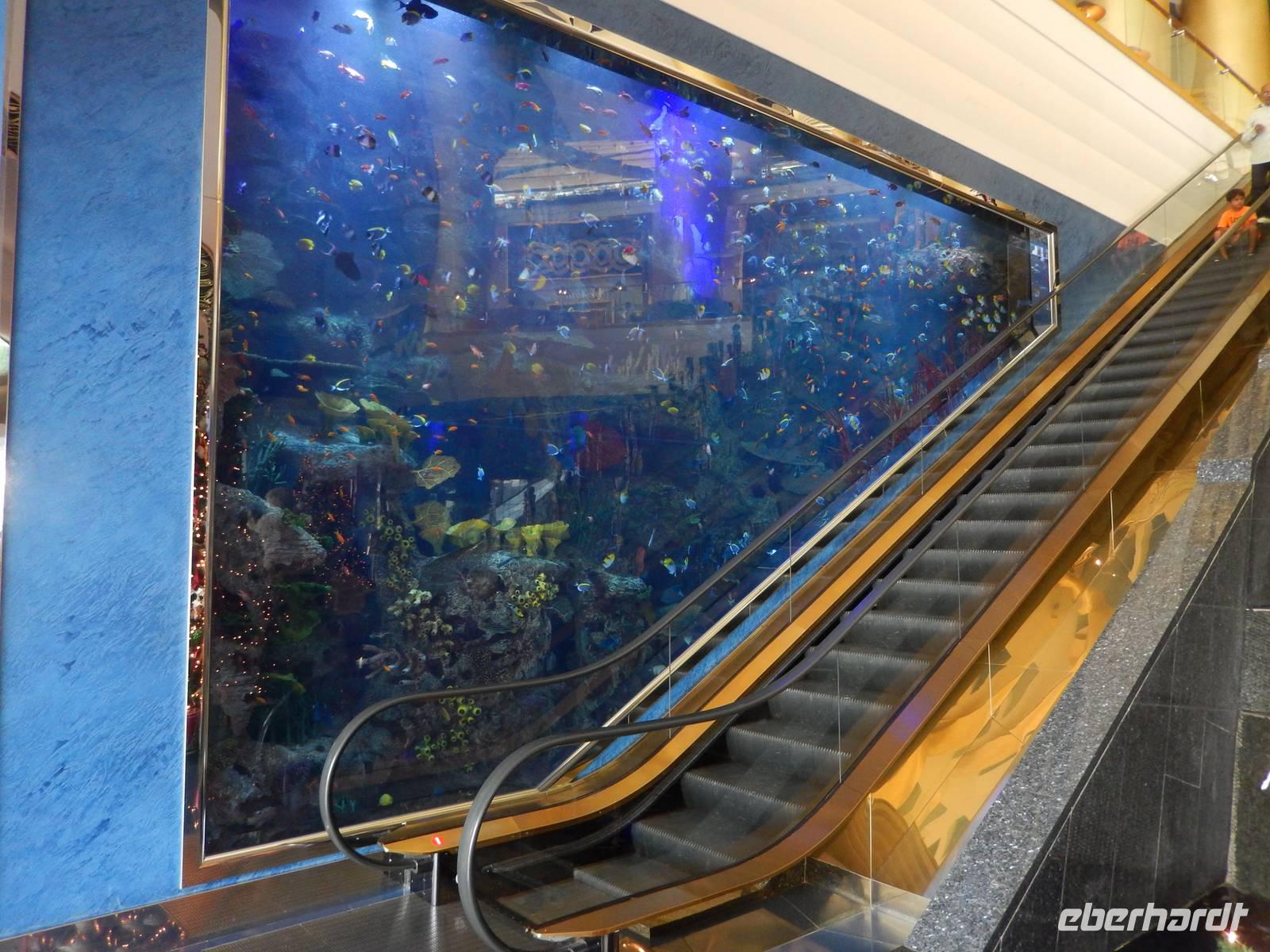 Nach diesen einzigartigen Erlebnissen erwartete uns die legendäre Dubai Mall, in der Nähe des Burj Khalifa gelegen. Sie beherbergt über 1200 Geschäfte. Anja erklärt uns alles ganz genau, so dass wir uns gut zurecht finden konnten. Danach laufen wir zum, wahrscheinlich für viele von uns, größtem und gigantischstem Höhepunkt unserer gemeinsamen Reise: Das von dem US-amerikanischen Architekten Adrian Smith entworfene neue Wahrzeichen Dubais, mit 828 Metern das höchste Gebäude der Welt, der legendäre Burj Kahlifa. Schon oft haben wir Ihn auf unserer Reise gesehen, aber erst aus nächster Nähe zeigt er uns seine spektakuläre Größe. Wie eine Rakete ragt der sich nach oben verjüngende Turm am Beginn der Sheikh Zayed Road in den Himmel. So fahren alle mit einem etwas mulmigen Gefühl mit dem Fahrstuhl in einer Minute, in 10 Metern pro Sekunde, nach oben bis zur 124. Etage, die sich auf 442 Metern Höhe befindet. Hier oben angekommen wurde vielen von uns schon etwas anders. Die 360-Grad-Plattform ist wandhoch verglast und hat Zugang zu einem offenen Balkon, von dem alle den einmaligen Ausblick genießen. Dieses Erlebnis werden Sie sicher noch lange in Ihren Köpfen tragen! Nach einer kurzen aber feinen Mittagspause erwartet uns zunächst das gigantische Aquarium, in dem sich 33 000 Meerestiere tummeln und anschließend der Unterwasserzoo. Durch einen Tunnel ergeben sich weitere Einblicke in die Unterwasserwelt. Außerdem besticht die Mall noch mit einer Eislaufbahn und einer spektakulären Kletterwand sowie einem Wasserfall. Anschließend bleibt noch genügend Zeit für eigene Erkundungen.