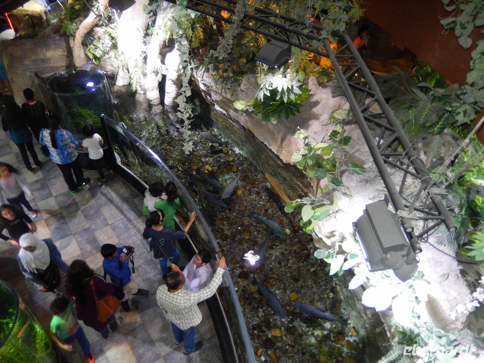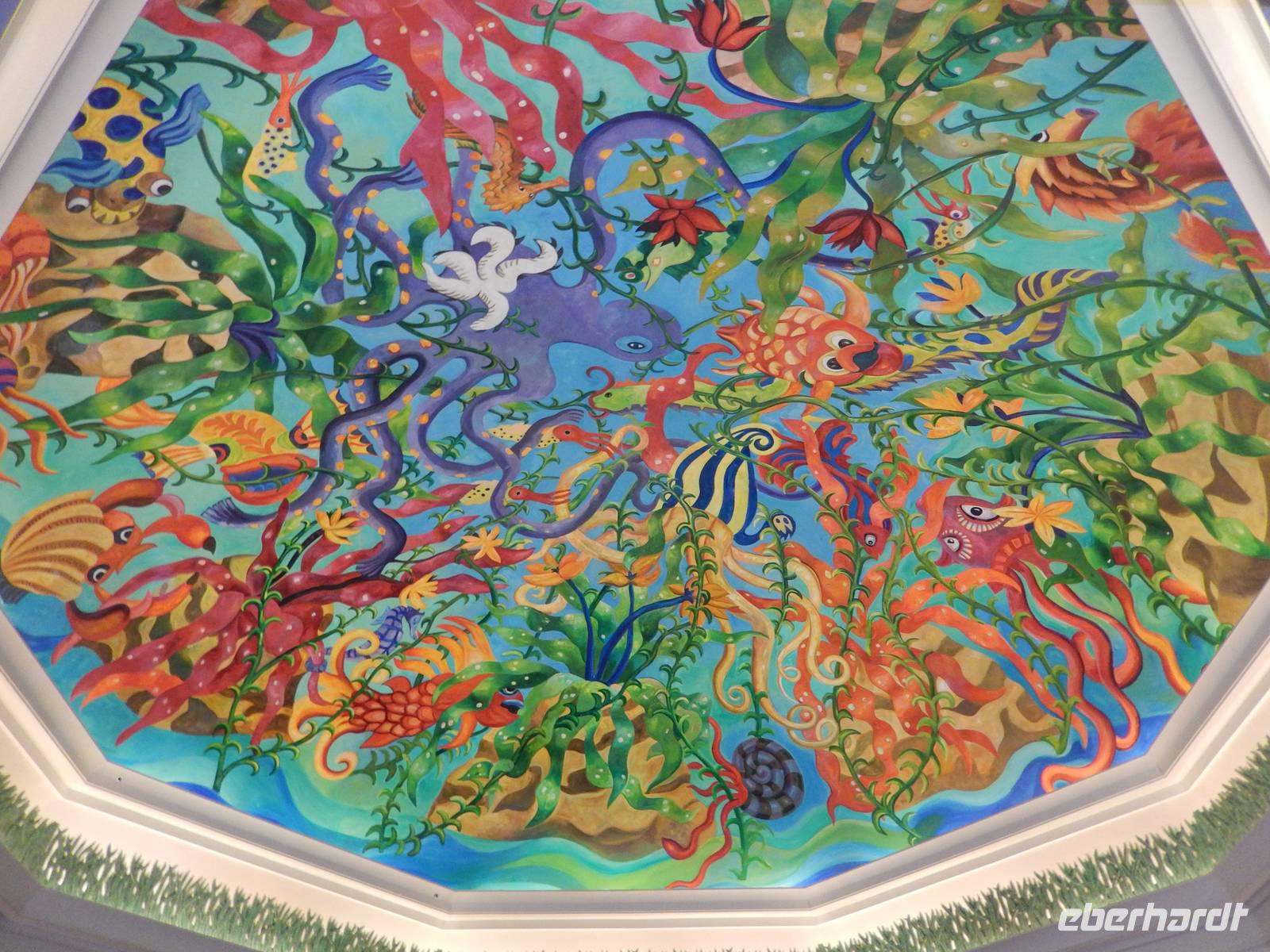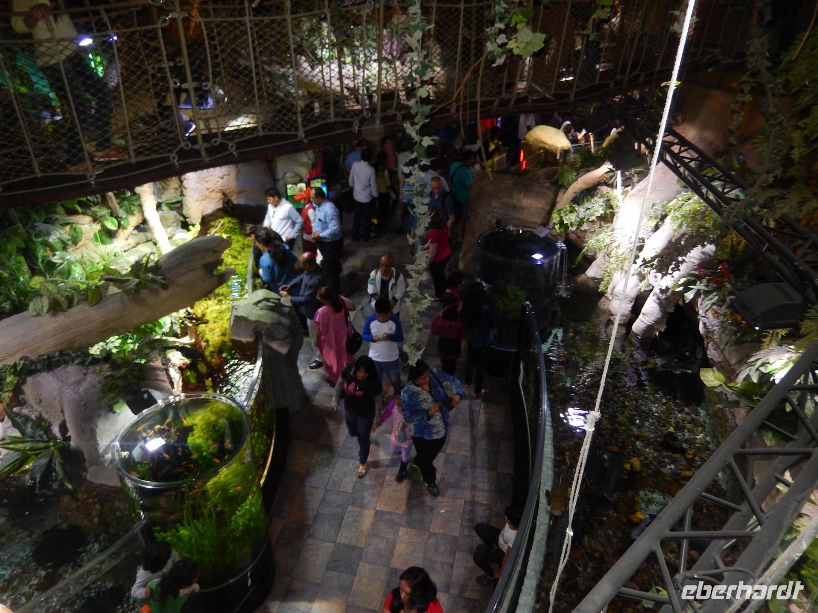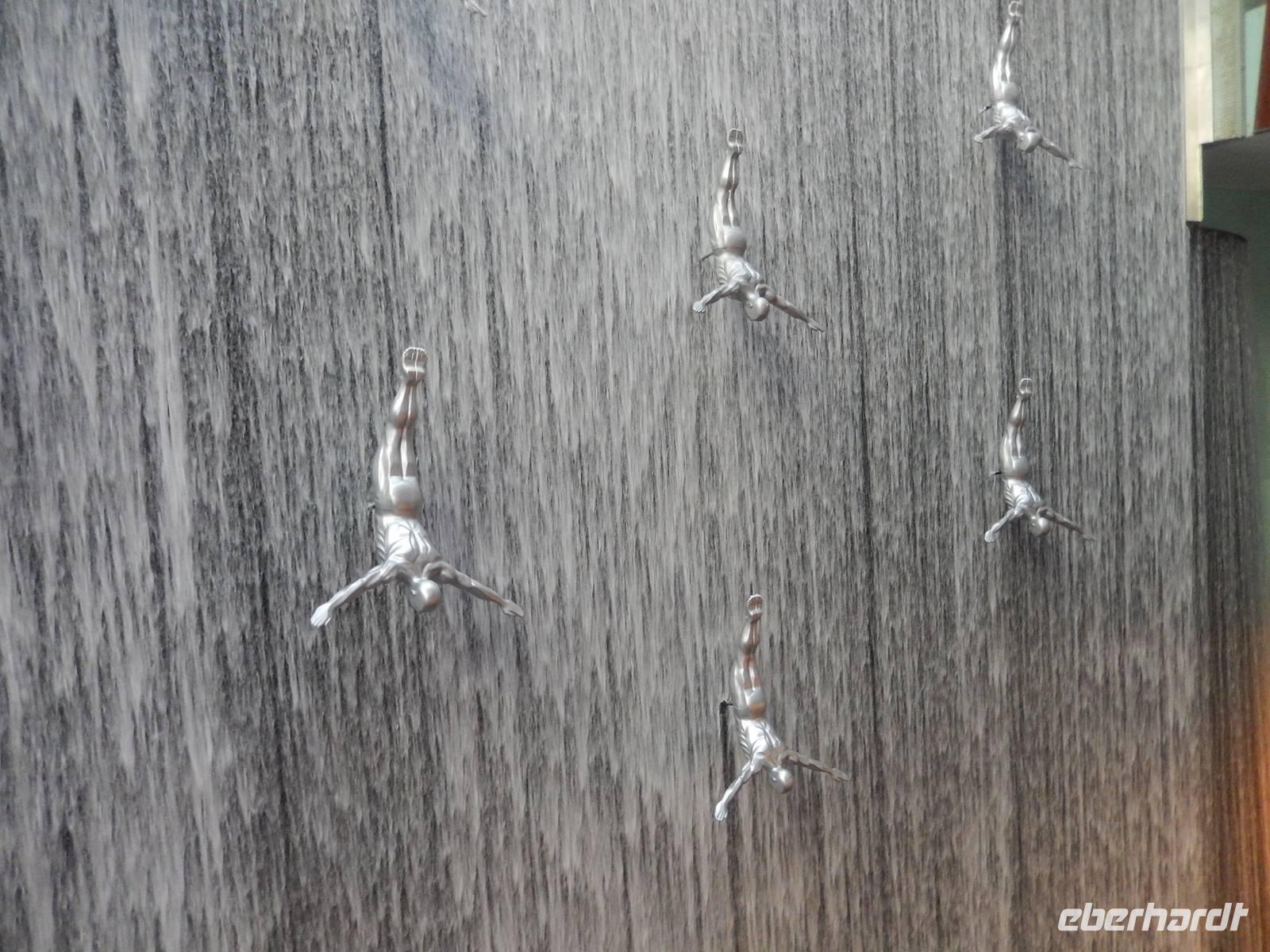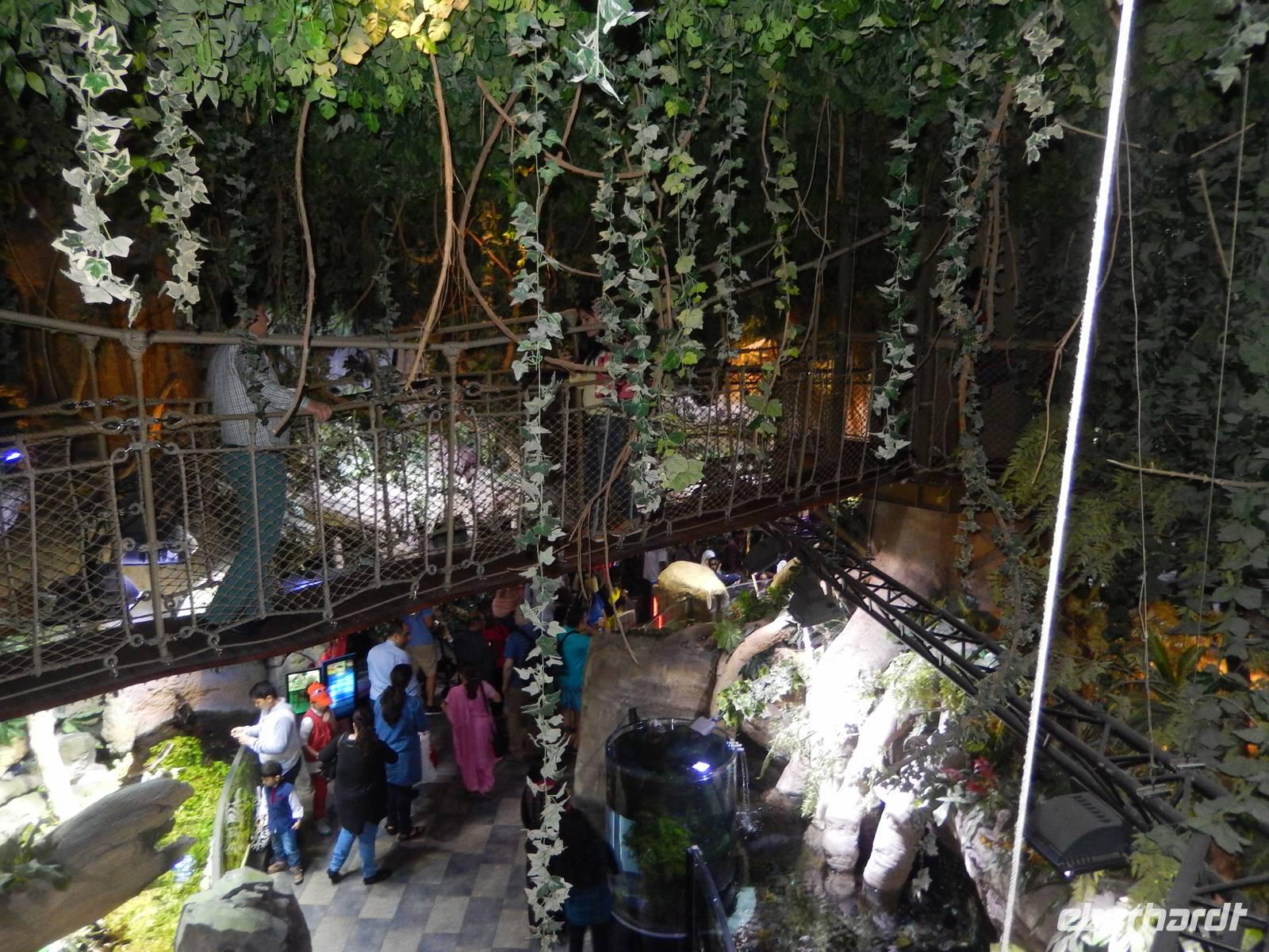 Nach diesen einzigartigen Erlebnissen erwartete uns die legendäre Dubai Mall, in der Nähe des Burj Khalifa gelegen. Sie beherbergt über 1200 Geschäfte. Anja erklärt uns alles ganz genau, so dass wir uns gut zurecht finden konnten. Danach laufen wir zum, wahrscheinlich für viele von uns, größtem und gigantischstem Höhepunkt unserer gemeinsamen Reise: Das von dem US-amerikanischen Architekten Adrian Smith entworfene neue Wahrzeichen Dubais, mit 828 Metern das höchste Gebäude der Welt, der legendäre Burj Kahlifa. Schon oft haben wir Ihn auf unserer Reise gesehen, aber erst aus nächster Nähe zeigt er uns seine spektakuläre Größe. Wie eine Rakete ragt der sich nach oben verjüngende Turm am Beginn der Sheikh Zayed Road in den Himmel. So fahren alle mit einem etwas mulmigen Gefühl mit dem Fahrstuhl in einer Minute, in 10 Metern pro Sekunde, nach oben bis zur 124. Etage, die sich auf 442 Metern Höhe befindet. Hier oben angekommen wurde vielen von uns schon etwas anders. Die 360-Grad-Plattform ist wandhoch verglast und hat Zugang zu einem offenen Balkon, von dem alle den einmaligen Ausblick genießen. Dieses Erlebnis werden Sie sicher noch lange in Ihren Köpfen tragen! Nach einer kurzen aber feinen Mittagspause erwartet uns zunächst das gigantische Aquarium, in dem sich 33 000 Meerestiere tummeln und anschließend der Unterwasserzoo. Durch einen Tunnel ergeben sich weitere Einblicke in die Unterwasserwelt. Außerdem besticht die Mall noch mit einer Eislaufbahn und einer spektakulären Kletterwand sowie einem Wasserfall. Anschließend bleibt noch genügend Zeit für eigene Erkundungen.