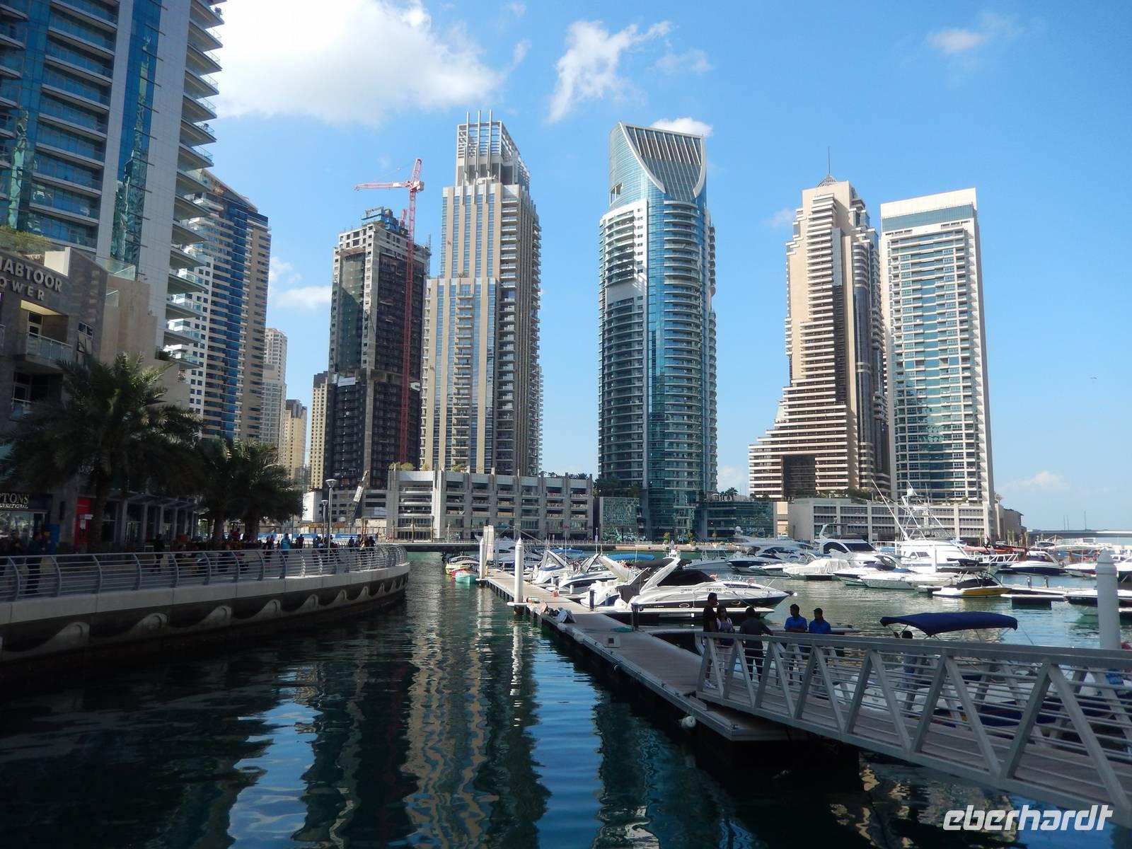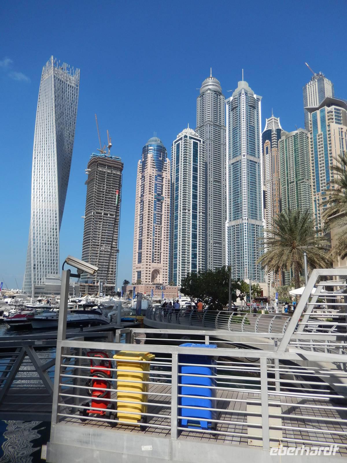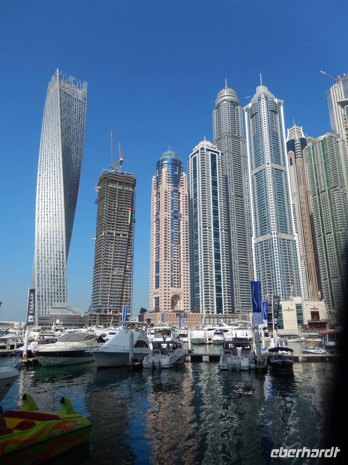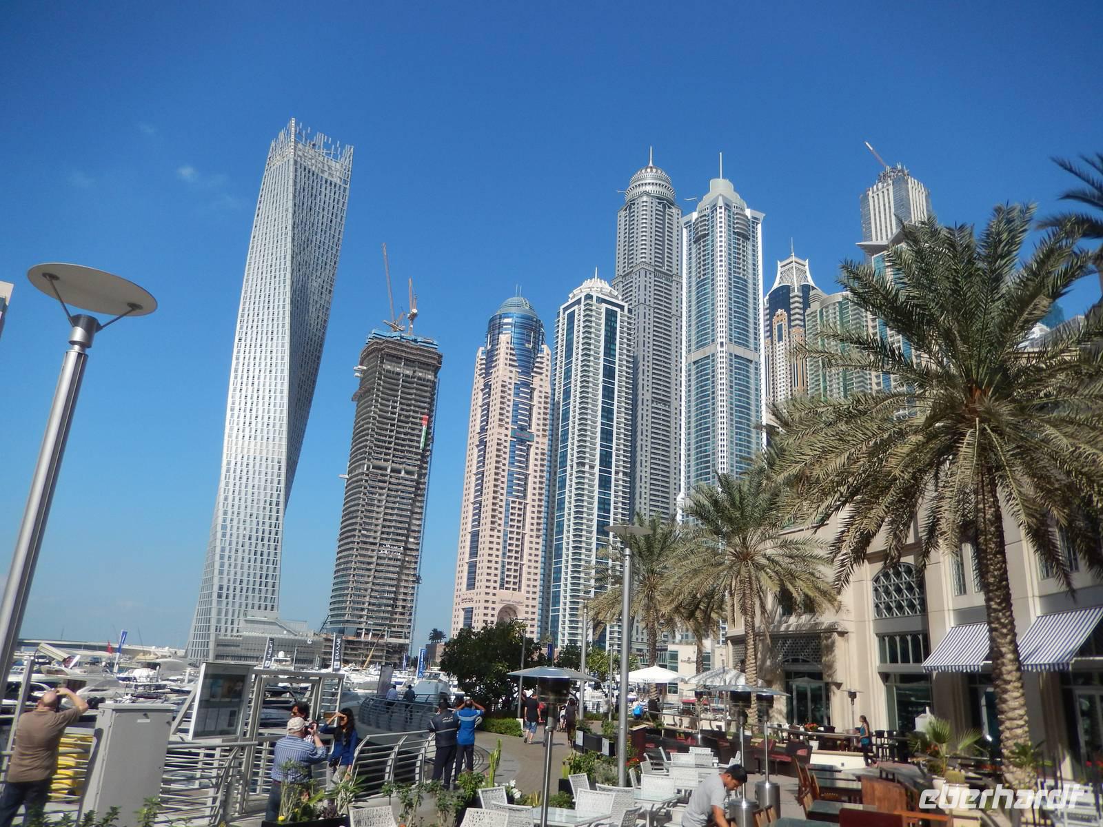 Anschließend geht es weiter zur Dubai Marina. Sie entstand an einer vier Kilometer langen künstlichen Lagune. Hier wurden neben dem Yachthafen - Hotels, Parks, Supermärkte, Bürogebäude und Wohnhäuser gebaut. Mit durchschnittlichen Höhen von um die 150 Meter fühlt man sich hier ein wenig an Hongkong oder Manhattan erinnert. So bummeln wir entspannt entlang der Lagune und staunen über das gedrehte Gebäude, welches sich vor unseren Augen auftürmt. Nach all den vielen Eindrücken sollte dies noch nicht das Ende unseres Ausfluges sein. Wir fahren zur Mall of Emirates. Schon von Weitem erblickten wir das gigantische Einkaufszentrum. Geschäfte über Geschäfte, Schuhe, Taschen soweit das Auge reicht. Doch all das sollte nicht alles sein. Dubai hat eben immer etwas Neues zu bieten. Der Kälte aus Deutschland entflohen, stellten wir schnell fest, dass es auch in Dubai den Winter gibt. Skifahren in der Wüste. Die 85 Meter hohe Indoor-Skiarena "Ski Dubai" beeindruckt als weiße Winter-Wunderwelt mit Kunstschnee und alpiner Illusion seine Besucher und so auch uns. Mit einer Sesselbahn gelangen die Skifahrer zu den fünf Pisten unterschiedlicher Schwierigkeitsgrade. In Dubai gibt es eben nichts, was es nicht gibt. So staunen wir nicht schlecht über die Einheimischen in ihren Schneeschuhen. Außerdem tauschen wir endlich unsere vielen vielen Euros in Dirham und fühlen uns so schon fast wie Emiratis. Nach vielen Erlebnissen fahren wir zurück zu unserem Hotel.