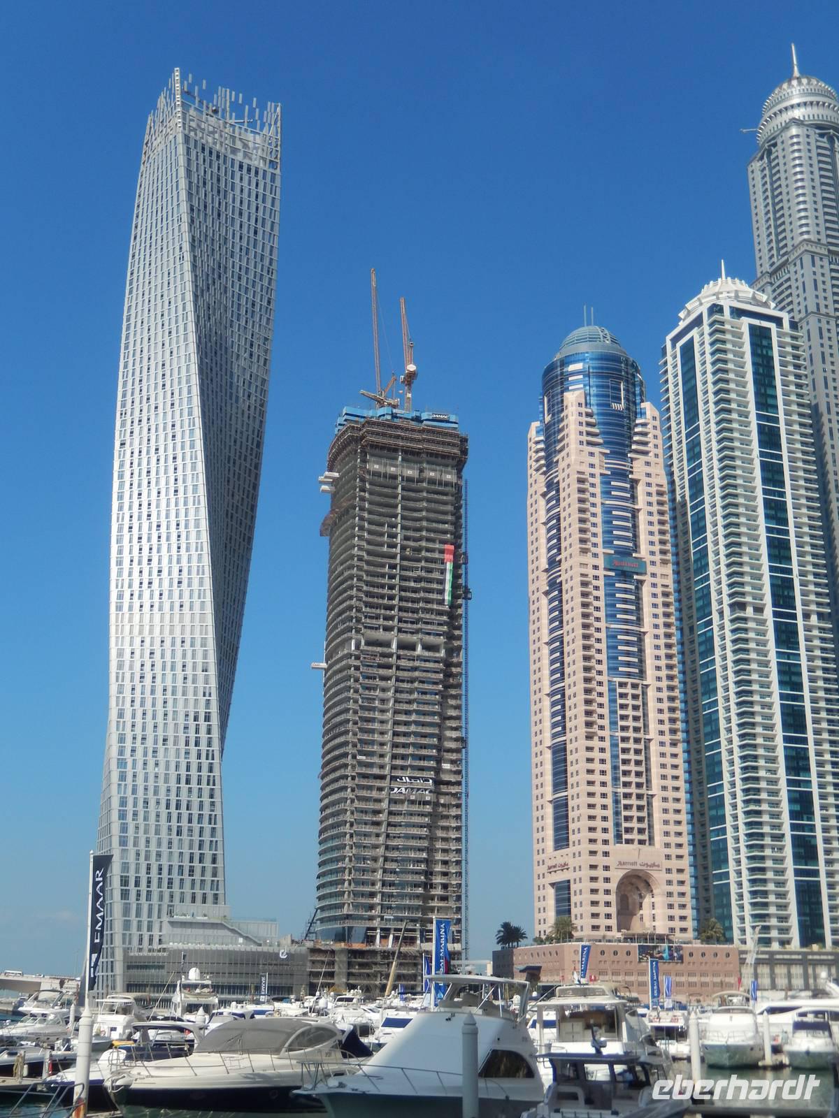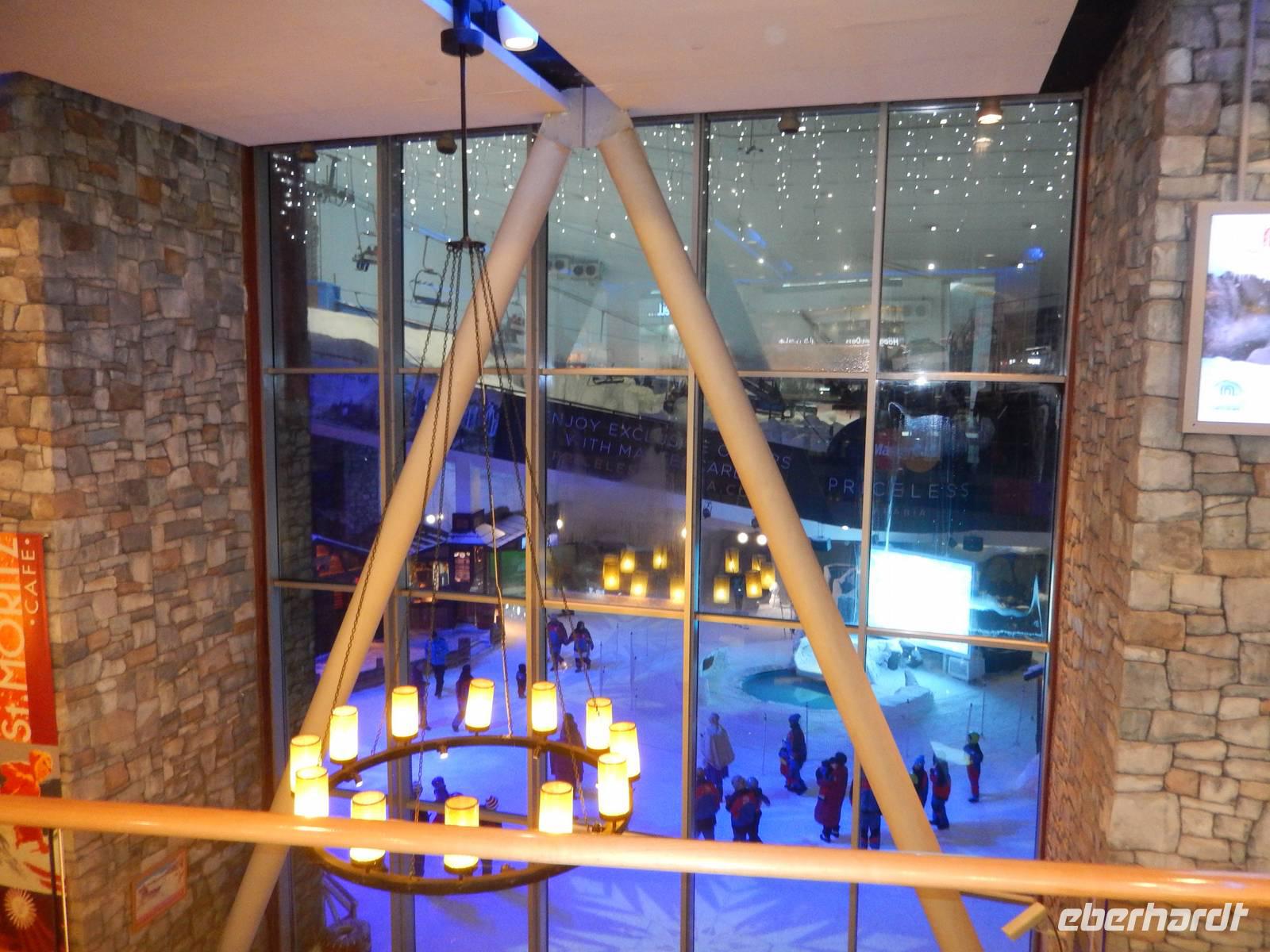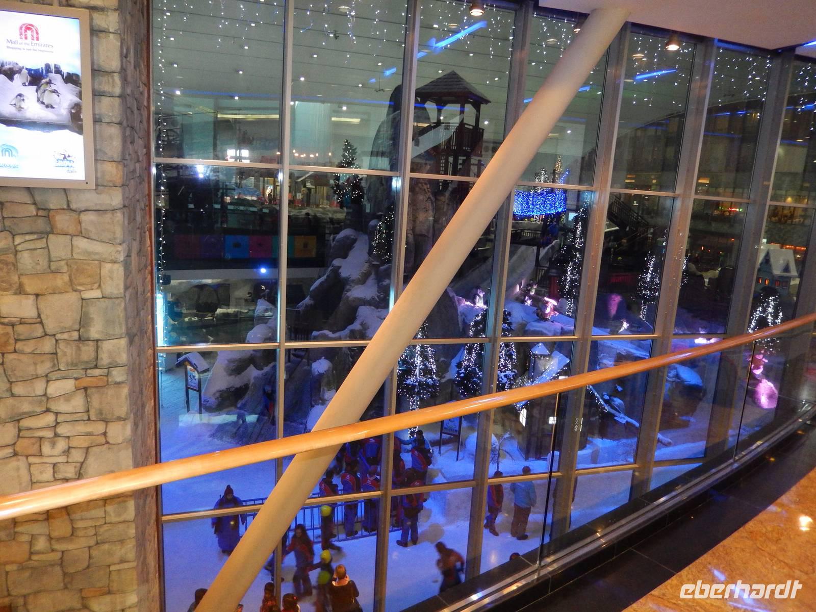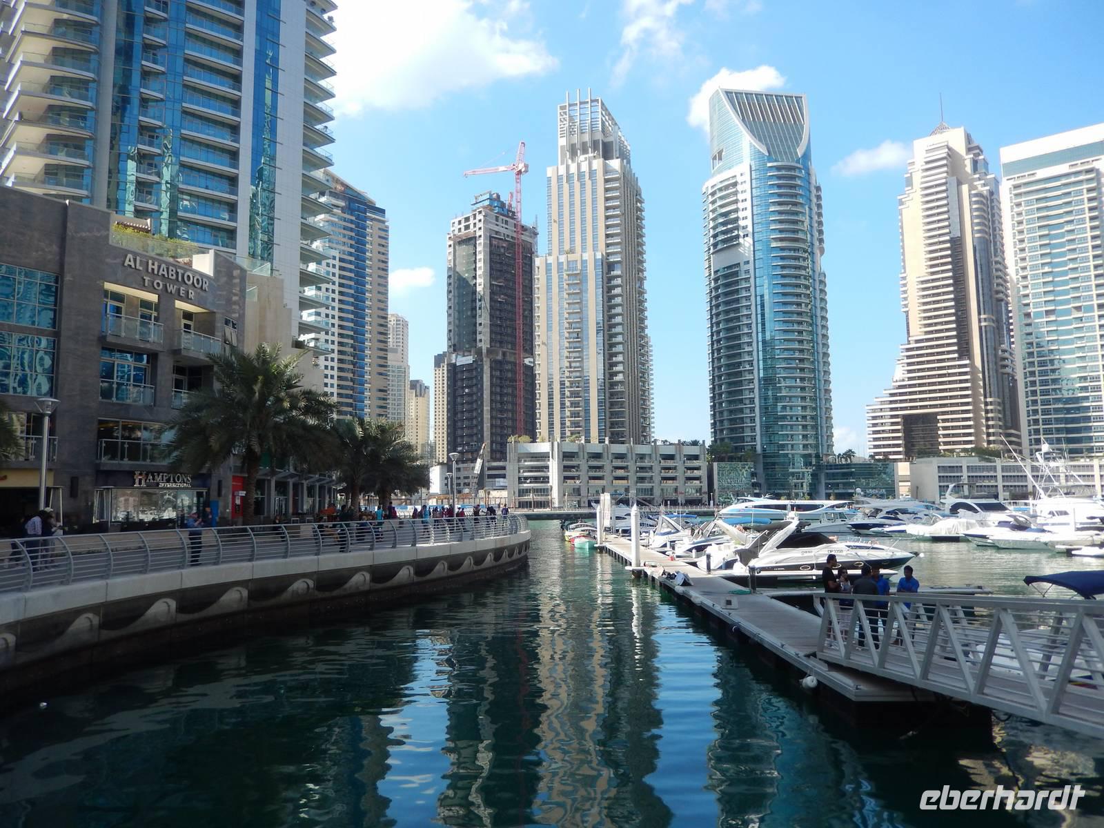 Anschließend geht es weiter zur Dubai Marina. Sie entstand an einer vier Kilometer langen künstlichen Lagune. Hier wurden neben dem Yachthafen - Hotels, Parks, Supermärkte, Bürogebäude und Wohnhäuser gebaut. Mit durchschnittlichen Höhen von um die 150 Meter fühlt man sich hier ein wenig an Hongkong oder Manhattan erinnert. So bummeln wir entspannt entlang der Lagune und staunen über das gedrehte Gebäude, welches sich vor unseren Augen auftürmt. Nach all den vielen Eindrücken sollte dies noch nicht das Ende unseres Ausfluges sein. Wir fahren zur Mall of Emirates. Schon von Weitem erblickten wir das gigantische Einkaufszentrum. Geschäfte über Geschäfte, Schuhe, Taschen soweit das Auge reicht. Doch all das sollte nicht alles sein. Dubai hat eben immer etwas Neues zu bieten. Der Kälte aus Deutschland entflohen, stellten wir schnell fest, dass es auch in Dubai den Winter gibt. Skifahren in der Wüste. Die 85 Meter hohe Indoor-Skiarena "Ski Dubai" beeindruckt als weiße Winter-Wunderwelt mit Kunstschnee und alpiner Illusion seine Besucher und so auch uns. Mit einer Sesselbahn gelangen die Skifahrer zu den fünf Pisten unterschiedlicher Schwierigkeitsgrade. In Dubai gibt es eben nichts, was es nicht gibt. So staunen wir nicht schlecht über die Einheimischen in ihren Schneeschuhen. Außerdem tauschen wir endlich unsere vielen vielen Euros in Dirham und fühlen uns so schon fast wie Emiratis. Nach vielen Erlebnissen fahren wir zurück zu unserem Hotel.