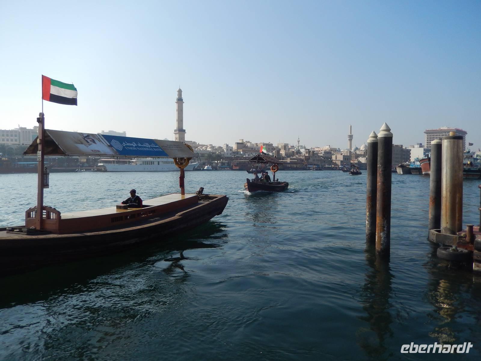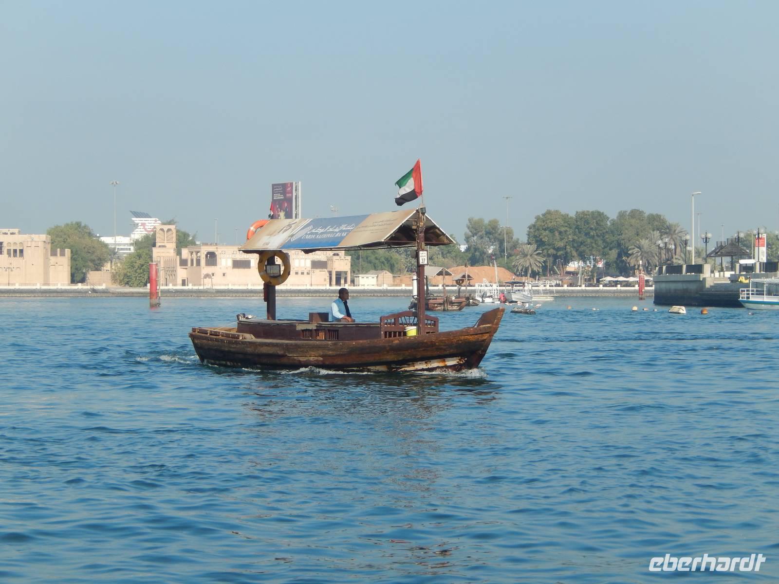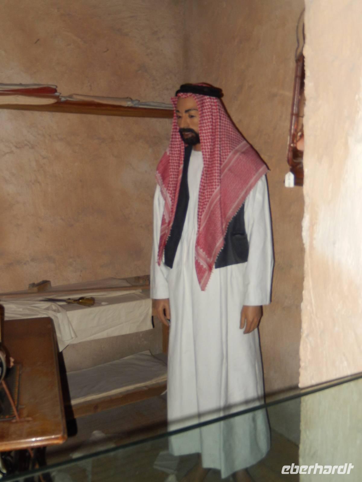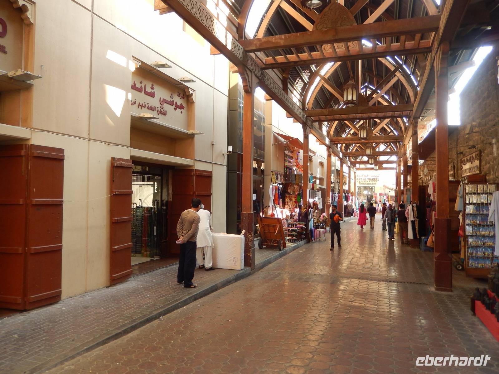 Am Vormittag holt uns unsere liebe Anja am Hotel ab, natürlich immer mit einem Lächeln auf den Lippen und einer Herzlichkeit die seinesgleichen sucht. Mit unseren Fotoapparaten im Gepäck machten wir uns auf zur Besichtigung des Alten Dubai. Zunächste besuchen wir das Dubai-Museum, welches direkt gegenüber von unserem Hotel liegt. Hier sehen wir in einem beeindruckenden Film, wie sich Dubai von 1930 bis heute entwickelt hat. Gemeinsam schlendern wir durch den Stadtteil Bastakiya. In den großen, meist zweistöckigen Häusern wohnten bis Mitte des 20. Jahrhunderts wohlhabende Kaufmannsfamilien aus dem Iran und aus Indien. Bei unserem gemütlichen Spaziergang sehen wir nicht nur die einheimischen Männer in Ihren "Dishdashas" sondern auch die Frauen mit Ihren "Abayas". Um auf die gegenüberliegende Seite des Creeks zu gelangen rüsten wir uns für eine Fahrt mit dem Wassertaxi, der sogenannten "Abra". Die flachen Holzboote mit zwei Sitzreihen und Dieselmotor sind für die vielen asiatischen und arabischen Gastarbeiter ein unentbehrliches Transportmittel. Für uns als Touristen stellen die hölzernen Kähne eine günstige und stimmungsvolle Möglichkeit dar, Dubai vom Wasser aus kennen zu lernen. So genießen wir die fröhliche Fahrt unter der arabischen Sonne und können unsere Augen kaum von Dubais spektakulärer Kulisse lassen. Heil und trocken angekommen, finden wir uns in der bunten Welt der arabischen Märkte wieder.
