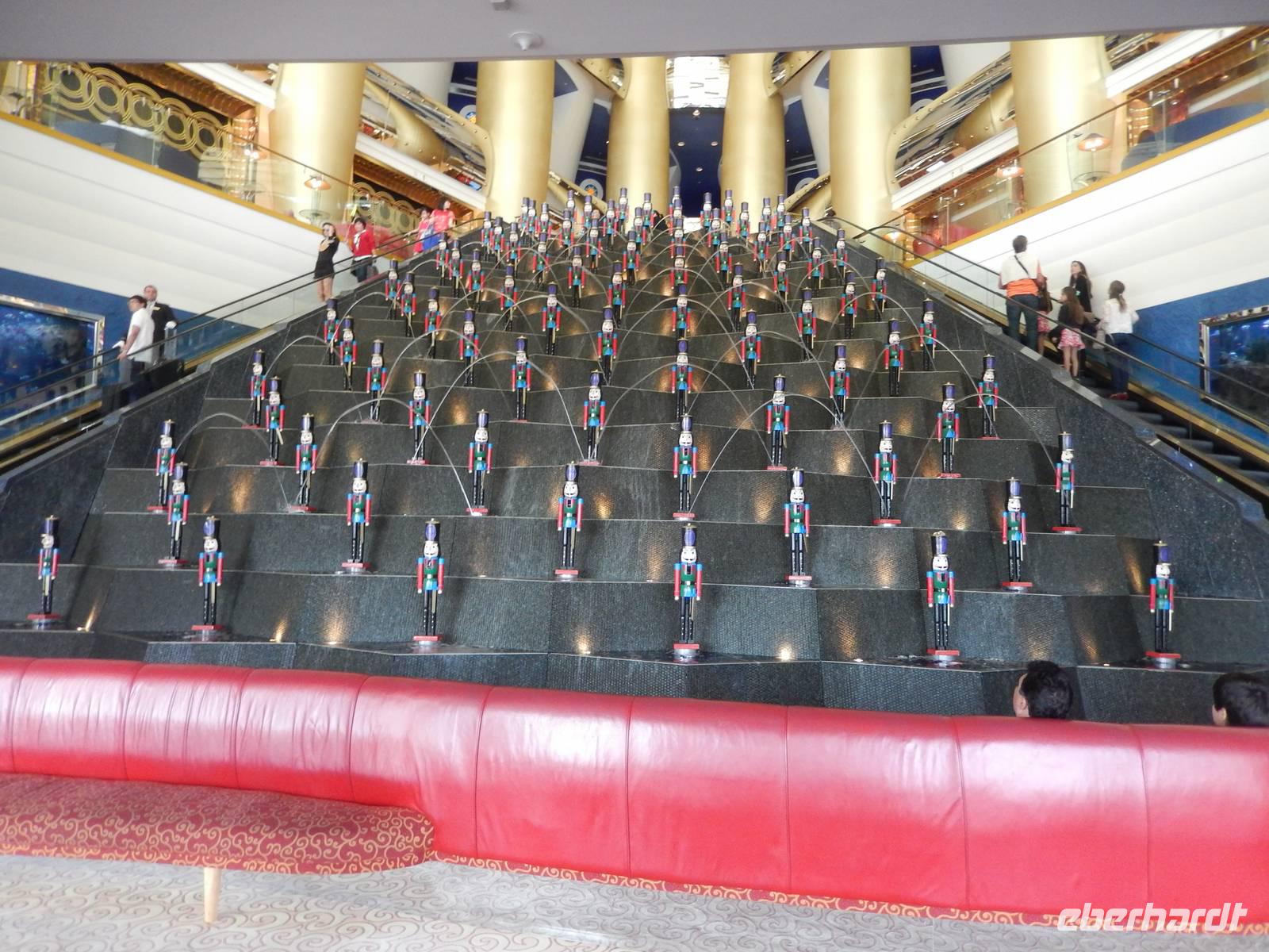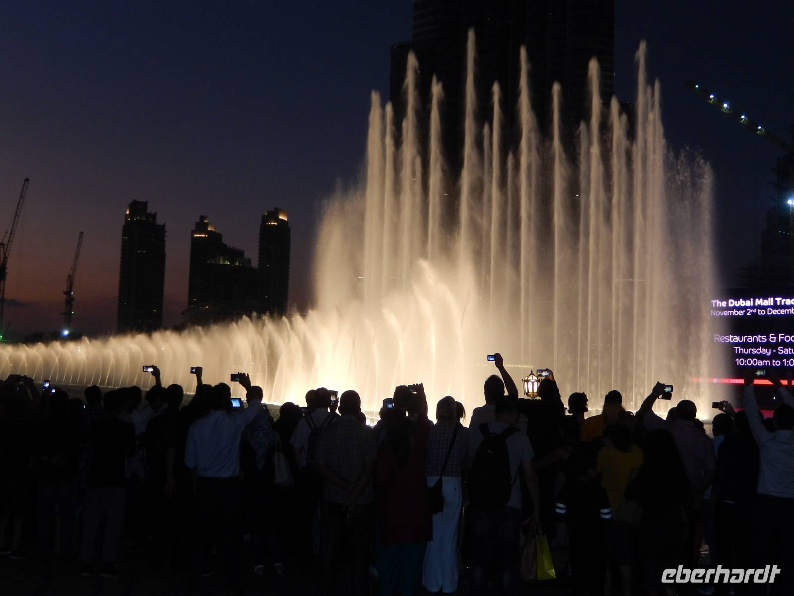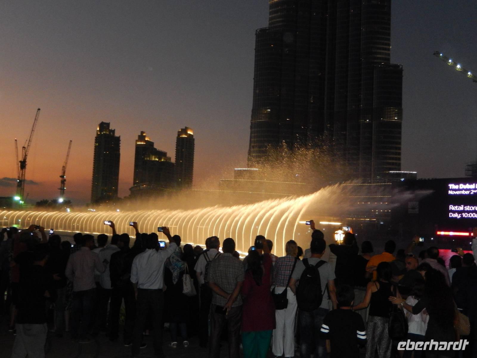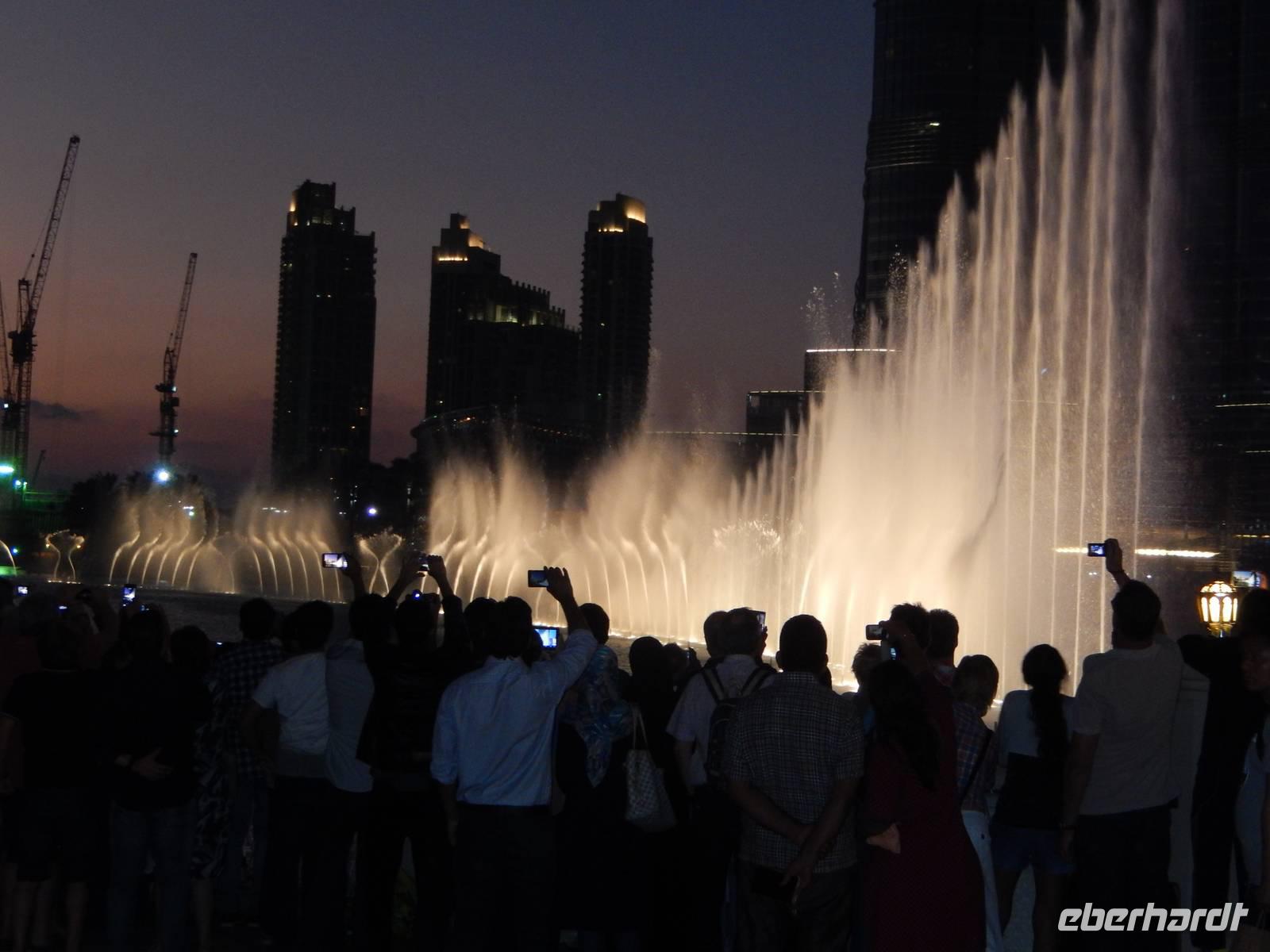 Der Burj Khalifa ist auch das Zentrum des neu geschaffenen Stadtteils Downtown Burj Khalifa, zu dem ein künstlicher See mit der 150 Meter hohen Dubai Fountain gehört. Hier erfreuen wir uns an dem abendlich in regelmäßigen Abständen stattfindenden Licht - und Wasserspiel. Untermalt von klassischer und arabischer Musik, tanzen Wasserfontänen, in Szene gesetzt von Tausenden von Lichtern. Ein herrliches Schauspiel!
