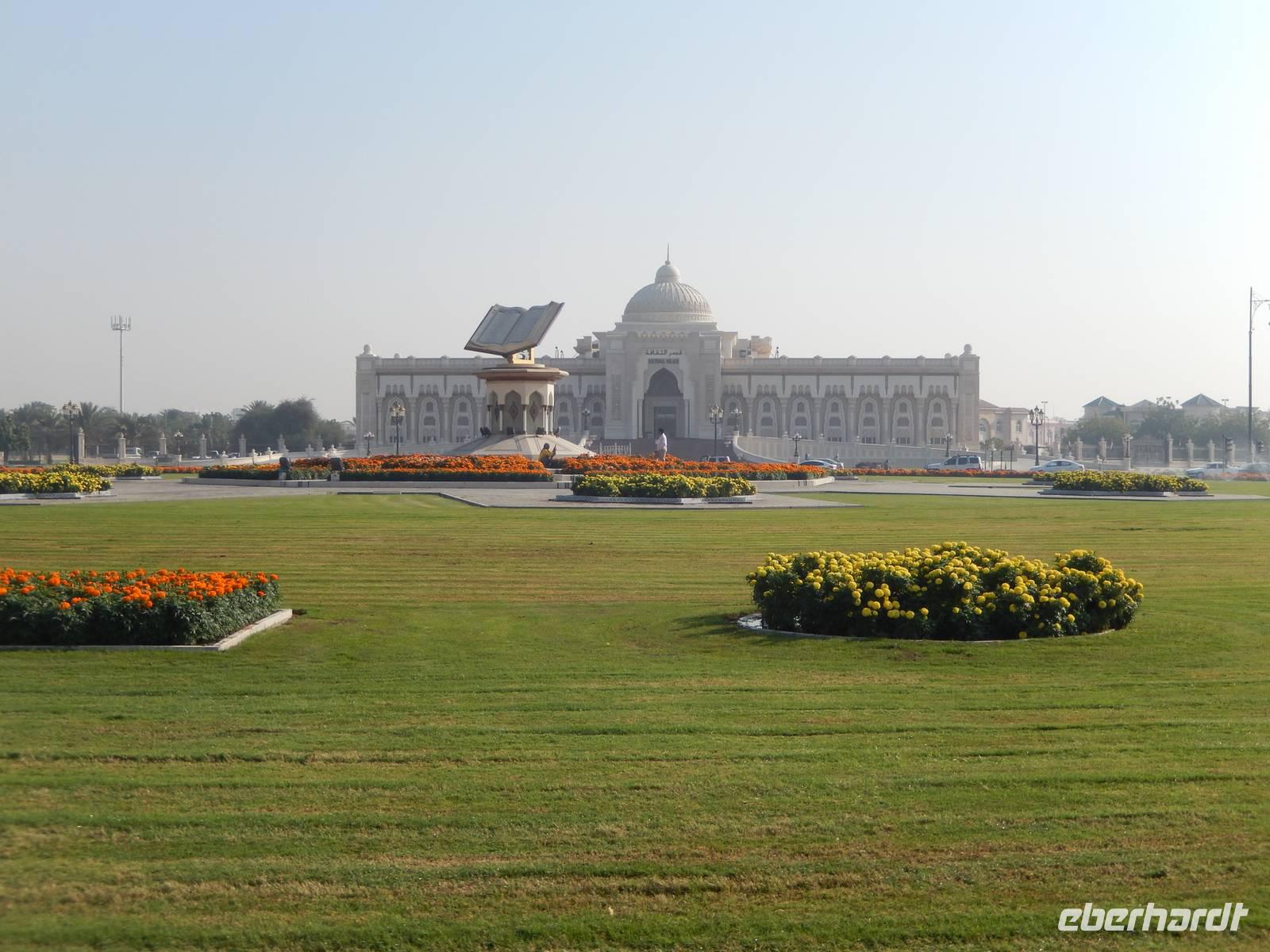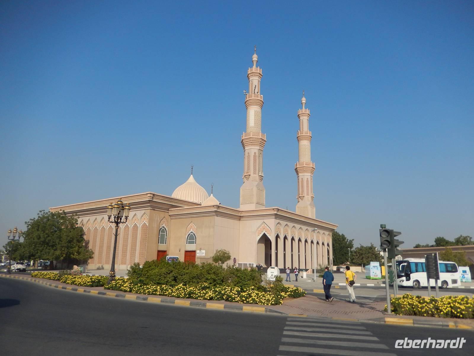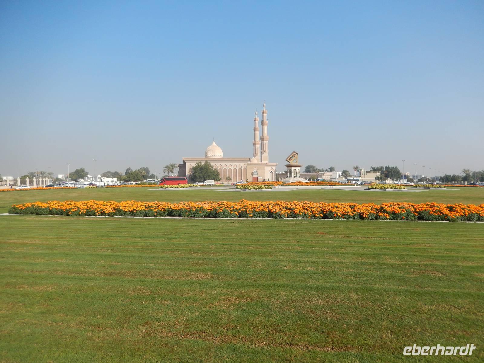 Heute reisen wir in das drittgrößte Emirat der Vereinigten Arabischen Emirate, nach Sharjah. Schnell fällt uns auf, dass Sharjah im Gegensatz zu Dubai und Abu Dhabi weniger aufwendig gestaltet ist. Auffällig sind hier vor allem die großzügigen Grünanlagen und die perfekt restaurierten islamischen Bauwerke. Bei einer Stadtrundfahrt lernen wir das Emirat näher kennen. Wir halten zuerst an der King Faisal Moschee und an dem wunderschönen Kreisverkehr mit seinem Koran, der viel für Tumult gesorgt hat wie wir von Anja erfahren. Unsere nächste Station ist heute der Fischmarkt. Hier erfahren wir allerlei Wissenswertes über die Landwirtschaft. Anja erzählt uns, dass in der Wüste natürlich nicht sonderlich viel wächst und der Großteil aller Obst - und Gemüsesorten exportiert wird. Wir erfahren auch, dass der Fischfang natürlich noch eine große Rolle in den Vereinigten Arabischen Emiraten spielt.