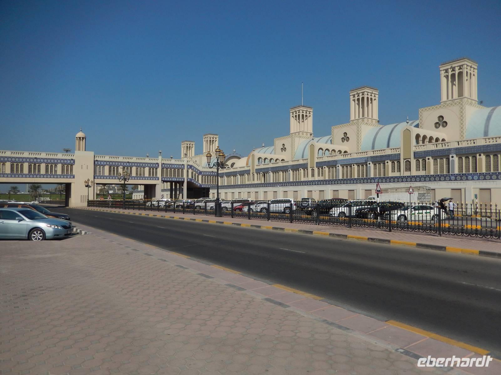 Weiter führt uns unsere Reise zum berühmten Blauen Souk auch "Blue Souk" genannt. Sechs lang gestreckte Gebäude mit blauer Kachel-Dekoration und aufgesetzten Windtürmen geben dem Bauwerk aus dem Jahr 1978 das Aussehen eines Belle-Epoque-Bahnhofs. Der Souk ist das meistfotografierteste Bauwerk des Emirats und gilt als Wahrzeichen Sharjahs. Rund 600 Geschäfte bieten uns hier Kosmetika, Elektronikgeräte, Textilien, Gebetsteppiche und Haushaltswaren an. Für jeden Geschmack ist hier etwas dabei. Von hier genießen auch viele von uns den Blick auf Sharjah in der Sonne. Einfach herrlich während die Lieben daheim frieren.