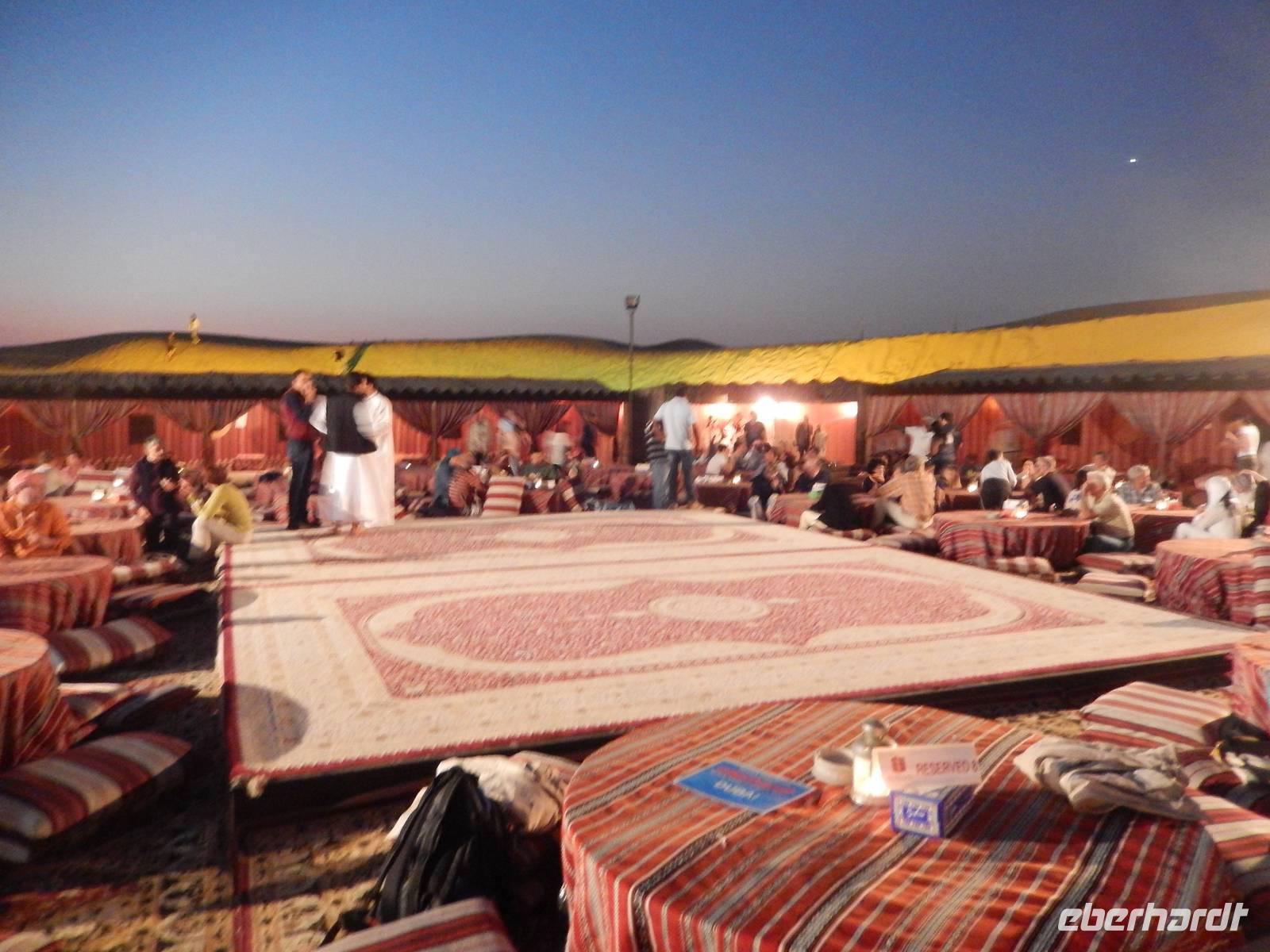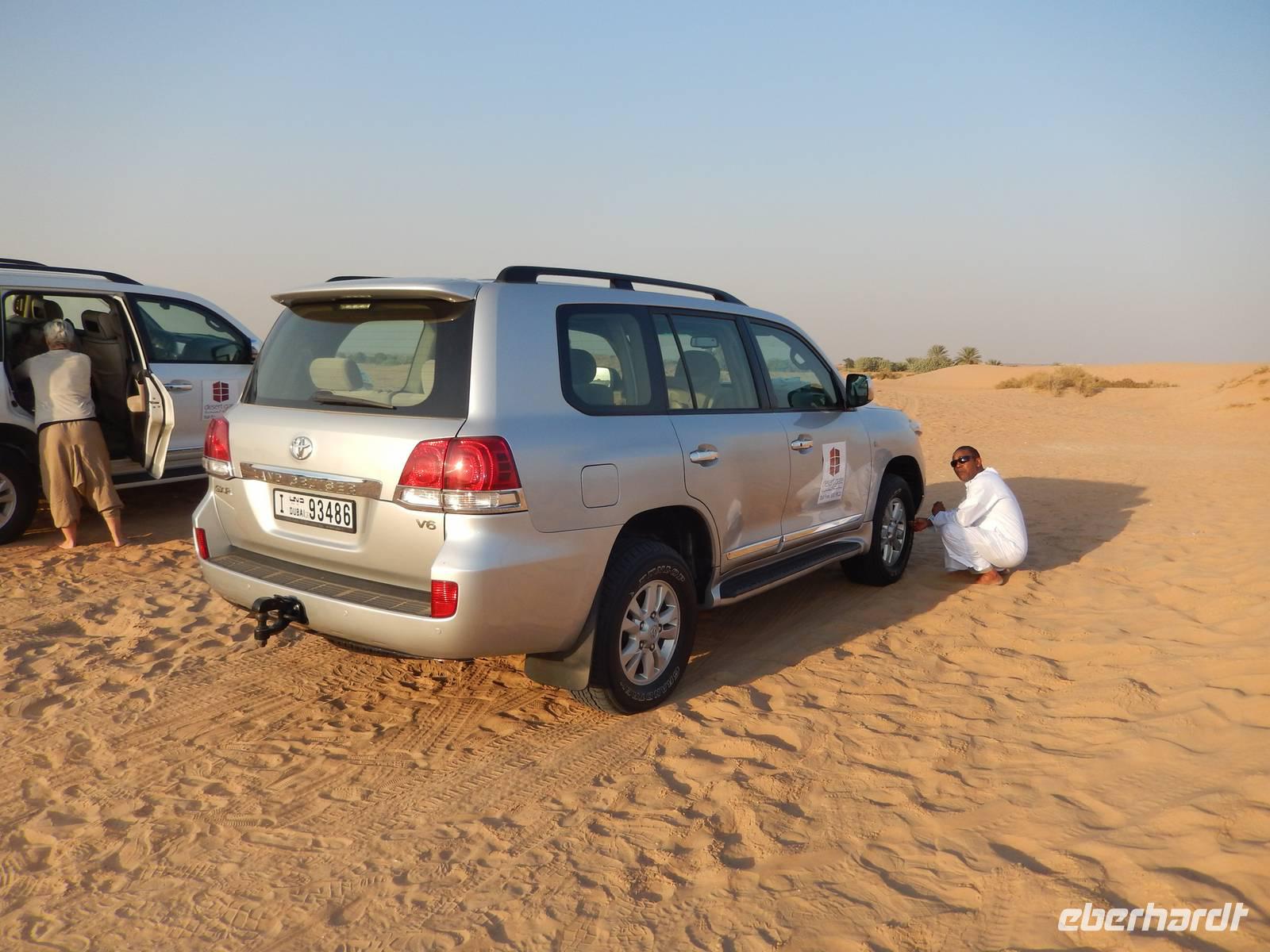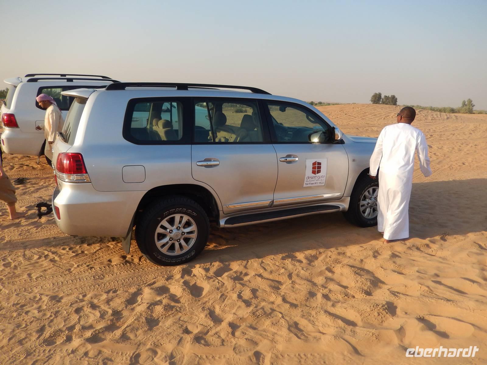 Alle wieder mit gesunder Gesichtsfarbe im Hotel angekommen, genießen wir noch ein leckeres Mittagsbuffet, um uns dann für unser "Abenteuer" Wüste auszustatten. Direkt vor unserem Hotel werden wir von den Jeeps abgeholt. Je sechs Personen passen in einen Jeep. Bei den erfahrenen Fahren fühlen wir uns sehr gut aufgehoben. Etwa zwei Drittel der Vereinigten Arabischen Emirate sind Sandwüste, Geröllwüste und savannenähnliche Halbwüste. Die Sandwüste besteht zum beträchtlichen Teil aus Dünen, die sich mit dem Wind vom Meer weg bewegen und sich zu immer neuen, bis zu 150 Meter hohen Formationen auftürmen. So fahren wir zuerst noch die geteerte Straße entlang bevor die Jeeps kurz anhalten um etwas Luft aus den Reifen zu lassen, damit diese auf dem weichen Wüstensand besser greifen können. Anschließend fahren wir mit einer doch beachtlichen Geschwindigkeit über die Dünen. Einigen von uns wurde dann doch schon etwas mulmig aber alle haben tapfer durchgehalten. Bei einem kurzen Halt genießen wir die Atmosphäre in der Wüste und machen wunderschöne Aufnahmen. Natürlich schießen wir auch ein Gruppenbild mit unseren Fahrern. Am Abend erreichen wir unser Wüstencamp, wo es viel zu entdecken gibt. So genießen wir unser Barbecue mit allerlei Köstlichkeiten vom Grill und leckeren Salaten. Einige von uns rauchen Shisha, kleiden sich wie die Emiratis oder verzieren Ihre Haut mit Henna. Den krönenden Abschluß des Abends bildete eine Bauchtanzdarbietung sowie ein Derwisch-Tänzer.