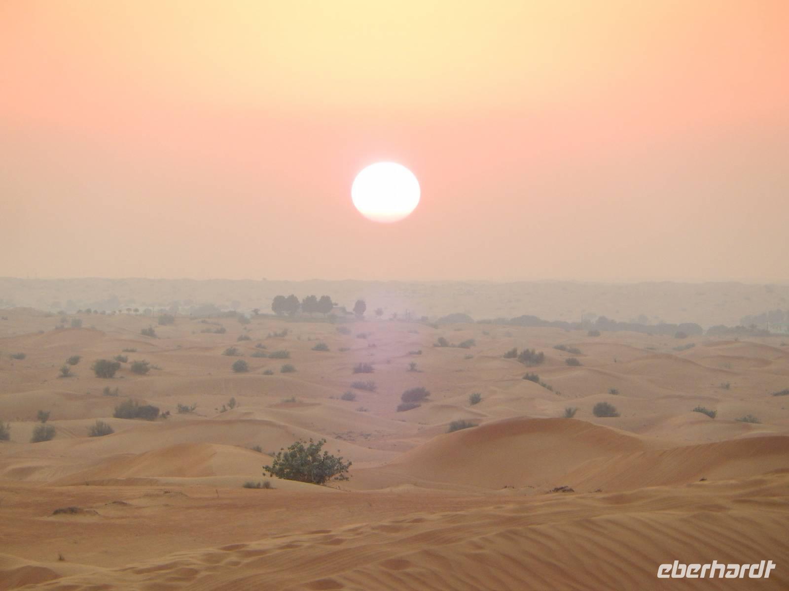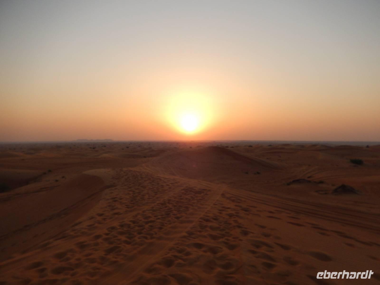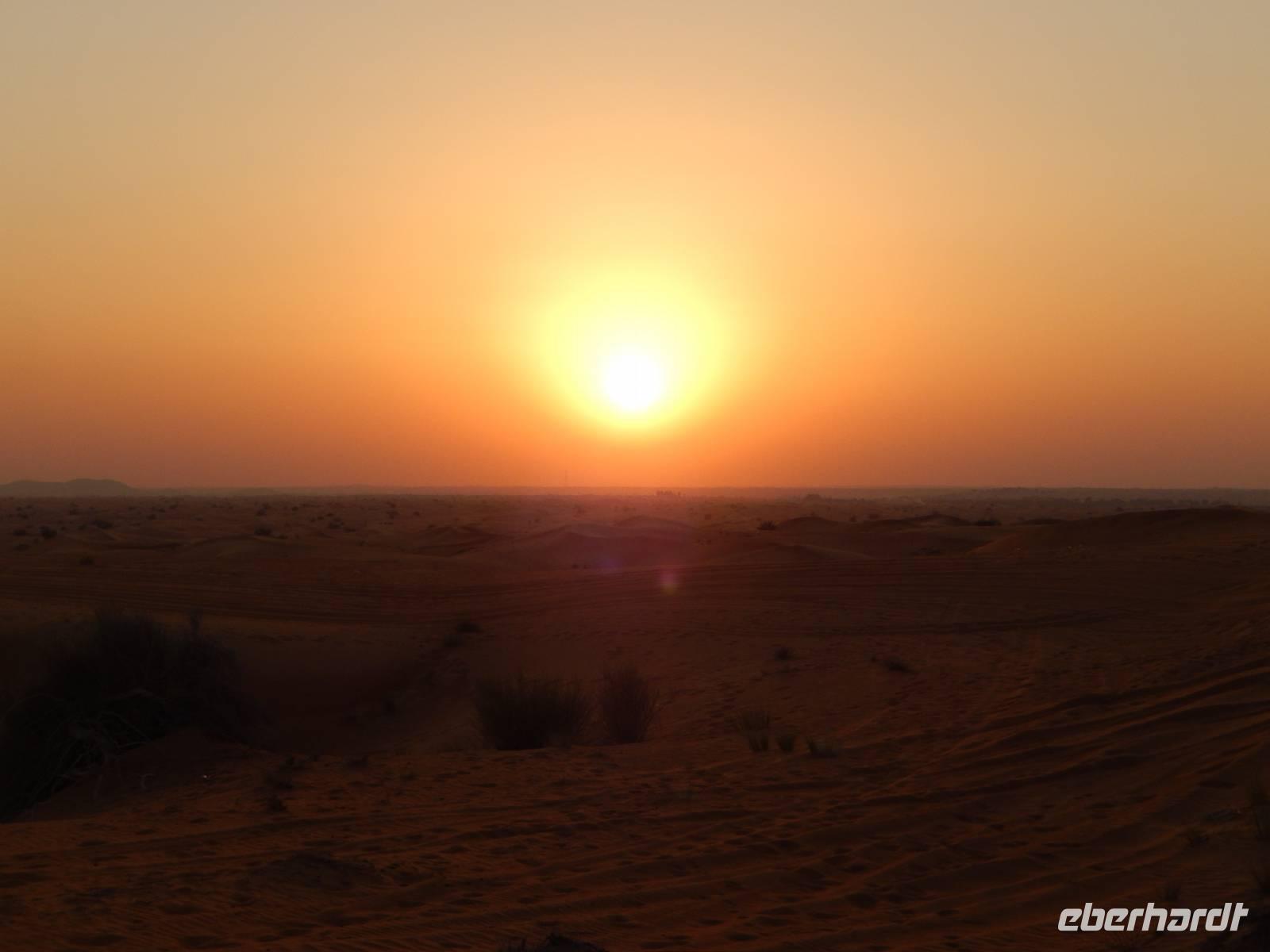 Alle wieder mit gesunder Gesichtsfarbe im Hotel angekommen, genießen wir noch ein leckeres Mittagsbuffet, um uns dann für unser "Abenteuer" Wüste auszustatten. Direkt vor unserem Hotel werden wir von den Jeeps abgeholt. Je sechs Personen passen in einen Jeep. Bei den erfahrenen Fahren fühlen wir uns sehr gut aufgehoben. Etwa zwei Drittel der Vereinigten Arabischen Emirate sind Sandwüste, Geröllwüste und savannenähnliche Halbwüste. Die Sandwüste besteht zum beträchtlichen Teil aus Dünen, die sich mit dem Wind vom Meer weg bewegen und sich zu immer neuen, bis zu 150 Meter hohen Formationen auftürmen. So fahren wir zuerst noch die geteerte Straße entlang bevor die Jeeps kurz anhalten um etwas Luft aus den Reifen zu lassen, damit diese auf dem weichen Wüstensand besser greifen können. Anschließend fahren wir mit einer doch beachtlichen Geschwindigkeit über die Dünen. Einigen von uns wurde dann doch schon etwas mulmig aber alle haben tapfer durchgehalten. Bei einem kurzen Halt genießen wir die Atmosphäre in der Wüste und machen wunderschöne Aufnahmen. Natürlich schießen wir auch ein Gruppenbild mit unseren Fahrern. Am Abend erreichen wir unser Wüstencamp, wo es viel zu entdecken gibt. So genießen wir unser Barbecue mit allerlei Köstlichkeiten vom Grill und leckeren Salaten. Einige von uns rauchen Shisha, kleiden sich wie die Emiratis oder verzieren Ihre Haut mit Henna. Den krönenden Abschluß des Abends bildete eine Bauchtanzdarbietung sowie ein Derwisch-Tänzer.
