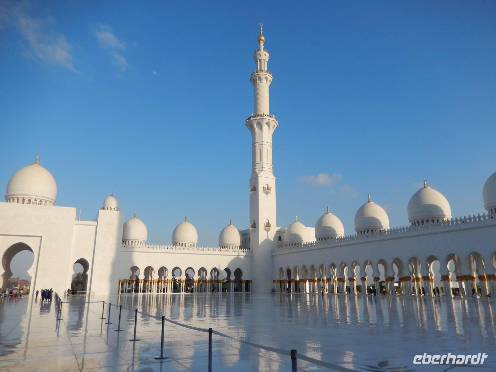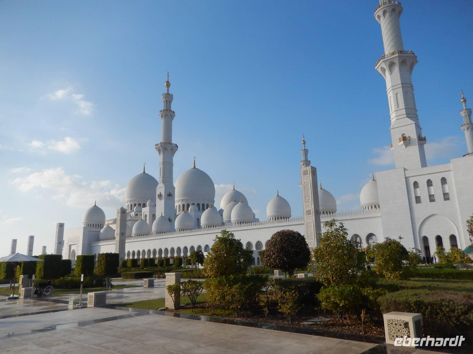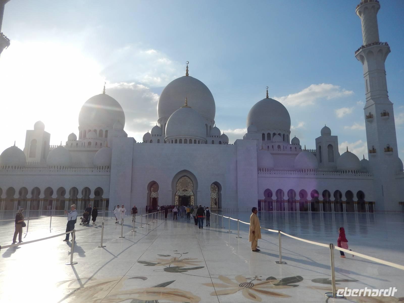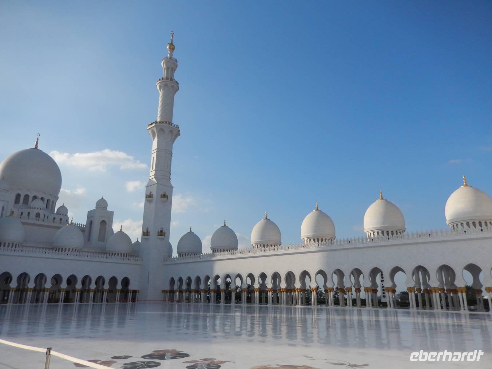 Heute reisen wir nach Abu Dhabi-Stadt, Hauptstadt und Regierungssitz der Vereinigten Arabischen Emirate. Abu Dhabi bedeckt eine flache Sandinsel, die mit dem Festland durch zwei Brücken verbunden ist. Uns fällt auf, dass hier vor allem üppige Grünflächen das Stadtbild prägen. Bevor wir aber in die Stadt hinein fahren, besuchen wir die Falkenklinik von Frau Dr. Müller und erleben eine ereignisreiche Führung mit Live Darbietungen. Am Arabischen Golf genießen die Falken eine ganz besondere Aufmerksamkeit. Wir sehen hier hautnah, wie einem Falken die Krallen geschnitten werden oder wie man deren Gedieder repariert. Auch dürfen wir selbst den Falken auf den Arm nehmen und schöne Fotos schießen. Ein wirkliches Erlebnis. Danach reisen wir weiter nach Yas Island. Ein 40 Milliarden teures Projekt entsteht hier auf der 25 Quadratkilometer großen Insel Yas mit einer Küstenlänge von 32 Kilometern bei Abu Dhabi Stadt. Hier sehen wir Abu Dhabis berühmte und spektakuläre Formel-1-Rennstrecke, die unter einer Brücke zwischen zwei Flügeln des Viceroy-Hotels verläuft. Daneben sehen wir zahlreiche Hotels, den Jachthafen, den Ferrari-Themenpark, den Warner Bros.-Themenpark sowie einen Wasserpark. Wieder fragen wir uns, wer diese Freizeitmöglichkeiten nutzen soll, denn auf Yas Island sahen wir so gut wie keine Menschenseele. Anschließend reisen wir weiter zum Heritage Village und zu einem Aussichtspunkt und sehen die beeindruckende Skyline von Abu Dhabi. Wir spüren das hier Alt und Neu ganz nah beieinander liegen.Danach konnten wir es kaum erwarten zum märchenhaften Luxushotel Emirates Palace zu kommen. Schon von Weitem staunen wir über das mächtige Anwesen und fühlen uns auf einmal ganz klein. Ein Eingangstor wie eine altarabische Zugbrücke, Springbrunnen und Freitreppen wie in einem französischen Schloss. Der Hotelpalast wird gekrönt von 114 Kuppeln und blattvergoldeten Fluren. Es wirkt wie eine Mischung aus Hagia Sophia und Tadsch Mahal, gleichermaßen großartig wie entrückt. Elegant und stilvoll. Bevor wir zu unserer Tesstunde mit allerlei Köstlichkeiten eingeladen sind, schauen wir uns noch ein wenig um. Schon etwas hungrig machten wir uns anschließend auf zu unserer Teestunde. Hier bekamen wir viel mehr serviert, als wir essen konnten. Leckere Törtchen mit ausgelesenen Früchten, hausgemachte Butter und Marmelade sowie köstliche Häppchen mit Lachs und anderen Spezialitäten. Dazu wurde uns ständig frisch gebrühter Kaffee oder Tee gereicht. Ein bisschen fühlten wir uns schon wie kleine Stars. So genossen wir unseren "High Tee" und hofften, dass die Zeit nicht all zu schnell vergeht. Danach geht es weiter zur Moschee. Es dauert nicht lang und und vor unseren Augen erhebt sich unübersehbar die mächtige Sheikh-Zayed-Moschee. Wir staunen über die drei riesigen Kuppeln, 79 kleinere Kuppeln, vier hohe Minarette sowie über die zahlreichen Nebengebäude und Arkaden. Die größte Moschee der Vereinigten Arabischen Emirate bietet Platz für 1000 Gläubige. Im Inneren bedeckt ein 5600 Quadratmeter großer und 47 Tonnen schwerer Teppich den Boden. So gehen wir hinein um uns selbst von dem prächtigen Bauwerk zu überzeugen. Natürlich gehört es dazu, dass wir alle unsere Schuhe ausziehen. Anja erklärte uns viel Wissenwertes über den Islam und seine Bräuche, welche wir in der Moschee schnell wiederfanden.