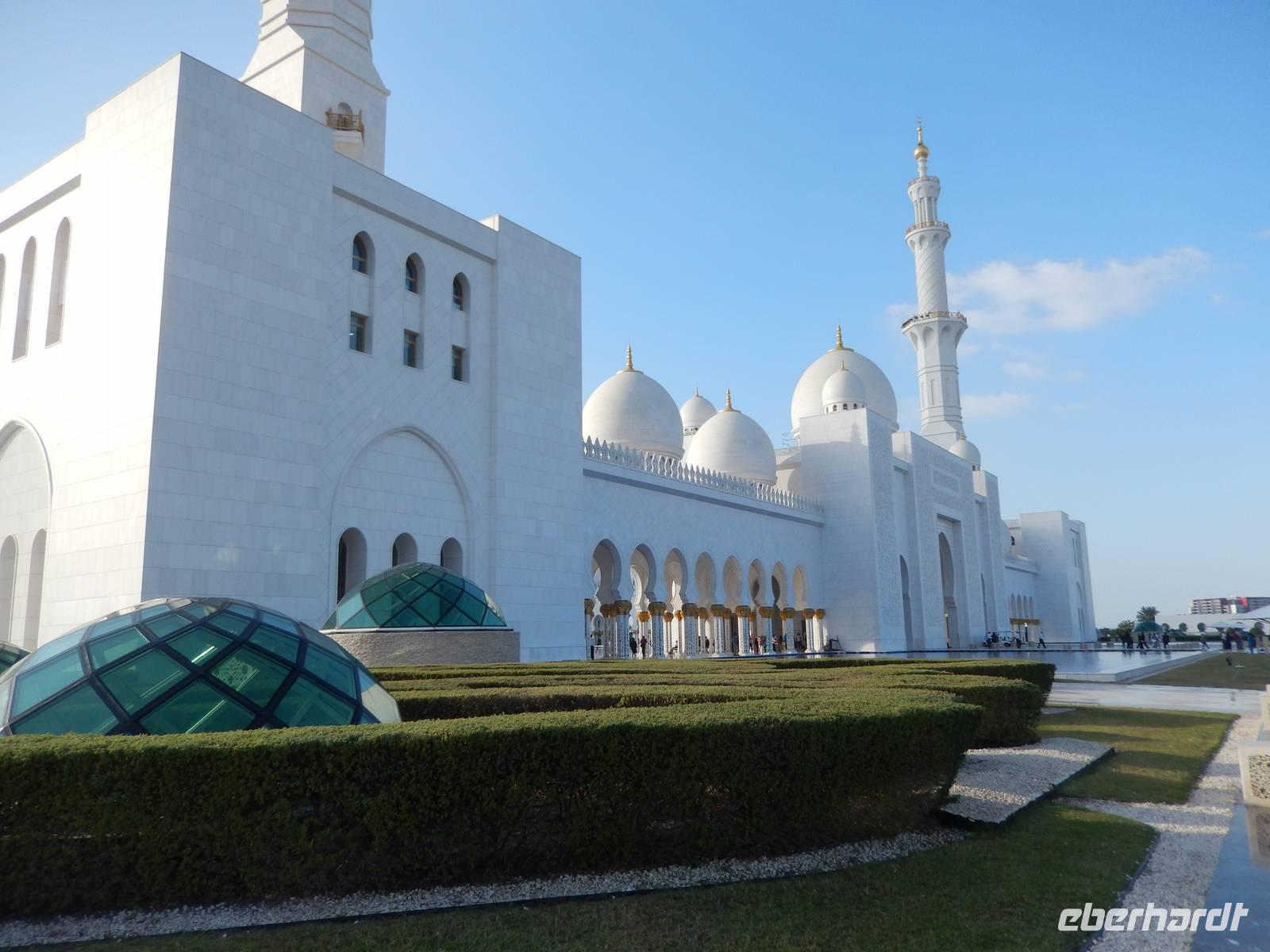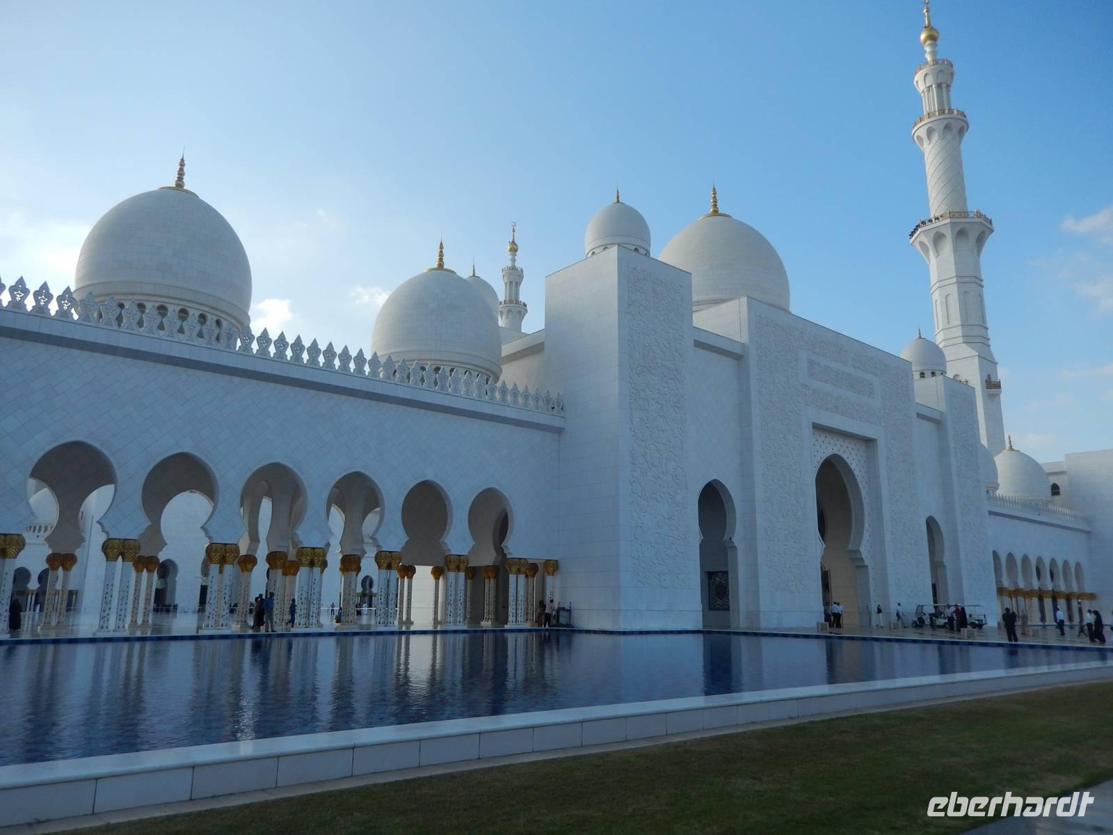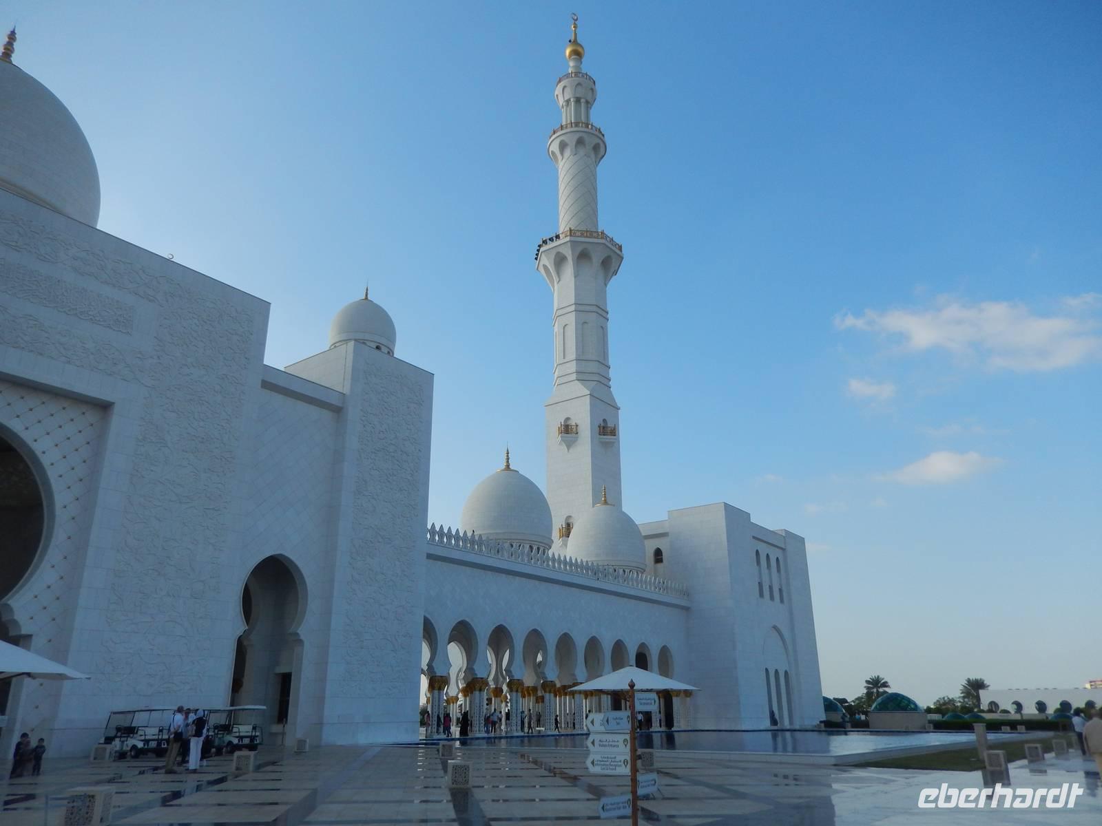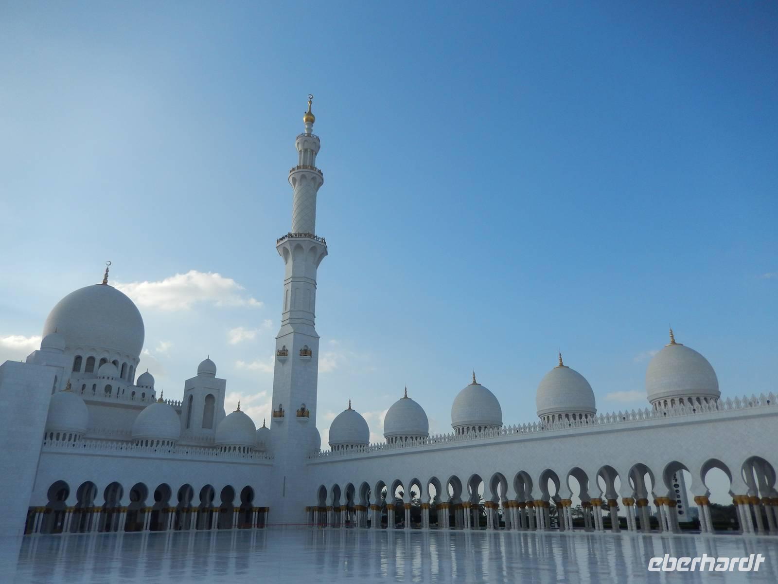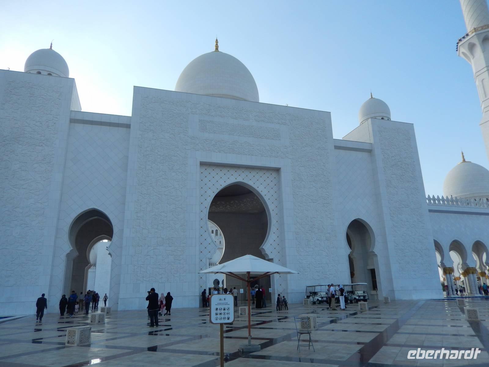 Heute reisen wir nach Abu Dhabi-Stadt, Hauptstadt und Regierungssitz der Vereinigten Arabischen Emirate. Abu Dhabi bedeckt eine flache Sandinsel, die mit dem Festland durch zwei Brücken verbunden ist. Uns fällt auf, dass hier vor allem üppige Grünflächen das Stadtbild prägen. Bevor wir aber in die Stadt hinein fahren, besuchen wir die Falkenklinik von Frau Dr. Müller und erleben eine ereignisreiche Führung mit Live Darbietungen. Am Arabischen Golf genießen die Falken eine ganz besondere Aufmerksamkeit. Wir sehen hier hautnah, wie einem Falken die Krallen geschnitten werden oder wie man deren Gedieder repariert. Auch dürfen wir selbst den Falken auf den Arm nehmen und schöne Fotos schießen. Ein wirkliches Erlebnis. Danach reisen wir weiter nach Yas Island. Ein 40 Milliarden teures Projekt entsteht hier auf der 25 Quadratkilometer großen Insel Yas mit einer Küstenlänge von 32 Kilometern bei Abu Dhabi Stadt. Hier sehen wir Abu Dhabis berühmte und spektakuläre Formel-1-Rennstrecke, die unter einer Brücke zwischen zwei Flügeln des Viceroy-Hotels verläuft. Daneben sehen wir zahlreiche Hotels, den Jachthafen, den Ferrari-Themenpark, den Warner Bros.-Themenpark sowie einen Wasserpark. Wieder fragen wir uns, wer diese Freizeitmöglichkeiten nutzen soll, denn auf Yas Island sahen wir so gut wie keine Menschenseele. Anschließend reisen wir weiter zum Heritage Village und zu einem Aussichtspunkt und sehen die beeindruckende Skyline von Abu Dhabi. Wir spüren das hier Alt und Neu ganz nah beieinander liegen.Danach konnten wir es kaum erwarten zum märchenhaften Luxushotel Emirates Palace zu kommen. Schon von Weitem staunen wir über das mächtige Anwesen und fühlen uns auf einmal ganz klein. Ein Eingangstor wie eine altarabische Zugbrücke, Springbrunnen und Freitreppen wie in einem französischen Schloss. Der Hotelpalast wird gekrönt von 114 Kuppeln und blattvergoldeten Fluren. Es wirkt wie eine Mischung aus Hagia Sophia und Tadsch Mahal, gleichermaßen großartig wie entrückt. Elegant und stilvoll. Bevor wir zu unserer Tesstunde mit allerlei Köstlichkeiten eingeladen sind, schauen wir uns noch ein wenig um. Schon etwas hungrig machten wir uns anschließend auf zu unserer Teestunde. Hier bekamen wir viel mehr serviert, als wir essen konnten. Leckere Törtchen mit ausgelesenen Früchten, hausgemachte Butter und Marmelade sowie köstliche Häppchen mit Lachs und anderen Spezialitäten. Dazu wurde uns ständig frisch gebrühter Kaffee oder Tee gereicht. Ein bisschen fühlten wir uns schon wie kleine Stars. So genossen wir unseren "High Tee" und hofften, dass die Zeit nicht all zu schnell vergeht. Danach geht es weiter zur Moschee. Es dauert nicht lang und und vor unseren Augen erhebt sich unübersehbar die mächtige Sheikh-Zayed-Moschee. Wir staunen über die drei riesigen Kuppeln, 79 kleinere Kuppeln, vier hohe Minarette sowie über die zahlreichen Nebengebäude und Arkaden. Die größte Moschee der Vereinigten Arabischen Emirate bietet Platz für 1000 Gläubige. Im Inneren bedeckt ein 5600 Quadratmeter großer und 47 Tonnen schwerer Teppich den Boden. So gehen wir hinein um uns selbst von dem prächtigen Bauwerk zu überzeugen. Natürlich gehört es dazu, dass wir alle unsere Schuhe ausziehen. Anja erklärte uns viel Wissenwertes über den Islam und seine Bräuche, welche wir in der Moschee schnell wiederfanden.
