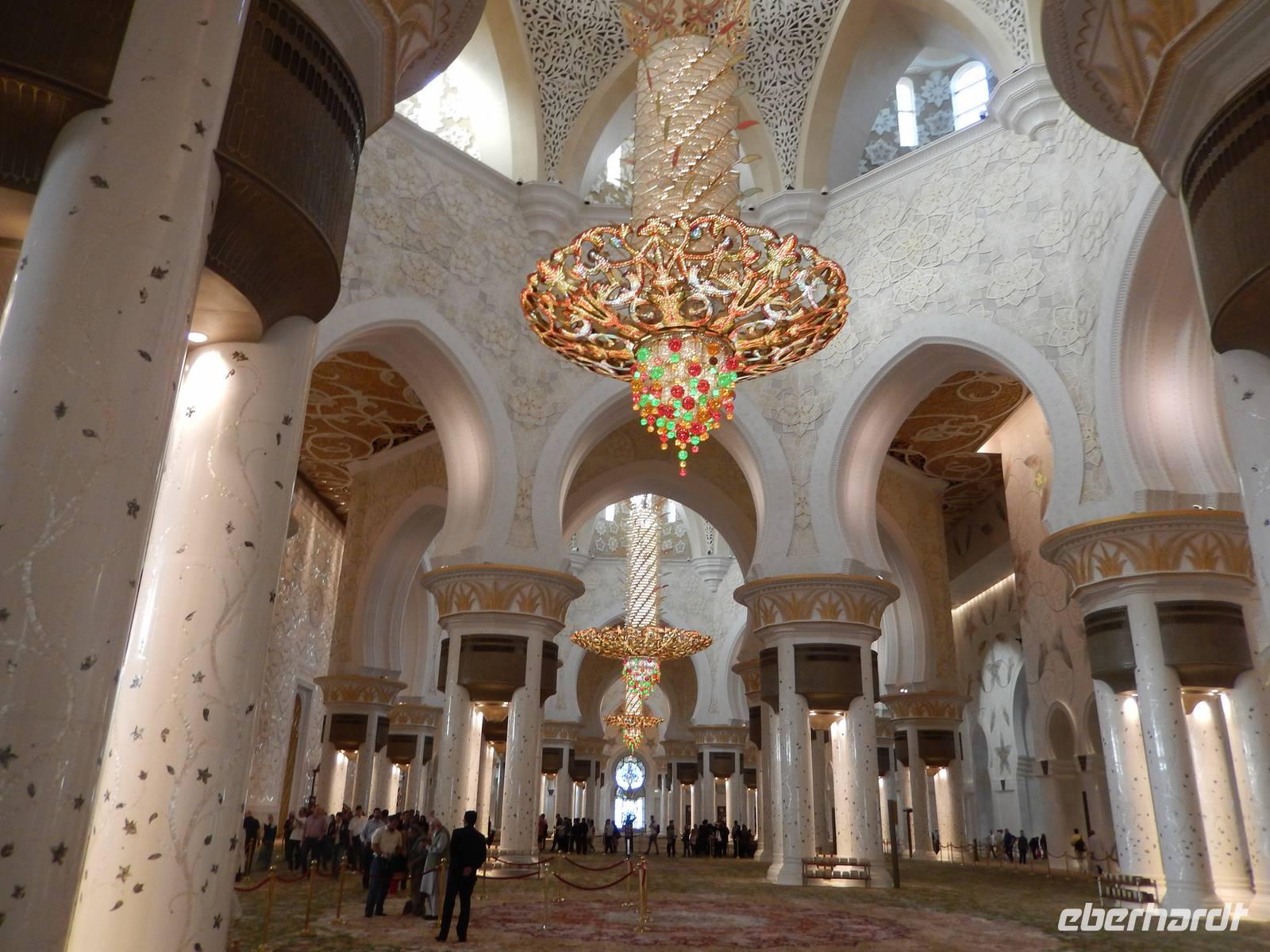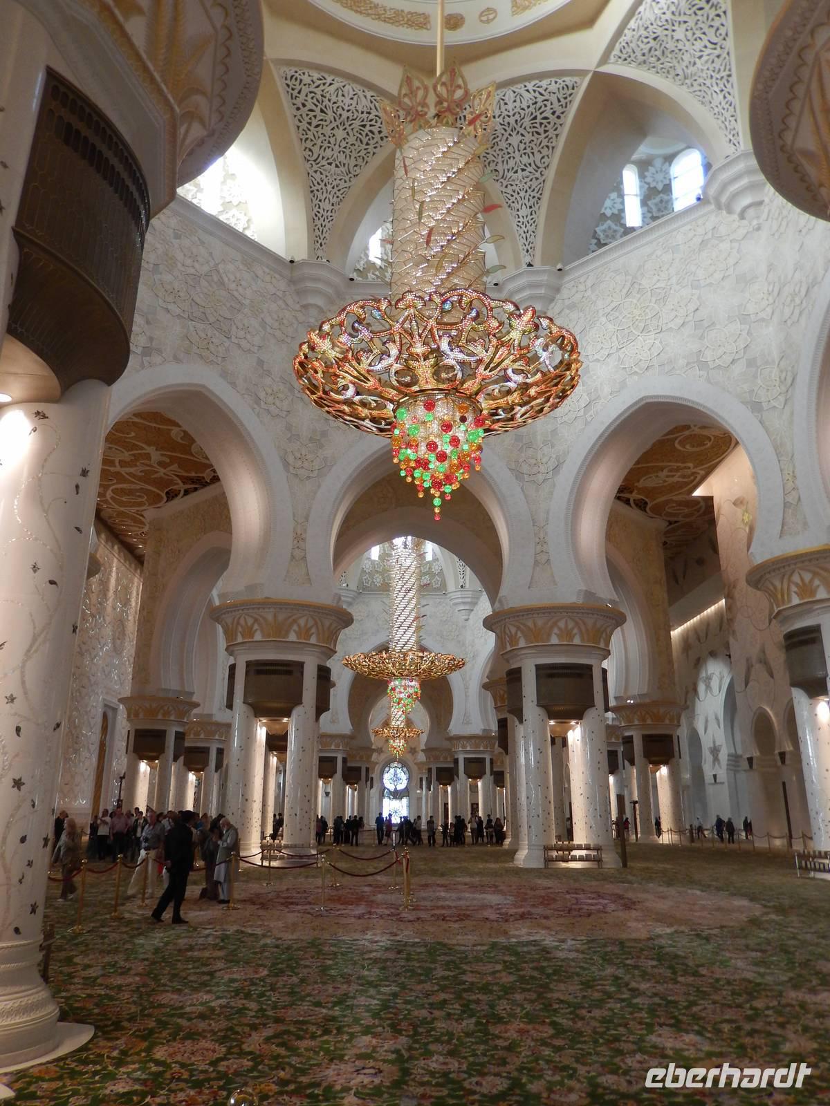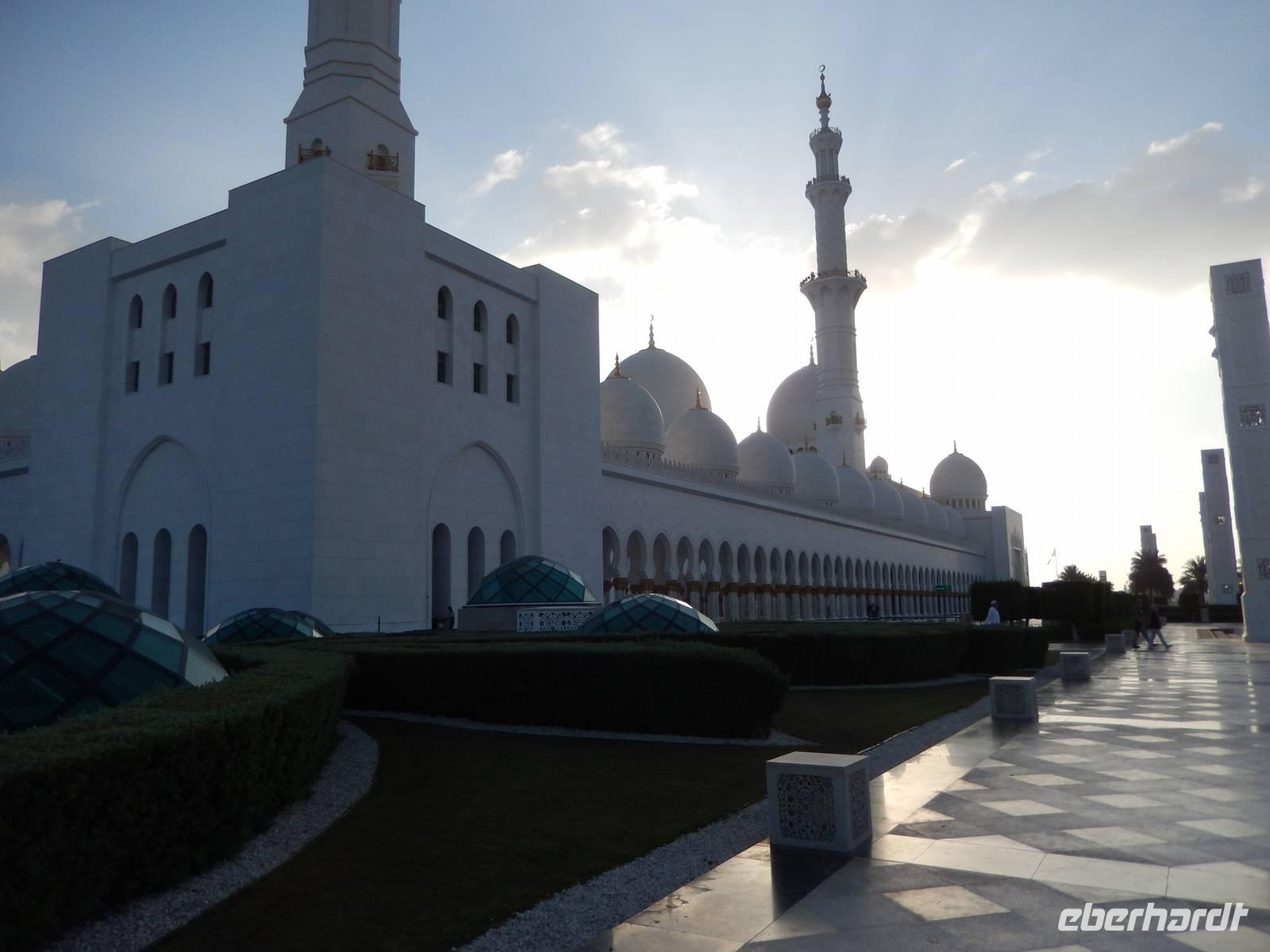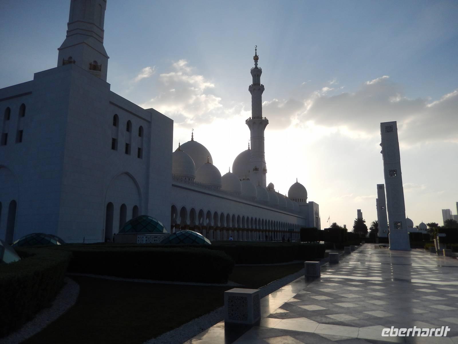 Heute reisen wir nach Abu Dhabi-Stadt, Hauptstadt und Regierungssitz der Vereinigten Arabischen Emirate. Abu Dhabi bedeckt eine flache Sandinsel, die mit dem Festland durch zwei Brücken verbunden ist. Uns fällt auf, dass hier vor allem üppige Grünflächen das Stadtbild prägen. Bevor wir aber in die Stadt hinein fahren, besuchen wir die Falkenklinik von Frau Dr. Müller und erleben eine ereignisreiche Führung mit Live Darbietungen. Am Arabischen Golf genießen die Falken eine ganz besondere Aufmerksamkeit. Wir sehen hier hautnah, wie einem Falken die Krallen geschnitten werden oder wie man deren Gedieder repariert. Auch dürfen wir selbst den Falken auf den Arm nehmen und schöne Fotos schießen. Ein wirkliches Erlebnis. Danach reisen wir weiter nach Yas Island. Ein 40 Milliarden teures Projekt entsteht hier auf der 25 Quadratkilometer großen Insel Yas mit einer Küstenlänge von 32 Kilometern bei Abu Dhabi Stadt. Hier sehen wir Abu Dhabis berühmte und spektakuläre Formel-1-Rennstrecke, die unter einer Brücke zwischen zwei Flügeln des Viceroy-Hotels verläuft. Daneben sehen wir zahlreiche Hotels, den Jachthafen, den Ferrari-Themenpark, den Warner Bros.-Themenpark sowie einen Wasserpark. Wieder fragen wir uns, wer diese Freizeitmöglichkeiten nutzen soll, denn auf Yas Island sahen wir so gut wie keine Menschenseele. Anschließend reisen wir weiter zum Heritage Village und zu einem Aussichtspunkt und sehen die beeindruckende Skyline von Abu Dhabi. Wir spüren das hier Alt und Neu ganz nah beieinander liegen.Danach konnten wir es kaum erwarten zum märchenhaften Luxushotel Emirates Palace zu kommen. Schon von Weitem staunen wir über das mächtige Anwesen und fühlen uns auf einmal ganz klein. Ein Eingangstor wie eine altarabische Zugbrücke, Springbrunnen und Freitreppen wie in einem französischen Schloss. Der Hotelpalast wird gekrönt von 114 Kuppeln und blattvergoldeten Fluren. Es wirkt wie eine Mischung aus Hagia Sophia und Tadsch Mahal, gleichermaßen großartig wie entrückt. Elegant und stilvoll. Bevor wir zu unserer Tesstunde mit allerlei Köstlichkeiten eingeladen sind, schauen wir uns noch ein wenig um. Schon etwas hungrig machten wir uns anschließend auf zu unserer Teestunde. Hier bekamen wir viel mehr serviert, als wir essen konnten. Leckere Törtchen mit ausgelesenen Früchten, hausgemachte Butter und Marmelade sowie köstliche Häppchen mit Lachs und anderen Spezialitäten. Dazu wurde uns ständig frisch gebrühter Kaffee oder Tee gereicht. Ein bisschen fühlten wir uns schon wie kleine Stars. So genossen wir unseren "High Tee" und hofften, dass die Zeit nicht all zu schnell vergeht. Danach geht es weiter zur Moschee. Es dauert nicht lang und und vor unseren Augen erhebt sich unübersehbar die mächtige Sheikh-Zayed-Moschee. Wir staunen über die drei riesigen Kuppeln, 79 kleinere Kuppeln, vier hohe Minarette sowie über die zahlreichen Nebengebäude und Arkaden. Die größte Moschee der Vereinigten Arabischen Emirate bietet Platz für 1000 Gläubige. Im Inneren bedeckt ein 5600 Quadratmeter großer und 47 Tonnen schwerer Teppich den Boden. So gehen wir hinein um uns selbst von dem prächtigen Bauwerk zu überzeugen. Natürlich gehört es dazu, dass wir alle unsere Schuhe ausziehen. Anja erklärte uns viel Wissenwertes über den Islam und seine Bräuche, welche wir in der Moschee schnell wiederfanden.