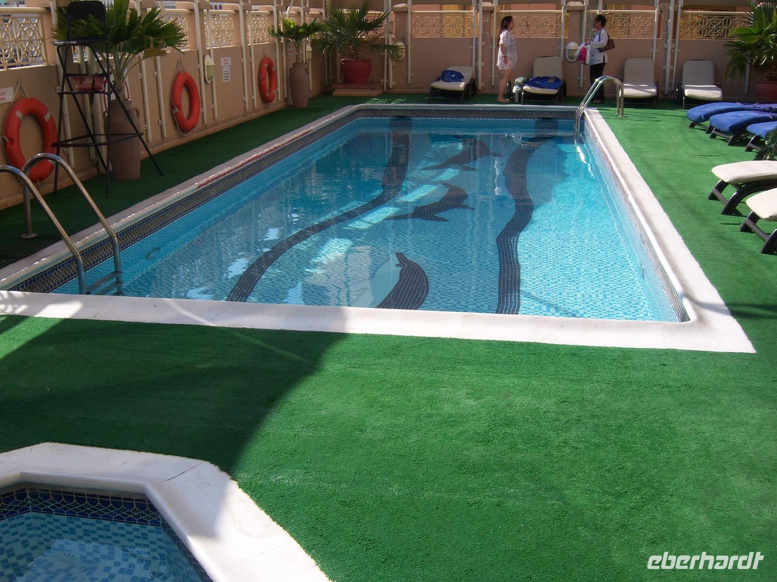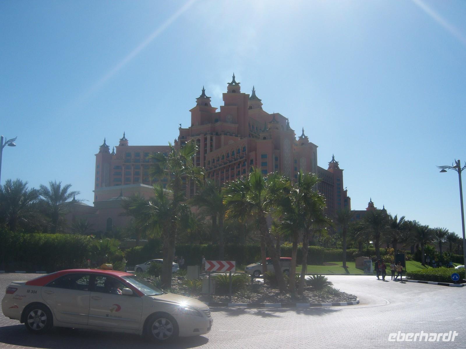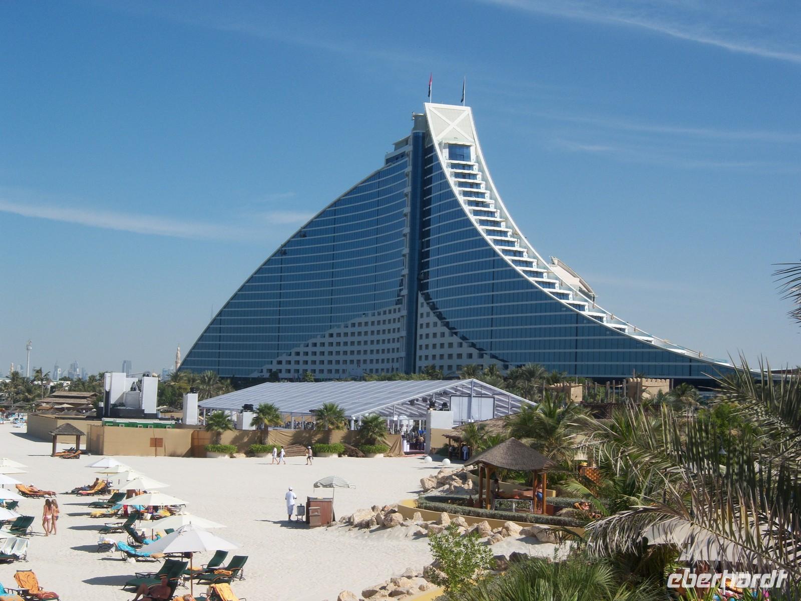 Unser Vormittag steht uns heute zur freien Verfügung. So nutzen wir die Möglichkeit um uns ein wenig in unserem Stadtteil umzusehen, ein paar Einkäufe zu erledigen, am Creek zu spazieren oder einfach am Hotelpool zu entspannen. Fast alle von uns freuen sich dann auf den ereignisreichen Ausflug zum Burj al Arab. Geschniegelt und gestriegelt, wie frisch aus dem Ei gepellt, machen wir auf zum Symbol des modern-futuristischen Dubai. 321 Meter ragt der Arabische Turm in den Himmel - die spektakulärste und bereits kurz nach der Eröffnung im Jahr 2000 wohl berühmteste Luxushotel der Welt. Das neue Wahrzeichen Dubais ließ sich das kleine Scheichtum sagenhafte 1,5 Milliarden Euro kosten.An Superlativen herrscht kein Mangel: Das höchste Hotel der Welt, ein Denkmal des Luxus, der Garten Allahs auf Erden. Auf einer eigens geschaffenen künstlichen Insel 300 Meter vor dem Jumeirah-Strand von Dubai erbaut, reckt sich das Burj al Arabin die Höhe wie das geblähte Segel einer altarabischen Dhau. So spazieren wir über die Brücke um das Prachtgebäude auch von Weitem auf unser Bild zu bekommen. Im Inneren trauen wir unseren Augen kaum. Die Lobby ist ein Dom aus Licht und Gold. Aus vollständig mit 0,001 Milimeter dünnem Blattgold überzogenen Säulen ranken sich goldenen Baldachine hervor. Die Wasserfontäne des Brunnens schießt 50 Meter in die Höhe. Wir erfahren, dass eine Nacht in der 780 Quadratmeter großen Royal Suite 8500 Euro kostet - ohne Frühstück aber zumindest mit Butler. Ein bisschen fühlen wir uns schon wie im Traum. Besonders der Außenfahrstuhl mit dem Blick auf den Strand hat es uns angetan und so fahren wir ein paar Mal rauf und runter. Nachdem wir uns ein wenig umgesehen haben, öffnet sich für uns das arbaische Restaurant auf der ersten Etage des Hotels. Wir platzieren uns ganz sorgfältig und bestellen uns einige Getränke. Unserem Geldbeutel tut das nicht sonderlich gut, aber wir essen ja auch nur einmal im Burj al Arab! Kurze Zeit später probieren wir allerlei Köstlichkeiten wie Austern, Hummer, Sushi oder Garnelen. Nach diesem Festmahl schlenderten wir noch ein wenig im Hotel herum und schossen unsere letzten Fotos. Unsere liebe Martina hatte an diesem Nachmittag noch eine kleine Überraschung für uns vorbereitet. Sie führte uns zum Madinat Souk.Für uns gehörte der Souk zu den schönsten, die wir gesehen haben. Der exquisite Souk besticht vor allem durch seinen arabischen Stil , beste Restaurants, niedliche Cafés und Bars. Von hier aus hat man außerdem einen wunderschönen Blick auf das Burj al Arab. Man kommt sich ein bisschen vor wie in Venedig. Anschließend fuhren wir zurück zu unserem Hotel.