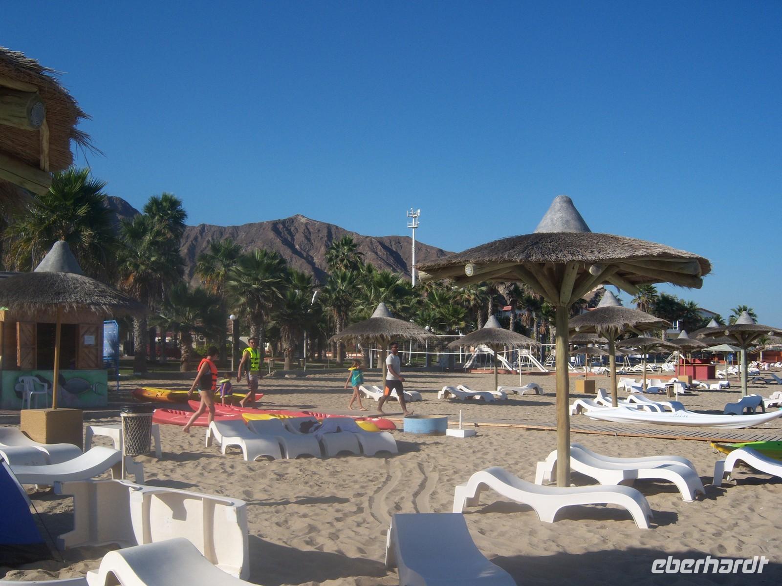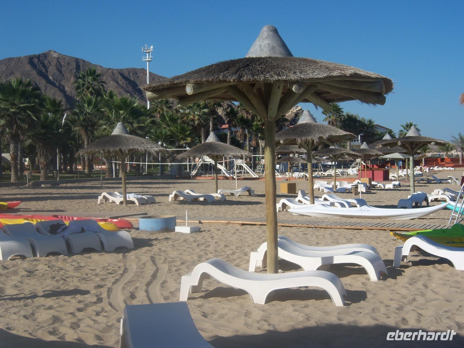 Nach einem ausgedehnten späten Frühstück reisen wir heute an die schöne Ostküste um uns am wunderschönen Strand zu entspannen und die letzten Sonnenstrahlen zu genießen bevor wir wieder in das kalte Deutschland zurück fliegen.So fahren wir über die gut ausgebaute Ostküstenstraße zunächst nach Masafi. Hier legen wir eine Pause ein und schlendern über den Straßenmarkt, der zu den größten und farbenträchtigsten Märkten der Region gehört. Bauern verkaufen Gemüse, Obst und Brennholz sowie Teppiche und Töpferarbeiten. Viele von uns nutzen die Möglichkeit um ein paar Kleinigkeiten zu erstehen. Landschaftlicher Höhepunkt unserer Fahrt an die Ostküste ist die Durchquerung des majestätischen Hajargebirges. Wir staunen nicht schlecht, dass man hier neben der Wüste auch Gebirge findet und sehen heute ein ganz anderes Bild der Emirate: Steil aufragende, unwirtlich und kahl erscheinende Felsschluchten, von der Sonne in gleißendes Licht getaucht. Ein paar Stunden später erreichen wir das Fischerdörfchen Al-Aqqa, 15 Kilometer südlich von Dibba. Hier kehren wir in das wunderschöne Sandy Beach Motel ein.Nach einem köstlichen Mittagessen lockt uns der herrliche Strand und das verführerische Meer zu einem Bad. Wir verbingen hier einige schöne Stunden und der Abschied fällt uns dann doch sehr schwer, denn wir wissen, dass uns in Deutschland ein Chaos von Schnee und Eis erwartet.Nach diesem enstpannenden Nachmittag fuhren wir anschließend zurück zu unserem Hotel, wo wir am Abend ankamen. Nun blieb uns bis zu unserem Transfer zum Flughafen noch genügend Zeit um die letzten Stunden in unserem Hotel zu genießen. So ließen wir uns viel Zeit bei unserem letzten Abendessen und nutzten die Zeit um uns noch ein wenig frisch zu machen und die Pullover wieder heraus zu holen, was uns so gar nicht gefiel. Alle bekamen Ihre bereits ausgedruckten Flugtickets und so konnte nichts mehr schief gehen. Pünktlich 23:00 Uhr holte uns unsere Reiseleiterin Martina ein letztes Mal vom Hotel ab. Wir verstauten unsere Koffer und fuhren etwas 20 Minuten zum Dubai International Airport. Auf der Fahrt bedankten wir uns natürlich bei unserer Reiseleiterin für die wunderbare und herzliche Betreuung sowie auch bei unserem Busfahrer für seine sichere Fahrweise.