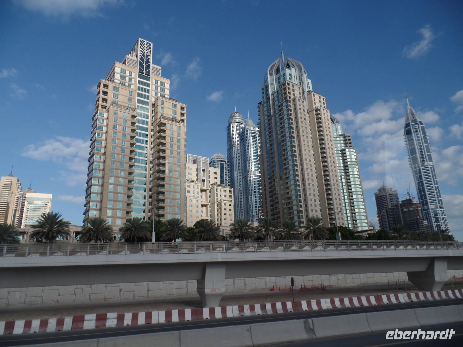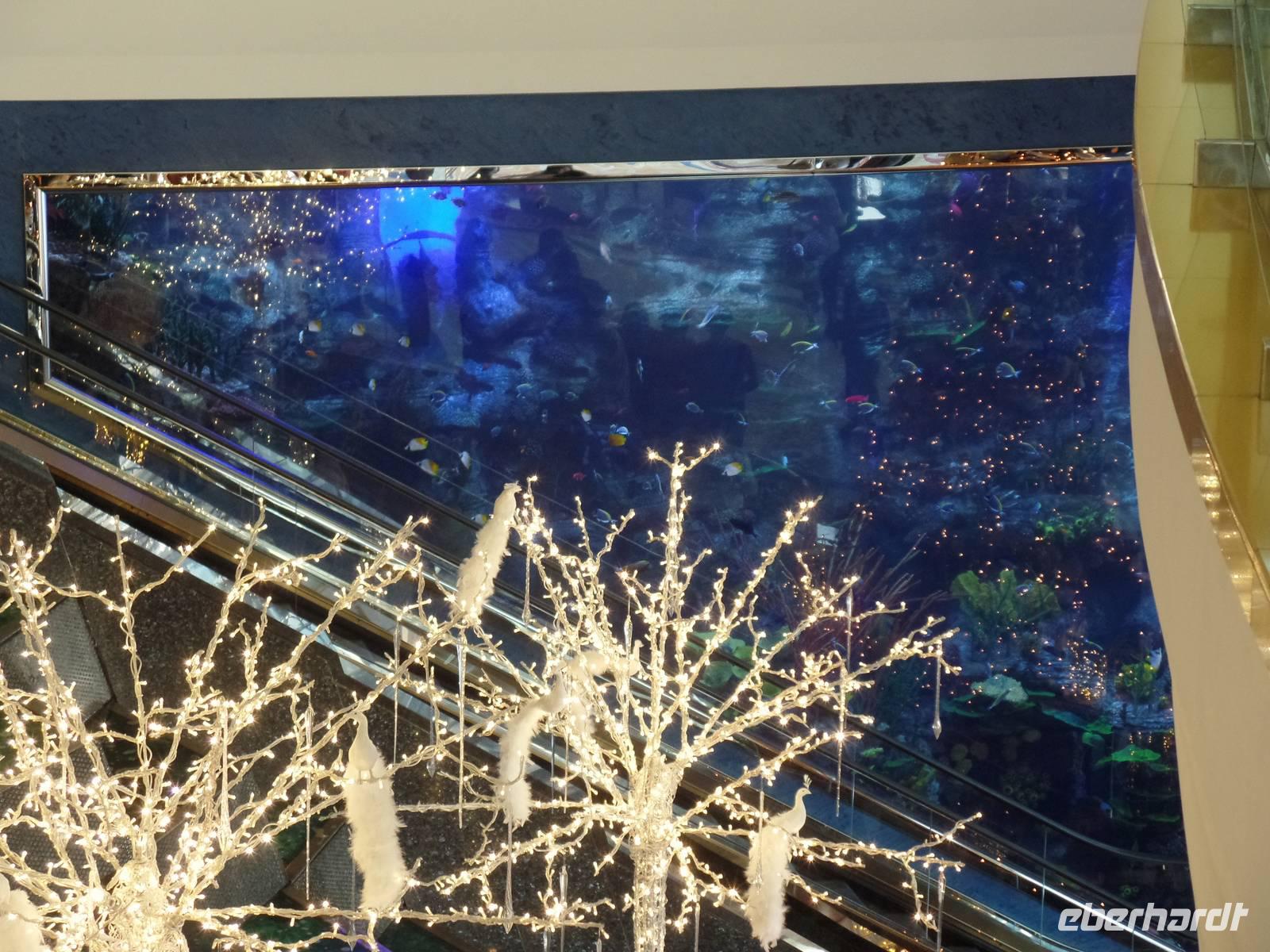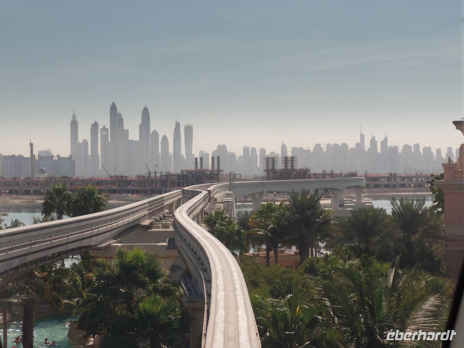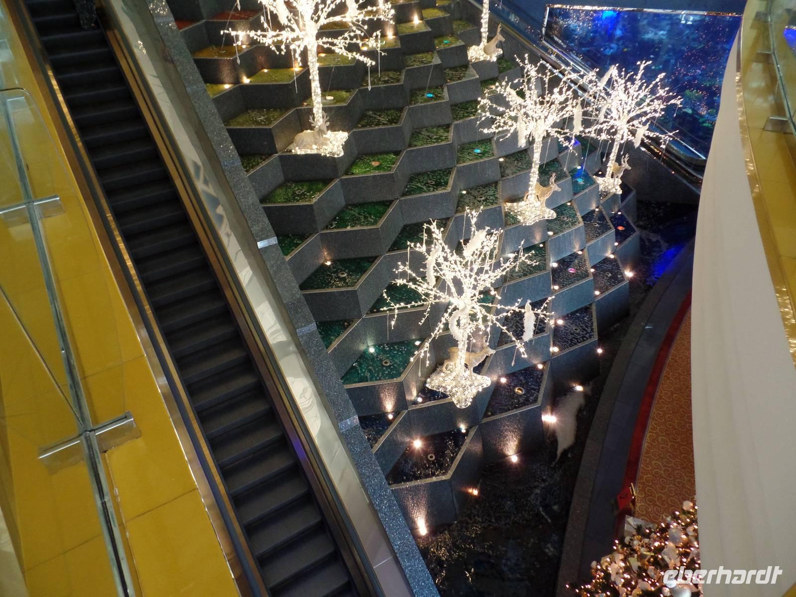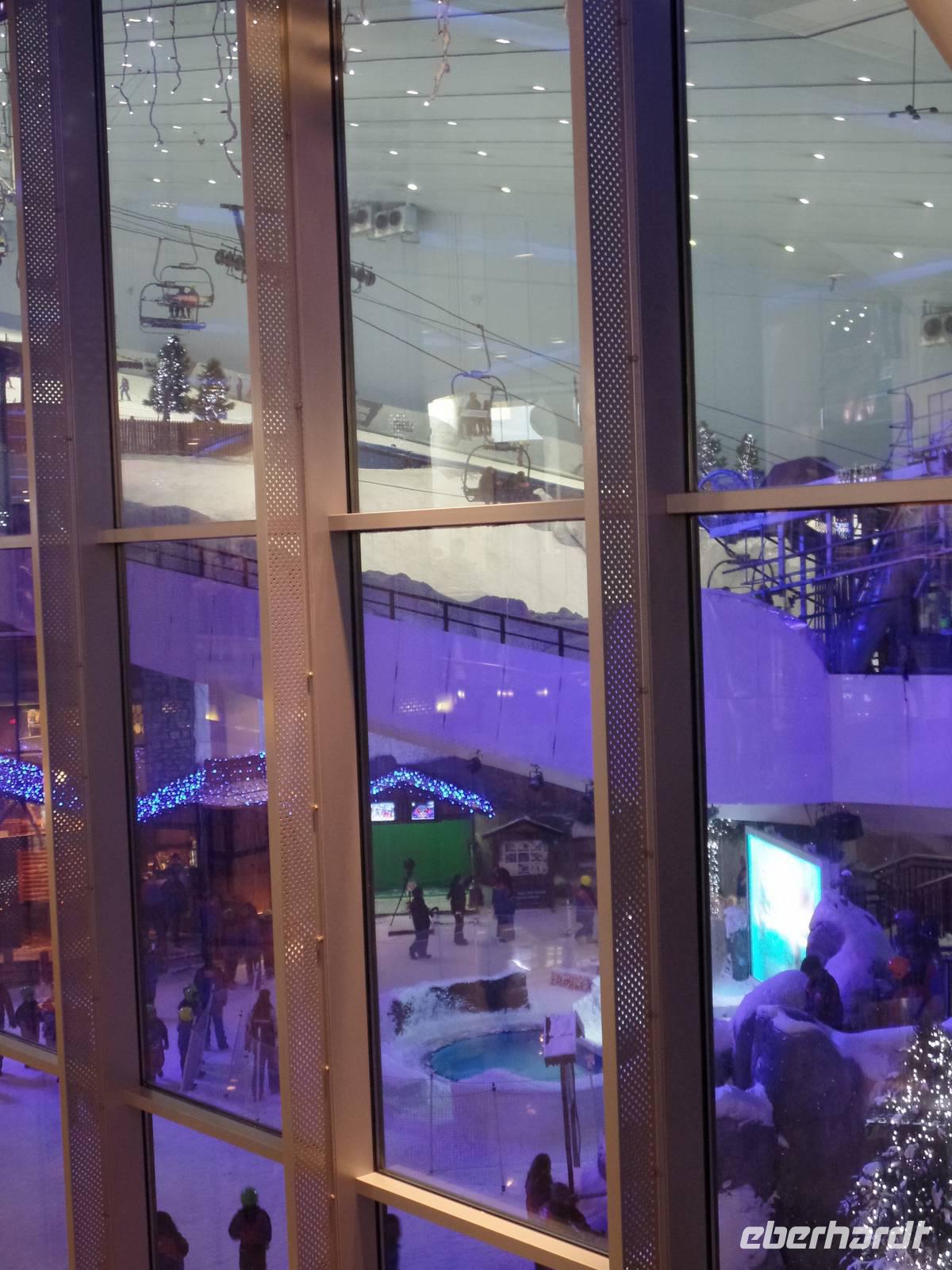 Heute war der Silvestertag gekommen und wir hatten auf unserem Plan noch das Neue Dubai stehen, ehe wir das neue Jahr begrüßen durften. Also ging es am Morgen vom Hotel los in Richtung The Palm, eine aufgeschüttete Insel in Form einer Palme. Wir fuhren entlang des Palmenstammes, um zum bekannten Hotel Atlantis zu kommen. Hier konnten wir leider keine Fotos vom Hotelinneren machen, weil es kein Hineinkommen für Nicht-Hotelgäste gibt. Doch wir wollten das Hotel dennoch fotografieren und so lud ich meine Gäste auf eine Fahrt mit der Monorail ein. Die fahrerlose Einschienenbahn gleitet auf Viadukten über die künstlich angelegte Insel und ist ein Highlight für sich. Während der Fahrt konnten wir ein herrliches Bild vom The Palm Atlantis Hotel bekommen und auch einen Überblick über die Palmenwedel, auf denen Eigenheime errichtet worden sind. Unser Bus nahm uns an der Endstation wieder auf und wir fuhren weiter zur Dubai Marina. Der Stadtteil Dubais bekam seinen Namen vom künstlichen Kanal, an dessen Uferpromenade sich ein großer Yachthafen und viele kleinere Bootsanlegestellen befinden. Abgerundet wird das ganze Areal von vielen Geschäften und Cafés, sowie mehreren Wolkenkratzern. Das letzte Ziel des heutigen Ausfluges war die Mall of Emirates. Hier gaben wir den Gästen die Möglichkeit, mit uns anschließend wieder ins Hotel zu fahren oder noch ein wenig den Nachmittag zu genießen. Jede Mall in Dubai hat ihre kleinen Besonderheiten und so hat die Mall of Emirates eine eigene Ski Halle. Wer also wollte, konnte bei einer Außentemperatur von nicht ganz 30 Grad die Ski oder das Snowboard anschnallen und die Hügel hinunter fahren.