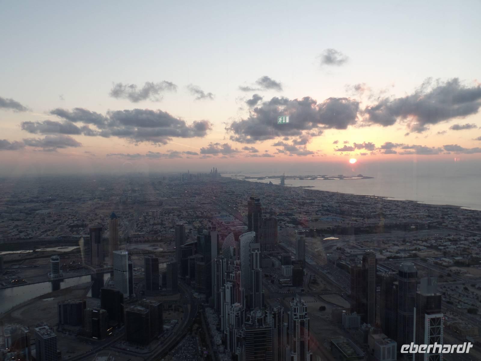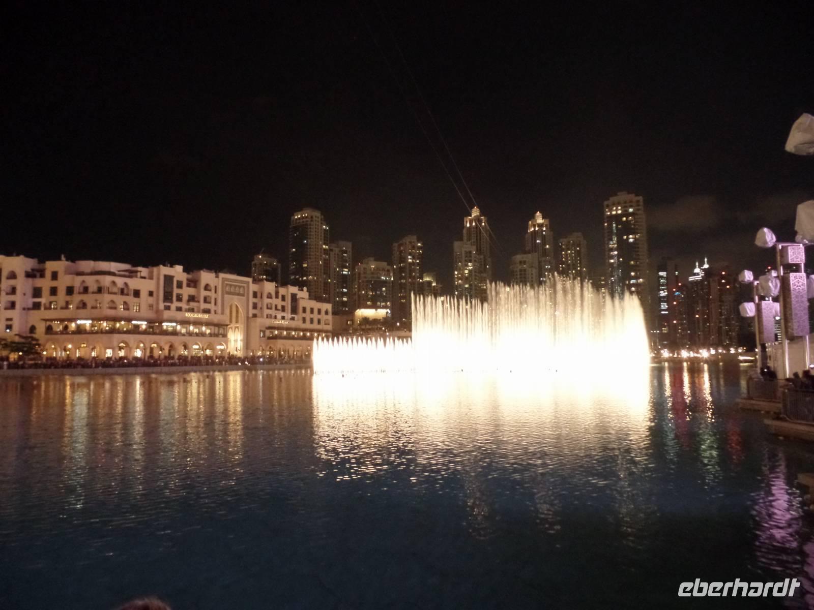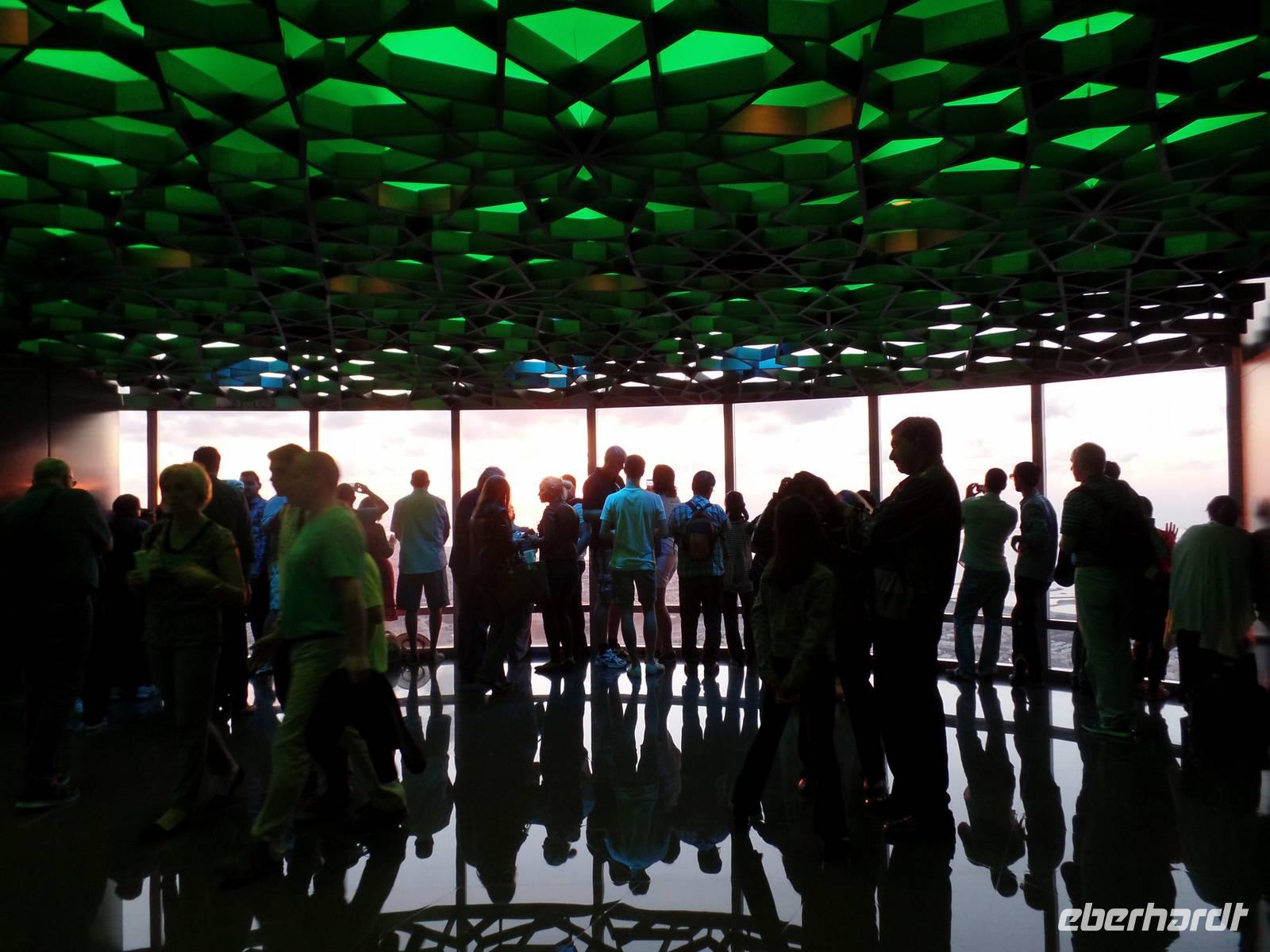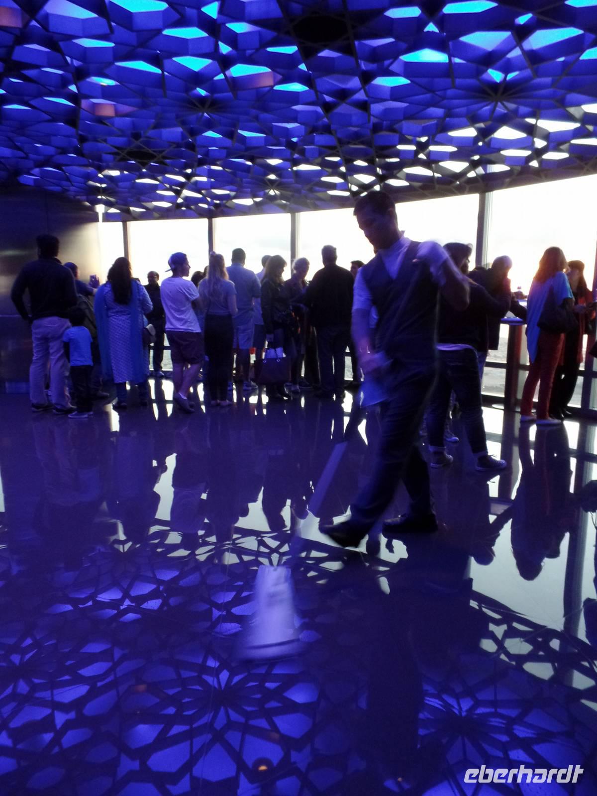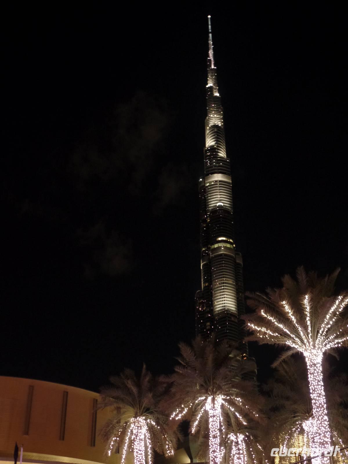 Ayleen führte uns schließlich noch ein wenig durch die Mall und zeigte uns besondere Stellen, die jeder Besucher gesehen haben sollte. Am Nachmittag kam dann wohl das Highlight des gesamten Tages. Die Auffahrt auf das höchste Gebäude der Welt. Mit seinen 828 Metern hat man das Gebäude schon aus dem Flieger erkennen können, doch wenn man direkt davor steht fühlt man sich erst recht winzig. Doch wir wollten hoch hinaus und so ging es nach langem Warten endlich in die 124. Etage. Der Fahrstuhl schoss uns regelrecht nach oben. Oben angekommen, erwartete uns ein atemberaubender Ausblick auf Dubai. Die Sonne war gerade dabei unterzugehen und s o konnten wir fantastische Aufnahmen machen. Bevor es zum Abendessen in die Twin Towers ging, erlebten wir noch eine herrliche Kombination aus Licht und Musik an der Dubai Fountain, direkt vor dem Burj Khalifa und der Dubai Mall. Und hier muss wirklich gesagt werden, wer einmal in die Dubai ist, muss dies unbedingt gesehen haben, es ist einfach wunderschön.