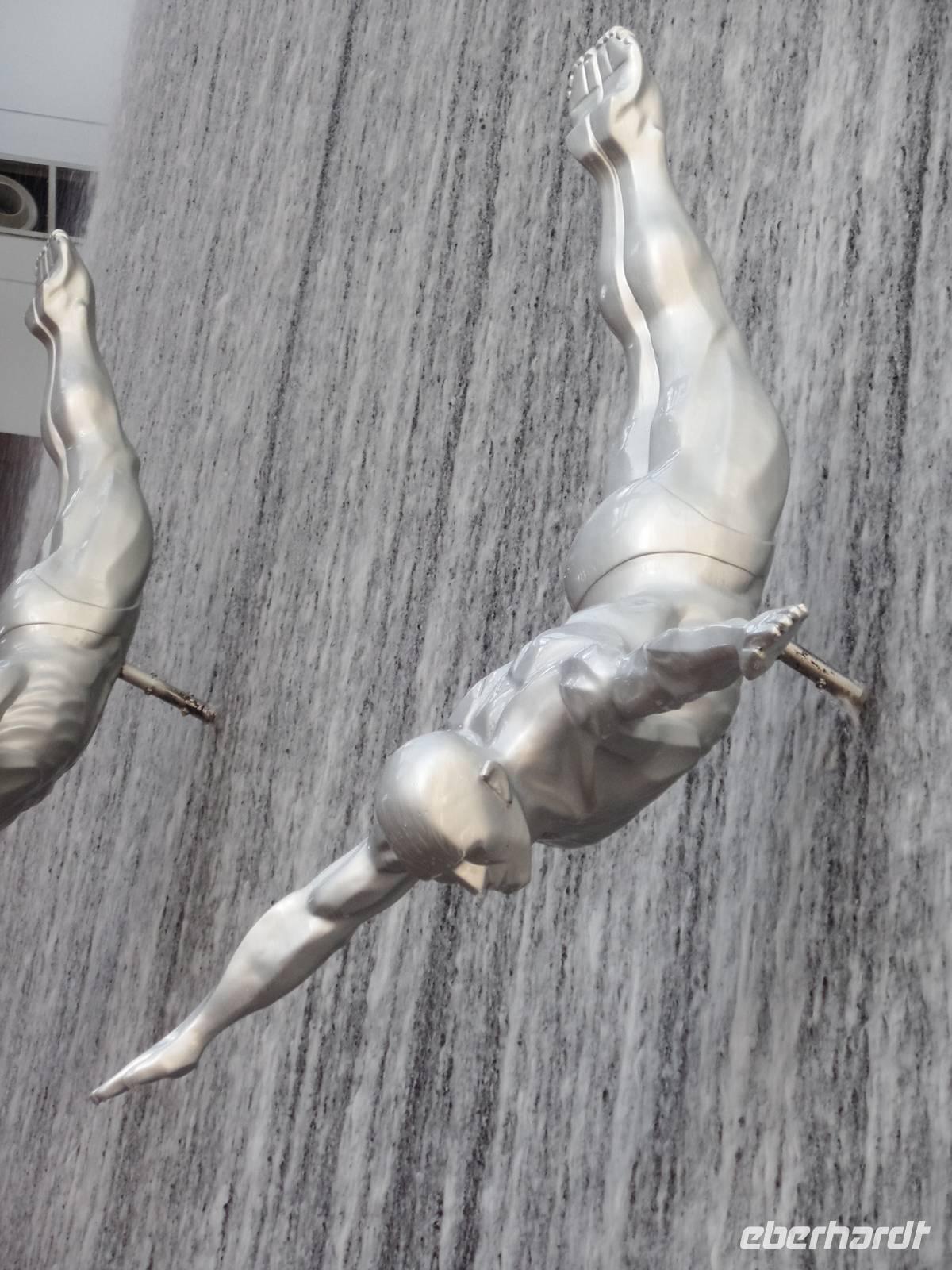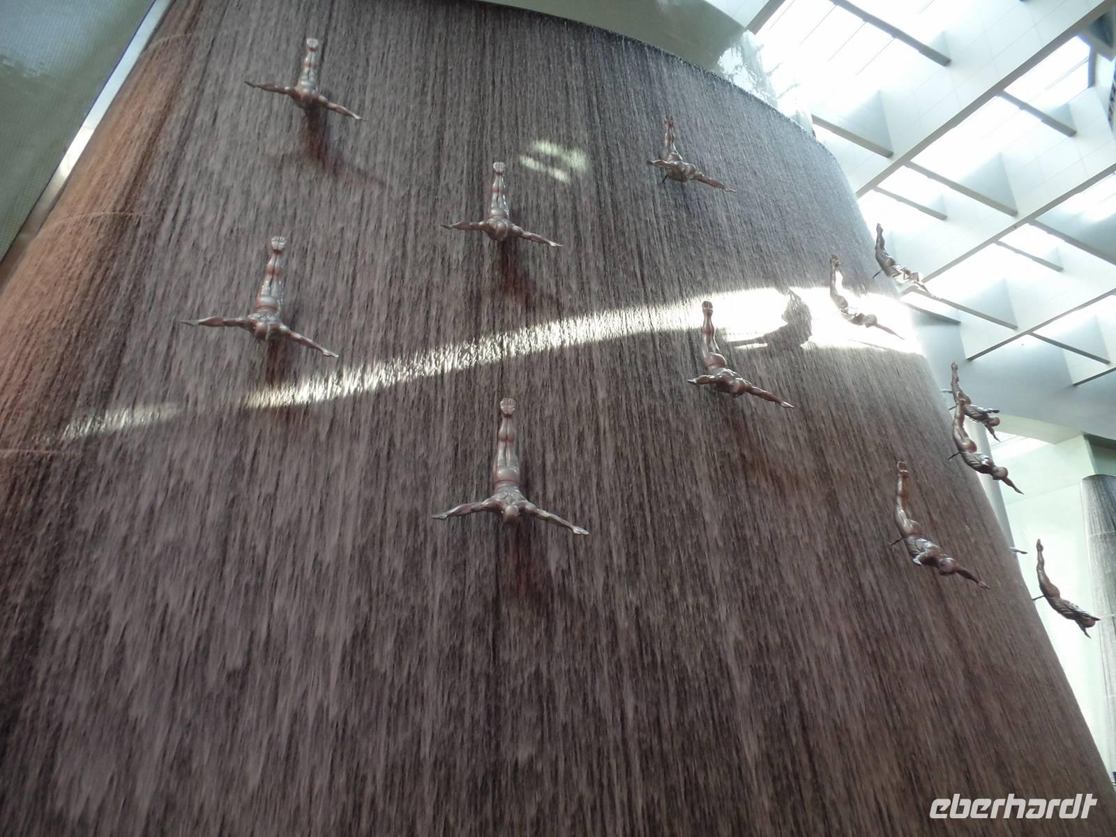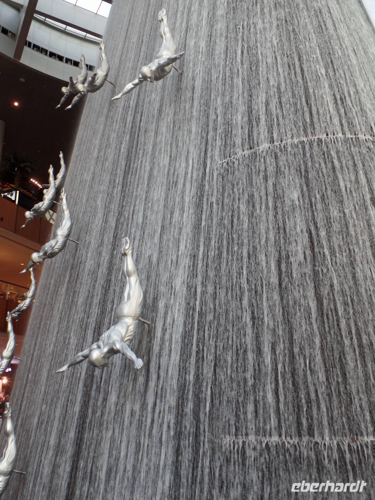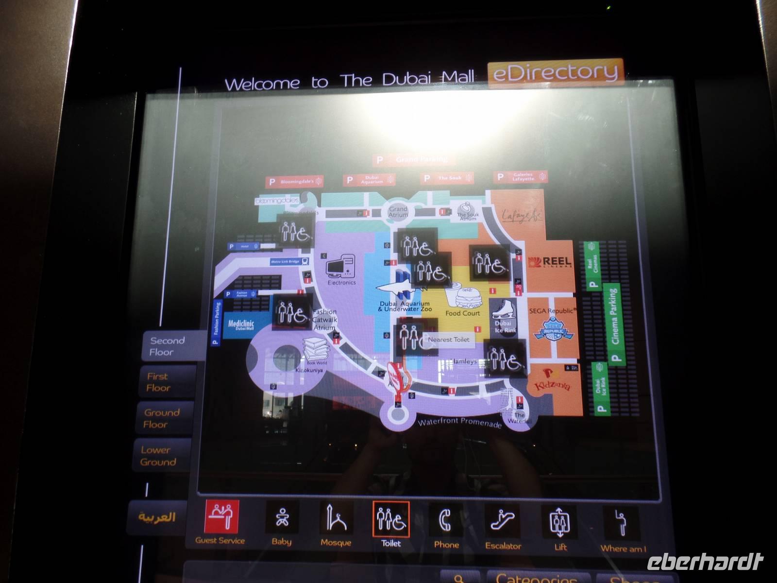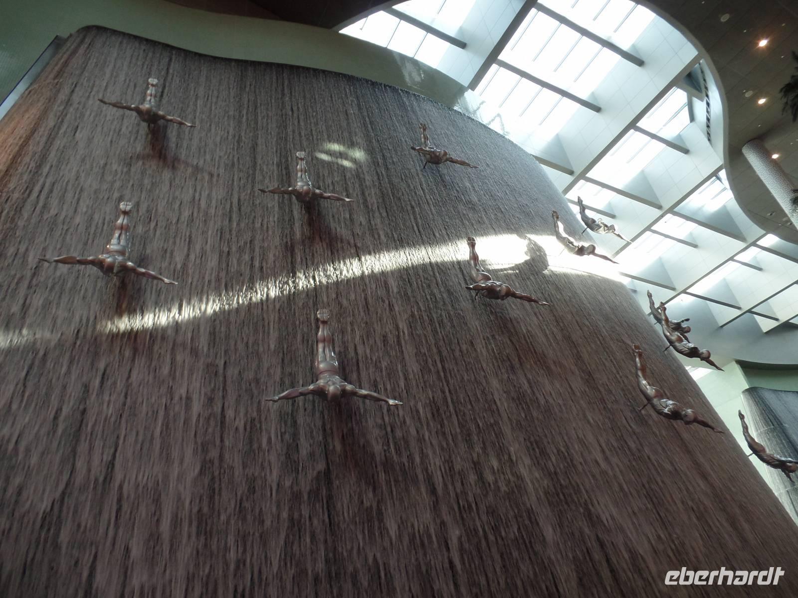 Ayleen führte uns schließlich noch ein wenig durch die Mall und zeigte uns besondere Stellen, die jeder Besucher gesehen haben sollte. Am Nachmittag kam dann wohl das Highlight des gesamten Tages. Die Auffahrt auf das höchste Gebäude der Welt. Mit seinen 828 Metern hat man das Gebäude schon aus dem Flieger erkennen können, doch wenn man direkt davor steht fühlt man sich erst recht winzig. Doch wir wollten hoch hinaus und so ging es nach langem Warten endlich in die 124. Etage. Der Fahrstuhl schoss uns regelrecht nach oben. Oben angekommen, erwartete uns ein atemberaubender Ausblick auf Dubai. Die Sonne war gerade dabei unterzugehen und s o konnten wir fantastische Aufnahmen machen. Bevor es zum Abendessen in die Twin Towers ging, erlebten wir noch eine herrliche Kombination aus Licht und Musik an der Dubai Fountain, direkt vor dem Burj Khalifa und der Dubai Mall. Und hier muss wirklich gesagt werden, wer einmal in die Dubai ist, muss dies unbedingt gesehen haben, es ist einfach wunderschön.