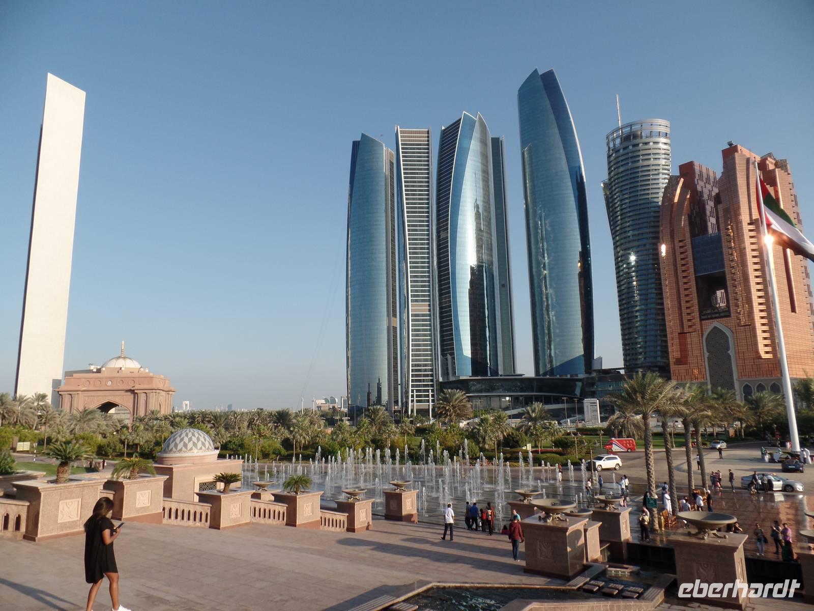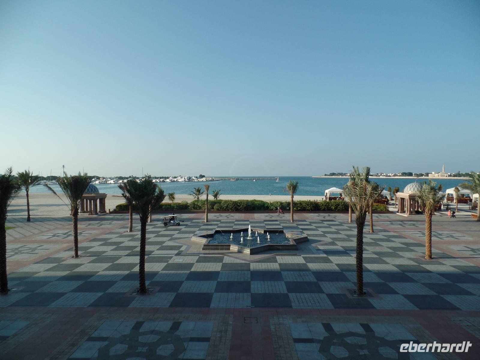 Da ein Highlight das Nächste jagt, begaben wir uns anschließend zum Emirates Palace. Davor machten wir allerdings noch einen kleinen Fotostopp im Heritage Village. Von hier hatte man einen grandiosen Blick auf die Skyline von Abu Dhabi. Das Gebäude mit seinem Gelände war einfach nur schön anzusehen. Zur Teestunde gab es Wasser, Tee und Kaffee und kleinere herzhafte und süße Köstlichkeiten mit echtem Blattgold. Zum Schluss waren wir uns alle einig, diese Teestunde war GOLDWERT!