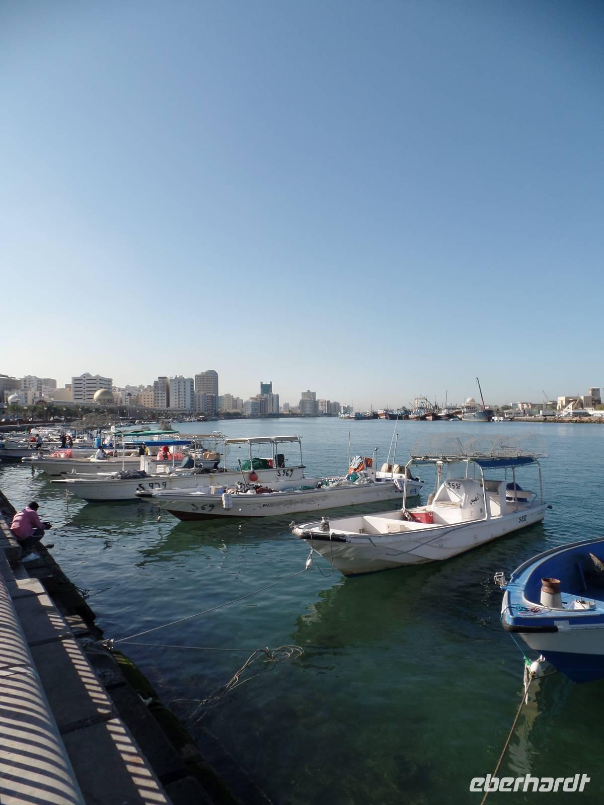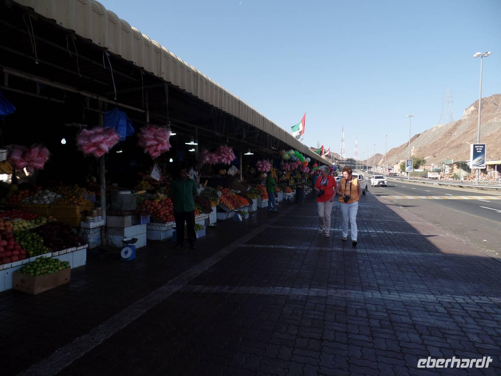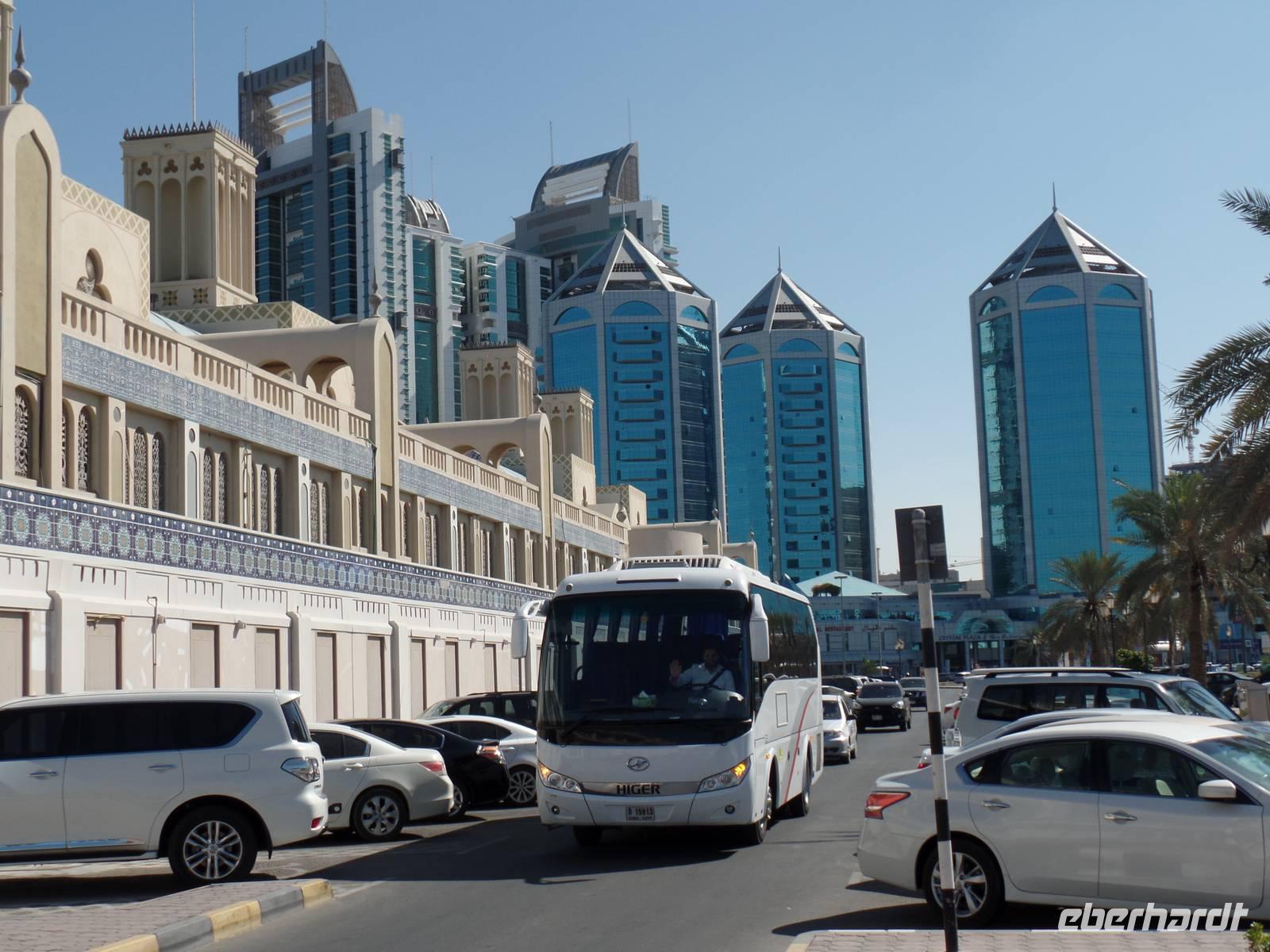 Heute ging es in das Nachbaremirat Sharjah. Hier sind die Regeln, nach welchen die Menschen leben, doch um einiges strenger. Es darf beispielsweise kein Alkohol in das Emirat gebracht werden. Da wir auch nicht vorhatten, diese Regel zu brechen, stand uns einem schönen Ausflug nichts mehr im Wege. Unser erster Stopp war an der King-Faisal-Moschee, welche wir hier aber nur von außen besichtigen konnten, da es Nicht-Muslimen in Sharjah verboten ist, eine Moschee zu betreten. Bevor es auf den Fisch- und Gemüsemarkt ging, fuhren wir auf einen kleinen Souk, wo sich ein Großteil der Gäste mit Tüchern eindeckte.Der Fisch - und Gemüsemarkt war danach für alle beteiligten eine Premiere. Für uns, weil wir noch nicht hier waren, und für Ayleen, weil es seit 25 Tagen einen neuen und moderneren Markt gibt. Der alte Fischmarkt wurde abgerissen und war somit nicht mehr unter freiem Himmel und hygienisch nicht im besten Zustand, sondern es gab nun eine moderne und saubere Halle in der auf der einen Seite der Fisch- und Fleischmarkt und auf der anderen Seite frisches Obst und Gemüse gekauft werden konnte. Hier konnte man seinen Fisch abgeben und dieser wurde dann vor seinen Augen fachgerecht entschuppt und auseinander genommen.