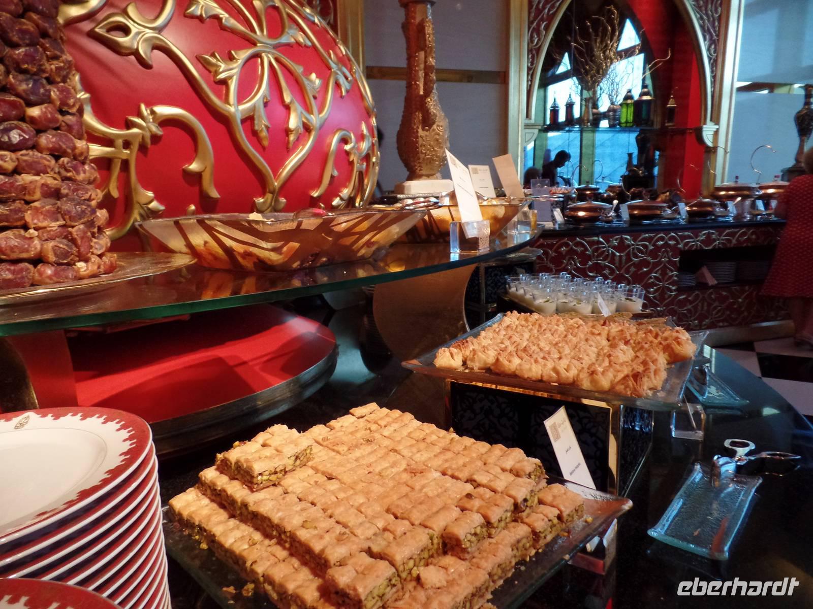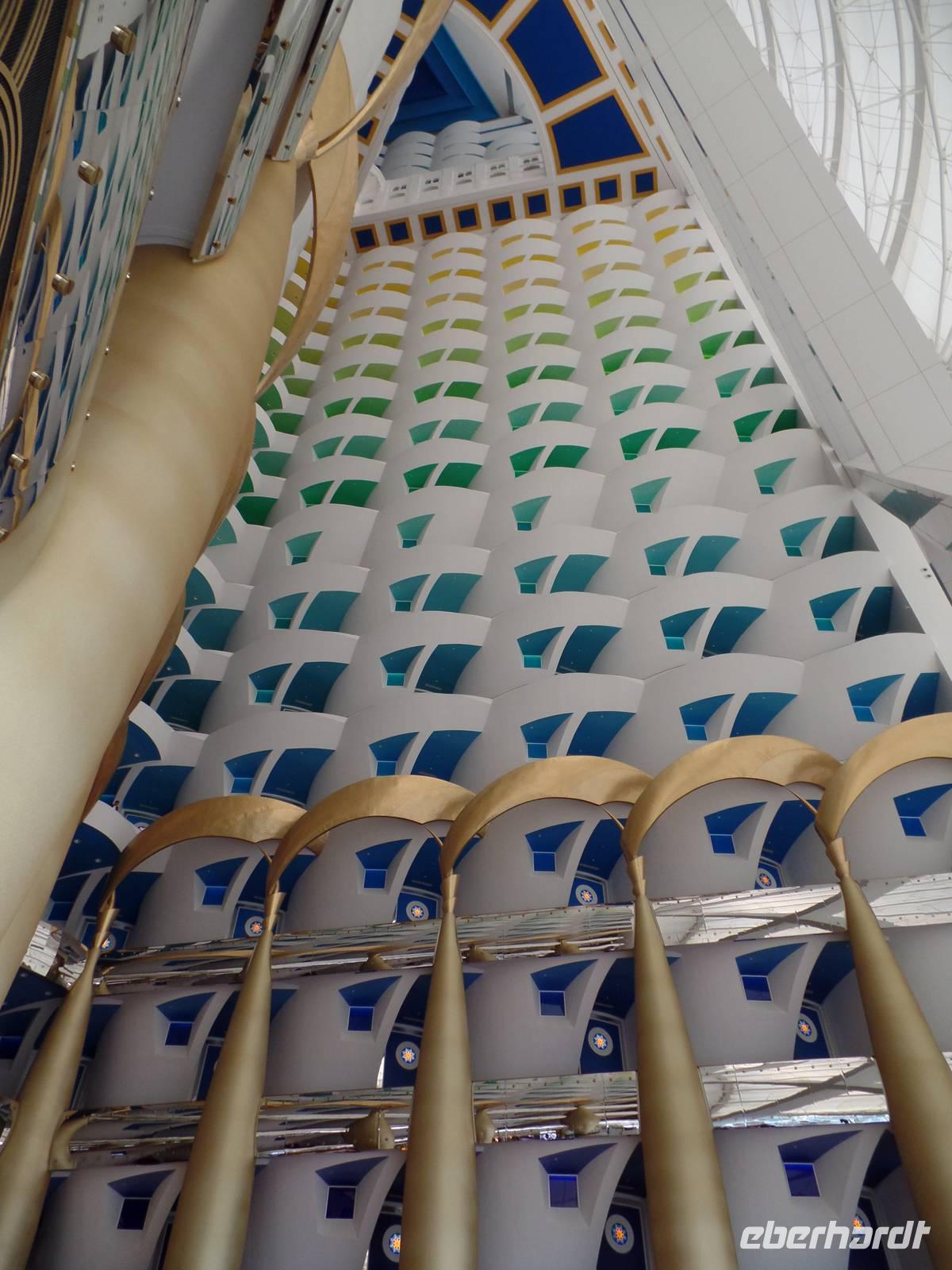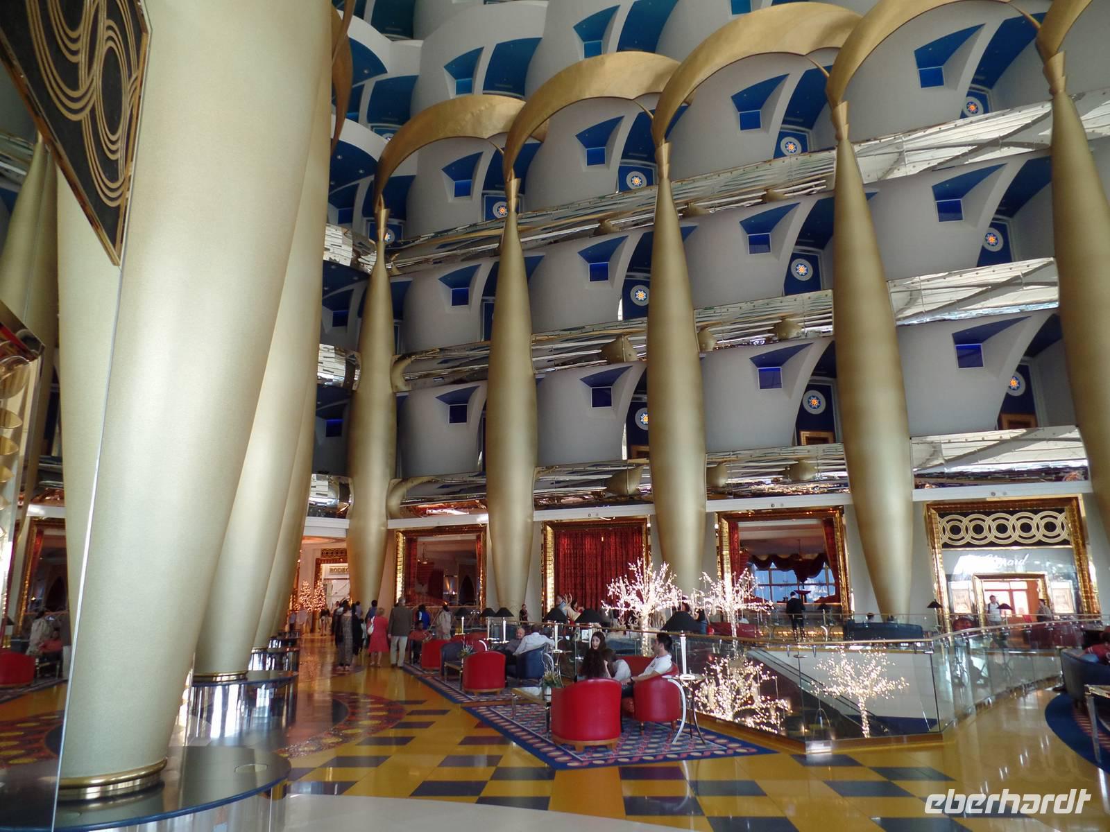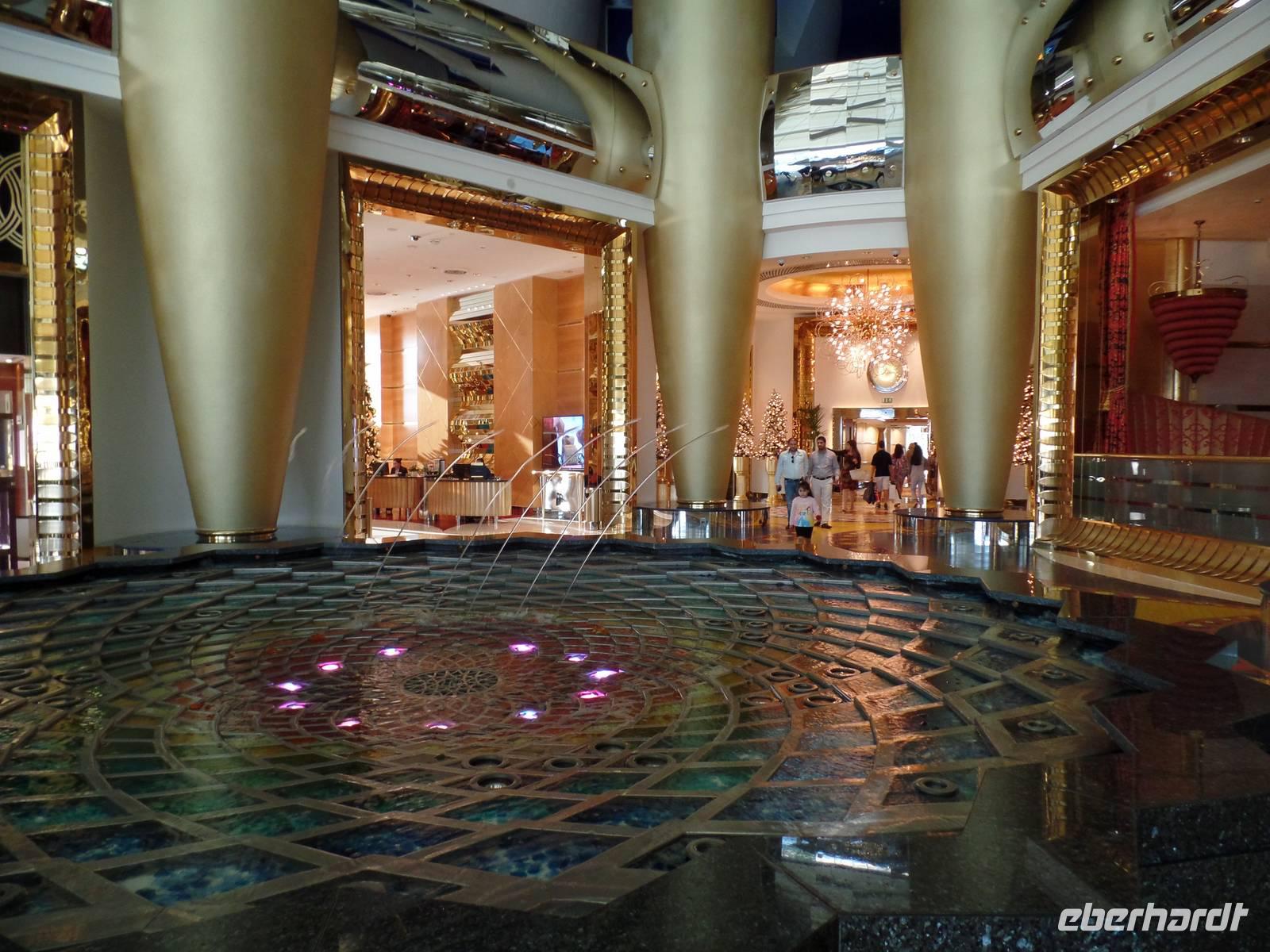 Gegen Mittag hieß es dann elegante Kleidung für die Damen und Herren, welche das Hotel in Form eines Segels bestaunen wollten. Viel hatte man schon gehört oder in den Medien gesehen, aber vorstellen konnte man es sich nur schwer. „Es ist nicht alles Gold, was glänzt", so lautet ein bekannter Spruch. Doch wer einmal die Möglichkeit hatte im Burj al Arab zu sein, der weiß, dass eben doch alles Gold ist, was glänzt. Hier speisten wir nun gemeinsam von einem sehr reichhaltigen Buffet mit verschiedenen Salaten, Suppen, Fleisch- und Fischgerichten, Obst und Dessert und immer wenn man an seinen Platz zurückkehrte, war die Stoffserviette wieder neu gefaltet. Bevor es wieder zum Bus ging, gab es noch kurz Freizeit im Hotel. Das Unglaublichste wurde zur Wirklichkeit. Eine Kundin schaffte es, eine Suite zu bestaunen. Der absolute Höhepunkt war anschließend, als der Butler ihr noch Frucht zum Essen angeboten hat.