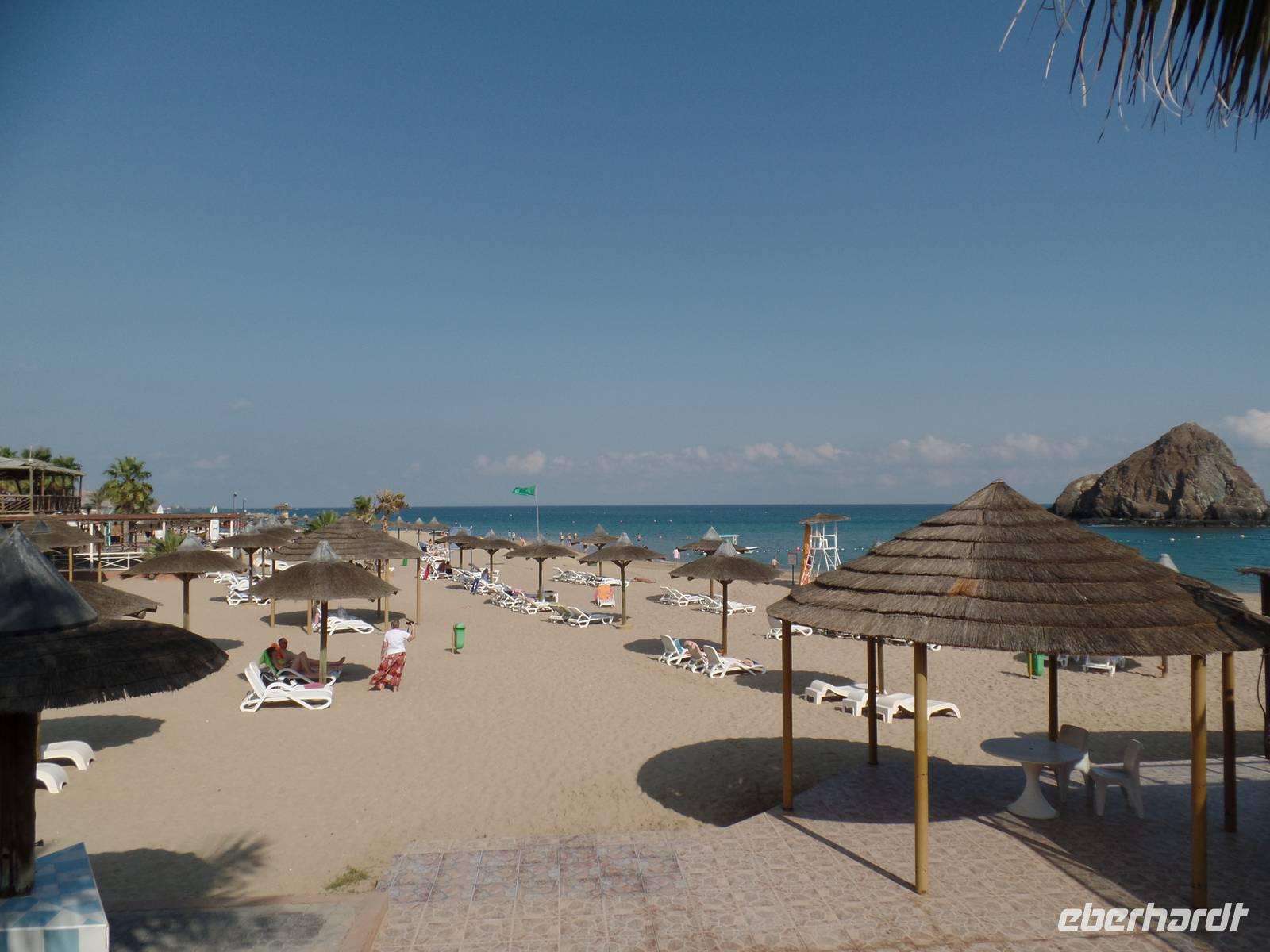 Heute war auch schon unser letzter Tag in Dubai angebrochen und wir gaben den Gästen die Gelegenheit mit uns einen Ausflug an die Ostküste zu unternehmen. Nicht alle wollten daran teilnehmen, einige nutzten die Freizeit um sich noch einmal Dubai Marina anzusehen oder in einer der Malls shoppen zu gehen. Alle anderen fuhren gemeinsam mit Sandra und mir in Richtung Hajar-Gebirge an der Grenze zum Oman. Bevor wir an unserem eigentlichen Ziel dem Sandy Beach Hotel ankamen, legten wir noch Stopps am Freitagsmarkt und an der Moschee von Bidiyah ein. Gegen Mittag erreichten wir die Ostküste, wo wir die letzten Stunden vor Abflug genießen konnten. Das Motto hieß jetzt hier: Entspannen, die Reise Revue passieren lassen und das sonnige Wetter bei einem Bad im Meer zu genießen. Zum frühen Abend erreichten wir schließlich unser Hotel und es hieß wieder Taschen packen.