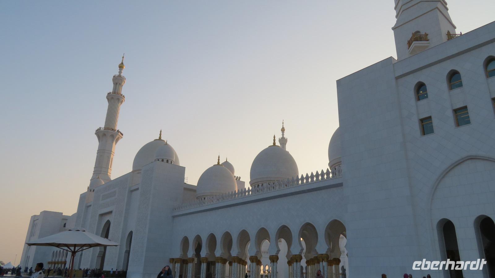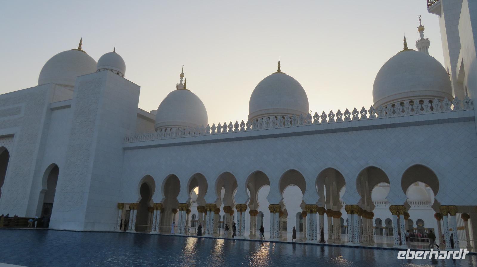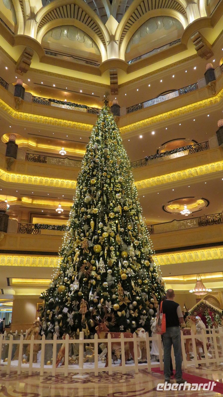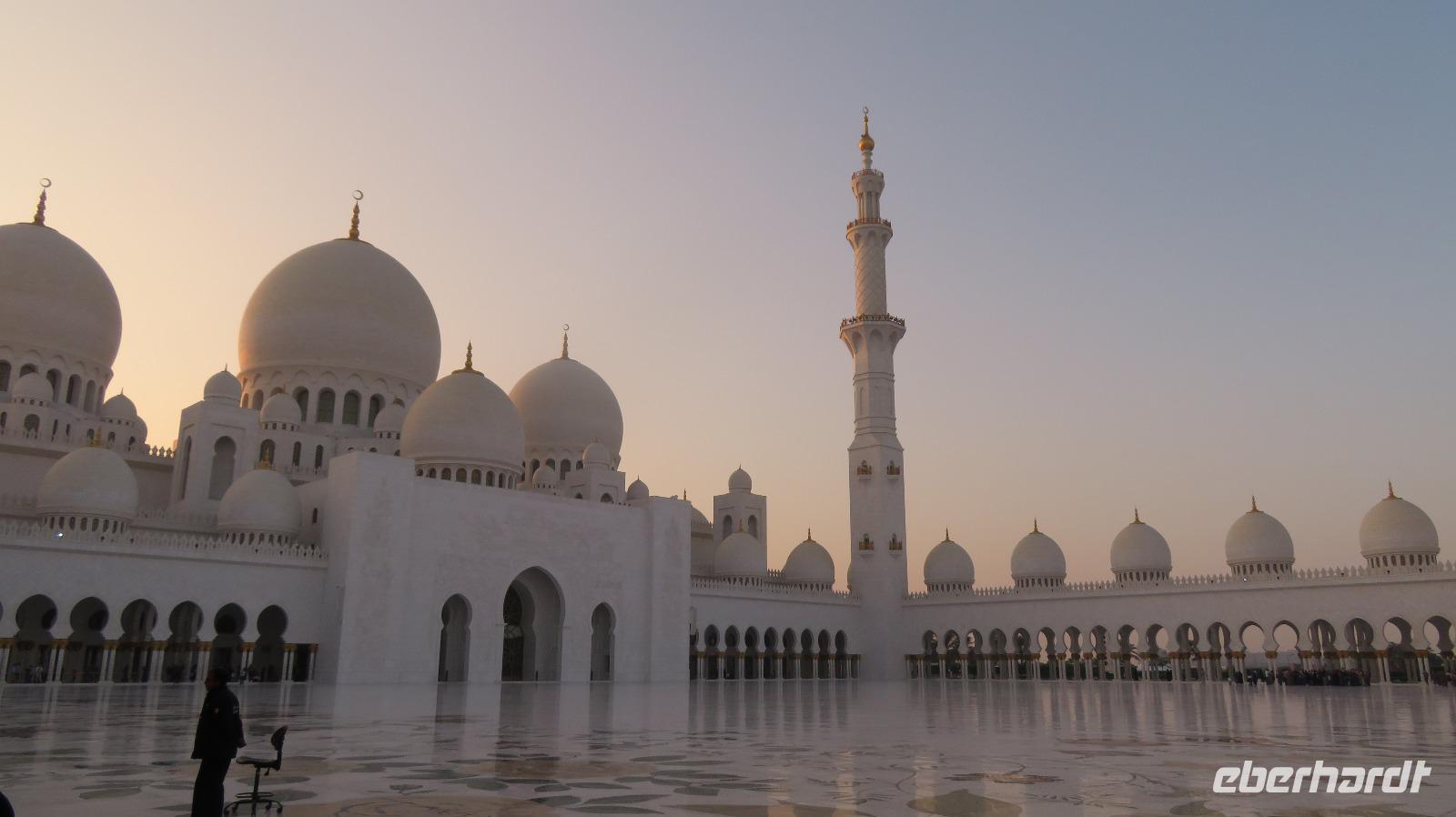 Nach einer wirklich sehr kurzen Nacht klingelt der Wecker und das Hotel lädt uns zum Frühstück ein. Ich war vor rund drei Jahren schon einmal in einem anderen Hotel in Dubai und ich muss ehrlich zugeben, dass ich vom Frühstück im Hotel Gloria sehr angetan bin. Hier gibt es internationales Frühstück: warme Gerichte für Gäste aus Asien, eine Omlette-Station, Wurst, Käse, Obst und dunkles Brot und Brötchen. Also so werden unsere Tage hier sehr gut starten. Um 08:00 Uhr erwartet uns unsere örtliche Reiseleiterin für die nächsten Tage, die liebe Anja, um uns zu begrüßen. Wir sind noch sehr verschlafen aber dennoch freuen wir uns auf unseren Ausflug nach Abu Dhabi. Nachdem wir im Bus Platz genommen haben, starten wir auch schon vorbei an der Dubai Marina, die wir aufgrund des starken Nebels nur erahnen können in Richtung Abu Dhabi. Anja beginnt schon mit ihren Erläuterungen und was ich persönlich sehr gut finde, wir können auch zwischendurch immer wieder unsere Fragen loswerden. Anja erzählt von sich auch immer wieder Kuriositäten so z.B. auch, dass der Scheich von Abu Dhabi für einen gewissen Zeitraum den Doppeldecker für Blitzbilder eingeführt hat. Wer also einmal geblitzt wurde, kann sich auch noch ein zweites Mal blitzen lassen und bezahlt nur einmal - was für ein Spaß. Als wir in das Emirat Abu Dhabi kommen, was man an den Straßenlaternen und dem Straßenbelag erkennt, klart sich das Wetter langsam auf und die Sonne kommt hervor. Unser erstes Ziel ist die Falkenklinik der deutschen Ärztin Frau Dr. Müller. Hier erleben wir eine Führung und lernen viel über Falken kennen. Zunächst werden wir in einen Raum geführt, wo es im Allgemeinen um die Klinik und die Falken geht. Danach führt uns der Guide in den Behandlungsraum, wo einige Falken auf ihre Behandlung warten. An denen erklärt er uns sowohl die Unterschiede zwischen männlichen und weiblichen Falken als auch den Falkenarten an sich. Danach werden wir Zeugen einer Falkenuntersuchung. Das Tier wird narkotisiert und die Krallen werden ihm geschliffen. Auch wird uns hier erklärt, was passiert, wenn eine Feder bricht. Für unsere Fragen nehmen sich die Ärzte auch Zeit. Als wir in einen Raum gebracht werden, in dem zahlreiche Pokale ausgestellt sind, haben wir auch die Gelegenheit in einen Saal hineinzuschauen, in dem ein Falke gerade geröntgt wird. Ein weiterer Punkt bei unserer Führung ist ein Haus, in dem die Falken untergebracht sind und wo das soziale Verhalten der Tiere beobachtet wird. Wer zum Schluss noch den Mut besitzt, kein sich einen Falken auf den Arm setzen lassen. Zurück im Bus ist unser nächstes Ziel Yas-Island, die Heimat der Formel-1-Rennstrecke. Nachdem wir die Erlaubnis haben, auf die kleine Insel aufzufahren, steigen wir aus dem Bus aus und werden erst einmal überrascht, was Weihnachten unter der Sonne bedeutet. Überall stehen noch geschmückte Tannenbäume und das typisch weihnachtliche Grüngesteck ist mit künstlichem Schnee besprüht. Wir nehmen uns jetzt die Zeit für einen Fotostopp mit dem Motiv der Rennstrecke. Irgendeine Übungsrallye wird gerade gefahren denn wir hören die Motoren immer wieder vorbei rauschen. Ein leichtes Gänsehautgefühl überkommt uns. Danach fahren wir weiter nach Abu Dhabi-Stadt. Vorbei an der Ferrari-World und dem Louvre sehen wir schon die Hochhäuser von Abu Dhabi. Eigentlich wollen wir jetzt einen Stopp am Heritage Village machen aber leider ist dieses heute geschlossen. Wahrscheinlich wird hier gerade eine (Silvester-)Veranstaltung vorbereitet. Also machen wir unsere Pause in der Abu Dhabi-Mall und nutzen gleich einmal die Zeit zum Geldtausch oder zum Umziehen für unseren High-5-Tea im 7-Sterne-Hotel „Emirates Palace". Als wir hier vorfahren, begrüßen uns Wasserfontänen und wir müssen erst einmal die obligatorischen Beweisbilder knipsen. Im Inneren der Lobby steht noch der große Weihnachtsbaum, an dem uns Anja vorbei führt. Nun genießen wir unsere Tee-Stunde. Zunächst bekommen wir einen Cappuccino mit Goldblättern serviert. Danach langen wir bei der dreistöckigen Etegere zu. Ganz oben gibt es herzhafte Snacks und Sandwiches, in der Mitte eine Art Brötchen zu denen uns Cremes serviert werden und in der unteren Etage sind süße Highlights drapiert. Dazu werden weiter Tee und Kaffee gereicht. Wir fühlen uns sehr gut aufgehoben und irgendwie besonders - und das ist es auch. Gut gestärkt steht nun unser letzter Programmpunkt auf der Liste: wir besuchen die Sheikh-Zayed-Moschee, eine der schönsten Moscheen weltweit. Sie erinnert mich persönlich irgendwie an Märchen aus 1.001 Nacht. Während Anja unseren Rundgang erläutert, halte ich im hinteren Teil die Fotografen zusammen, die sich hier wahrlich „austoben" können. Nachdem wir durch den Innenhof gewandelt sind, sehen wir im Inneren der Moschee die Gebetsuhr, wunderschöne Wandgemälde und bunte Kronleuchter - einfach einmalig und kaum in Worte zu fassen. Ich kann nur jedem den Besuch dieser Moschee empfehlen. Als wir gehen, hören wir im Hintergrund noch den Muezzin singen. Da der Tag heute doch recht lang ist, nutzt ein Großteil meiner Gruppe die Fahrt zurück nach Dubai für ein Schläfchen den schlussendlich ist der Tag noch nicht zu Ende für uns: wir haben noch unser Abendessen im „Shape-Restaurant" im The-adress-Hotel in der Dubai Marina. Wir sitzen draußen auf der Terrasse und genießen den Ausblick auf die beleuchtete Marina und dem Restaurant „Pier 7", wo wir den Silvesterabend verbringen werden. Das Essen hier schmeckt wirklich gut - eine gut ausgewählte Location von unserer örtlichen Agentur. Dennoch sind wir auch glücklich, als wir am Abend endlich in unsere Betten fallen.