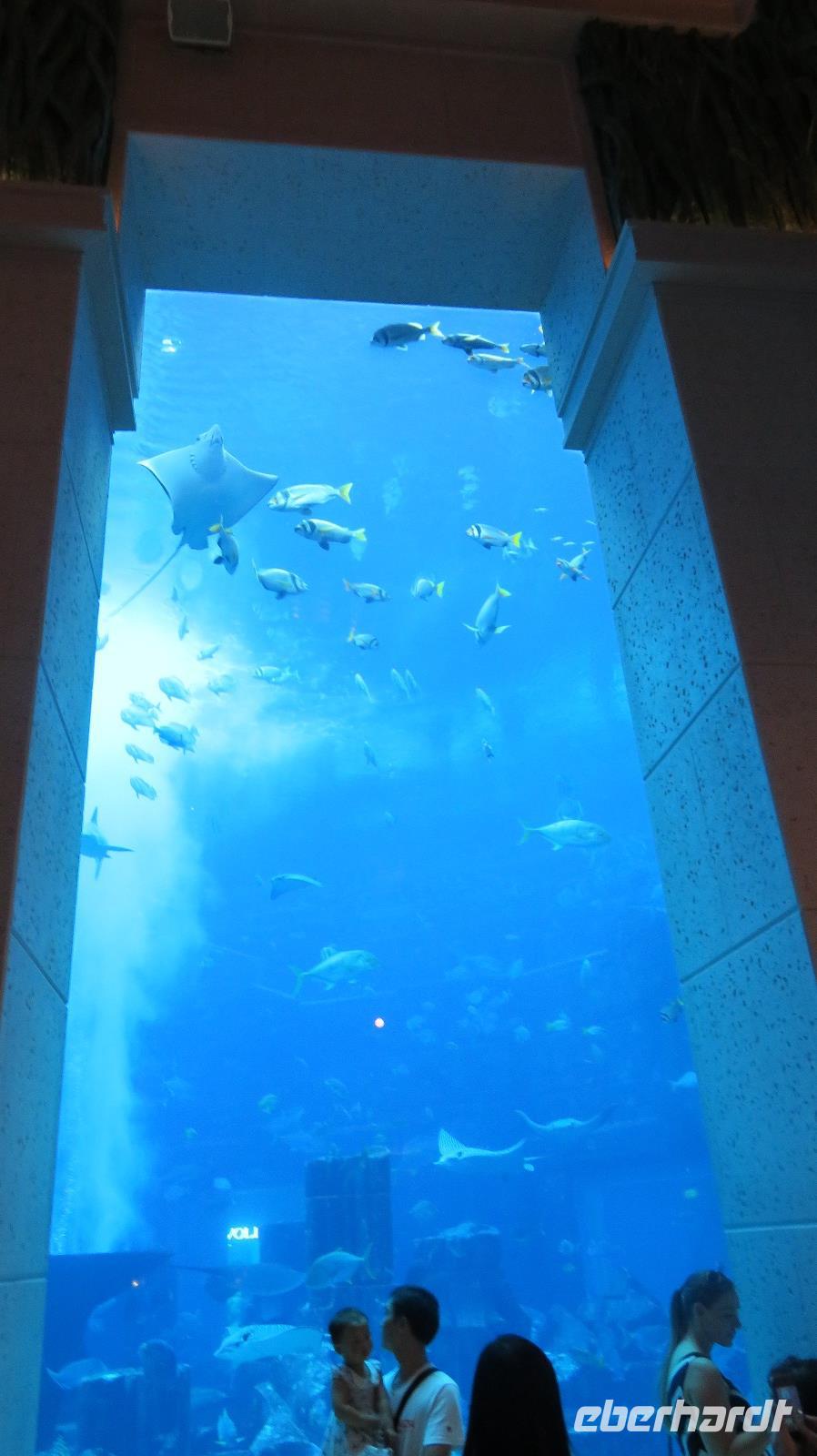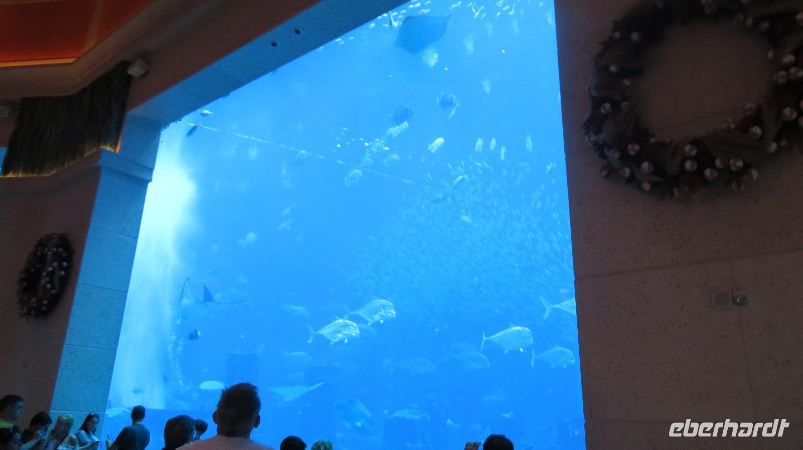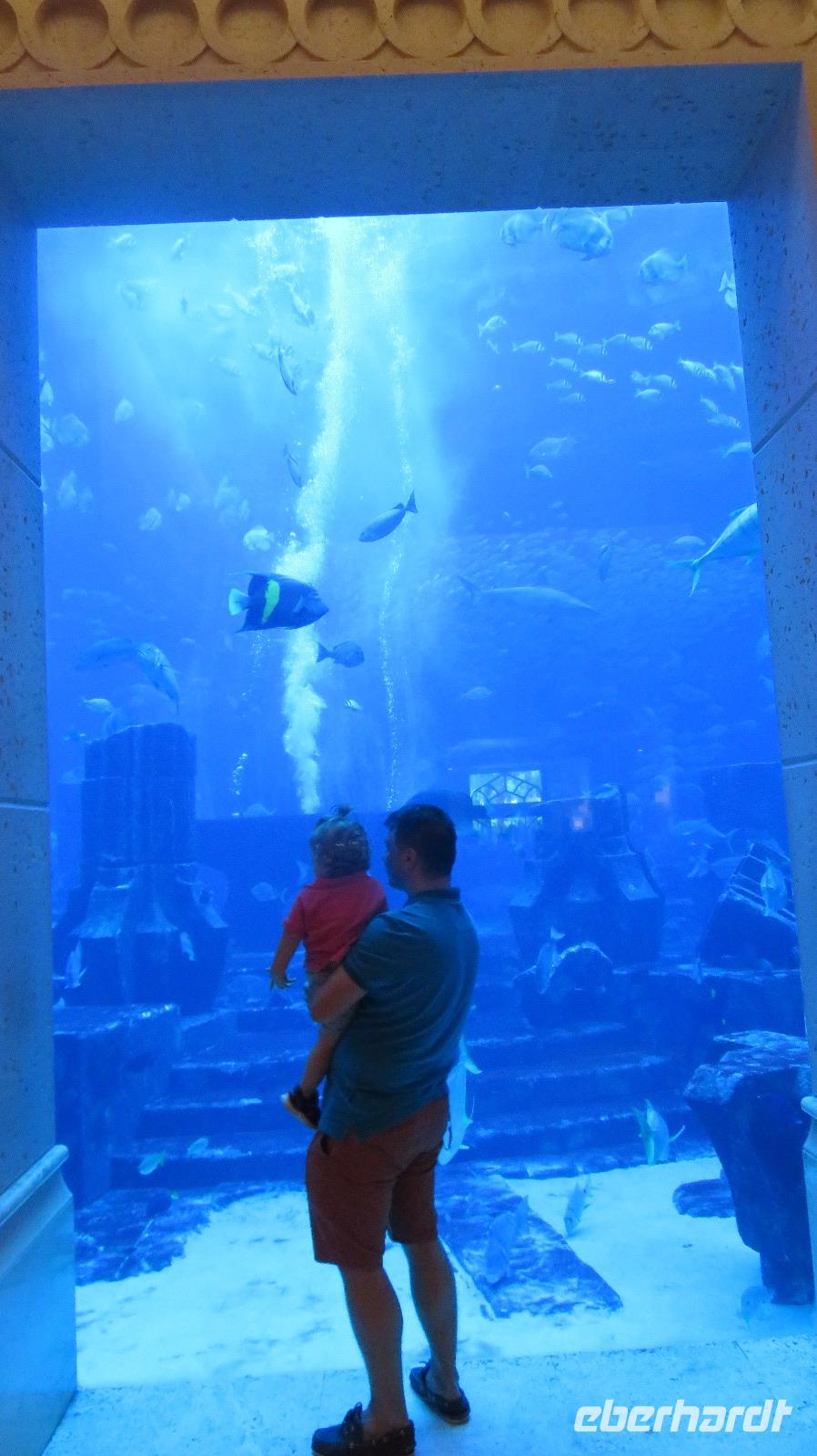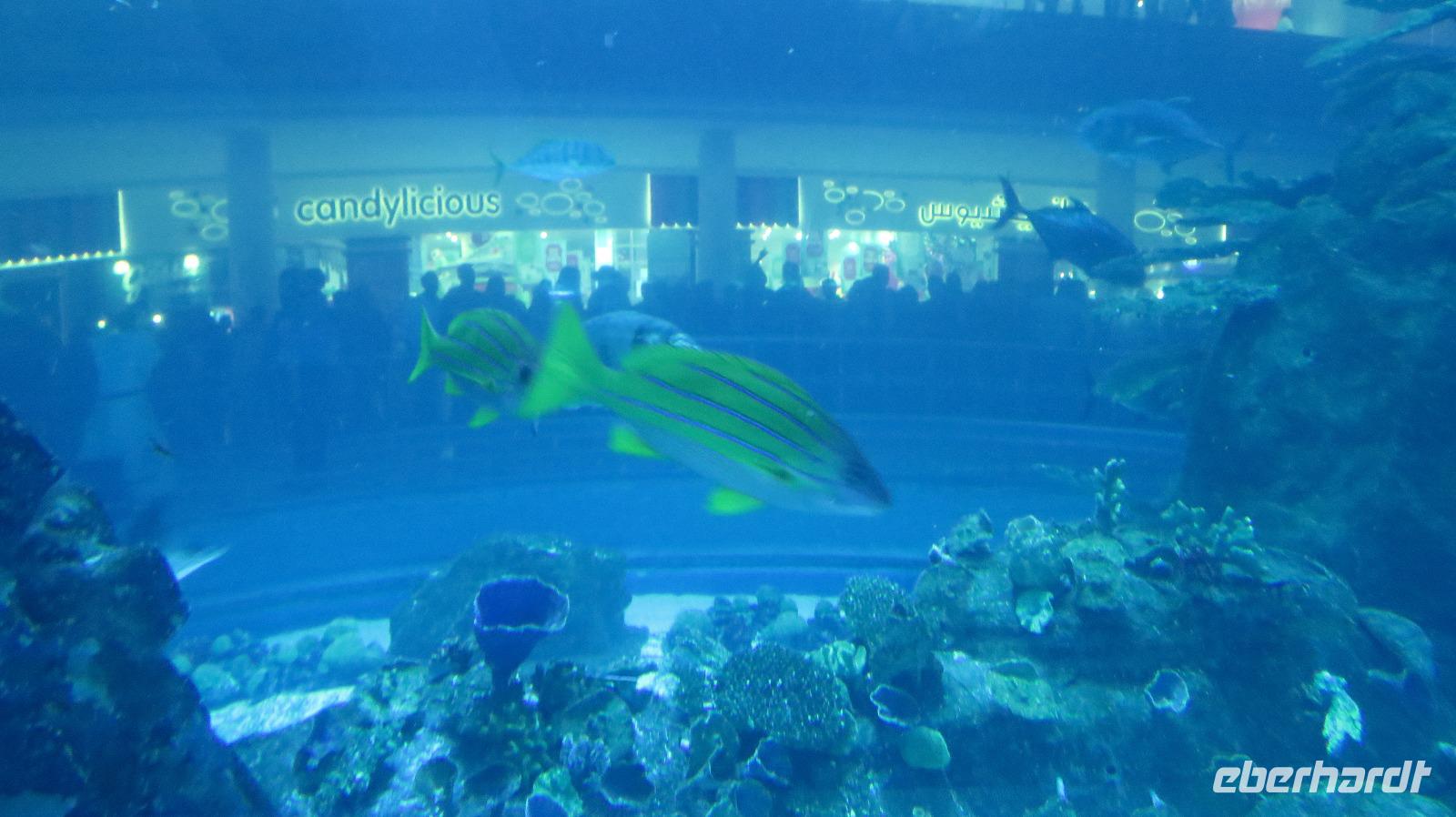 Die nächste Mall die wir besuchen ist auch zeitglich die größte im Land, die Dubai Mall. Über vier Etagen erstrecken sich hier zahlreichen Einkaufsläden und ich glaube, wer hier nichts findet, ist selber schuld. Charakteristisch für diese Mall ist ein Wasserfall aber vor allem das Aquarium, welches sich hier befindet. Eine Außenwand mit zahlreichen Fischen, die man auch ohne Eintritt anschauen kann, erstreckt sich über zwei Etagen. Mit einigen meiner Gäste besuche ich kurz das Aquarium, in dem wir u.a. Rochen, Pinguine und Haie beobachten können. Highlight des Besuches ist unser Spaziergang durch einen Tunnel, in dem man sich fühlt, als würde man durch das Wasser gehen: links, rechts und über uns schwimmen zahlreiche bunte Fische und Haie. Wooowwwww.