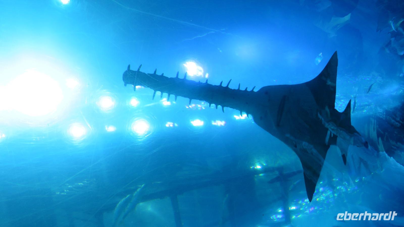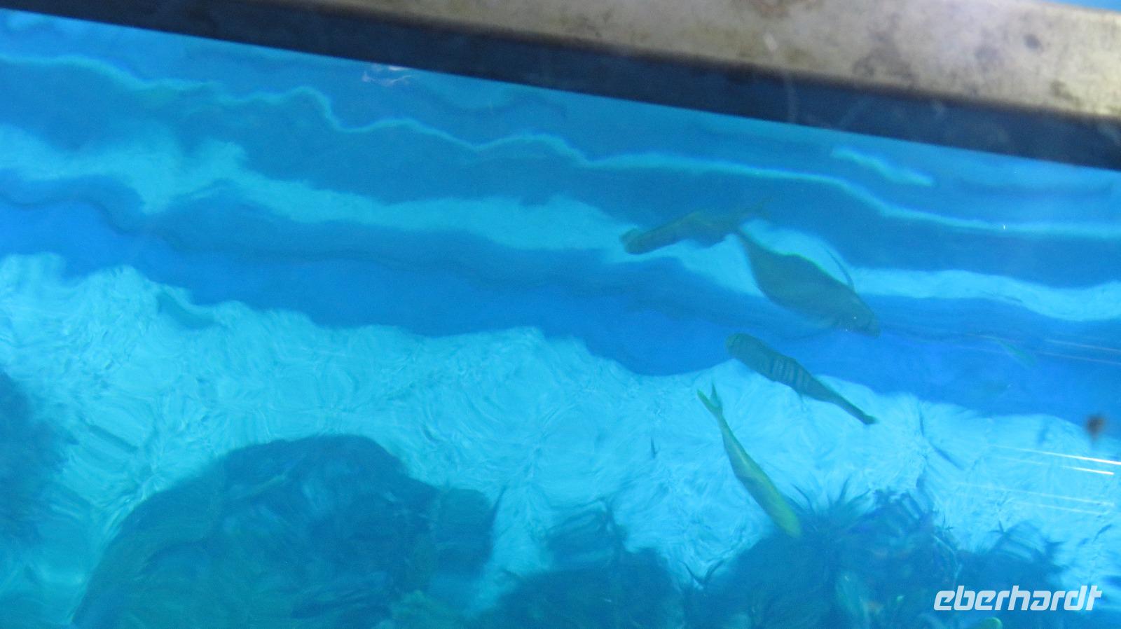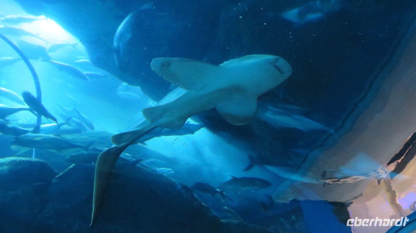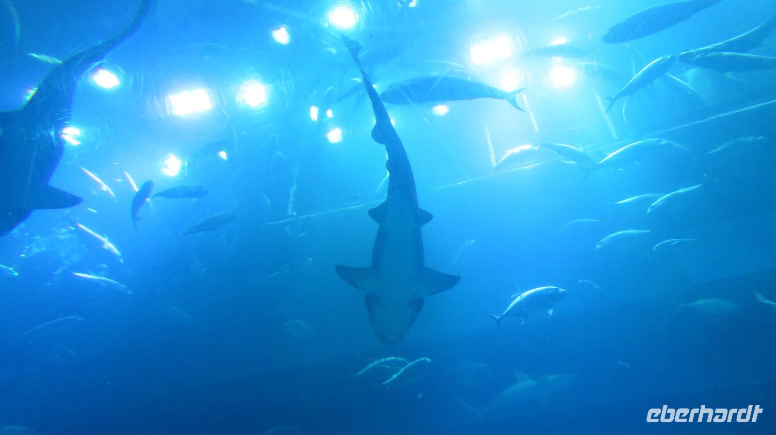 Die nächste Mall die wir besuchen ist auch zeitglich die größte im Land, die Dubai Mall. Über vier Etagen erstrecken sich hier zahlreichen Einkaufsläden und ich glaube, wer hier nichts findet, ist selber schuld. Charakteristisch für diese Mall ist ein Wasserfall aber vor allem das Aquarium, welches sich hier befindet. Eine Außenwand mit zahlreichen Fischen, die man auch ohne Eintritt anschauen kann, erstreckt sich über zwei Etagen. Mit einigen meiner Gäste besuche ich kurz das Aquarium, in dem wir u.a. Rochen, Pinguine und Haie beobachten können. Highlight des Besuches ist unser Spaziergang durch einen Tunnel, in dem man sich fühlt, als würde man durch das Wasser gehen: links, rechts und über uns schwimmen zahlreiche bunte Fische und Haie. Wooowwwww.
