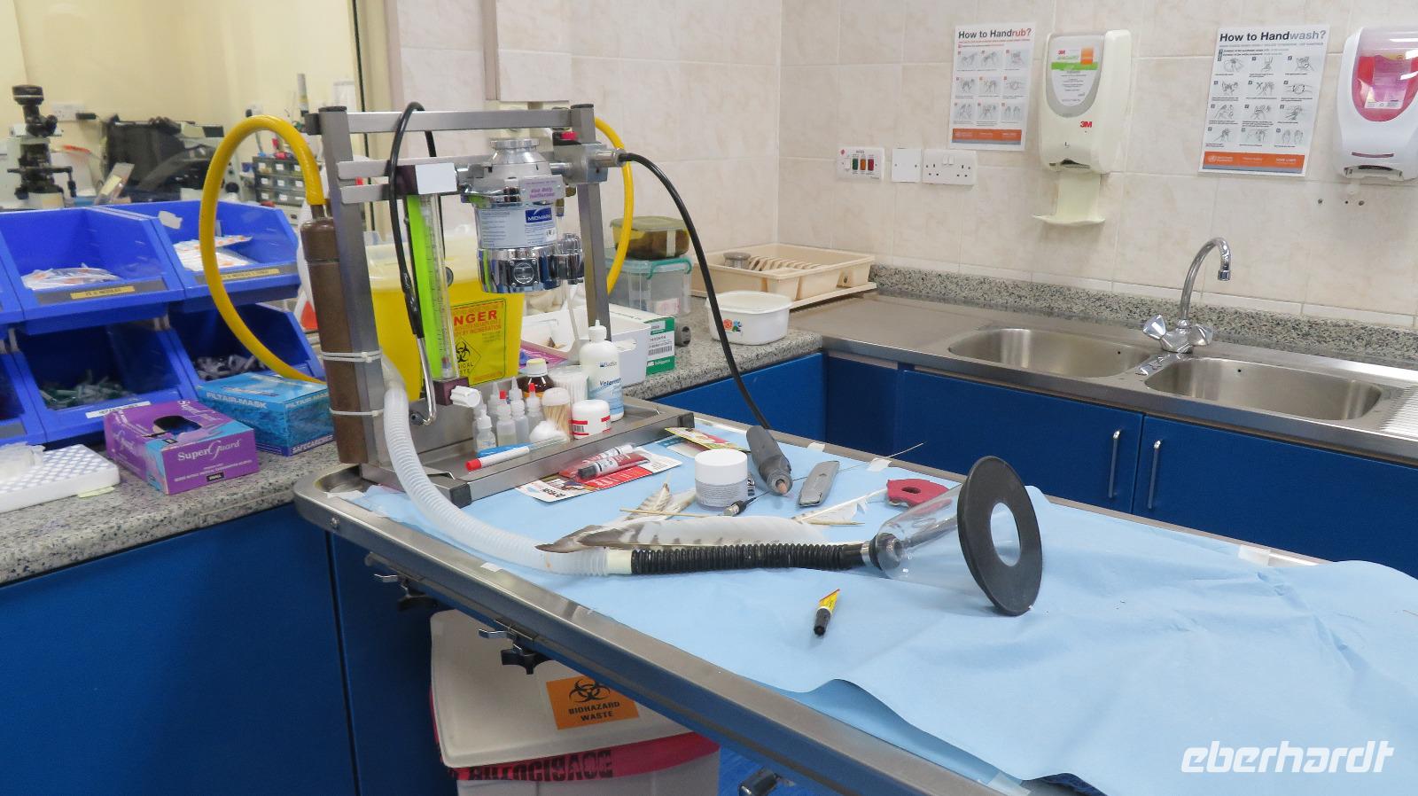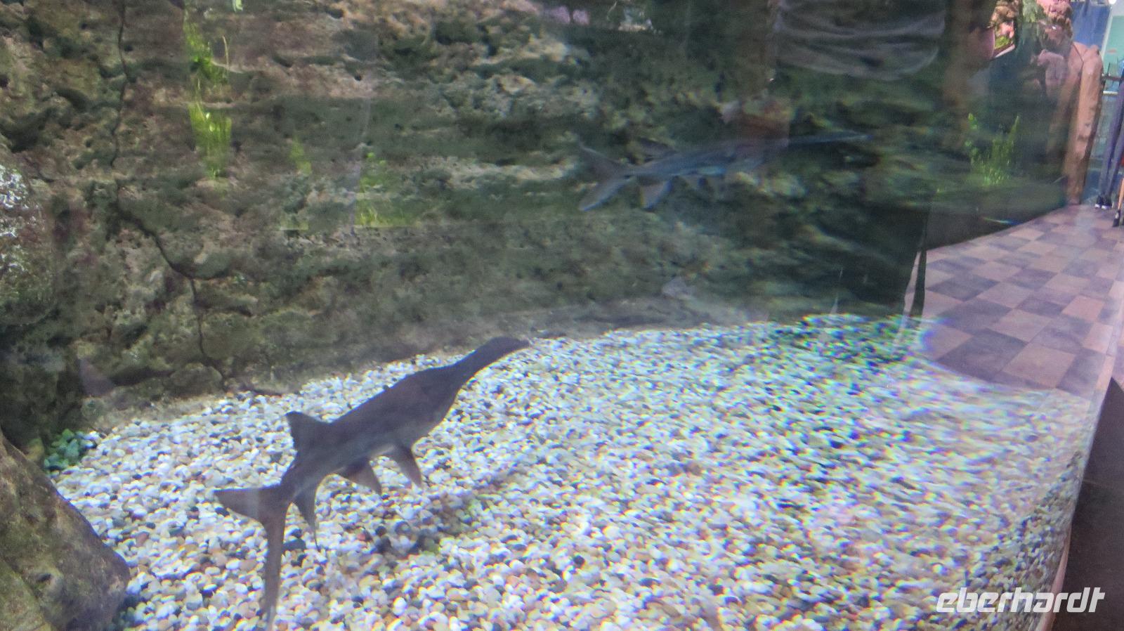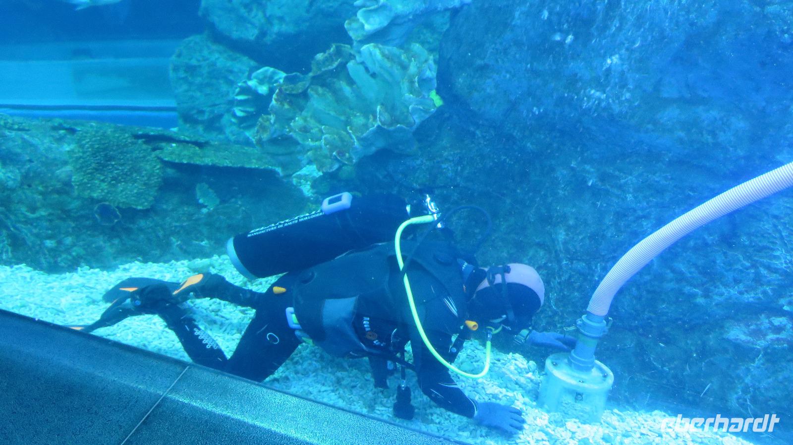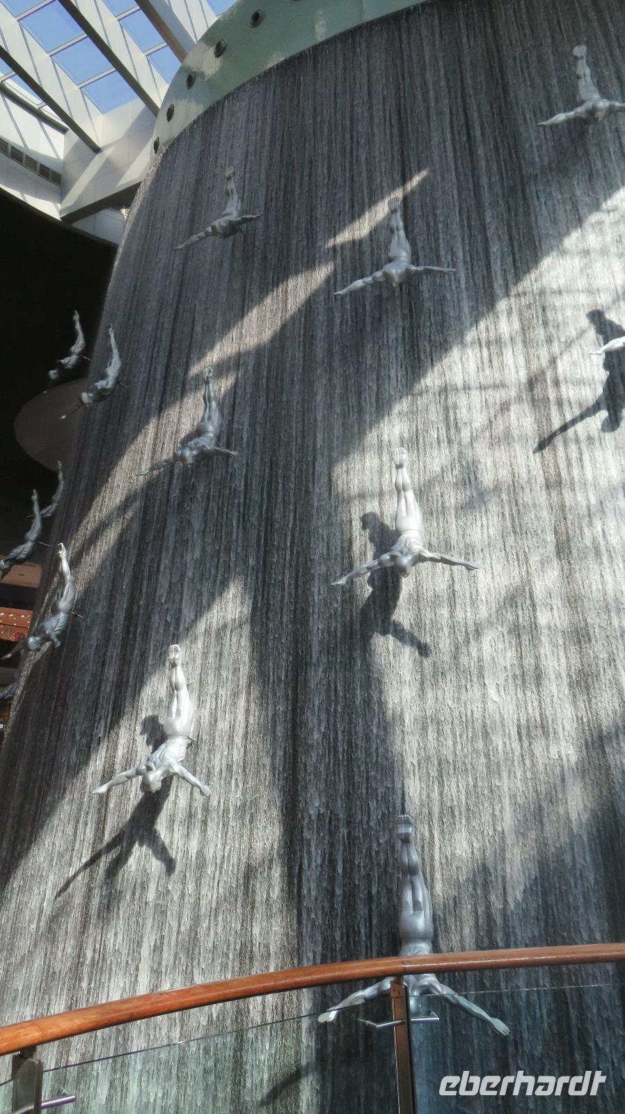 Die nächste Mall die wir besuchen ist auch zeitglich die größte im Land, die Dubai Mall. Über vier Etagen erstrecken sich hier zahlreichen Einkaufsläden und ich glaube, wer hier nichts findet, ist selber schuld. Charakteristisch für diese Mall ist ein Wasserfall aber vor allem das Aquarium, welches sich hier befindet. Eine Außenwand mit zahlreichen Fischen, die man auch ohne Eintritt anschauen kann, erstreckt sich über zwei Etagen. Mit einigen meiner Gäste besuche ich kurz das Aquarium, in dem wir u.a. Rochen, Pinguine und Haie beobachten können. Highlight des Besuches ist unser Spaziergang durch einen Tunnel, in dem man sich fühlt, als würde man durch das Wasser gehen: links, rechts und über uns schwimmen zahlreiche bunte Fische und Haie. Wooowwwww.