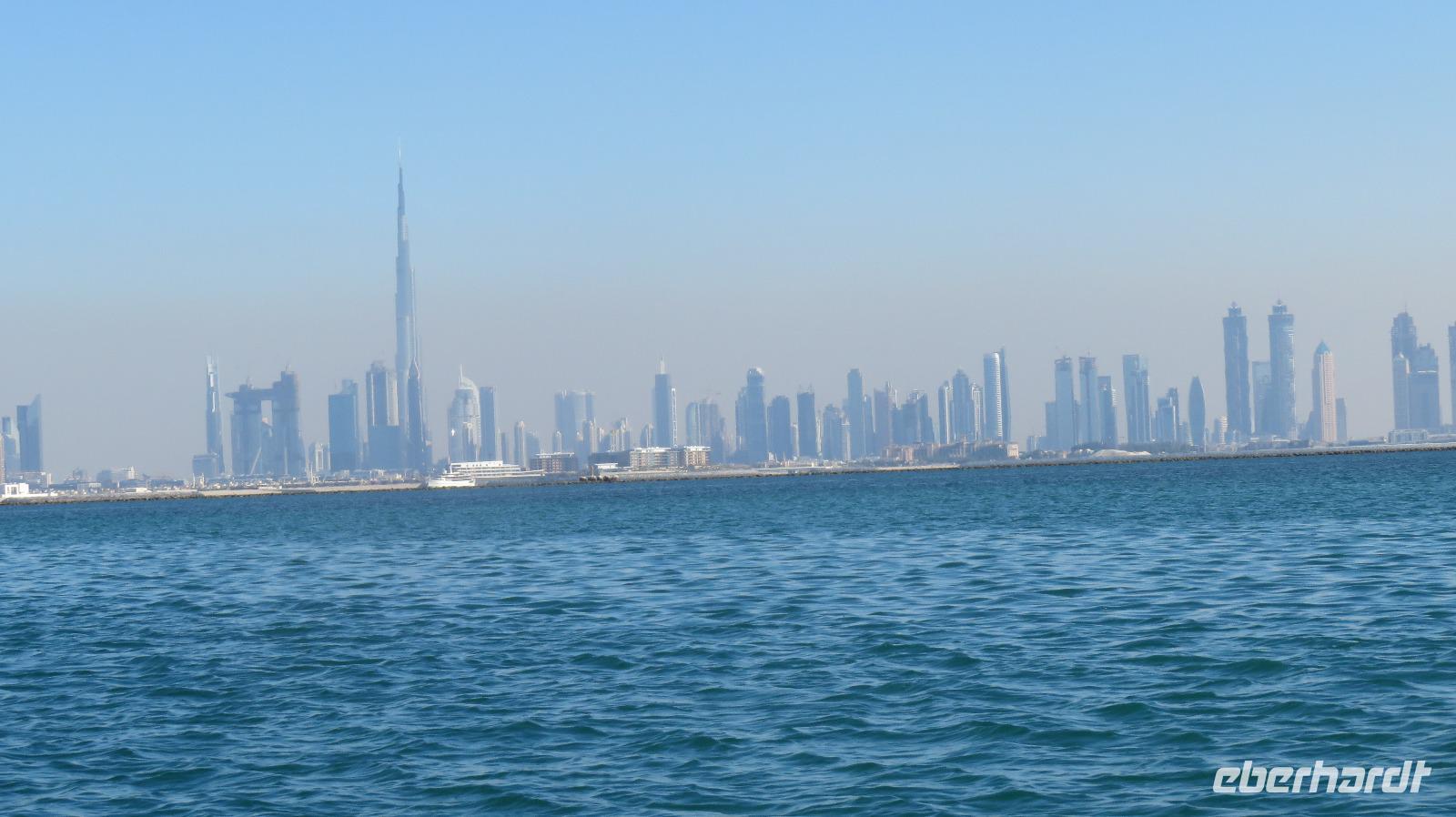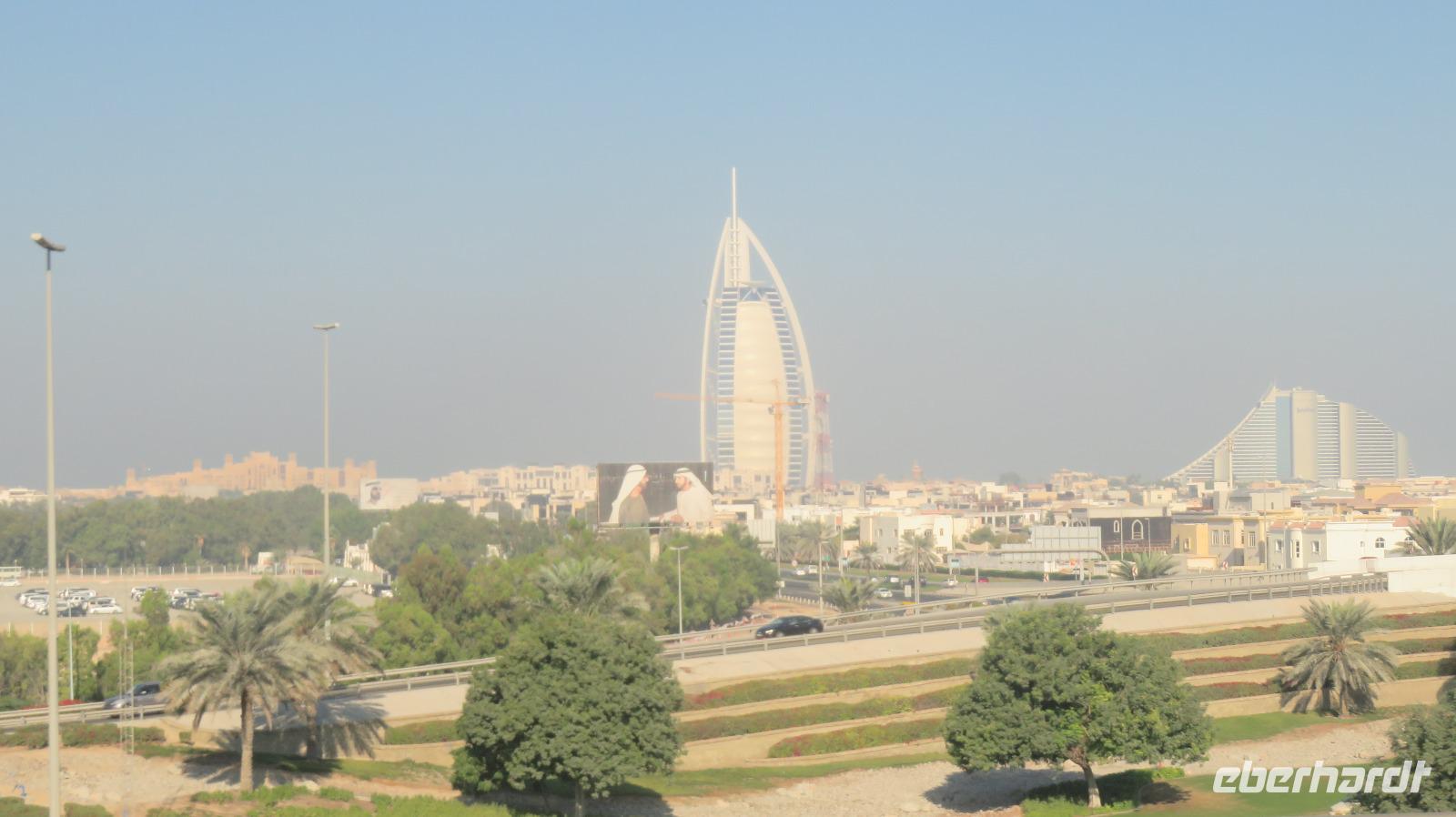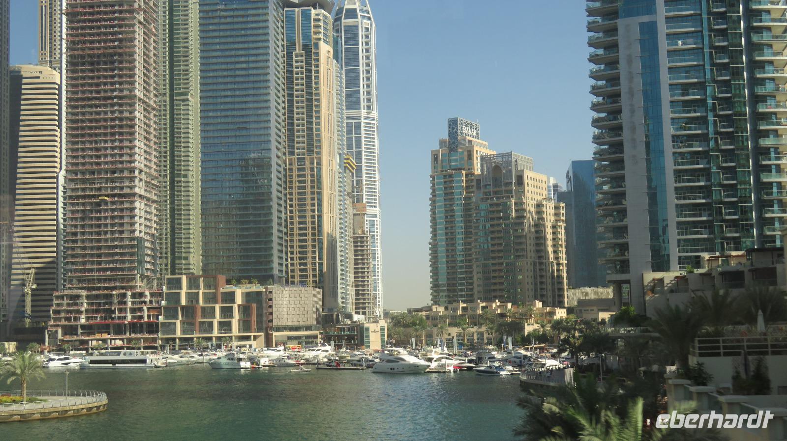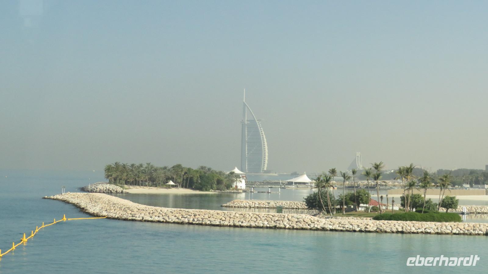 Heute ist Anja sehr nett zu uns: der Ausflug in das moderne Dubai beginnt erst um 10 Uhr. Da sind wir dann auch alle ausgeschlafen,-). Wir begrüßen unseren Bus-Chauffeur, der uns zunächst zur Dubai Marina, einem der neueren Stadtteile bringt. Hier halten wir und haben Zeit, ein wenig die Marina entlang zu spazieren, die vielen (unfertigen) Hochhäuser und die zahlreichen Yachten zu bewundern. Hier lebt wirklich nur jemand, er auch wirklich Geld hat. Zurück im Bus lotst uns Anja durch den Stadtteil Marina, vorbei am Stadtteil Dubai Media City (wo unser Hotel liegt) hinaus auf die bekannte Palme, deren Stamm wir nun mit dem Bus befahren. Die Straßen, die links und rechts abgehen, führen zu den Palmenwedeln, private Wohngebiete die man nur gegen Vorlage von Berechtigungsausweisen befahren darf. Unser Ziel ist das berühmte Altantis-Hotel am Ende der Palme, das von beiden Seiten von Stränden begrenzt ist. Wir steigen hier aus und schlendern im hinteren Teil des Hotels, in der Einkaufsmeile entlang. Dies ist der einzige Zugang für diejenigen Gäste, die hier im Hotel keine Übernachtung gebucht haben. Zurück verlassen wir die Palme mit der Monorail. Von hier oben haben wir einen besseren Blick auf die Villen und Wedel der Palme, die wir dann von hier aus auch fotografieren können. Zurück im Bus fahren wir parallel zum arabischen Gold in Richtung altes Dubai. Allerdings ist dies nicht unser Ziel sondern wir halten am Hotel „Burj al Arab", das erste teure Hotel hier in Dubai. Anja erzählt uns aus ihrer Ankunftszeit, als das Burj al Arab das einzige Gebäude an seinem jetzigen Standort war, ohne die vielen zusätzlichen Hotels drumherum, den großen Straßen und den vielen Autos -irgendwie ist das heute gar nicht mehr vorstellbar.