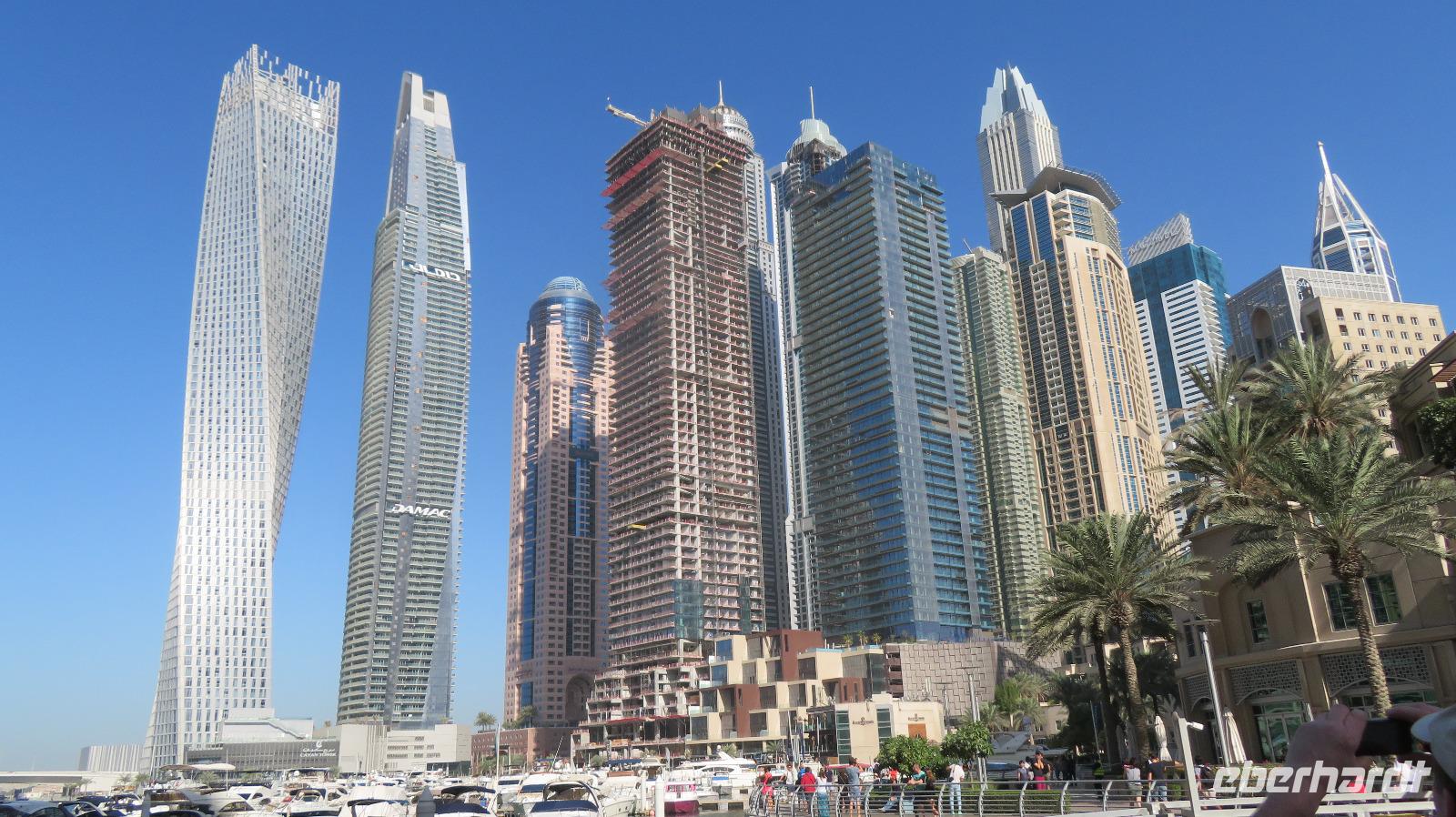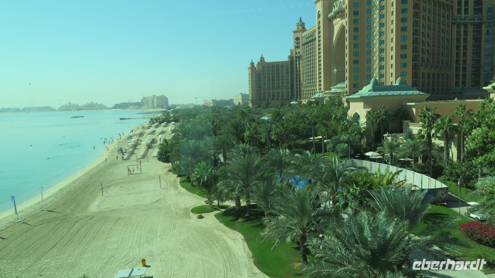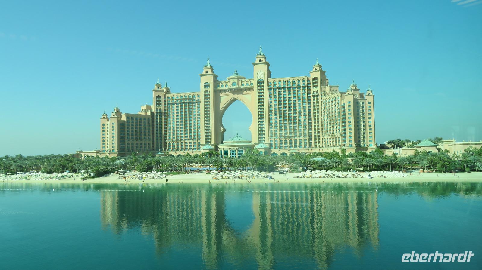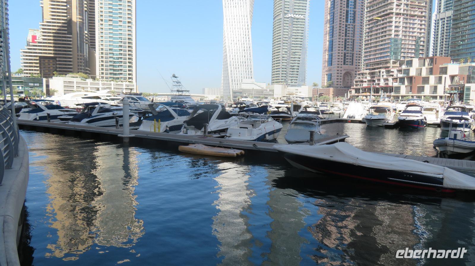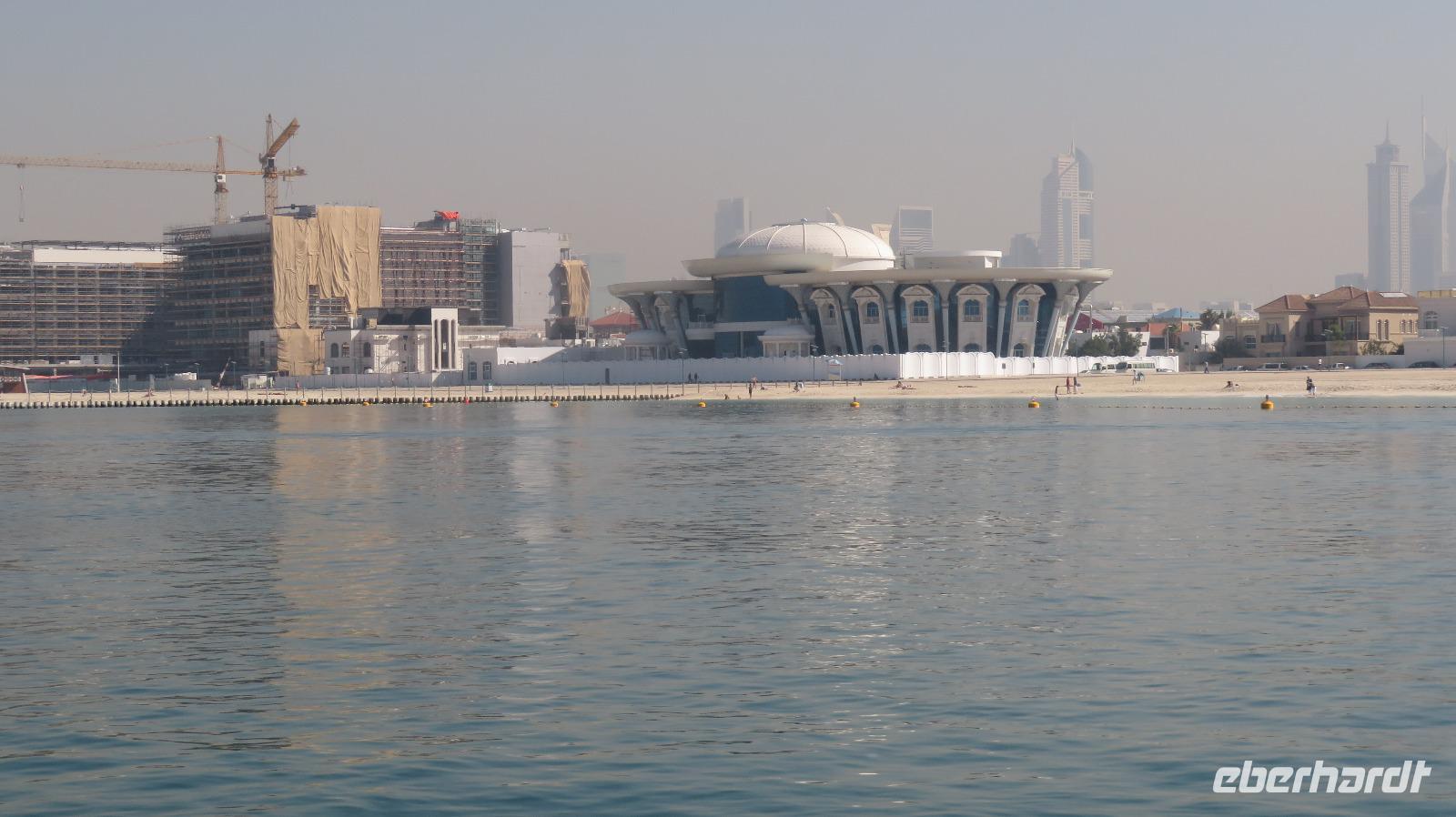 Heute ist Anja sehr nett zu uns: der Ausflug in das moderne Dubai beginnt erst um 10 Uhr. Da sind wir dann auch alle ausgeschlafen,-). Wir begrüßen unseren Bus-Chauffeur, der uns zunächst zur Dubai Marina, einem der neueren Stadtteile bringt. Hier halten wir und haben Zeit, ein wenig die Marina entlang zu spazieren, die vielen (unfertigen) Hochhäuser und die zahlreichen Yachten zu bewundern. Hier lebt wirklich nur jemand, er auch wirklich Geld hat. Zurück im Bus lotst uns Anja durch den Stadtteil Marina, vorbei am Stadtteil Dubai Media City (wo unser Hotel liegt) hinaus auf die bekannte Palme, deren Stamm wir nun mit dem Bus befahren. Die Straßen, die links und rechts abgehen, führen zu den Palmenwedeln, private Wohngebiete die man nur gegen Vorlage von Berechtigungsausweisen befahren darf. Unser Ziel ist das berühmte Altantis-Hotel am Ende der Palme, das von beiden Seiten von Stränden begrenzt ist. Wir steigen hier aus und schlendern im hinteren Teil des Hotels, in der Einkaufsmeile entlang. Dies ist der einzige Zugang für diejenigen Gäste, die hier im Hotel keine Übernachtung gebucht haben. Zurück verlassen wir die Palme mit der Monorail. Von hier oben haben wir einen besseren Blick auf die Villen und Wedel der Palme, die wir dann von hier aus auch fotografieren können. Zurück im Bus fahren wir parallel zum arabischen Gold in Richtung altes Dubai. Allerdings ist dies nicht unser Ziel sondern wir halten am Hotel „Burj al Arab", das erste teure Hotel hier in Dubai. Anja erzählt uns aus ihrer Ankunftszeit, als das Burj al Arab das einzige Gebäude an seinem jetzigen Standort war, ohne die vielen zusätzlichen Hotels drumherum, den großen Straßen und den vielen Autos -irgendwie ist das heute gar nicht mehr vorstellbar.