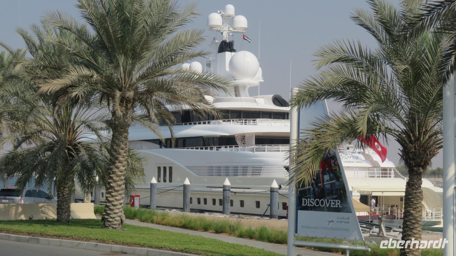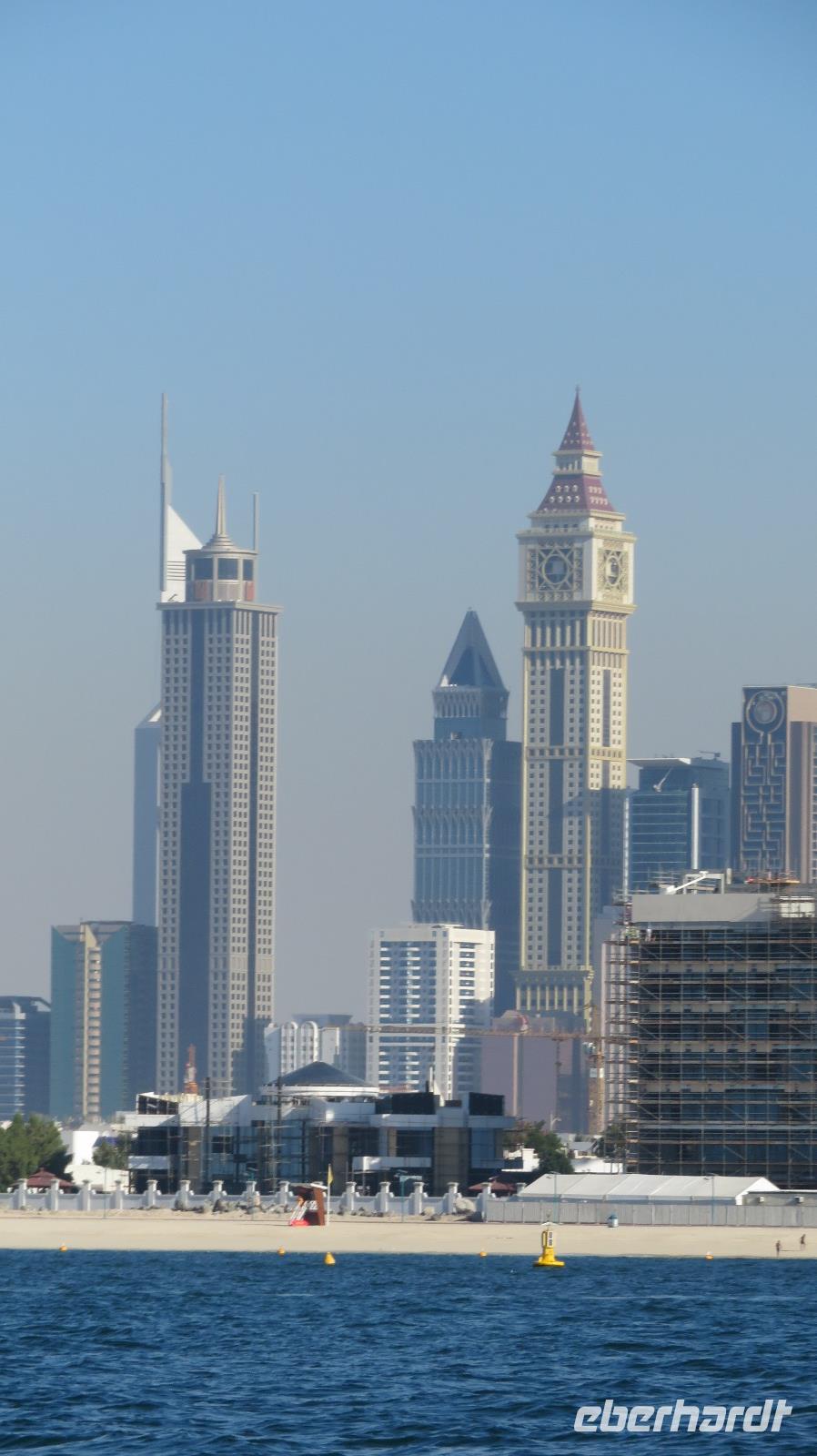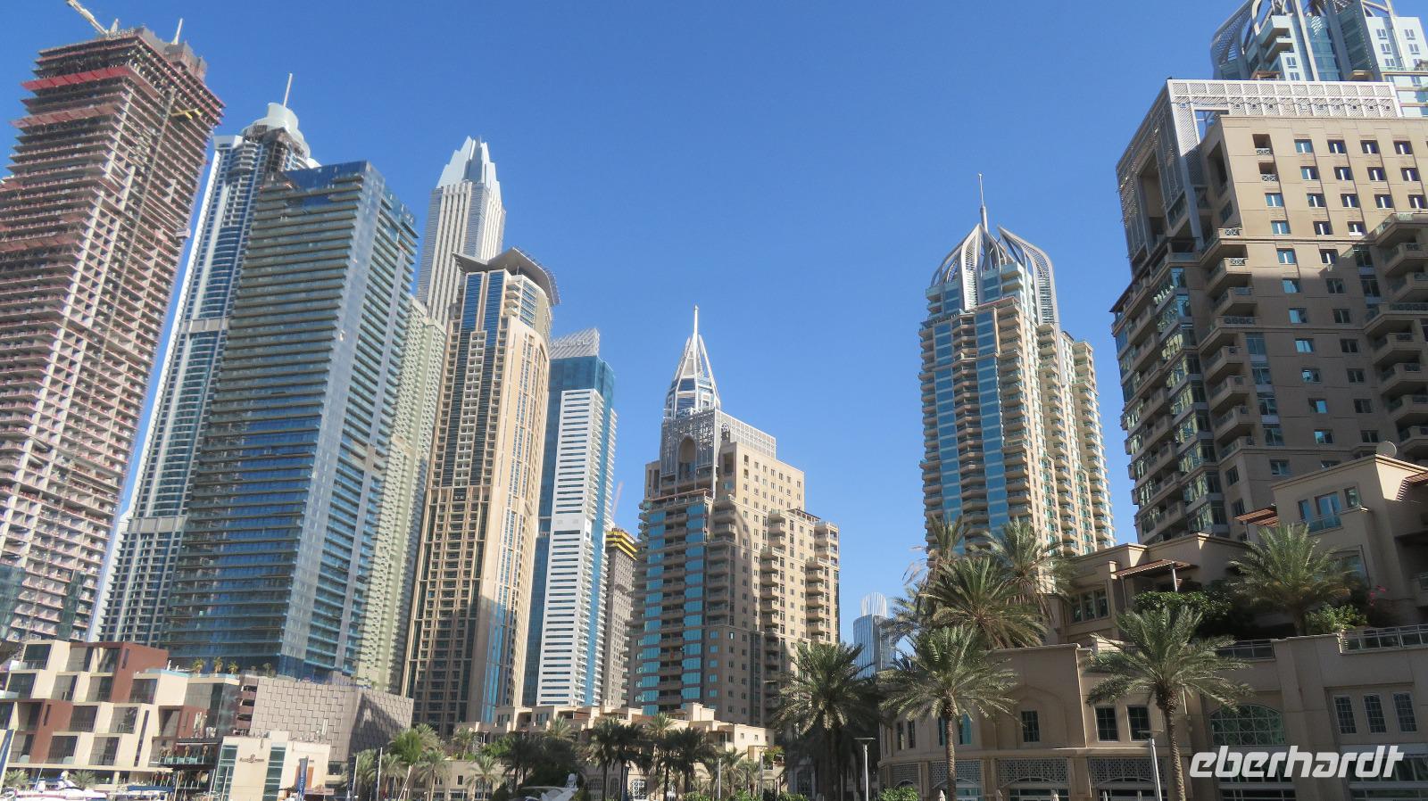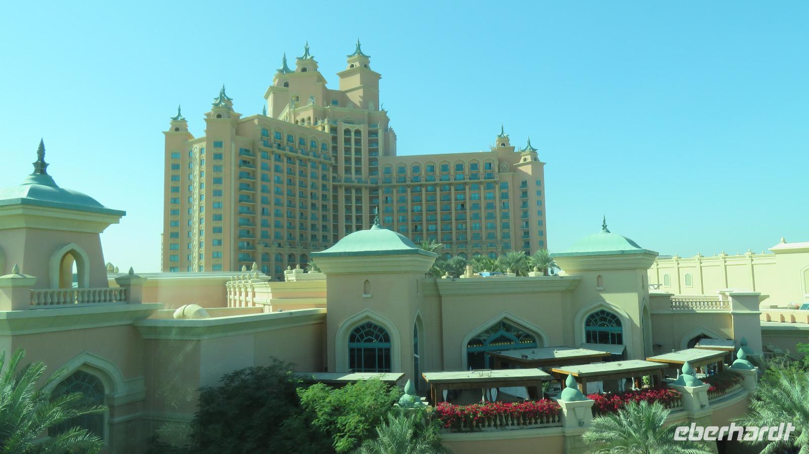 Heute ist Anja sehr nett zu uns: der Ausflug in das moderne Dubai beginnt erst um 10 Uhr. Da sind wir dann auch alle ausgeschlafen,-). Wir begrüßen unseren Bus-Chauffeur, der uns zunächst zur Dubai Marina, einem der neueren Stadtteile bringt. Hier halten wir und haben Zeit, ein wenig die Marina entlang zu spazieren, die vielen (unfertigen) Hochhäuser und die zahlreichen Yachten zu bewundern. Hier lebt wirklich nur jemand, er auch wirklich Geld hat. Zurück im Bus lotst uns Anja durch den Stadtteil Marina, vorbei am Stadtteil Dubai Media City (wo unser Hotel liegt) hinaus auf die bekannte Palme, deren Stamm wir nun mit dem Bus befahren. Die Straßen, die links und rechts abgehen, führen zu den Palmenwedeln, private Wohngebiete die man nur gegen Vorlage von Berechtigungsausweisen befahren darf. Unser Ziel ist das berühmte Altantis-Hotel am Ende der Palme, das von beiden Seiten von Stränden begrenzt ist. Wir steigen hier aus und schlendern im hinteren Teil des Hotels, in der Einkaufsmeile entlang. Dies ist der einzige Zugang für diejenigen Gäste, die hier im Hotel keine Übernachtung gebucht haben. Zurück verlassen wir die Palme mit der Monorail. Von hier oben haben wir einen besseren Blick auf die Villen und Wedel der Palme, die wir dann von hier aus auch fotografieren können. Zurück im Bus fahren wir parallel zum arabischen Gold in Richtung altes Dubai. Allerdings ist dies nicht unser Ziel sondern wir halten am Hotel „Burj al Arab", das erste teure Hotel hier in Dubai. Anja erzählt uns aus ihrer Ankunftszeit, als das Burj al Arab das einzige Gebäude an seinem jetzigen Standort war, ohne die vielen zusätzlichen Hotels drumherum, den großen Straßen und den vielen Autos -irgendwie ist das heute gar nicht mehr vorstellbar.