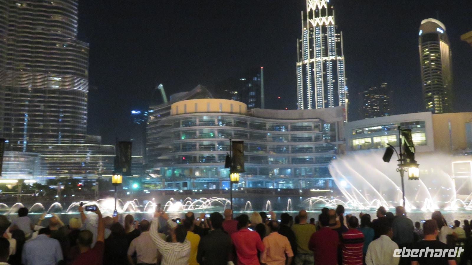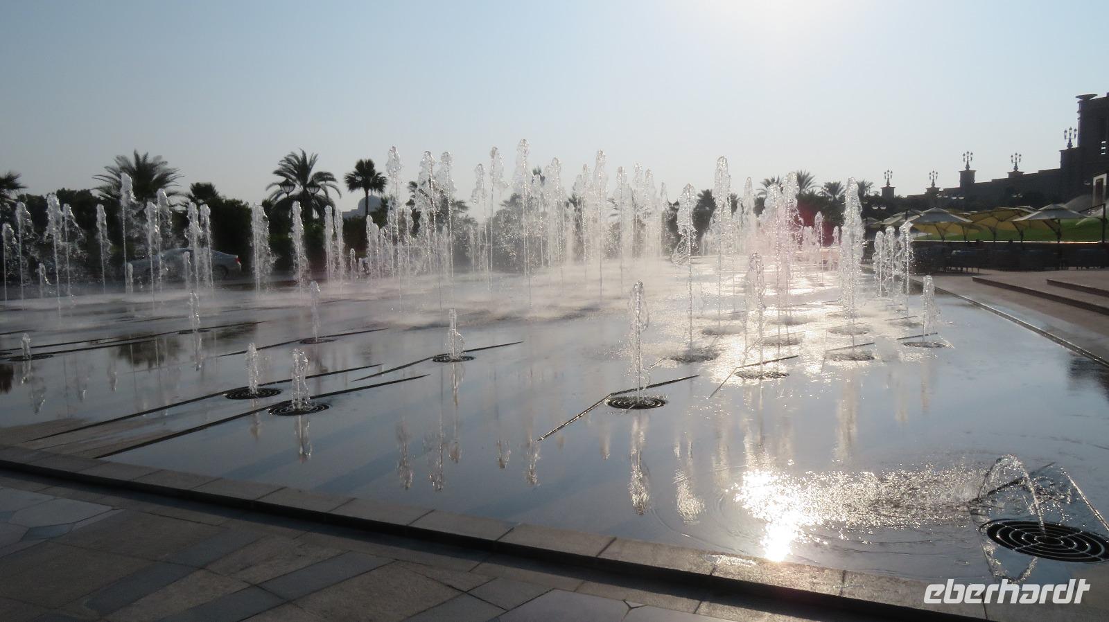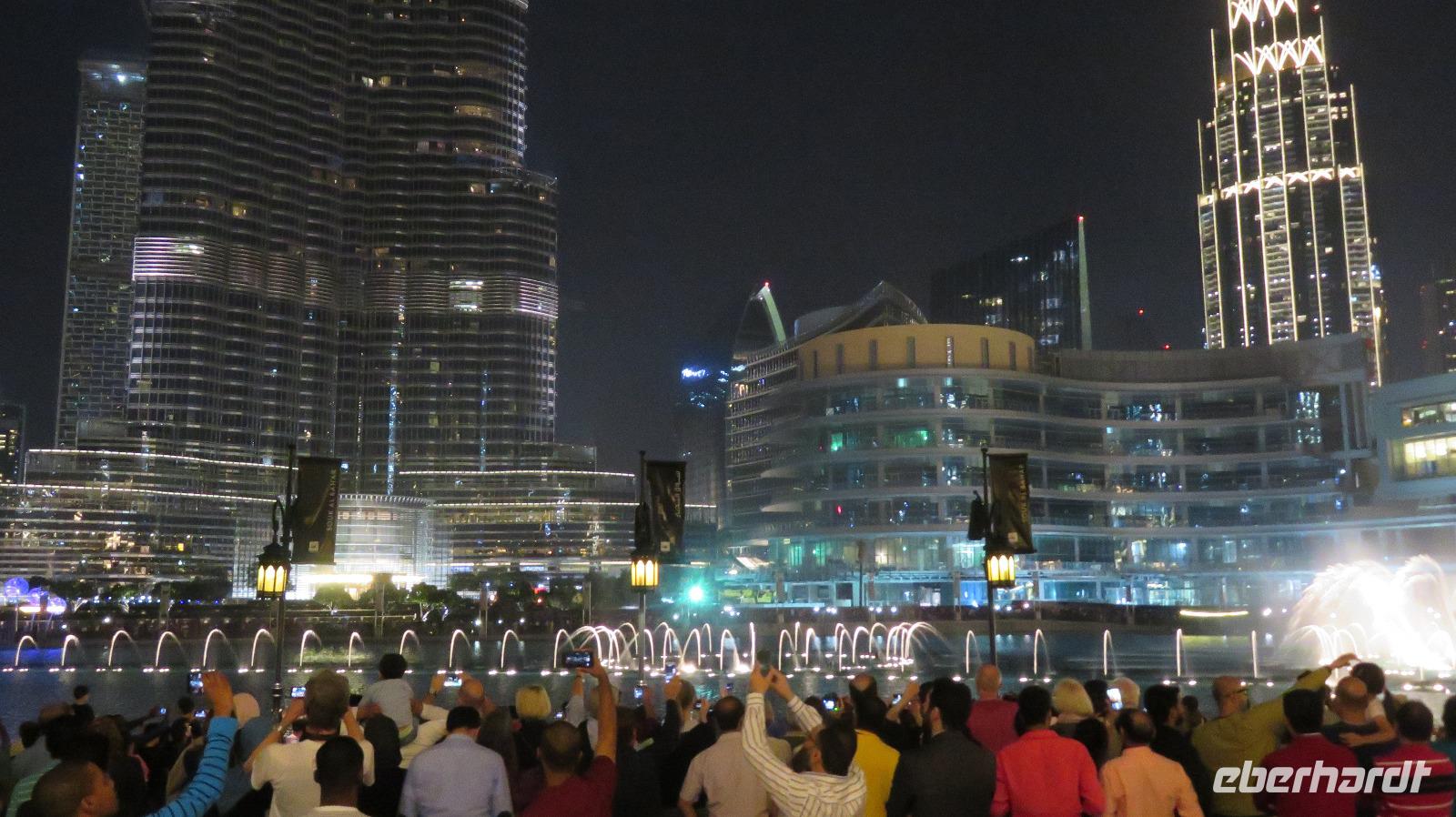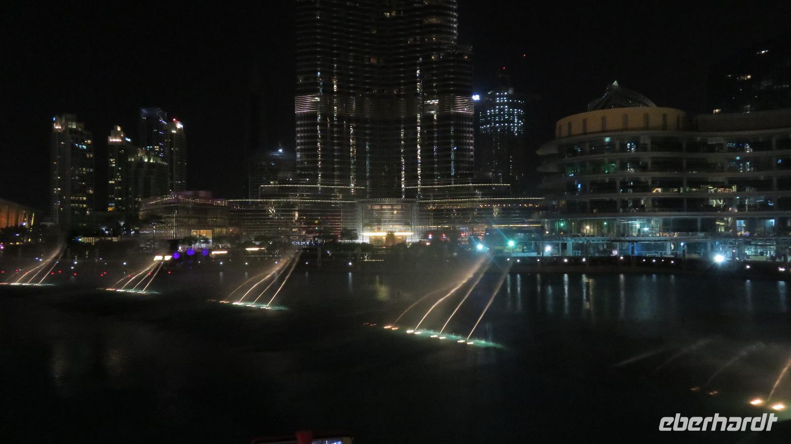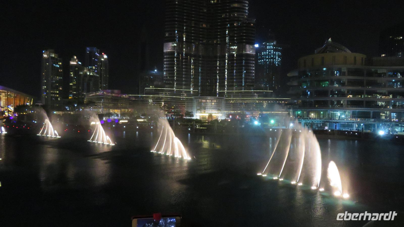 Danach treffen wir uns alle wieder und bestaunen zusammen die Wasserspiele, die halbstündlich vor dem Burj Khalifa aufgeführt werden. Da alle Gäste aus meiner Gruppe die Erlebnis-Halbpension gebucht haben, spazieren wir dann in den Souk und nehmen in der zweiten Etage auf der Terrasse eines Restaurants Platz. Hier genießen wir nicht nur Köstlichkeiten aus der libanesischen Küche sondern sehen auch ohne viel Aufwand und hunderten anderen Menschen um uns herum noch einmal die Wasserspiele, die auch immer zu anders untermalt von unterschiedlichen Musikstücken dargeboten werden.