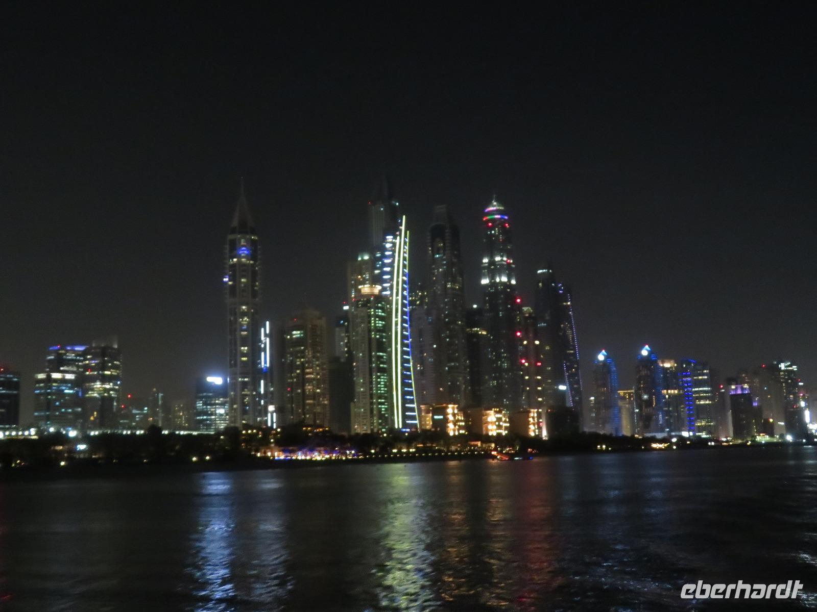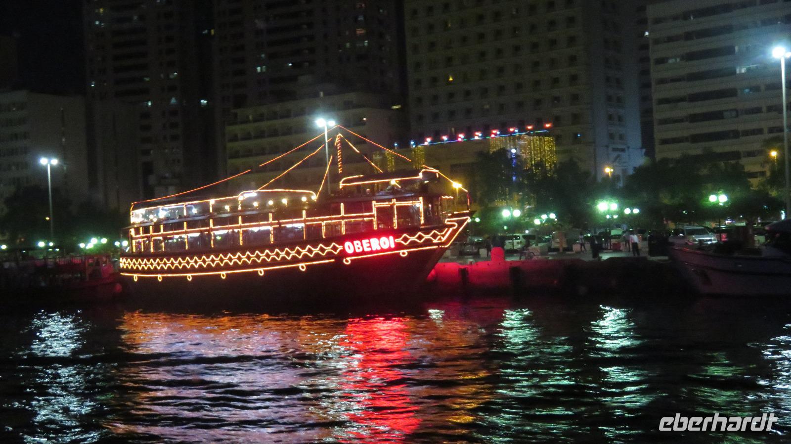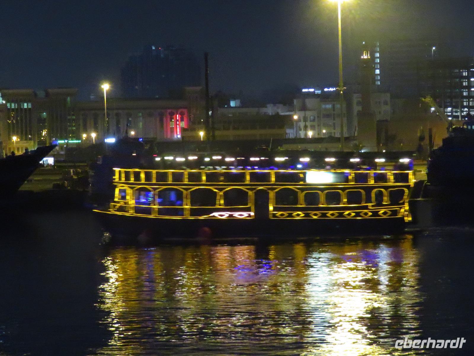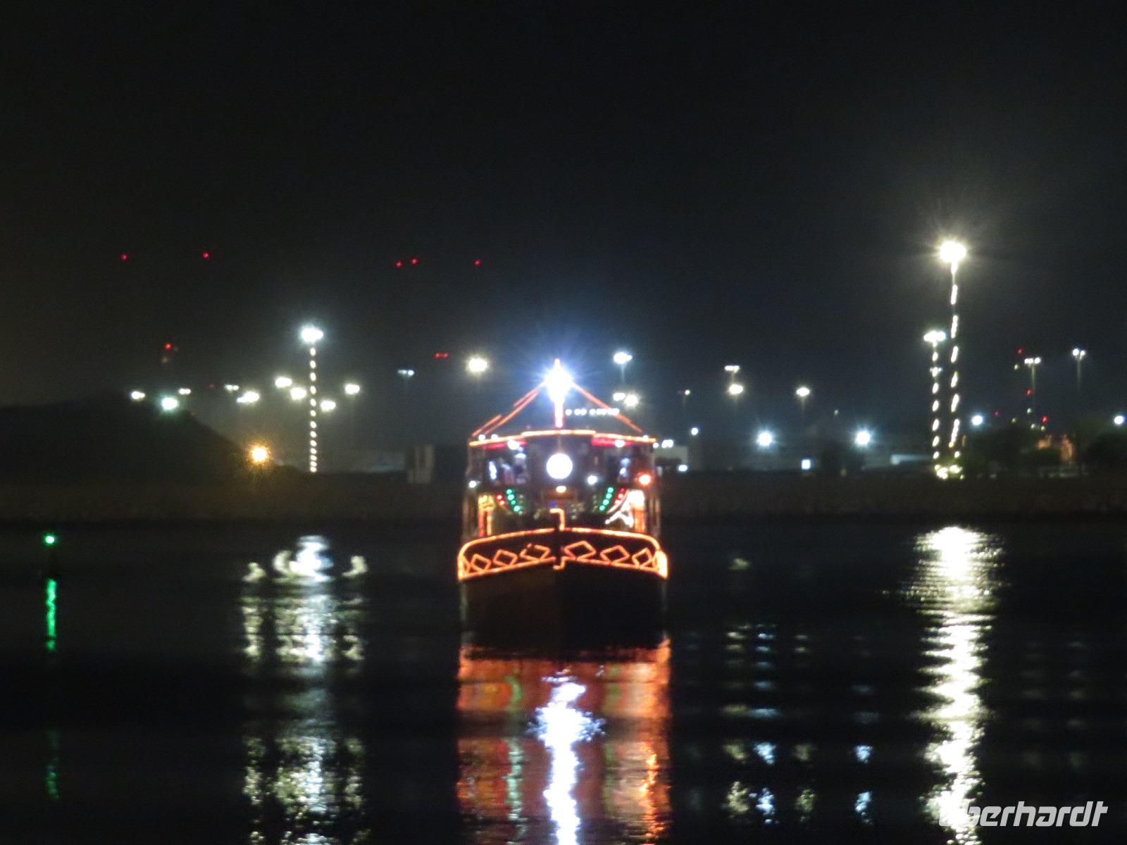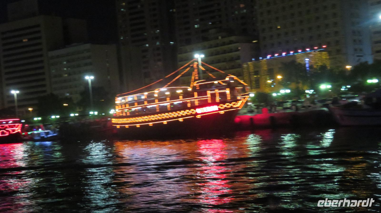 Anja und ich haben aber heute mit elf Gästen ein anderes Ziel: ein köstliches Neujahrs-Mittagessen im Kaleidoskop-Restaurant im Atlantis-Hotel. Zunächst aber besuchen wir den Madinat-Souk, wo zahlreiche Souvenirgeschäfte sowie einige Schmuck und Ladengeschäfte angesiedelt sind. Von einer speziellen Plattform aus haben wir noch ein tolles Fotomotiv auf den Burj al Arab. Danach bummeln wir durch den Souk - was wirklich eine sehr schöne Erfahrung ist, dem im Gegensatz zu den vollen Malls sind hier kaum Leute unterwegs und man kann ungestört auch einmal in einen Laden reingehen und stöbern. Nach rund einer Stunde treffen wir uns wieder und fahren erneut über den Stamm der Palme bis zum Atlantis-Hotel. Heute gehen wir jedoch nicht in eines der Hotelläden sondern die Security lässt uns mit unserer Reservierung vorbei und wir kommen an ein überdimensionales Aquarium. Meterhohe Glasscheiben trennen uns von den schönen bunten Fischen, die hier später sogar von Mitarbeitern gefüttert werden. Wir sind wirklich beeindruckt - wie eigentlich von allem in Dubai. Als die Zeit unserer Mittagsreservierung ran ist, gehen wir zum Eingang des Restaurants und werden auch prompt an drei Tischen platziert. Danach zeigt uns Anja erst einmal das riesige Buffet mit all seinen Leckereien, den Anja verweist auch auf die hinteren Ecken, die sonst schnell einmal übersehen werden. Und ich muss sagen, das Angebot kann sich ja mal richtig sehen lassen. Es gibt zahlreiche verschiedene Köstlichkeiten: eine Käseecke, eine Brotecke mit verschiedenen Dipps, eine Obstabteilung, eine Gemüseecke, verschiedene Suppen, Salate, eine Fischecke mit Muscheln, Austern, Hummer und so viel mehr was das Herz begehrt. Es gibt eine Nudelstation, eine Asia-Ecke, eine indische Ecke und in Mitten von allen ist das Dessert-Buffet. Also mal ehrlich, ich kann mir nicht vorstellen dass es nur einen einzigen Menschen gibt, der hier nichts für sich findet. Und alles was wir probieren, schmeckt auch noch so köstlich. Ich persönlich bin ja froh, dass ich das Frühstück hab ausfallen lassen;-). Bei meinem ersten Dubai-Besuch vor drei Jahren waren wir im Restaurant des Burj al Arab zum Mittagessen. Das war auch sehr lecker aber die Auswahl hier im Atlantis-Hotel war um einiges besser und dabei sogar noch preislich günstiger und alkoholfreie Getränke sind inklusive. Also in das Atlantis-Hotel würde ich immer wieder zurück kehren und wie wir von Anja erfahren, geht sie mit ihrer Familie zu speziellen Anlässen auch sehr gern einmal hier essen. Nun da wir satt gegessen sind, verlassen wir erneut mit der Monorail die Palme und fahren danach via Bus zurück zum Hotel. Am Abend treffe ich mich dann mit der gesamten Reisegruppe wieder denn im Rahmen der zubuchbaren Erlebnis-Halbpension unternehmen wir heute eine Dhow-Fahrt auf dem Dubai-Creek. Mit unserem Bus fahren wir zurück in den alten Stadtteil von Dubai und gehen hier an Bord einer typischen beleuchteten Dhow. Wir haben fest reservierte Plätze und die nicht-alkoholischen Getränke sind auch hier wieder mit inkludiert. Als die Dhow ablegt, können wir uns am Dinner-Buffet bedienen. Dabei schauen wir zu, wie am Fenster die anderen beleuchteten Dhows an uns vorbei ziehen. Wer möchte, kann sich auch auf das Oberdeck des Schiffes begeben und von hier aus die Aussicht bewundern. Zwischendurch erleben wir ein kleines Entertainment-Programm in dem ein Dhow-Crew-Mitglied in einem beleuchteten Anzug verschiedene Tänze zu Fokloremusik darbietet. Zunächst fahren wir mit der Dhow raus in das Hafengebiet was leider nicht sooooo viele schöne Fotomotive bietet aber dann geht es auf dem Dubai Creek noch ein wenig in Richtung Stadt und wir sehen beleuchtete Souks und die vielen Emiratis, die am Abend die Straßen säumen.