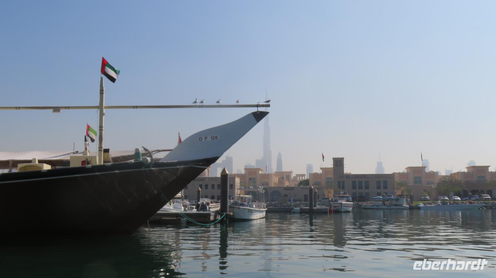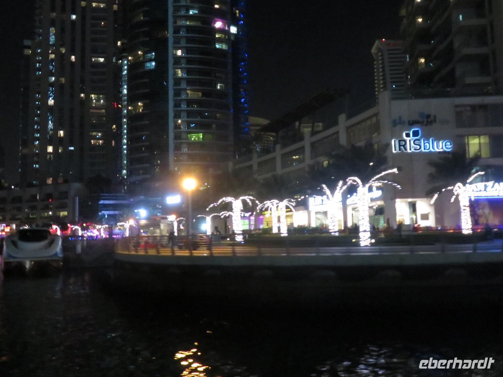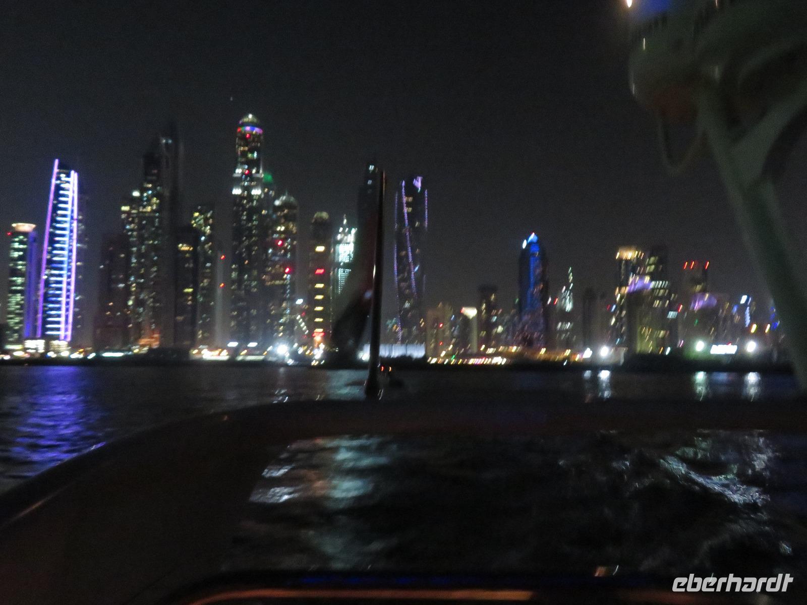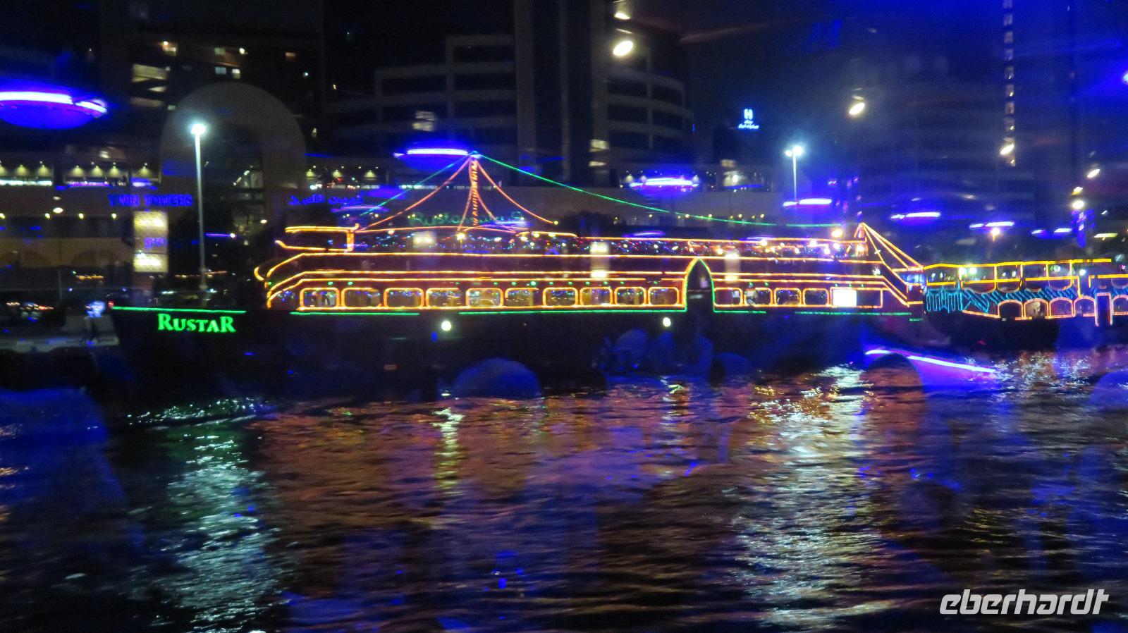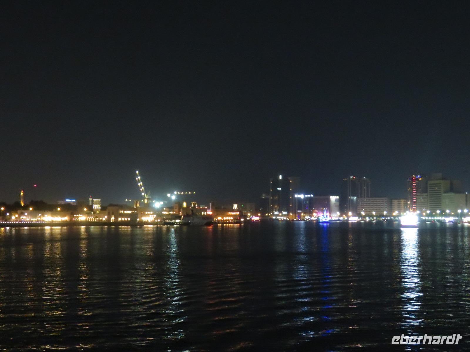 Anja und ich haben aber heute mit elf Gästen ein anderes Ziel: ein köstliches Neujahrs-Mittagessen im Kaleidoskop-Restaurant im Atlantis-Hotel. Zunächst aber besuchen wir den Madinat-Souk, wo zahlreiche Souvenirgeschäfte sowie einige Schmuck und Ladengeschäfte angesiedelt sind. Von einer speziellen Plattform aus haben wir noch ein tolles Fotomotiv auf den Burj al Arab. Danach bummeln wir durch den Souk - was wirklich eine sehr schöne Erfahrung ist, dem im Gegensatz zu den vollen Malls sind hier kaum Leute unterwegs und man kann ungestört auch einmal in einen Laden reingehen und stöbern. Nach rund einer Stunde treffen wir uns wieder und fahren erneut über den Stamm der Palme bis zum Atlantis-Hotel. Heute gehen wir jedoch nicht in eines der Hotelläden sondern die Security lässt uns mit unserer Reservierung vorbei und wir kommen an ein überdimensionales Aquarium. Meterhohe Glasscheiben trennen uns von den schönen bunten Fischen, die hier später sogar von Mitarbeitern gefüttert werden. Wir sind wirklich beeindruckt - wie eigentlich von allem in Dubai. Als die Zeit unserer Mittagsreservierung ran ist, gehen wir zum Eingang des Restaurants und werden auch prompt an drei Tischen platziert. Danach zeigt uns Anja erst einmal das riesige Buffet mit all seinen Leckereien, den Anja verweist auch auf die hinteren Ecken, die sonst schnell einmal übersehen werden. Und ich muss sagen, das Angebot kann sich ja mal richtig sehen lassen. Es gibt zahlreiche verschiedene Köstlichkeiten: eine Käseecke, eine Brotecke mit verschiedenen Dipps, eine Obstabteilung, eine Gemüseecke, verschiedene Suppen, Salate, eine Fischecke mit Muscheln, Austern, Hummer und so viel mehr was das Herz begehrt. Es gibt eine Nudelstation, eine Asia-Ecke, eine indische Ecke und in Mitten von allen ist das Dessert-Buffet. Also mal ehrlich, ich kann mir nicht vorstellen dass es nur einen einzigen Menschen gibt, der hier nichts für sich findet. Und alles was wir probieren, schmeckt auch noch so köstlich. Ich persönlich bin ja froh, dass ich das Frühstück hab ausfallen lassen;-). Bei meinem ersten Dubai-Besuch vor drei Jahren waren wir im Restaurant des Burj al Arab zum Mittagessen. Das war auch sehr lecker aber die Auswahl hier im Atlantis-Hotel war um einiges besser und dabei sogar noch preislich günstiger und alkoholfreie Getränke sind inklusive. Also in das Atlantis-Hotel würde ich immer wieder zurück kehren und wie wir von Anja erfahren, geht sie mit ihrer Familie zu speziellen Anlässen auch sehr gern einmal hier essen. Nun da wir satt gegessen sind, verlassen wir erneut mit der Monorail die Palme und fahren danach via Bus zurück zum Hotel. Am Abend treffe ich mich dann mit der gesamten Reisegruppe wieder denn im Rahmen der zubuchbaren Erlebnis-Halbpension unternehmen wir heute eine Dhow-Fahrt auf dem Dubai-Creek. Mit unserem Bus fahren wir zurück in den alten Stadtteil von Dubai und gehen hier an Bord einer typischen beleuchteten Dhow. Wir haben fest reservierte Plätze und die nicht-alkoholischen Getränke sind auch hier wieder mit inkludiert. Als die Dhow ablegt, können wir uns am Dinner-Buffet bedienen. Dabei schauen wir zu, wie am Fenster die anderen beleuchteten Dhows an uns vorbei ziehen. Wer möchte, kann sich auch auf das Oberdeck des Schiffes begeben und von hier aus die Aussicht bewundern. Zwischendurch erleben wir ein kleines Entertainment-Programm in dem ein Dhow-Crew-Mitglied in einem beleuchteten Anzug verschiedene Tänze zu Fokloremusik darbietet. Zunächst fahren wir mit der Dhow raus in das Hafengebiet was leider nicht sooooo viele schöne Fotomotive bietet aber dann geht es auf dem Dubai Creek noch ein wenig in Richtung Stadt und wir sehen beleuchtete Souks und die vielen Emiratis, die am Abend die Straßen säumen.