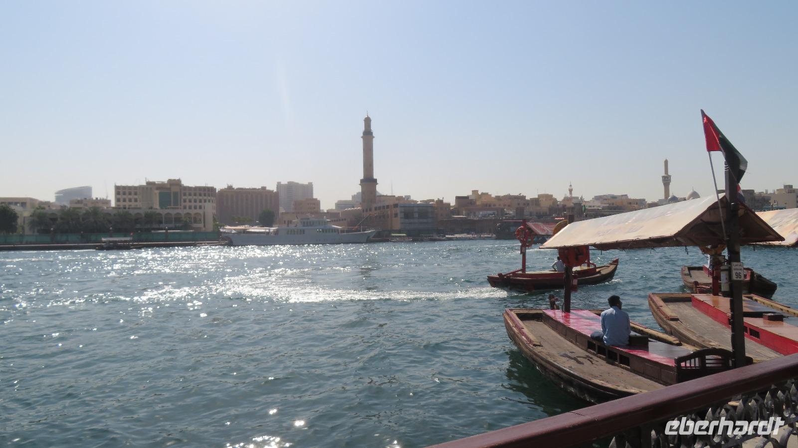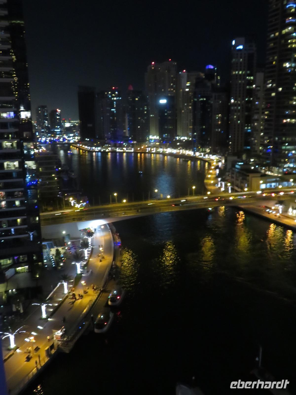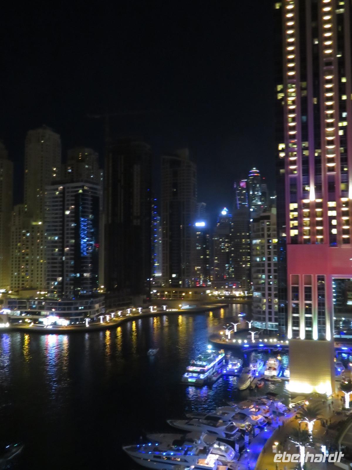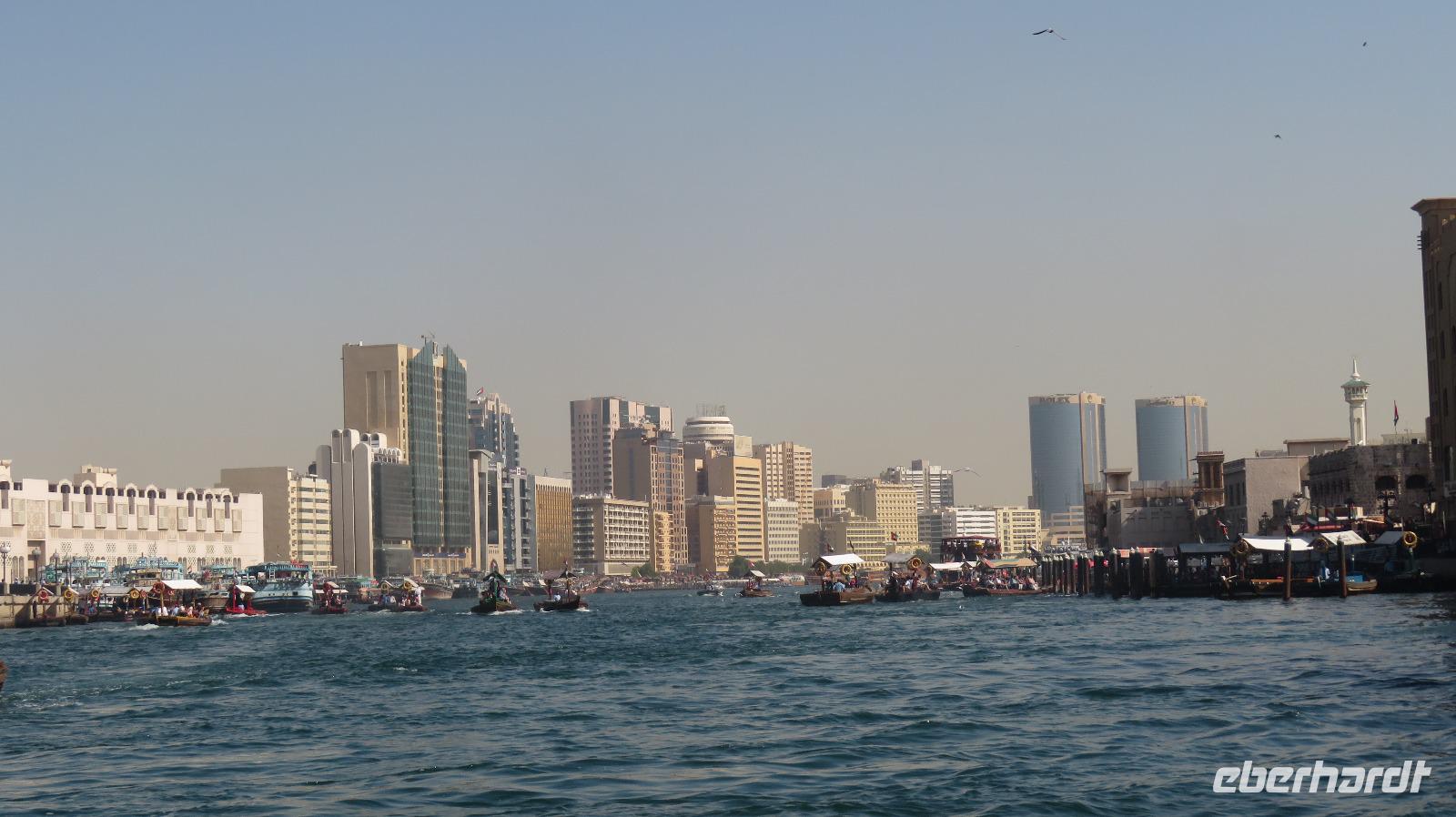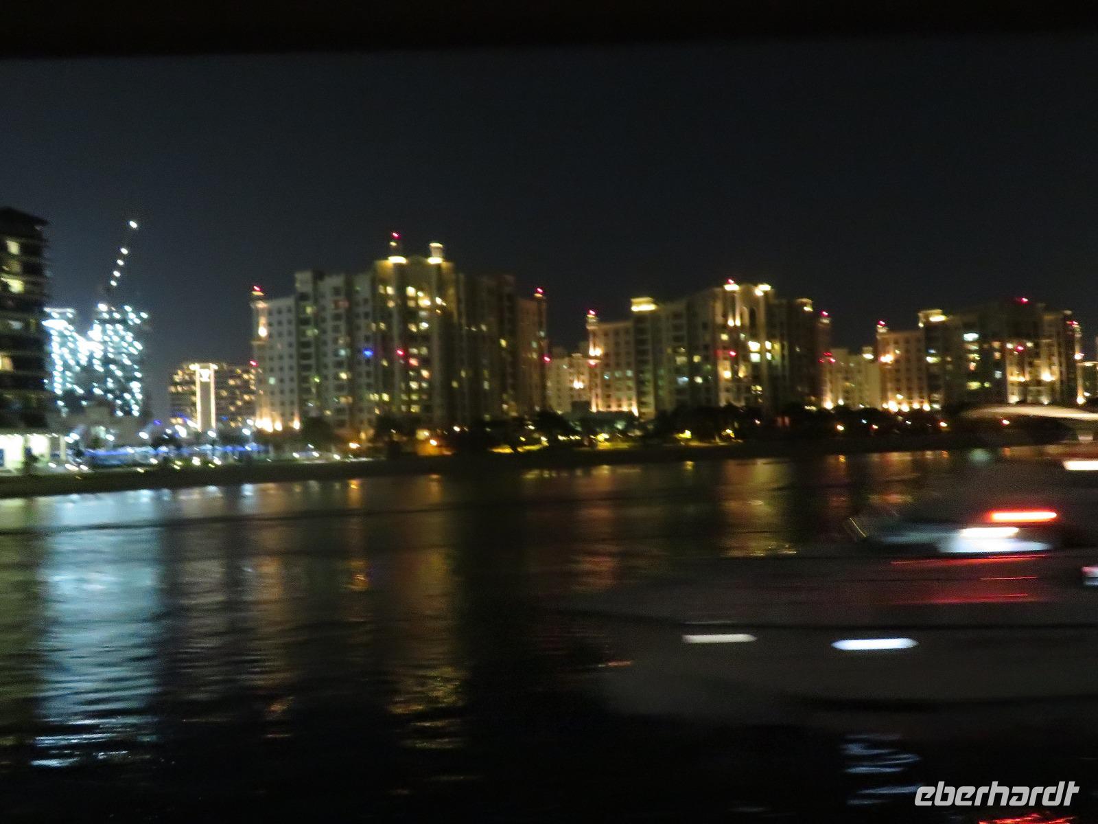 Anja und ich haben aber heute mit elf Gästen ein anderes Ziel: ein köstliches Neujahrs-Mittagessen im Kaleidoskop-Restaurant im Atlantis-Hotel. Zunächst aber besuchen wir den Madinat-Souk, wo zahlreiche Souvenirgeschäfte sowie einige Schmuck und Ladengeschäfte angesiedelt sind. Von einer speziellen Plattform aus haben wir noch ein tolles Fotomotiv auf den Burj al Arab. Danach bummeln wir durch den Souk - was wirklich eine sehr schöne Erfahrung ist, dem im Gegensatz zu den vollen Malls sind hier kaum Leute unterwegs und man kann ungestört auch einmal in einen Laden reingehen und stöbern. Nach rund einer Stunde treffen wir uns wieder und fahren erneut über den Stamm der Palme bis zum Atlantis-Hotel. Heute gehen wir jedoch nicht in eines der Hotelläden sondern die Security lässt uns mit unserer Reservierung vorbei und wir kommen an ein überdimensionales Aquarium. Meterhohe Glasscheiben trennen uns von den schönen bunten Fischen, die hier später sogar von Mitarbeitern gefüttert werden. Wir sind wirklich beeindruckt - wie eigentlich von allem in Dubai. Als die Zeit unserer Mittagsreservierung ran ist, gehen wir zum Eingang des Restaurants und werden auch prompt an drei Tischen platziert. Danach zeigt uns Anja erst einmal das riesige Buffet mit all seinen Leckereien, den Anja verweist auch auf die hinteren Ecken, die sonst schnell einmal übersehen werden. Und ich muss sagen, das Angebot kann sich ja mal richtig sehen lassen. Es gibt zahlreiche verschiedene Köstlichkeiten: eine Käseecke, eine Brotecke mit verschiedenen Dipps, eine Obstabteilung, eine Gemüseecke, verschiedene Suppen, Salate, eine Fischecke mit Muscheln, Austern, Hummer und so viel mehr was das Herz begehrt. Es gibt eine Nudelstation, eine Asia-Ecke, eine indische Ecke und in Mitten von allen ist das Dessert-Buffet. Also mal ehrlich, ich kann mir nicht vorstellen dass es nur einen einzigen Menschen gibt, der hier nichts für sich findet. Und alles was wir probieren, schmeckt auch noch so köstlich. Ich persönlich bin ja froh, dass ich das Frühstück hab ausfallen lassen;-). Bei meinem ersten Dubai-Besuch vor drei Jahren waren wir im Restaurant des Burj al Arab zum Mittagessen. Das war auch sehr lecker aber die Auswahl hier im Atlantis-Hotel war um einiges besser und dabei sogar noch preislich günstiger und alkoholfreie Getränke sind inklusive. Also in das Atlantis-Hotel würde ich immer wieder zurück kehren und wie wir von Anja erfahren, geht sie mit ihrer Familie zu speziellen Anlässen auch sehr gern einmal hier essen. Nun da wir satt gegessen sind, verlassen wir erneut mit der Monorail die Palme und fahren danach via Bus zurück zum Hotel. Am Abend treffe ich mich dann mit der gesamten Reisegruppe wieder denn im Rahmen der zubuchbaren Erlebnis-Halbpension unternehmen wir heute eine Dhow-Fahrt auf dem Dubai-Creek. Mit unserem Bus fahren wir zurück in den alten Stadtteil von Dubai und gehen hier an Bord einer typischen beleuchteten Dhow. Wir haben fest reservierte Plätze und die nicht-alkoholischen Getränke sind auch hier wieder mit inkludiert. Als die Dhow ablegt, können wir uns am Dinner-Buffet bedienen. Dabei schauen wir zu, wie am Fenster die anderen beleuchteten Dhows an uns vorbei ziehen. Wer möchte, kann sich auch auf das Oberdeck des Schiffes begeben und von hier aus die Aussicht bewundern. Zwischendurch erleben wir ein kleines Entertainment-Programm in dem ein Dhow-Crew-Mitglied in einem beleuchteten Anzug verschiedene Tänze zu Fokloremusik darbietet. Zunächst fahren wir mit der Dhow raus in das Hafengebiet was leider nicht sooooo viele schöne Fotomotive bietet aber dann geht es auf dem Dubai Creek noch ein wenig in Richtung Stadt und wir sehen beleuchtete Souks und die vielen Emiratis, die am Abend die Straßen säumen.