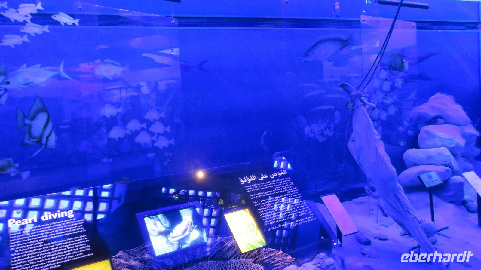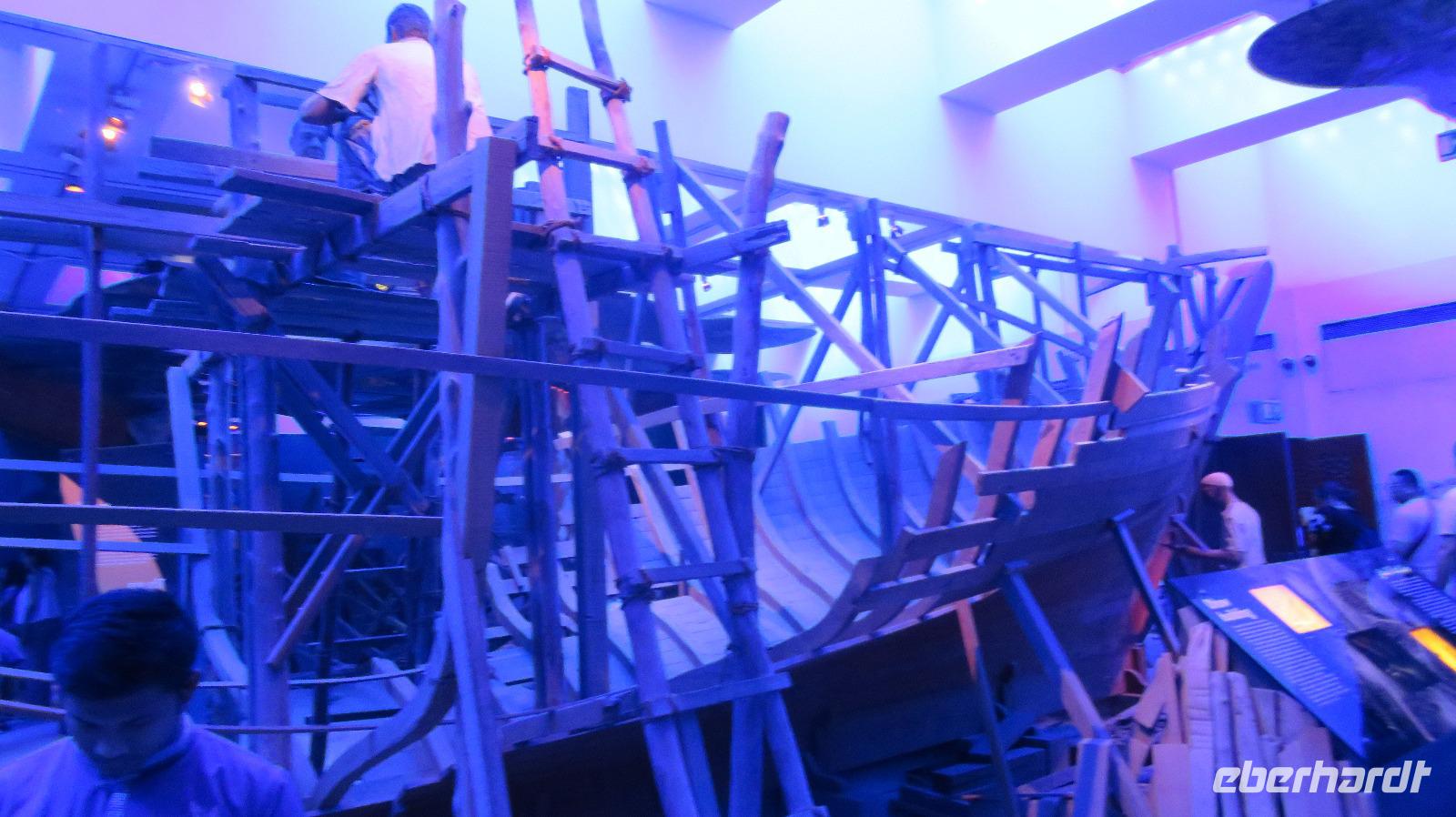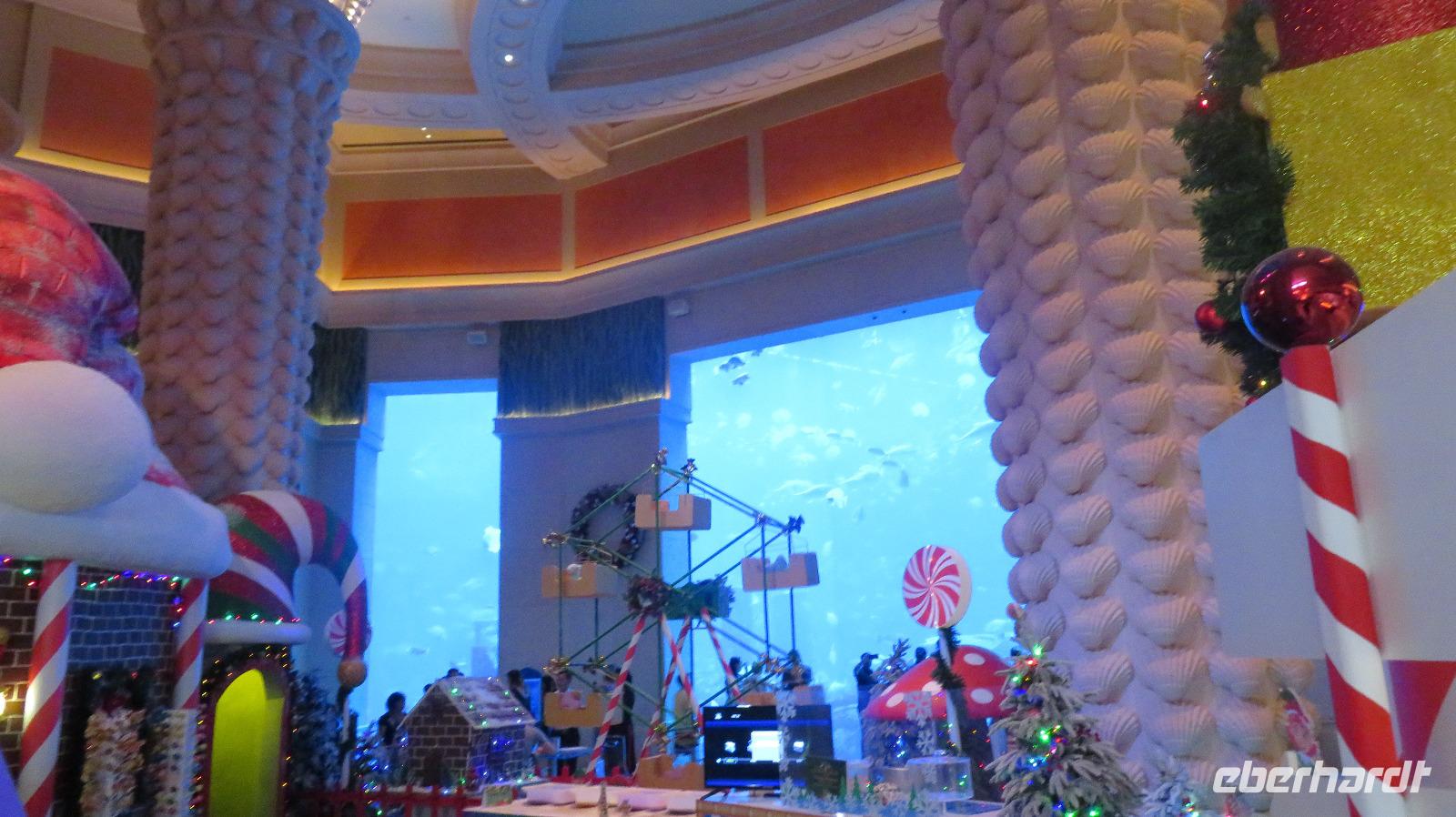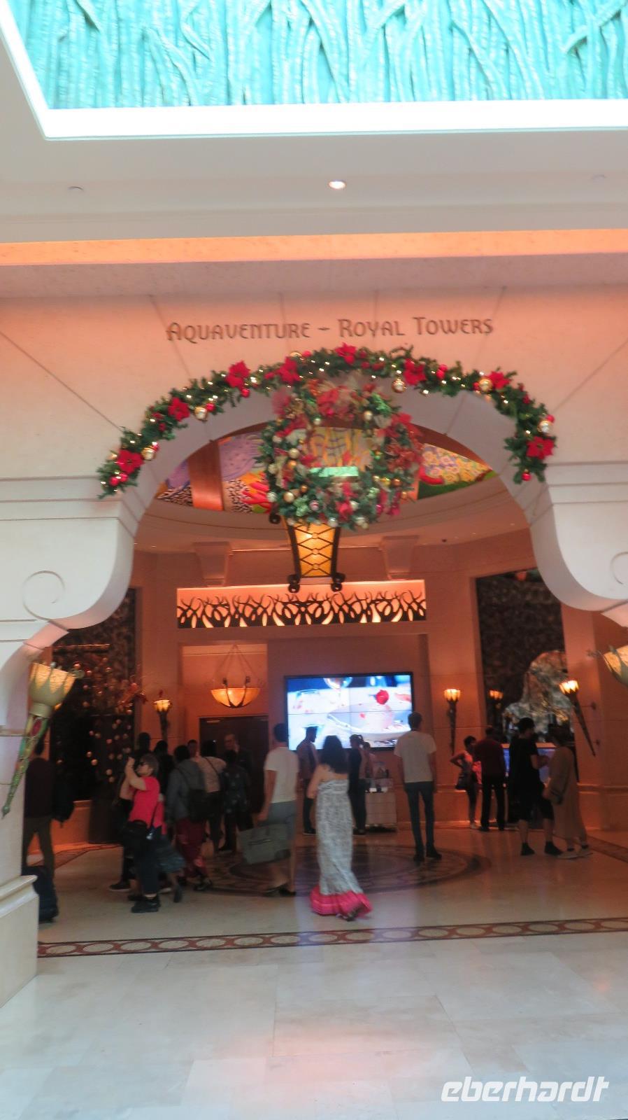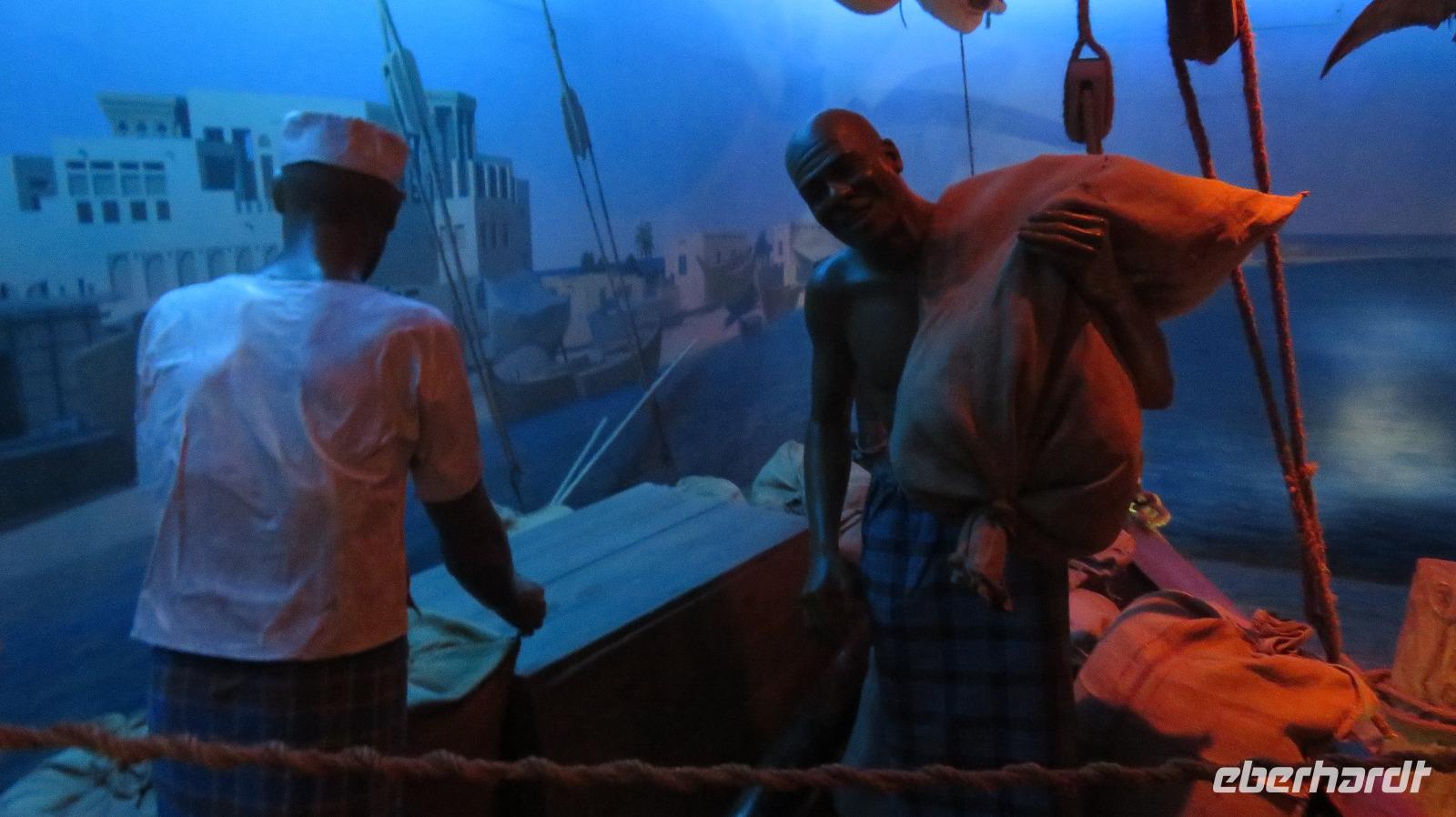 Anja und ich haben aber heute mit elf Gästen ein anderes Ziel: ein köstliches Neujahrs-Mittagessen im Kaleidoskop-Restaurant im Atlantis-Hotel. Zunächst aber besuchen wir den Madinat-Souk, wo zahlreiche Souvenirgeschäfte sowie einige Schmuck und Ladengeschäfte angesiedelt sind. Von einer speziellen Plattform aus haben wir noch ein tolles Fotomotiv auf den Burj al Arab. Danach bummeln wir durch den Souk - was wirklich eine sehr schöne Erfahrung ist, dem im Gegensatz zu den vollen Malls sind hier kaum Leute unterwegs und man kann ungestört auch einmal in einen Laden reingehen und stöbern. Nach rund einer Stunde treffen wir uns wieder und fahren erneut über den Stamm der Palme bis zum Atlantis-Hotel. Heute gehen wir jedoch nicht in eines der Hotelläden sondern die Security lässt uns mit unserer Reservierung vorbei und wir kommen an ein überdimensionales Aquarium. Meterhohe Glasscheiben trennen uns von den schönen bunten Fischen, die hier später sogar von Mitarbeitern gefüttert werden. Wir sind wirklich beeindruckt - wie eigentlich von allem in Dubai. Als die Zeit unserer Mittagsreservierung ran ist, gehen wir zum Eingang des Restaurants und werden auch prompt an drei Tischen platziert. Danach zeigt uns Anja erst einmal das riesige Buffet mit all seinen Leckereien, den Anja verweist auch auf die hinteren Ecken, die sonst schnell einmal übersehen werden. Und ich muss sagen, das Angebot kann sich ja mal richtig sehen lassen. Es gibt zahlreiche verschiedene Köstlichkeiten: eine Käseecke, eine Brotecke mit verschiedenen Dipps, eine Obstabteilung, eine Gemüseecke, verschiedene Suppen, Salate, eine Fischecke mit Muscheln, Austern, Hummer und so viel mehr was das Herz begehrt. Es gibt eine Nudelstation, eine Asia-Ecke, eine indische Ecke und in Mitten von allen ist das Dessert-Buffet. Also mal ehrlich, ich kann mir nicht vorstellen dass es nur einen einzigen Menschen gibt, der hier nichts für sich findet. Und alles was wir probieren, schmeckt auch noch so köstlich. Ich persönlich bin ja froh, dass ich das Frühstück hab ausfallen lassen;-). Bei meinem ersten Dubai-Besuch vor drei Jahren waren wir im Restaurant des Burj al Arab zum Mittagessen. Das war auch sehr lecker aber die Auswahl hier im Atlantis-Hotel war um einiges besser und dabei sogar noch preislich günstiger und alkoholfreie Getränke sind inklusive. Also in das Atlantis-Hotel würde ich immer wieder zurück kehren und wie wir von Anja erfahren, geht sie mit ihrer Familie zu speziellen Anlässen auch sehr gern einmal hier essen. Nun da wir satt gegessen sind, verlassen wir erneut mit der Monorail die Palme und fahren danach via Bus zurück zum Hotel. Am Abend treffe ich mich dann mit der gesamten Reisegruppe wieder denn im Rahmen der zubuchbaren Erlebnis-Halbpension unternehmen wir heute eine Dhow-Fahrt auf dem Dubai-Creek. Mit unserem Bus fahren wir zurück in den alten Stadtteil von Dubai und gehen hier an Bord einer typischen beleuchteten Dhow. Wir haben fest reservierte Plätze und die nicht-alkoholischen Getränke sind auch hier wieder mit inkludiert. Als die Dhow ablegt, können wir uns am Dinner-Buffet bedienen. Dabei schauen wir zu, wie am Fenster die anderen beleuchteten Dhows an uns vorbei ziehen. Wer möchte, kann sich auch auf das Oberdeck des Schiffes begeben und von hier aus die Aussicht bewundern. Zwischendurch erleben wir ein kleines Entertainment-Programm in dem ein Dhow-Crew-Mitglied in einem beleuchteten Anzug verschiedene Tänze zu Fokloremusik darbietet. Zunächst fahren wir mit der Dhow raus in das Hafengebiet was leider nicht sooooo viele schöne Fotomotive bietet aber dann geht es auf dem Dubai Creek noch ein wenig in Richtung Stadt und wir sehen beleuchtete Souks und die vielen Emiratis, die am Abend die Straßen säumen.
