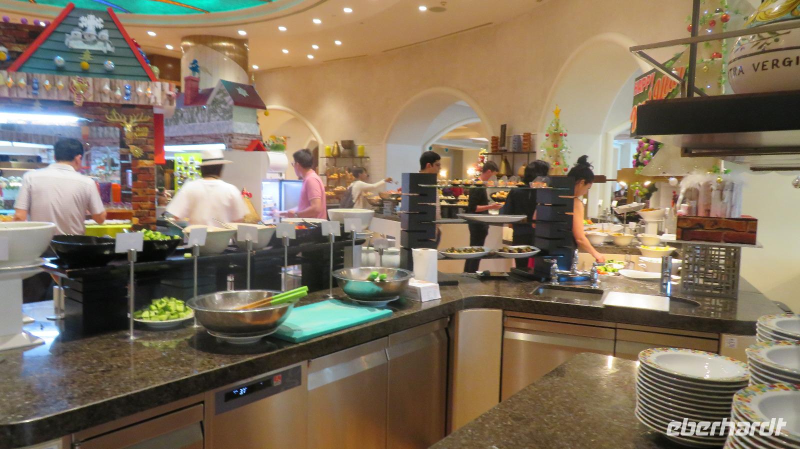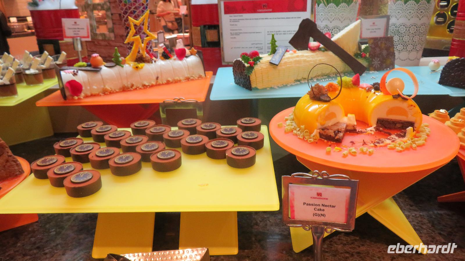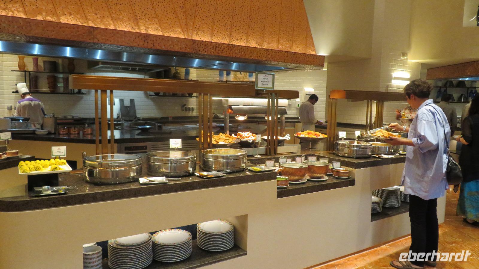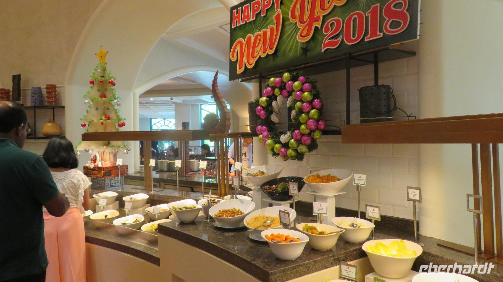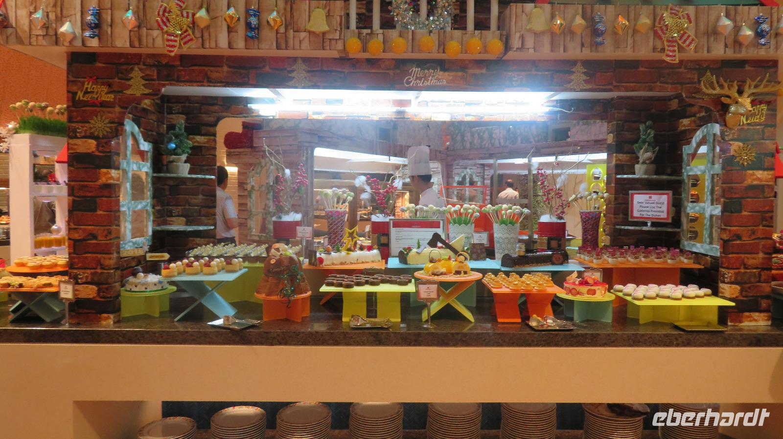 Anja und ich haben aber heute mit elf Gästen ein anderes Ziel: ein köstliches Neujahrs-Mittagessen im Kaleidoskop-Restaurant im Atlantis-Hotel. Zunächst aber besuchen wir den Madinat-Souk, wo zahlreiche Souvenirgeschäfte sowie einige Schmuck und Ladengeschäfte angesiedelt sind. Von einer speziellen Plattform aus haben wir noch ein tolles Fotomotiv auf den Burj al Arab. Danach bummeln wir durch den Souk - was wirklich eine sehr schöne Erfahrung ist, dem im Gegensatz zu den vollen Malls sind hier kaum Leute unterwegs und man kann ungestört auch einmal in einen Laden reingehen und stöbern. Nach rund einer Stunde treffen wir uns wieder und fahren erneut über den Stamm der Palme bis zum Atlantis-Hotel. Heute gehen wir jedoch nicht in eines der Hotelläden sondern die Security lässt uns mit unserer Reservierung vorbei und wir kommen an ein überdimensionales Aquarium. Meterhohe Glasscheiben trennen uns von den schönen bunten Fischen, die hier später sogar von Mitarbeitern gefüttert werden. Wir sind wirklich beeindruckt - wie eigentlich von allem in Dubai. Als die Zeit unserer Mittagsreservierung ran ist, gehen wir zum Eingang des Restaurants und werden auch prompt an drei Tischen platziert. Danach zeigt uns Anja erst einmal das riesige Buffet mit all seinen Leckereien, den Anja verweist auch auf die hinteren Ecken, die sonst schnell einmal übersehen werden. Und ich muss sagen, das Angebot kann sich ja mal richtig sehen lassen. Es gibt zahlreiche verschiedene Köstlichkeiten: eine Käseecke, eine Brotecke mit verschiedenen Dipps, eine Obstabteilung, eine Gemüseecke, verschiedene Suppen, Salate, eine Fischecke mit Muscheln, Austern, Hummer und so viel mehr was das Herz begehrt. Es gibt eine Nudelstation, eine Asia-Ecke, eine indische Ecke und in Mitten von allen ist das Dessert-Buffet. Also mal ehrlich, ich kann mir nicht vorstellen dass es nur einen einzigen Menschen gibt, der hier nichts für sich findet. Und alles was wir probieren, schmeckt auch noch so köstlich. Ich persönlich bin ja froh, dass ich das Frühstück hab ausfallen lassen;-). Bei meinem ersten Dubai-Besuch vor drei Jahren waren wir im Restaurant des Burj al Arab zum Mittagessen. Das war auch sehr lecker aber die Auswahl hier im Atlantis-Hotel war um einiges besser und dabei sogar noch preislich günstiger und alkoholfreie Getränke sind inklusive. Also in das Atlantis-Hotel würde ich immer wieder zurück kehren und wie wir von Anja erfahren, geht sie mit ihrer Familie zu speziellen Anlässen auch sehr gern einmal hier essen. Nun da wir satt gegessen sind, verlassen wir erneut mit der Monorail die Palme und fahren danach via Bus zurück zum Hotel. Am Abend treffe ich mich dann mit der gesamten Reisegruppe wieder denn im Rahmen der zubuchbaren Erlebnis-Halbpension unternehmen wir heute eine Dhow-Fahrt auf dem Dubai-Creek. Mit unserem Bus fahren wir zurück in den alten Stadtteil von Dubai und gehen hier an Bord einer typischen beleuchteten Dhow. Wir haben fest reservierte Plätze und die nicht-alkoholischen Getränke sind auch hier wieder mit inkludiert. Als die Dhow ablegt, können wir uns am Dinner-Buffet bedienen. Dabei schauen wir zu, wie am Fenster die anderen beleuchteten Dhows an uns vorbei ziehen. Wer möchte, kann sich auch auf das Oberdeck des Schiffes begeben und von hier aus die Aussicht bewundern. Zwischendurch erleben wir ein kleines Entertainment-Programm in dem ein Dhow-Crew-Mitglied in einem beleuchteten Anzug verschiedene Tänze zu Fokloremusik darbietet. Zunächst fahren wir mit der Dhow raus in das Hafengebiet was leider nicht sooooo viele schöne Fotomotive bietet aber dann geht es auf dem Dubai Creek noch ein wenig in Richtung Stadt und wir sehen beleuchtete Souks und die vielen Emiratis, die am Abend die Straßen säumen.