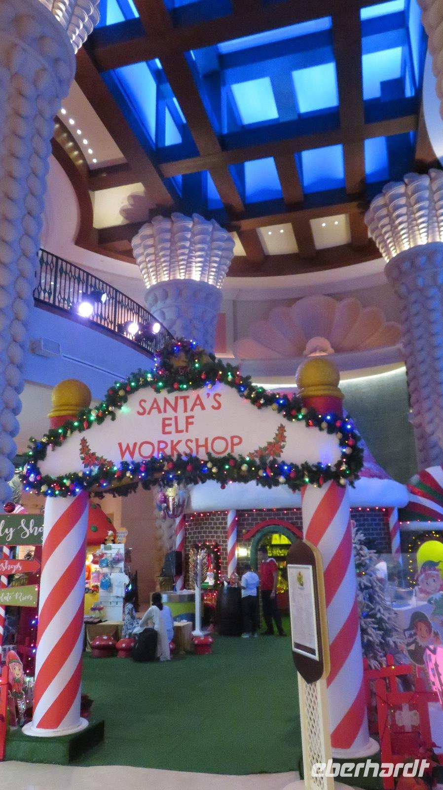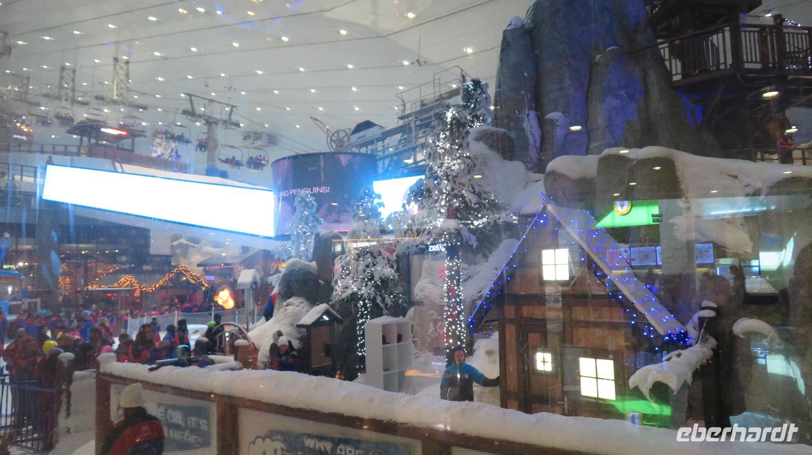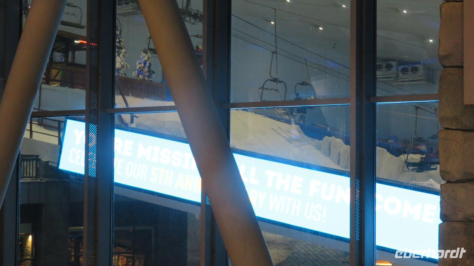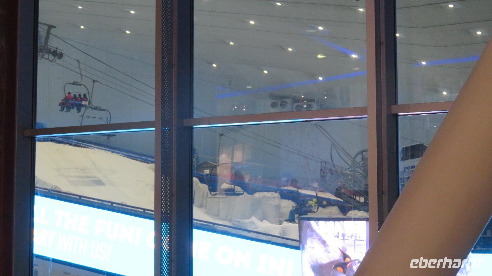 Wir steuern nun Richtung Mall of the Emirates zu und tauchen damit endgültige in das moderne Dubai ein. Die Einkaufszentren, oder Malls, sind gigantisch groß wenn nicht sogar riesig. Etwas Vergleichbares habe ich in Deutschland noch nicht besucht. Und jede Mall hat eine spezielle Attraktion, durch die sie sich von den anderen abhebt. Die komische Form dieser Mall läßt es von außen vielleicht schon erahnen - hier im Inneren befindet sich eine Skihalle, die wir über zwei Stockwerke durch riesige Glasscheiben bewundern können. Die Piste ist rund 400 Meter lang und sollte der Strom in dieser Mall einmal ausfallen, kann die Skihalle trotzdem noch weitere 5 Tage betrieben werden. Den „Gipfel" der Piste erreicht man via eines Sesseliftes und wer hier einfach einmal rodeln möchte, kann das auch tun. Für uns Deutsche ist das irgendwie surreal, können wir doch in die Alpen zum Skifahren reisen aber die Emiratis haben diese Möglichkeit nicht. Also gehen sie einfach mal in die Shopping-Mall zum Schneevergnügen?.