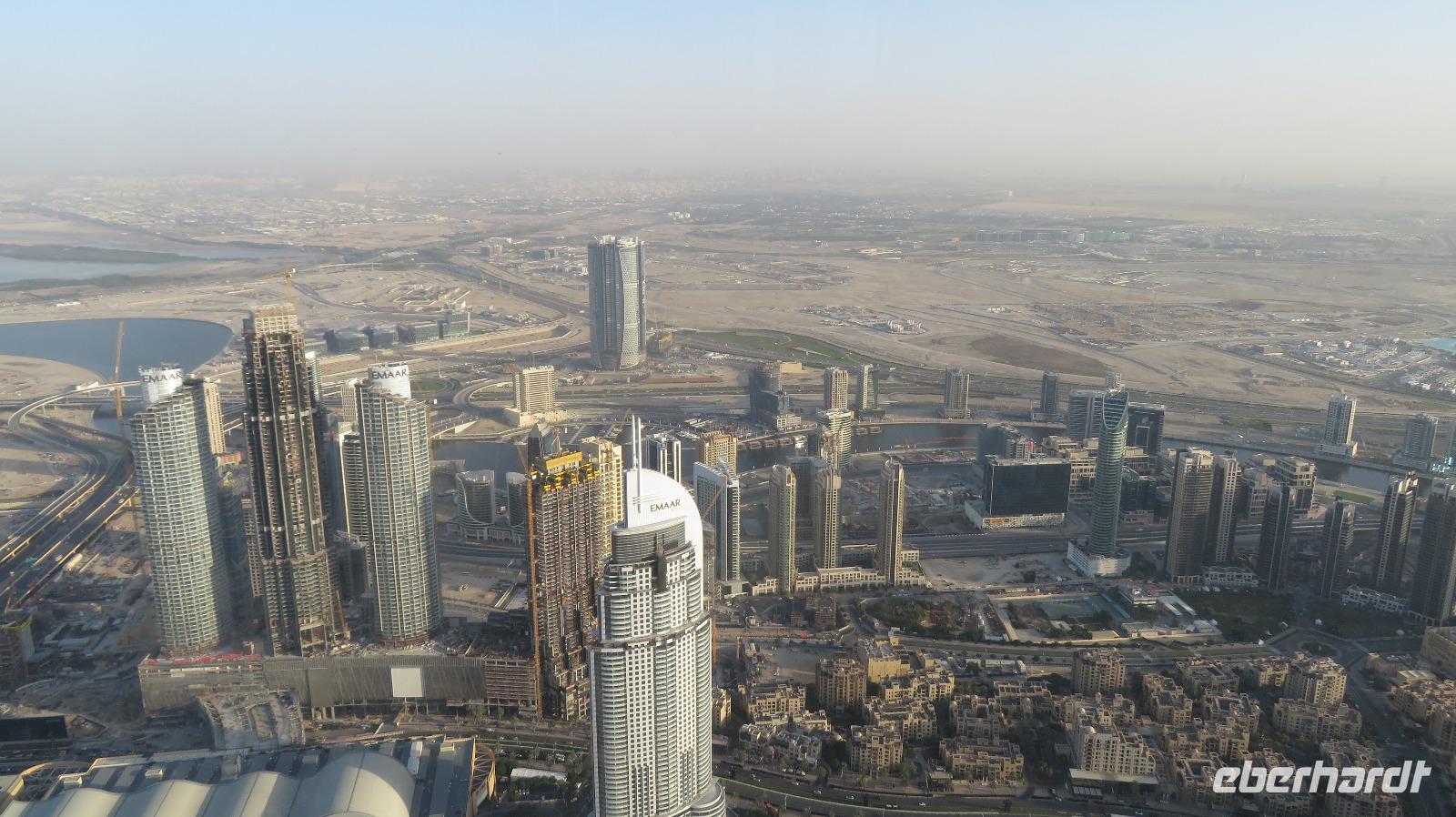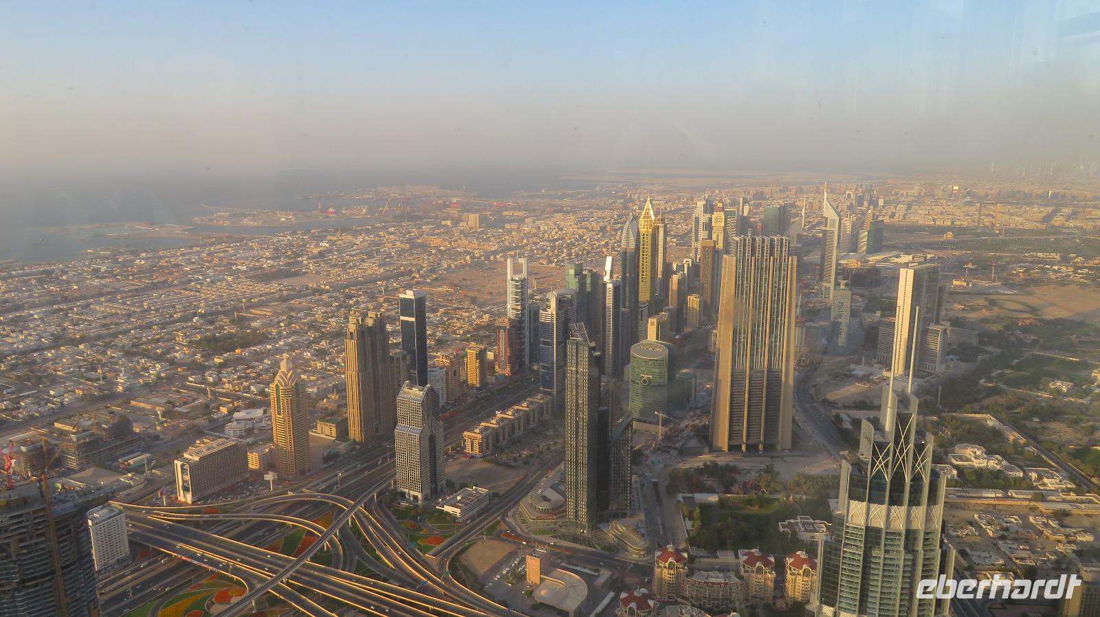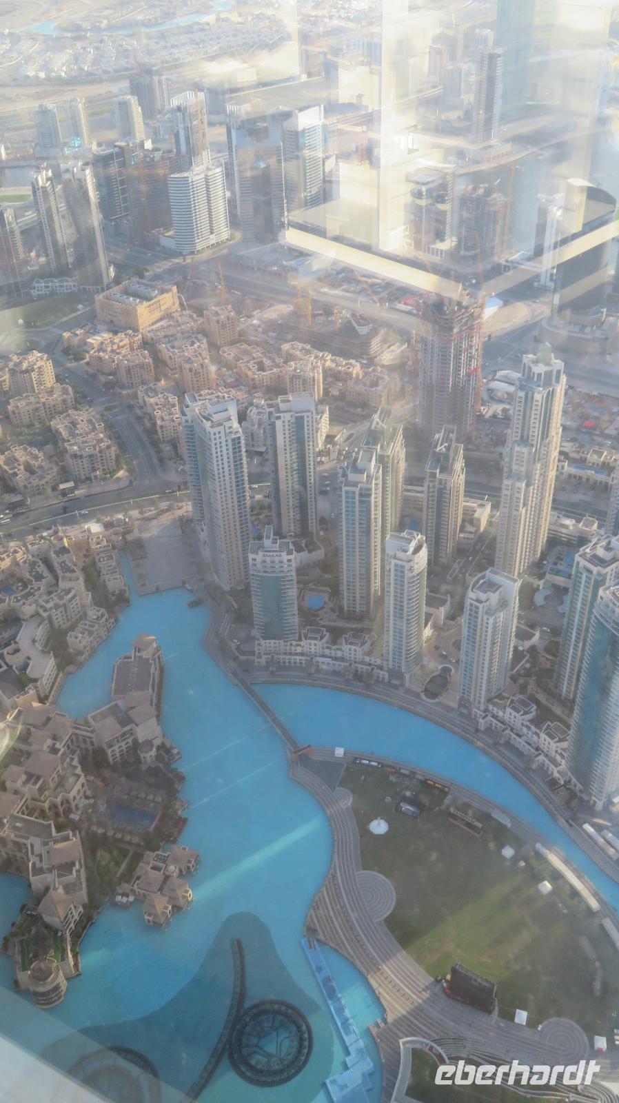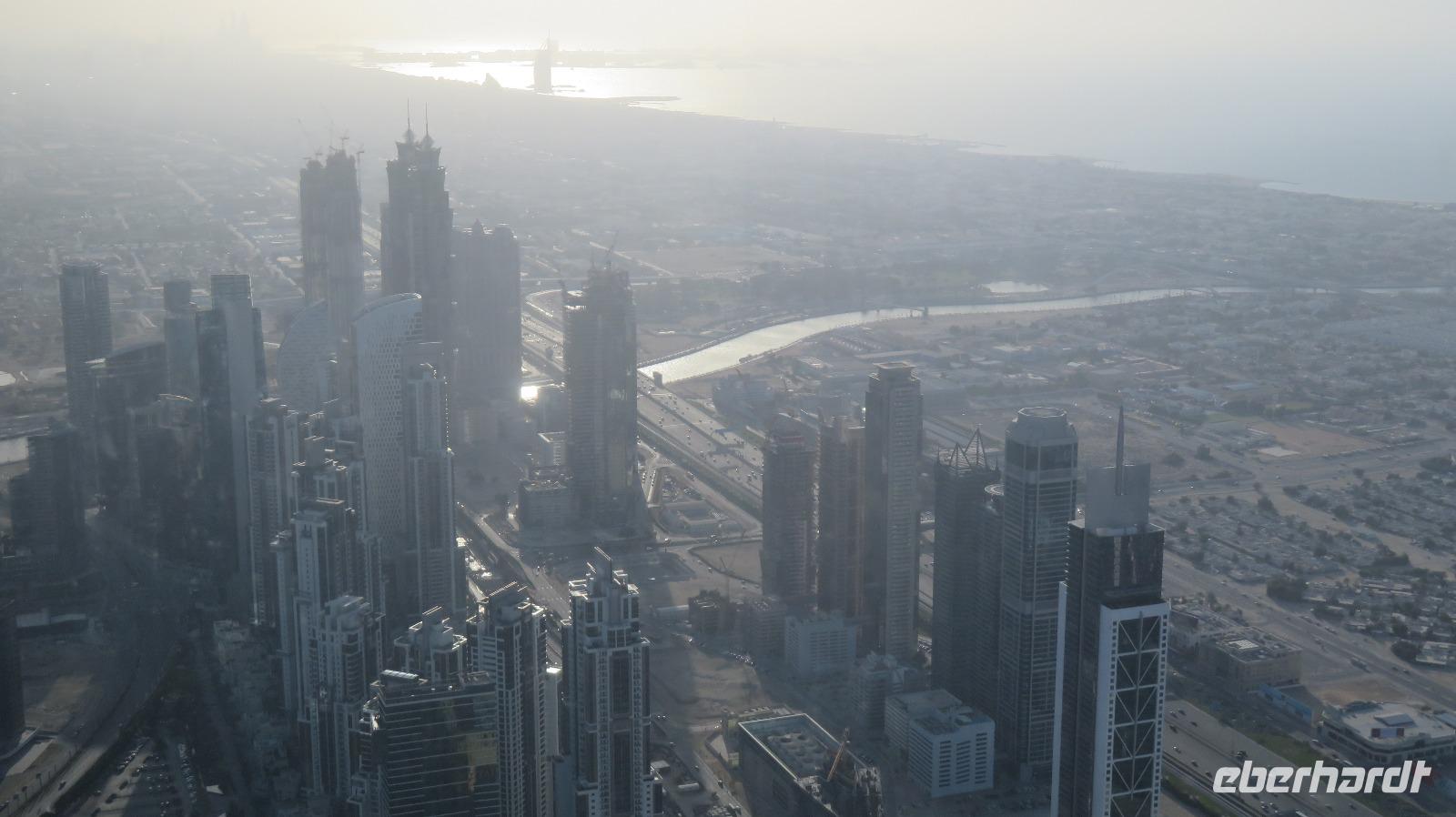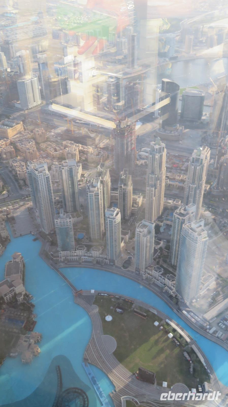 Und jetzt jagt ein Highlight das nächste, naja, eigentlich ist es der Höhepunkt des Tages. Wir treffen uns, um gemeinsam, wer will und im Vorfeld gebucht hat, auf den höchsten Turm der Welt, dem Burj Khalifa, aufzufahren. Leider ist es schon etwas dissig und man erkennt z.B. nicht die Dubai World aber dennoch gibt es von hier oben viel zu sehen: viel Wüste und Land (wo sich die Emirates bautechnisch noch austoben könnne), viele Hochhäuser (Hotels, Malls, Burj al Arab, die Zwillingstürme) aber auch viel Wasser. Leider sind außer uns noch ziemlich viele andere Menschen hier, da heute drei Kreuzer im Hafen von Dubai anliegen aber irgendwie schaffen wir es trotzdem, viel von hier oben aus zu sehen.