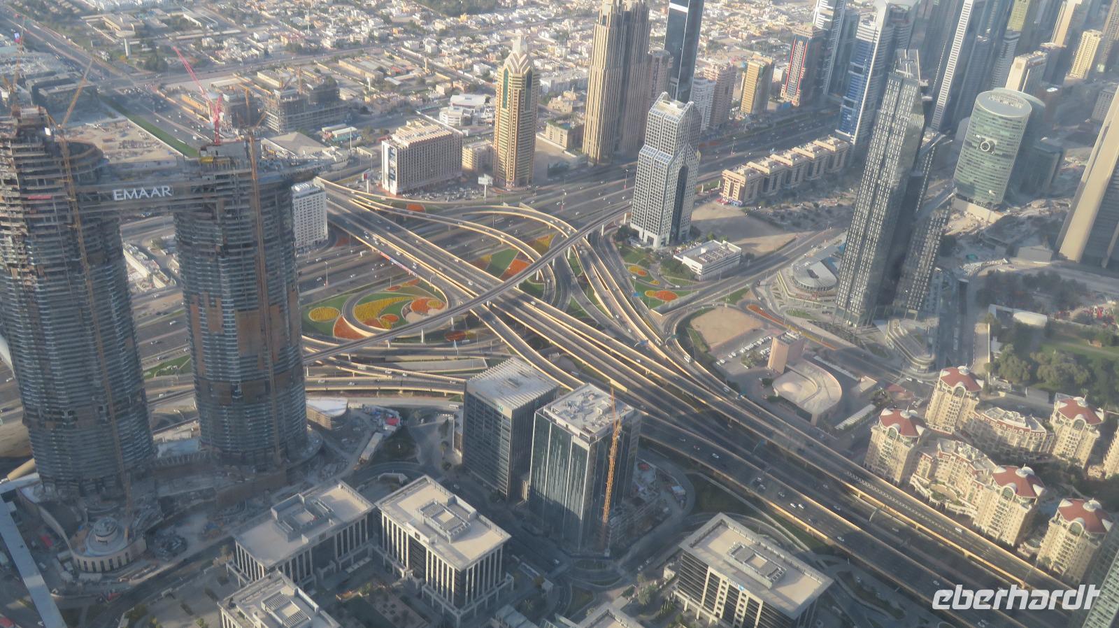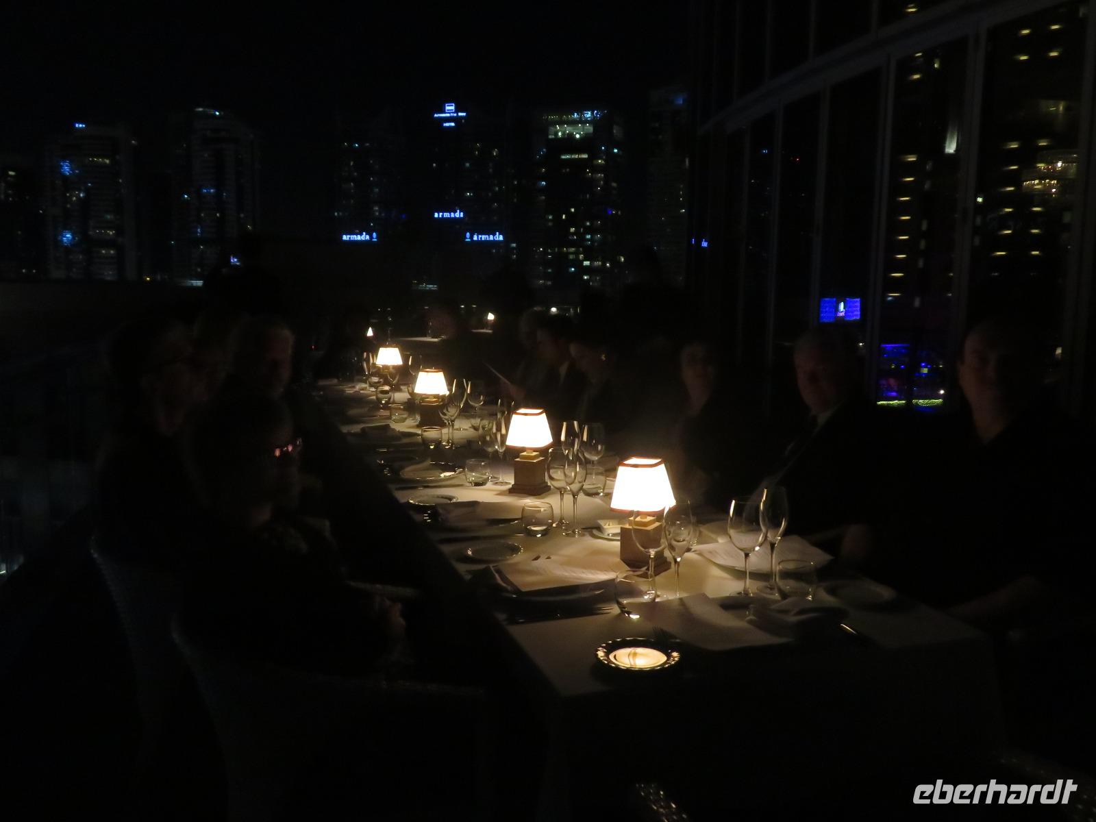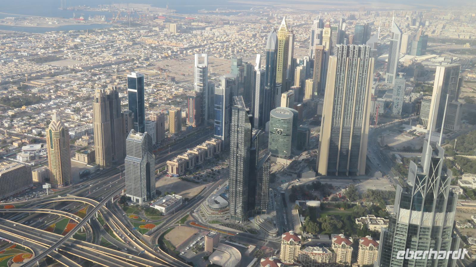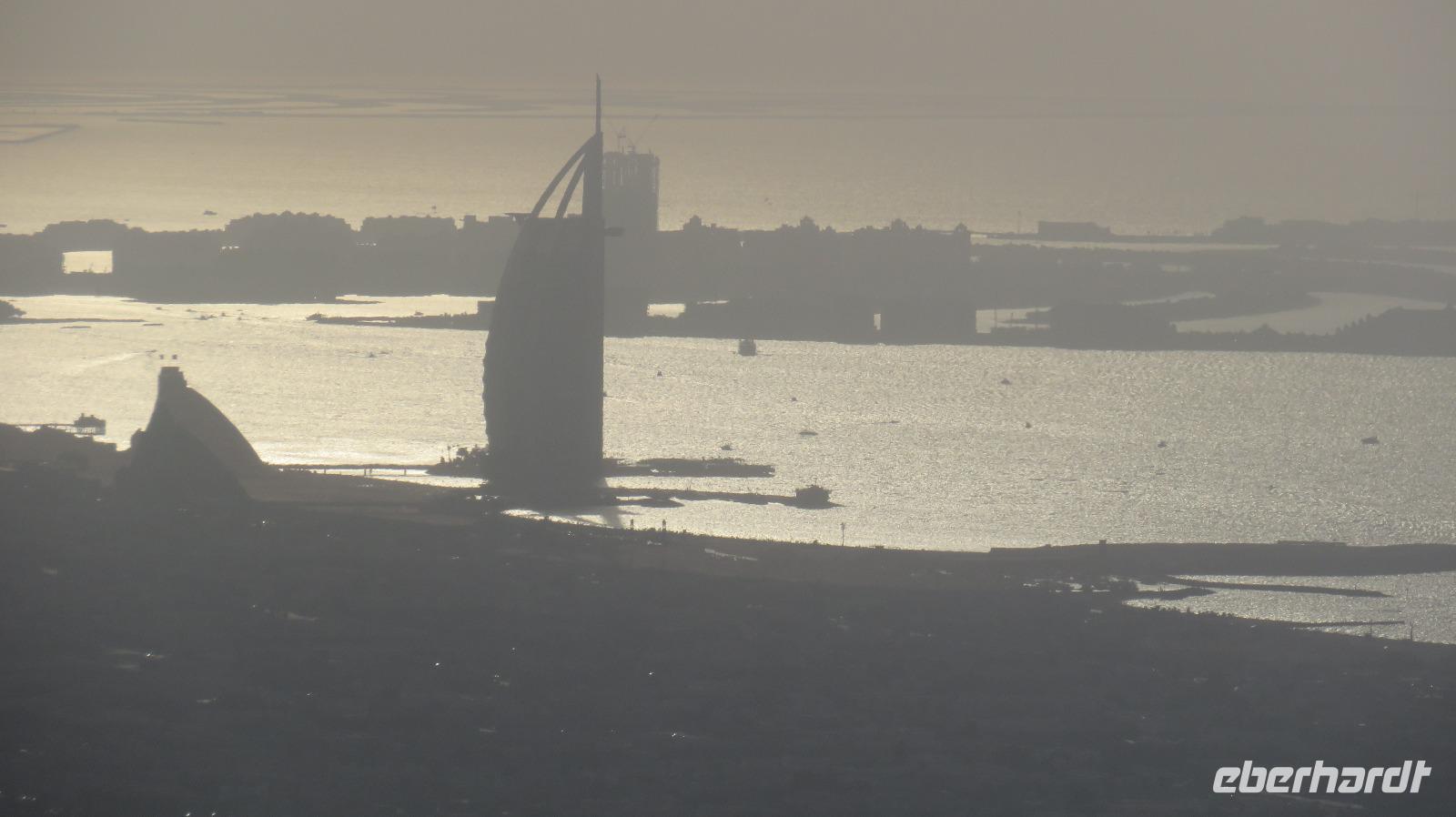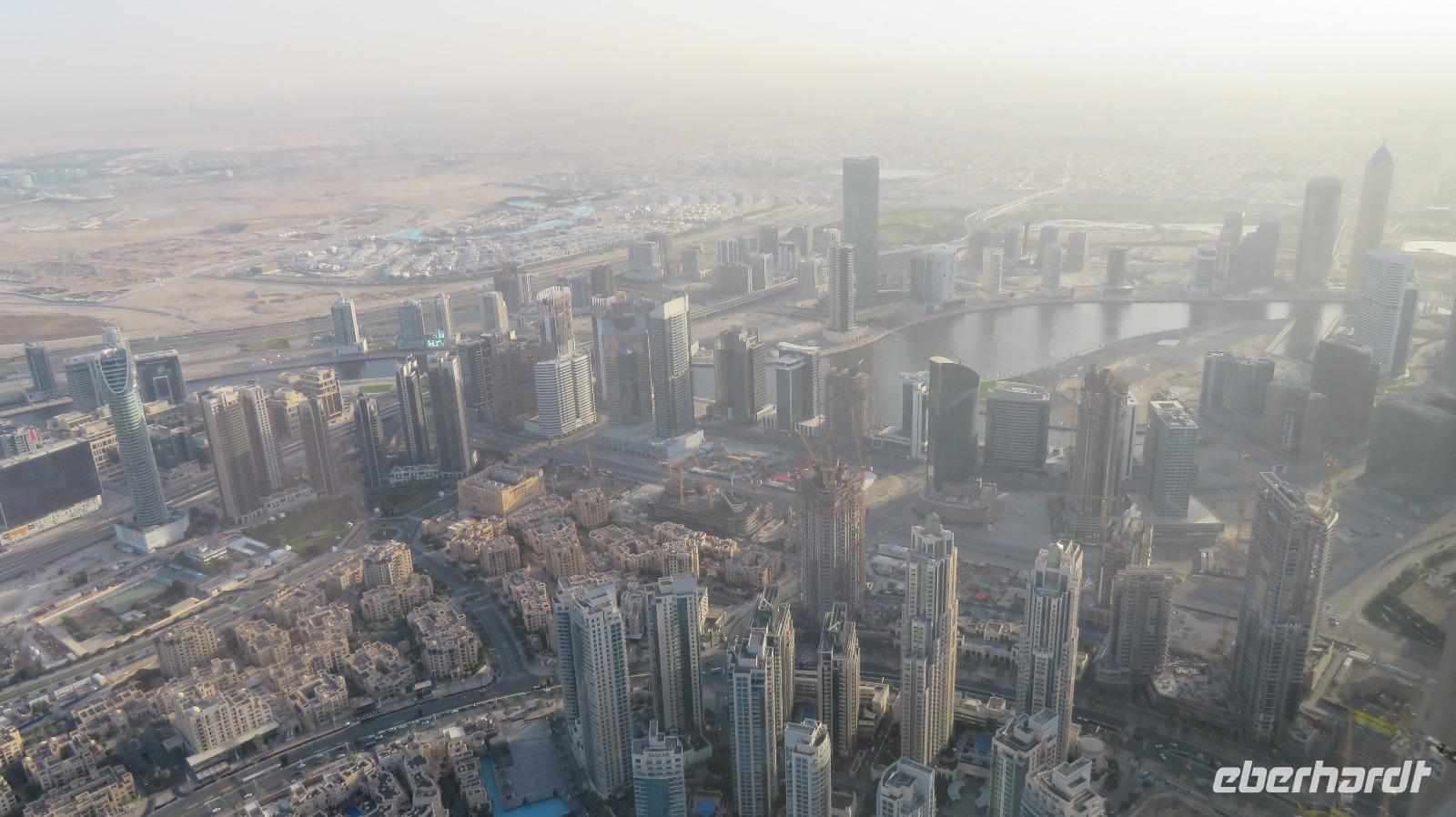 Und jetzt jagt ein Highlight das nächste, naja, eigentlich ist es der Höhepunkt des Tages. Wir treffen uns, um gemeinsam, wer will und im Vorfeld gebucht hat, auf den höchsten Turm der Welt, dem Burj Khalifa, aufzufahren. Leider ist es schon etwas dissig und man erkennt z.B. nicht die Dubai World aber dennoch gibt es von hier oben viel zu sehen: viel Wüste und Land (wo sich die Emirates bautechnisch noch austoben könnne), viele Hochhäuser (Hotels, Malls, Burj al Arab, die Zwillingstürme) aber auch viel Wasser. Leider sind außer uns noch ziemlich viele andere Menschen hier, da heute drei Kreuzer im Hafen von Dubai anliegen aber irgendwie schaffen wir es trotzdem, viel von hier oben aus zu sehen.