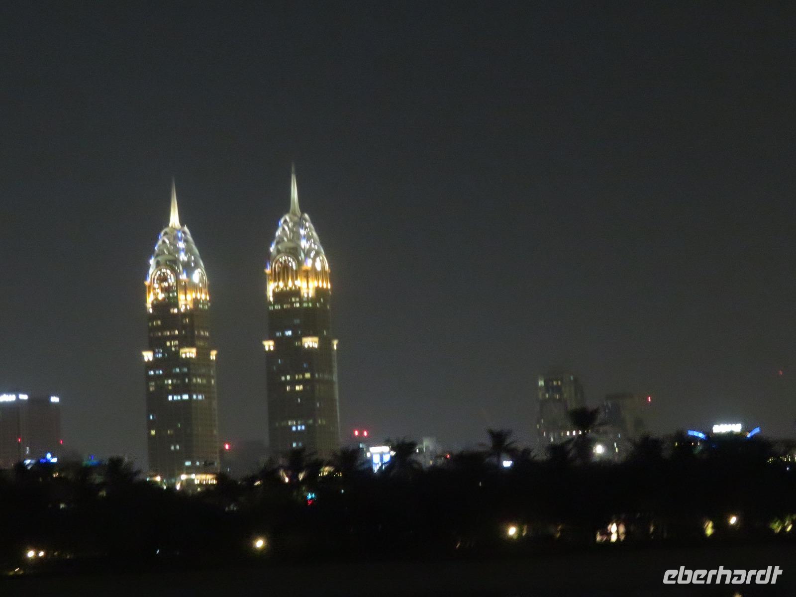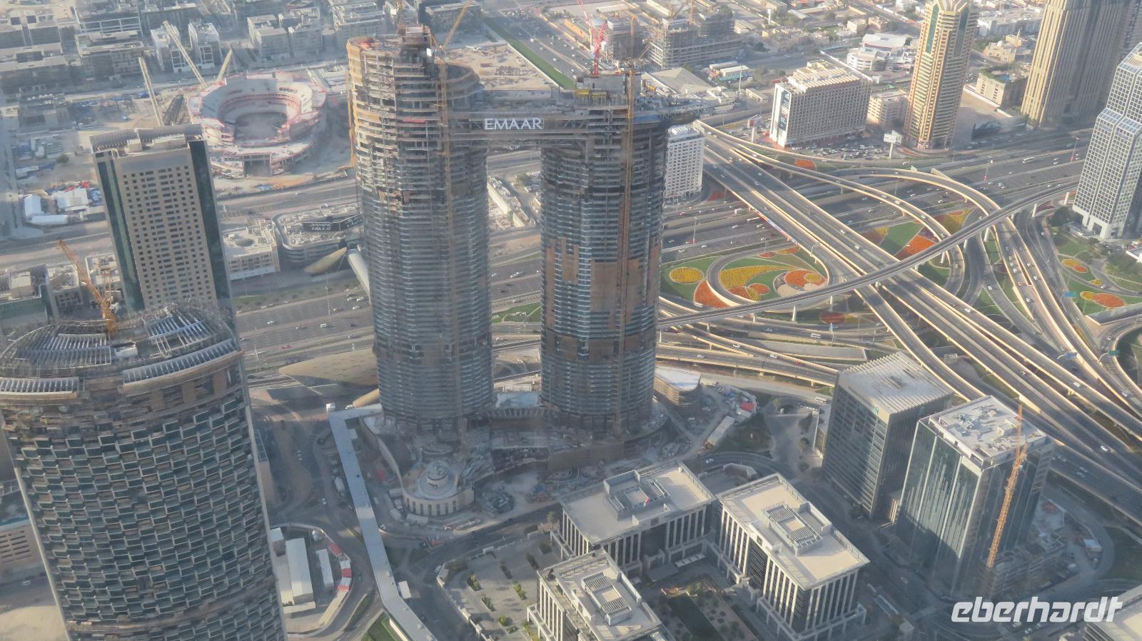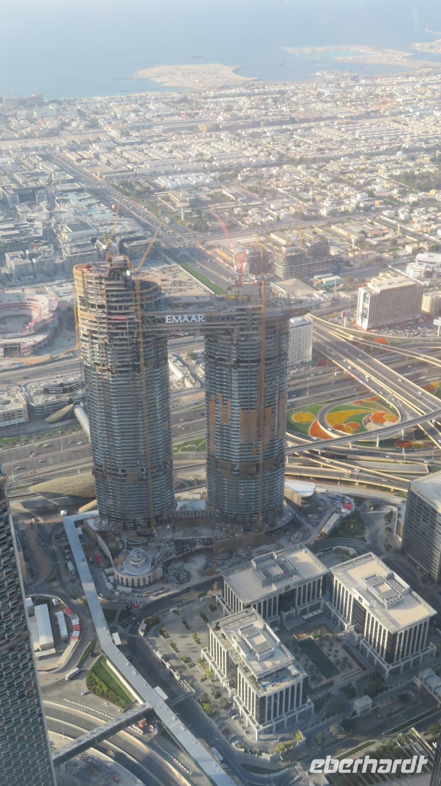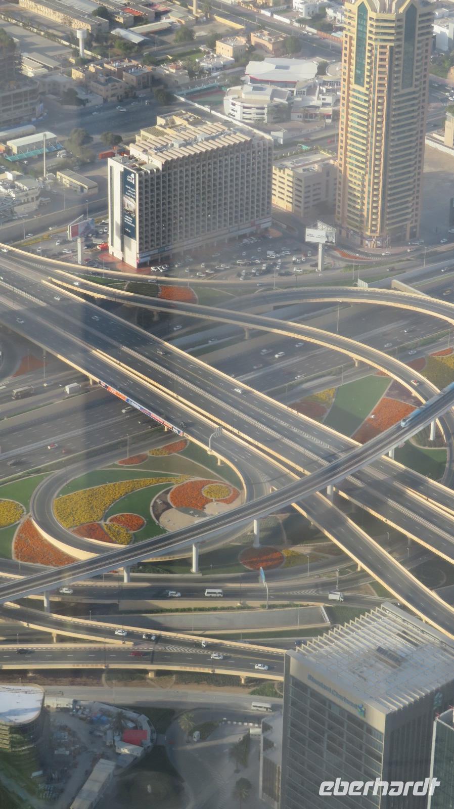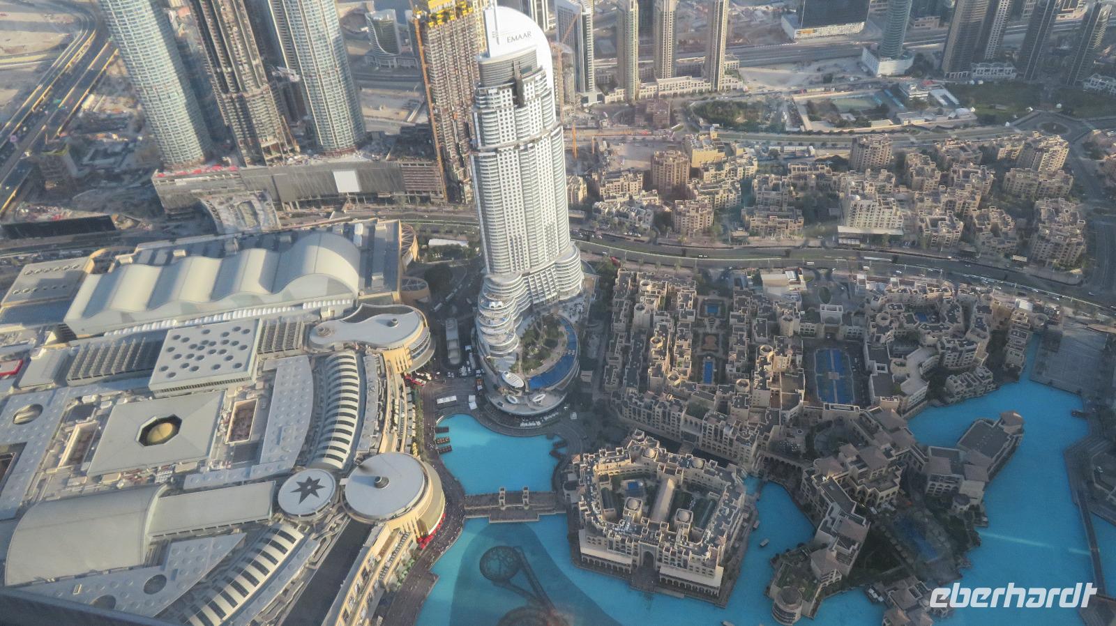 Und jetzt jagt ein Highlight das nächste, naja, eigentlich ist es der Höhepunkt des Tages. Wir treffen uns, um gemeinsam, wer will und im Vorfeld gebucht hat, auf den höchsten Turm der Welt, dem Burj Khalifa, aufzufahren. Leider ist es schon etwas dissig und man erkennt z.B. nicht die Dubai World aber dennoch gibt es von hier oben viel zu sehen: viel Wüste und Land (wo sich die Emirates bautechnisch noch austoben könnne), viele Hochhäuser (Hotels, Malls, Burj al Arab, die Zwillingstürme) aber auch viel Wasser. Leider sind außer uns noch ziemlich viele andere Menschen hier, da heute drei Kreuzer im Hafen von Dubai anliegen aber irgendwie schaffen wir es trotzdem, viel von hier oben aus zu sehen.