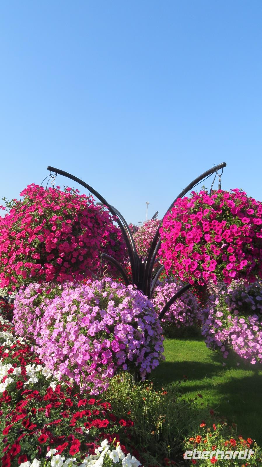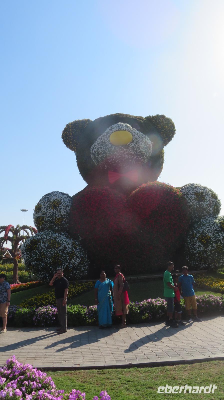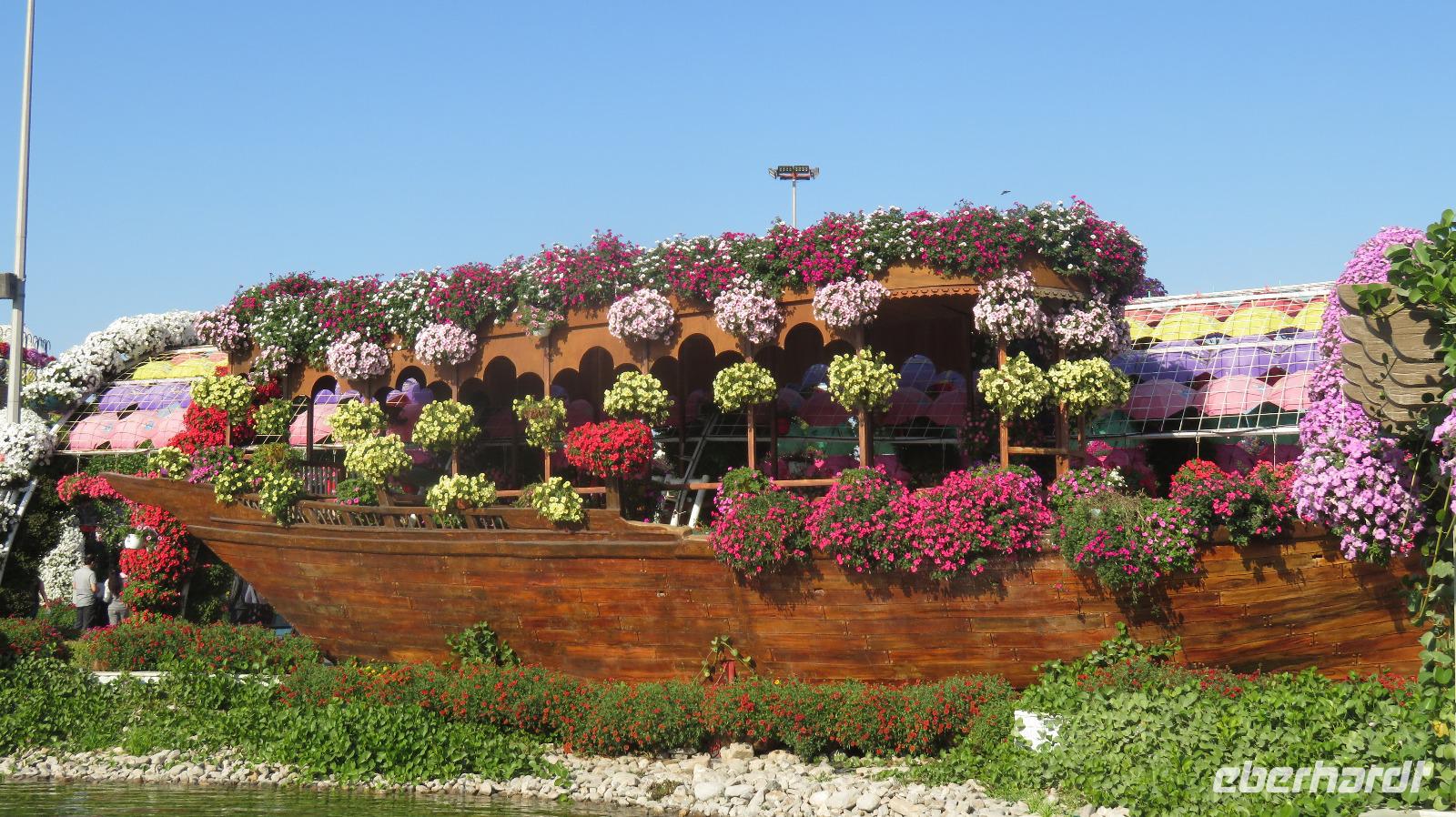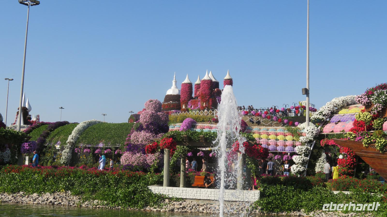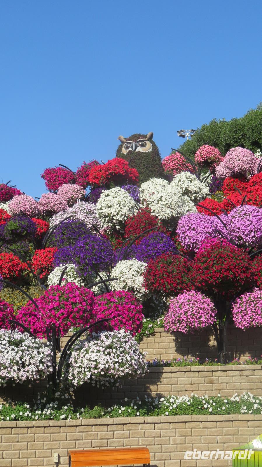 Auf dem heutigen Programm steht Freizeit. Wer möchte, kann sich mir am heutigen Vormittag noch einmal zu einem Besuch in der Dubai Mall anschließen, um vielleicht das ein oder andere Schnäppchen beim Shopping-Festival zu machen oder ganz einfach noch ein Souvenir oder Andenken zu kaufen. 6 Gäste meiner Reisegruppe schließen sich mir an und so fahren wir gemeinsam mit der Metro (die Station befindet sich direkt gegenüber von unserem Hotel) die sechs Stationen bis zur Dubai Mall. Die Sonne lacht und der Himmel ist blau. Dennoch erreichen wir die Mall nur über einen klimatisierten Gang, der sich gefühlt auf einen Kilometer erstreckt. Wir müssen darüber erst einmal herzlich lachen, als wir nach rund zehn bis fünfzehn Minuten Fußmarsch die ersten Läden der Mall erreichen. Hier trennen sich dann weitestgehend unsere Wege, da ja doch jeder andere Shoppinginteresse verfolgt. Da ich ein Tagesticket für die Metro gekauft habe, kann dann jeder Gast zu jeder Zeit mit unterschiedlichem Ziel (Hotel, Mall of the Emirates) aufbrechen. Als ich so mitten im Souvenirladen stehe, klingelt mein Handy. Leider muss ich erfahren, dass der Helikopter-Rundflug, den vier meiner Gäste gebucht haben, ausfällt. Der Grund ist eine Graduation-Feier der Polizei, zu der auch der Scheich höchstpersönlich erwartet wird. Leider wurde diese Information nicht vorher veröffentlich. Es tut mir so leid für meine vier lieben Gäste, dass wir Ihnen diesen Wunsch nicht realisieren konnten. Dafür hat sich ein anderer Reisegast seinen großen Geburtstagswunsch erfüllt und erlebte einen Tandem-Sprung in der Wüste. Seine leuchtenden Augen bei der Erzählung vom Sprung werde ich so schnell nicht vergessen. Oli, Du hast richtig glücklich gewirkt mit Deinem ganzen Adrenalin im Blut;-) Aber nun zurück zur Mall. Wir verlassen diese mit dem Ziel, zurück zum Hotel zu fahren, denn für den Nachmittag habe ich noch dem gemeinsamen Besuch des Miracle Garden angeboten, zu dem mich fünf Gäste begleiten. Aufgeteilt in zwei Taxen fahren wir in rund 20 Minuten zu dieser wundervollen Attraktion. Auf einem großen Areal haben sich die Emirates hier blumen- und blütentechnisch voll ausgetobt: sei es ein riesengroßer Teddy aus Pflanzen, ein Flieger der Airline Emirates, bunte Häuser und Vögel - alles ist wunderhübsch angelegt und man muss unbedingt auf die Details achten. Besonders beeindruckend für mich war eine angepflanzte Uhr, die wirklich die tatsächliche Uhrzeit anzeigt. Keine Ahnung, wie das funktioniert aber es ist auf jeden Fall beeindruckend. Zurück im Hotel heißt es dann leider Kofferpacken, den unsere Zeit hier in Dubai neigt sich langsam dem Ende zu. Jedoch können wir nicht abreisen, ohne ein letztes Highlight zu erleben. Wir fahren gemeinsam mit der Metro noch einmal in die Dubai Marina. Nach unserem letzten Abendessen unter orientalischer Sonne (und später unter dem Mond) chartern wir eine Privat-Yacht, nur für unsere Eberhardt-Gruppe. Wir machen es uns im Inneren der Yacht oder auf dem Oberdeck, je nach Belieben, gemütlich und shippern vorbei an den beleuchteten Hochhäusern der Marina in Richtung Palme. Begleitet von passender Musik (vielen Dank an dieser Stelle an den lieben Feri) lassen wir die Impressionen der Metropole noch einmal auf uns wirken. Ich freue mich sehr, dass dieser Ausflug bei allen meinen Gästen super ankam und sie diese Bootsfahrt zum Ende der Reise noch einmal ausdrücklich gelobt haben. Zurück im Hotel heißt es dann zum ersten Mal Abschied nehmen. Unsere Gäste aus der Schweiz haben einen späteren Rückflug und können so noch einmal die Annehmlichkeit eines gemütlichen Bettes nutzen. Wir anderen checken gg. 23 Uhr im Hotel aus und fahren zum Flughafen von Dubai, wo wir uns letztendlich auch von unserem Chauffeur und Anja verabschieden (müssen).