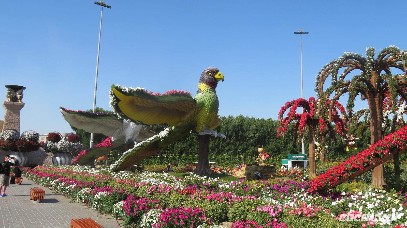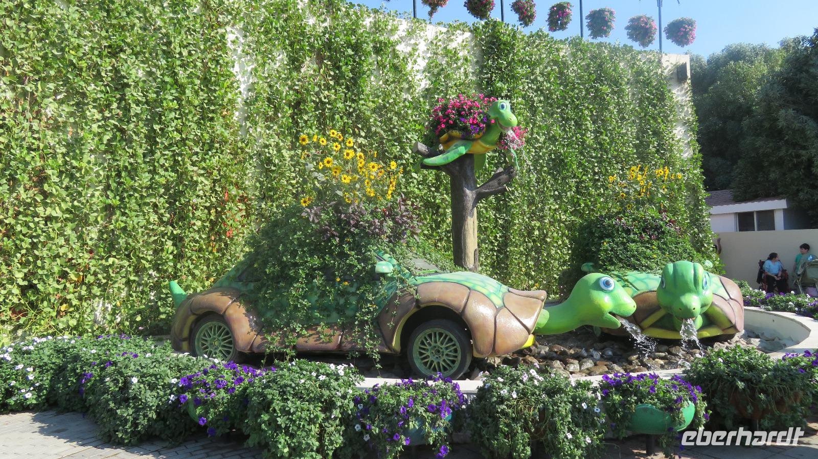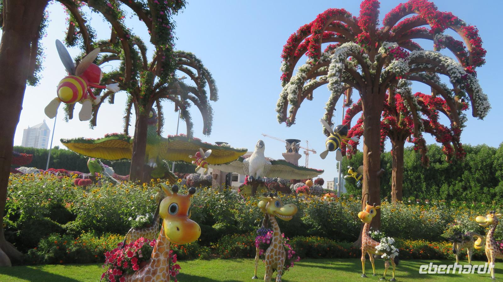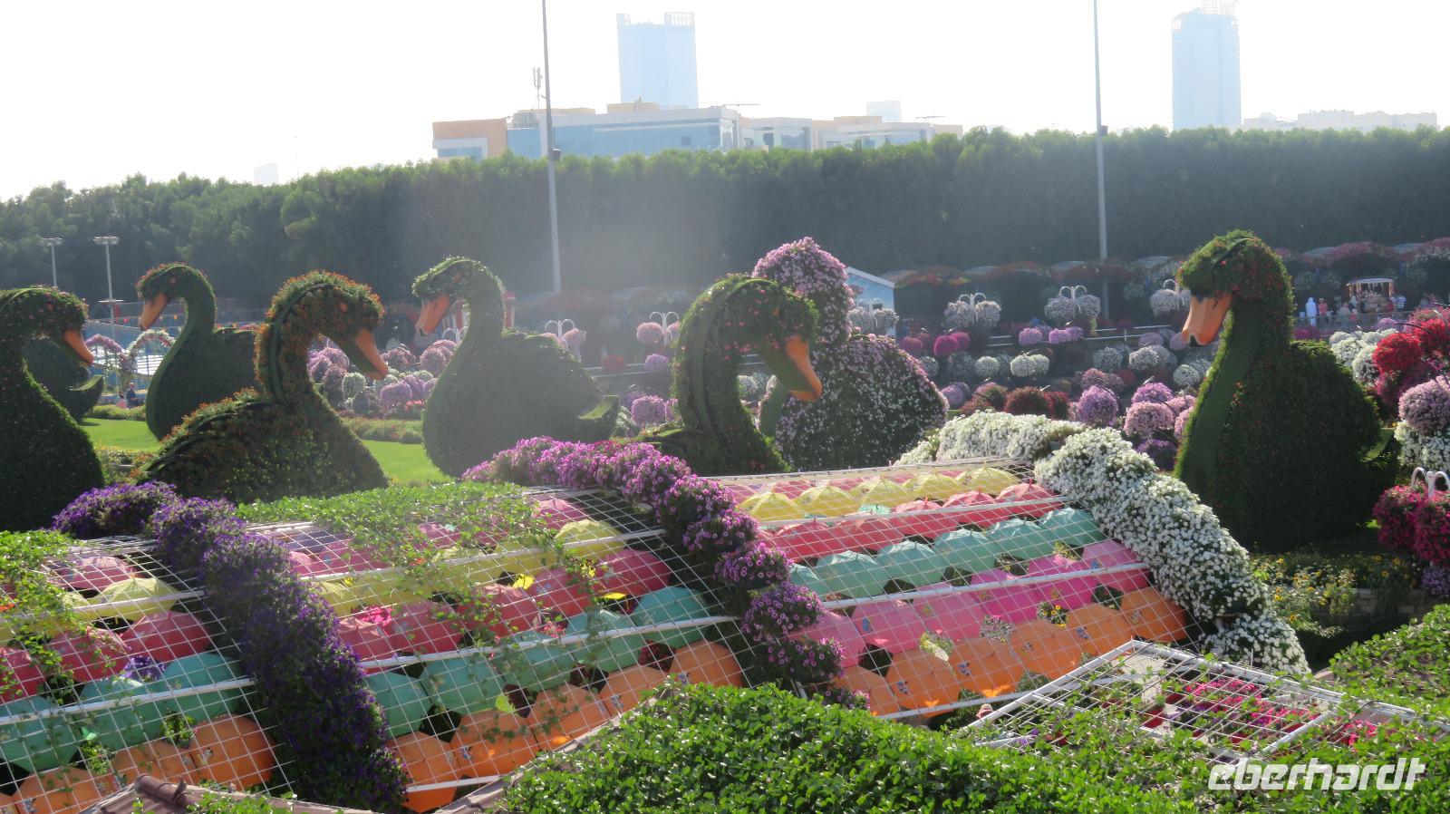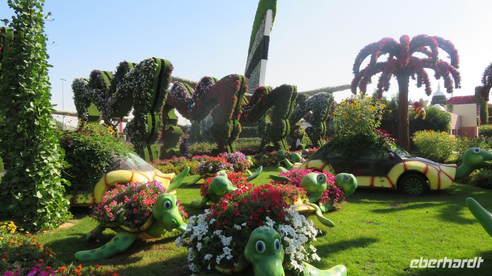 Auf dem heutigen Programm steht Freizeit. Wer möchte, kann sich mir am heutigen Vormittag noch einmal zu einem Besuch in der Dubai Mall anschließen, um vielleicht das ein oder andere Schnäppchen beim Shopping-Festival zu machen oder ganz einfach noch ein Souvenir oder Andenken zu kaufen. 6 Gäste meiner Reisegruppe schließen sich mir an und so fahren wir gemeinsam mit der Metro (die Station befindet sich direkt gegenüber von unserem Hotel) die sechs Stationen bis zur Dubai Mall. Die Sonne lacht und der Himmel ist blau. Dennoch erreichen wir die Mall nur über einen klimatisierten Gang, der sich gefühlt auf einen Kilometer erstreckt. Wir müssen darüber erst einmal herzlich lachen, als wir nach rund zehn bis fünfzehn Minuten Fußmarsch die ersten Läden der Mall erreichen. Hier trennen sich dann weitestgehend unsere Wege, da ja doch jeder andere Shoppinginteresse verfolgt. Da ich ein Tagesticket für die Metro gekauft habe, kann dann jeder Gast zu jeder Zeit mit unterschiedlichem Ziel (Hotel, Mall of the Emirates) aufbrechen. Als ich so mitten im Souvenirladen stehe, klingelt mein Handy. Leider muss ich erfahren, dass der Helikopter-Rundflug, den vier meiner Gäste gebucht haben, ausfällt. Der Grund ist eine Graduation-Feier der Polizei, zu der auch der Scheich höchstpersönlich erwartet wird. Leider wurde diese Information nicht vorher veröffentlich. Es tut mir so leid für meine vier lieben Gäste, dass wir Ihnen diesen Wunsch nicht realisieren konnten. Dafür hat sich ein anderer Reisegast seinen großen Geburtstagswunsch erfüllt und erlebte einen Tandem-Sprung in der Wüste. Seine leuchtenden Augen bei der Erzählung vom Sprung werde ich so schnell nicht vergessen. Oli, Du hast richtig glücklich gewirkt mit Deinem ganzen Adrenalin im Blut;-) Aber nun zurück zur Mall. Wir verlassen diese mit dem Ziel, zurück zum Hotel zu fahren, denn für den Nachmittag habe ich noch dem gemeinsamen Besuch des Miracle Garden angeboten, zu dem mich fünf Gäste begleiten. Aufgeteilt in zwei Taxen fahren wir in rund 20 Minuten zu dieser wundervollen Attraktion. Auf einem großen Areal haben sich die Emirates hier blumen- und blütentechnisch voll ausgetobt: sei es ein riesengroßer Teddy aus Pflanzen, ein Flieger der Airline Emirates, bunte Häuser und Vögel - alles ist wunderhübsch angelegt und man muss unbedingt auf die Details achten. Besonders beeindruckend für mich war eine angepflanzte Uhr, die wirklich die tatsächliche Uhrzeit anzeigt. Keine Ahnung, wie das funktioniert aber es ist auf jeden Fall beeindruckend. Zurück im Hotel heißt es dann leider Kofferpacken, den unsere Zeit hier in Dubai neigt sich langsam dem Ende zu. Jedoch können wir nicht abreisen, ohne ein letztes Highlight zu erleben. Wir fahren gemeinsam mit der Metro noch einmal in die Dubai Marina. Nach unserem letzten Abendessen unter orientalischer Sonne (und später unter dem Mond) chartern wir eine Privat-Yacht, nur für unsere Eberhardt-Gruppe. Wir machen es uns im Inneren der Yacht oder auf dem Oberdeck, je nach Belieben, gemütlich und shippern vorbei an den beleuchteten Hochhäusern der Marina in Richtung Palme. Begleitet von passender Musik (vielen Dank an dieser Stelle an den lieben Feri) lassen wir die Impressionen der Metropole noch einmal auf uns wirken. Ich freue mich sehr, dass dieser Ausflug bei allen meinen Gästen super ankam und sie diese Bootsfahrt zum Ende der Reise noch einmal ausdrücklich gelobt haben. Zurück im Hotel heißt es dann zum ersten Mal Abschied nehmen. Unsere Gäste aus der Schweiz haben einen späteren Rückflug und können so noch einmal die Annehmlichkeit eines gemütlichen Bettes nutzen. Wir anderen checken gg. 23 Uhr im Hotel aus und fahren zum Flughafen von Dubai, wo wir uns letztendlich auch von unserem Chauffeur und Anja verabschieden (müssen).