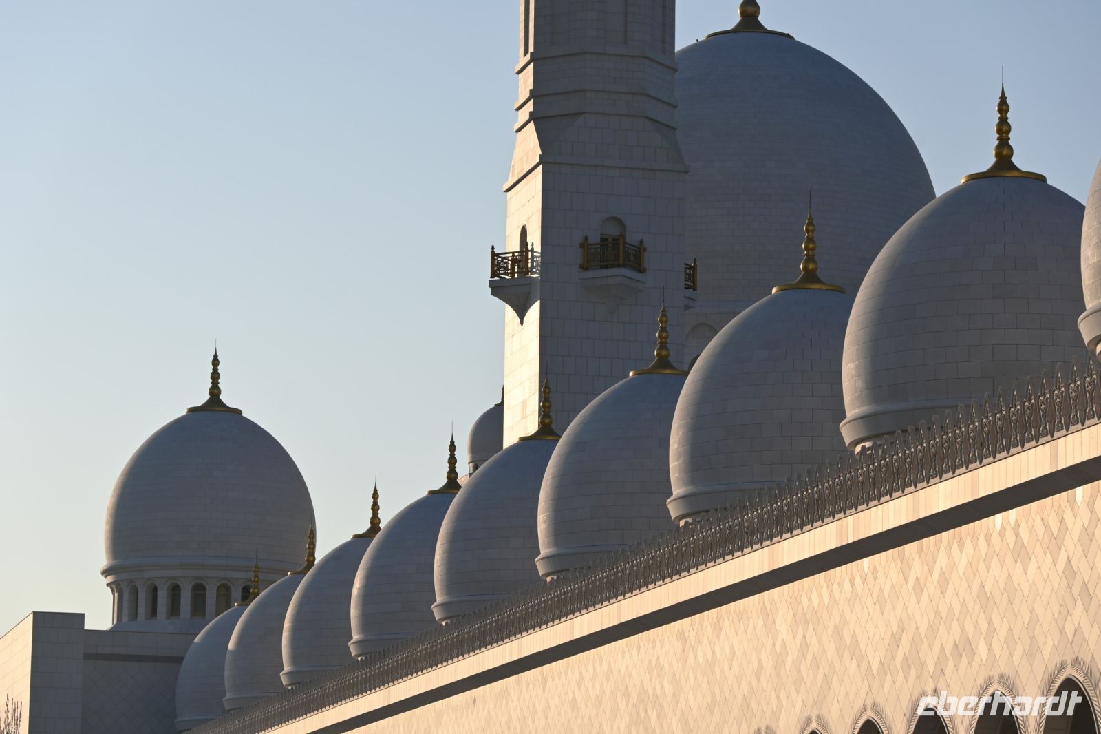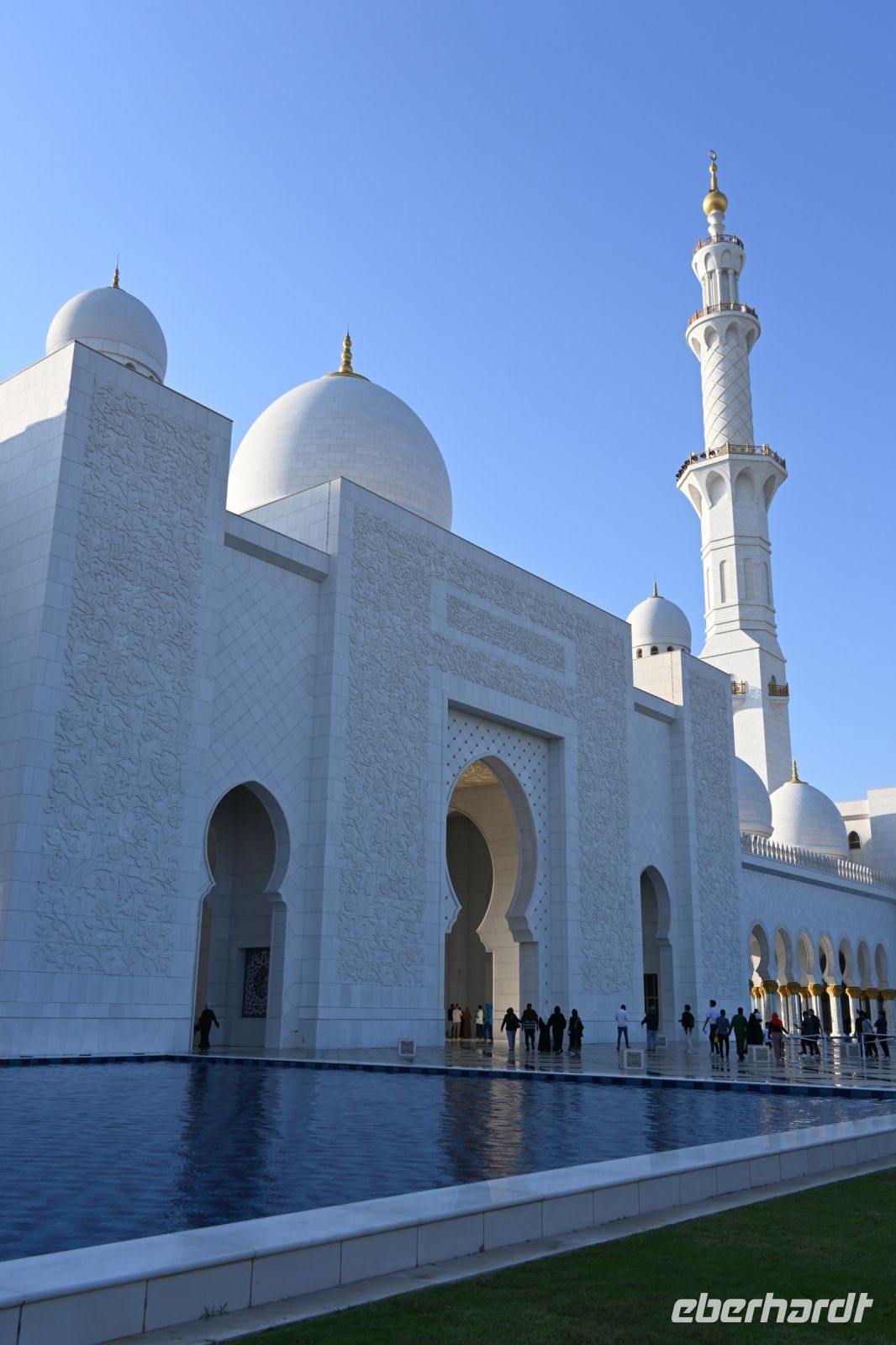 Unser letzter Stopp in Abu Dhabi, führt uns etwas außerhalb der Stadt, zur Scheich Zayed Moschee. Circa 50.000 Menschen finden hier Platz und bereits von weitem kann man das prunkvolle Bauwerk erblicken. Etwas befremdlich für ein Gebetshaus ist der Zugang über ein unterirdisches Einkaufscenter und es gibt Sicherheitskontrollen für das Gepäck. Dann wiederum wird penibel auf die Bekleidung jedes Besuchers geachtet. Für Männer gelten lange Hosen und T-Shirt, die Frauen müssen sich, bis auf Gesicht, Hände und Füße, komplett verhüllen. Wer nix passendes dabei hat, wird in den angrenzenden Läden fündig. Viele Menschen sind auf dem Gelände unterwegs, dabei wird auch streng bewacht, dass keine Kleider- oder Verhaltensvorschriften missachtet werden. Die Moschee gilt als eine der größten der Welt, wurde aus weißem italienischem Marmor gefertigt und mit floralen Mustern, Gold und Perlmutt verziert. Ein besonderer Hingucker ist der 5.600 Quadratmeter größte Teppich im Gebetshaus. Er wurde handgeknüpft und vor Ort aus mehreren Stücken zusammengesetzt.