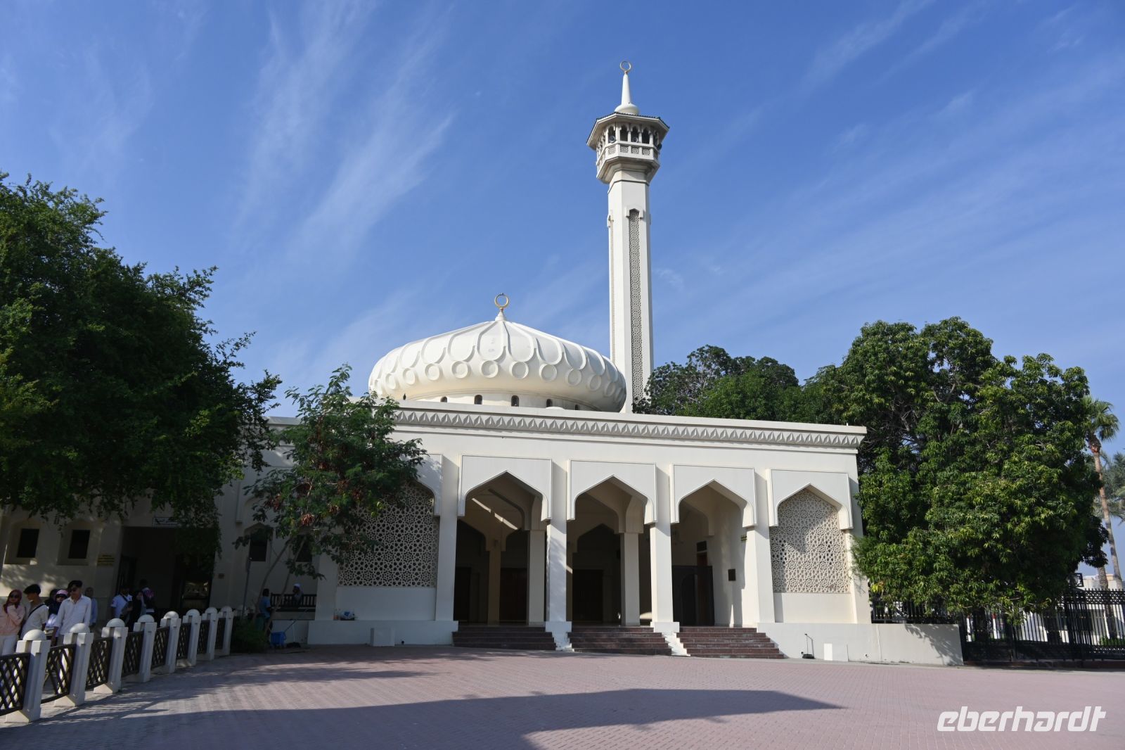 Der Tag startet mit einem abwechslungsreichen Frühstück im Hotel. Wieder werden wir mit dem Bus abgeholt, aber haben nur einen ganz kurzen Weg bis in die Altstadt. Durch die noch leere Fußgängerzone entlang des Creek haben schon einige Läden geöffnet, sie verkaufen Gewürze, Kleidung und Souvenirs. Die Altstadt vereint moderne und von der ursprünglichen Architektur inspirierte Gebäude. Besonders im Teil der nachgebauten Altstadt lernen wir viel über die Ursprünge der Stadt. Von hier aus entwickelte sich damals die Stadt. Erste Familien siedelten sich hier an und lebten vom Perlentauchen und der Fischerei. Noch heute fahren von heute hier die Dhaus, Fischerboote aus Holz, und bringen Waren vorallem in den Iran.