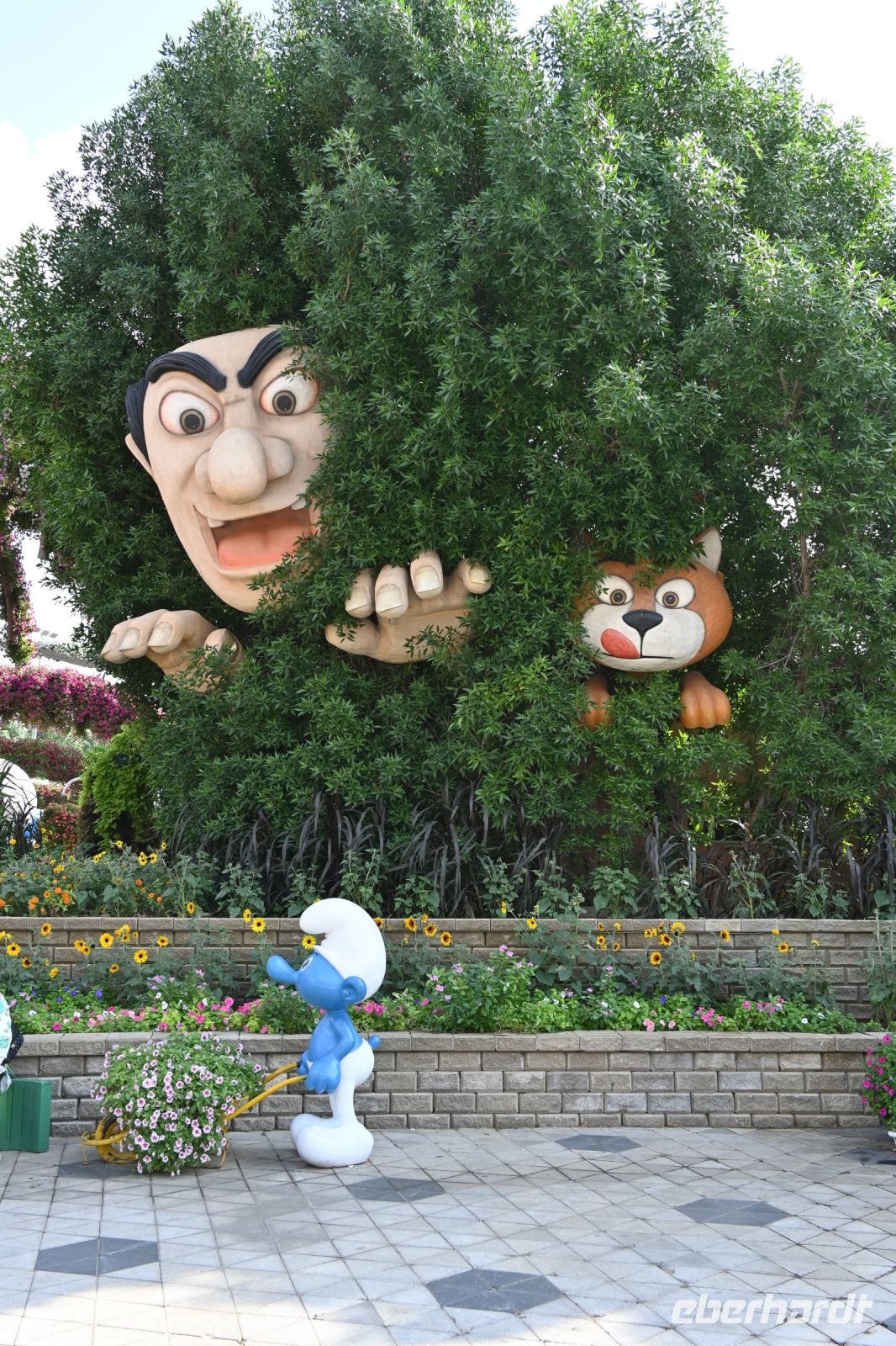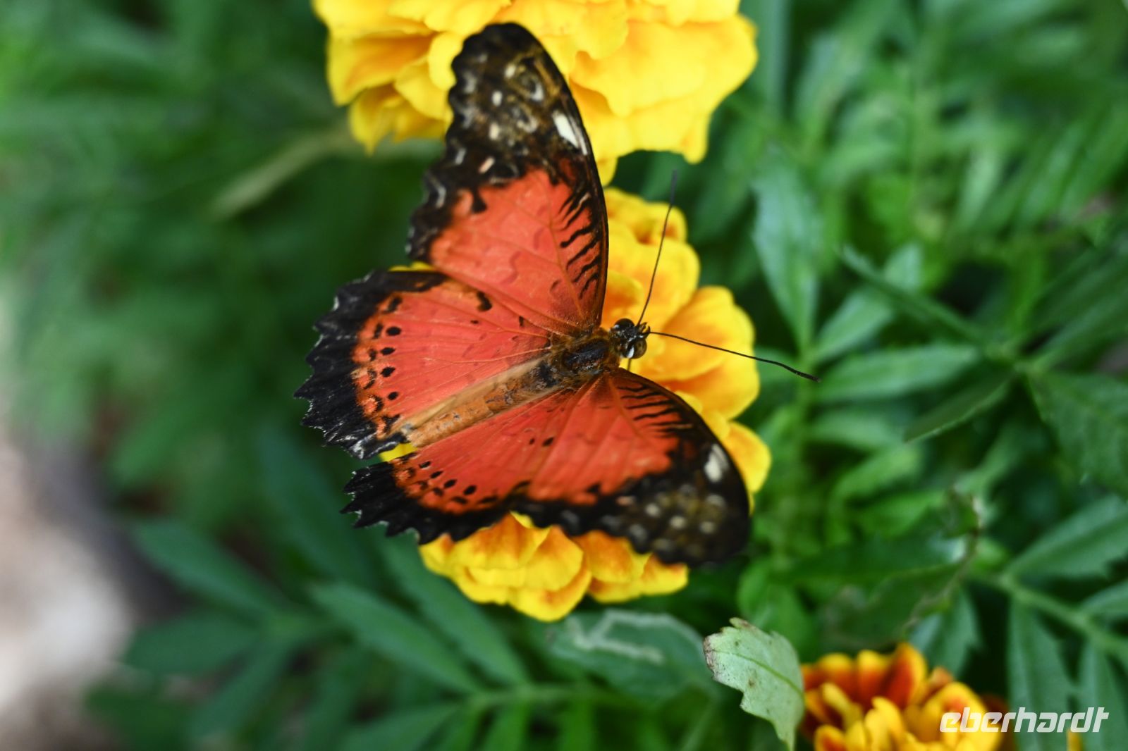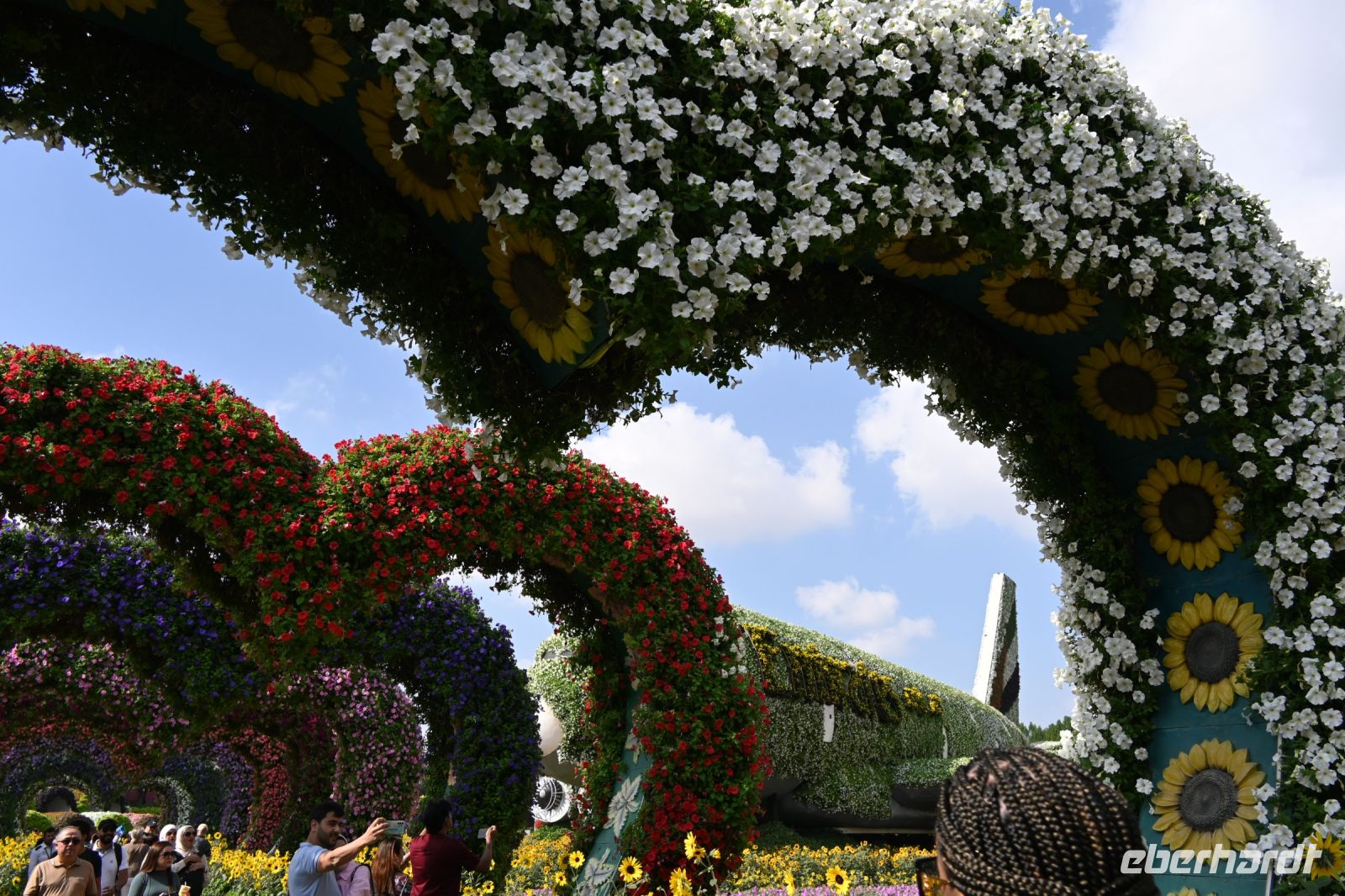 Weiter geht es in die grüne Oase, in den Miracle Garden. auf 72.000 Quadratmetern wurden Millionen von Blumen zu einem schönen Gartenareal mit verschiedenen Themen gepflanzt. In jeder Ecke entdeckt man etwas anderes und nach der grauen Stadt, sind die vielen Farben sehr wohltuend für das Auge. Auch hier hat sich Dubai einige Weltrekorde im Guinness Buch gesichert, so zum Beispiel für das riesige blumige Flugzeug der Emirates Airlines. Gleich im Anschluss und neben dem Miracle Garden, befindet sich der Schmetterlingsgarten. Hier wurden alles überdacht, damit die rund 15.000 Schmetterlinge, die hier in drei Hallen gehalten werden, nicht entwischen können. Im Vergleich zur Außentemperatur ist es hier fast angenehm, nur die Luftfeuchtigkeit wurde ordentlich nach oben geschraubt. Der Schmetterlingsgarten bietet tolle Rundwege und viele Sitzmöglichkeiten, um den kleinen Tieren beim Flattern zuzuschauen. Wer Glück hat, darf auch als Landeplatz herhalten.
