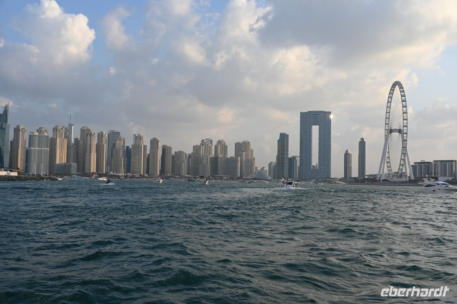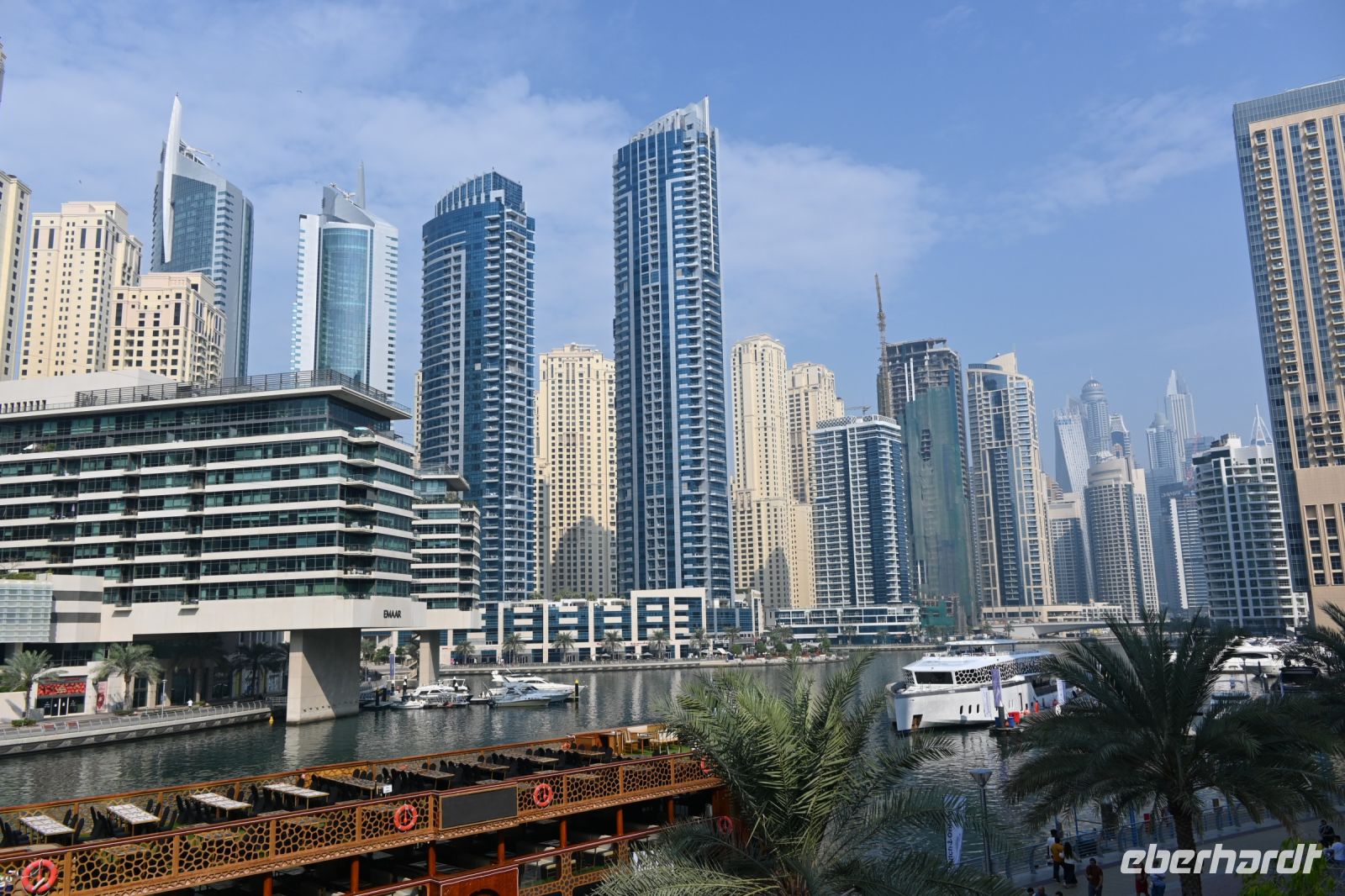Wir kommen nun zum ruhigeren Part des Tages. Der Reisebus bringt und zur Dubai Marina. Ein neu geschaffenes Stadtviertel mit einem künstlich geschaffenen Kanal, welcher zwei Zugänge zum Meer hat. Rund 200 Wolkenkratzer umrahmen den Kanal und es werden jährlich mehr. Direkt am Kanal sind keine Autos erlaubt und man hat einen schönen Rückzugsort mit einer Fußgängerzone entlang des Wassers. Wer sich abkühlen will hat auch den Stand gleich in der Nähe. In einem Restaurant über dem, Kanal kehren wir zum Mittag ein. Danach kommen wir leider schon zum Abschluss unserer Reise. Für uns ist eine kleine aber schöne Yacht gebucht und wir können bei der zweistündigen Rundfahrt einen anderen Blick auf die Stadt genießen.
