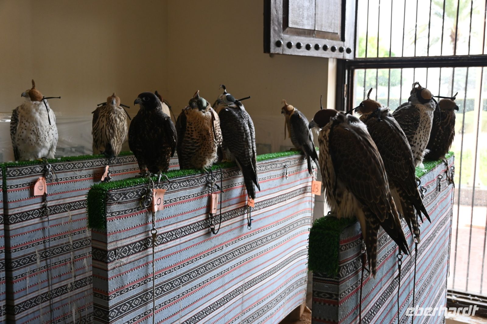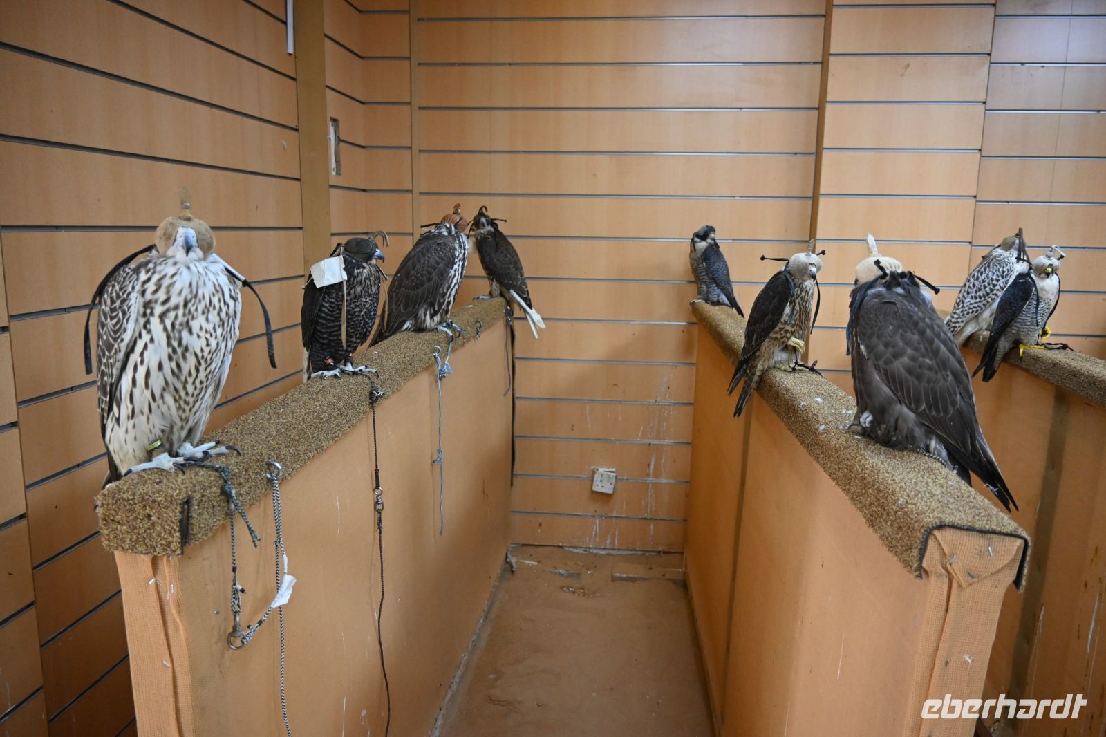 Etwas später als gedacht, kehren wir zum Bus zurück. Nun wollen wir uns doch noch die Stadt von unten angucken. Da an unserem Tag in Abu Dhabi die Falkenklinik leider geschlossen hat, fahren wir nun zu einem Falkencenter am Rand der Stadt. Hier gibt es alles, was das Falknerherz begehrt. Und wer noch keinen Falken hat, wird hier auch fündig. Da es schon einige Jahre verboten ist, wilde Falken zu fangen und auszubilden, werden Zuchtfalken auch hier angeboten. Wer mindestens 2.000 Euro zur Verfügung hat, wird hier fündig. Nachdem mit der Falkenjagd nun viele der gejagten Tiere vom Aussterben bedroht sind, hält man sich die Vogel nur noch als Haustier und Statussymbol.