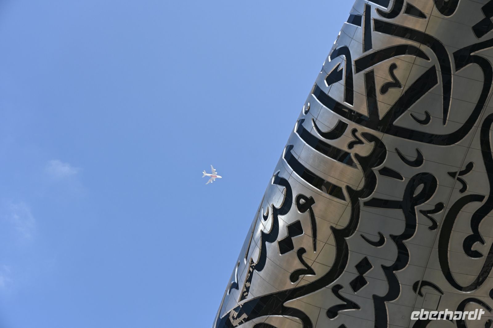 Die Zeit drängt, denn Eberhardt TRAVEL hat sich gemeinsam mit der örtlichen Agentur noch eine Überraschung überlegt. Für die Fahrt zum Future Museum ist eine Limousine bestellt, so können wir in der Stadt noch einige Blicke auf uns ziehen. Einen kurzen Stopp gibt es am Palast des Scheichs, bevor wir vor dem Museum halten.