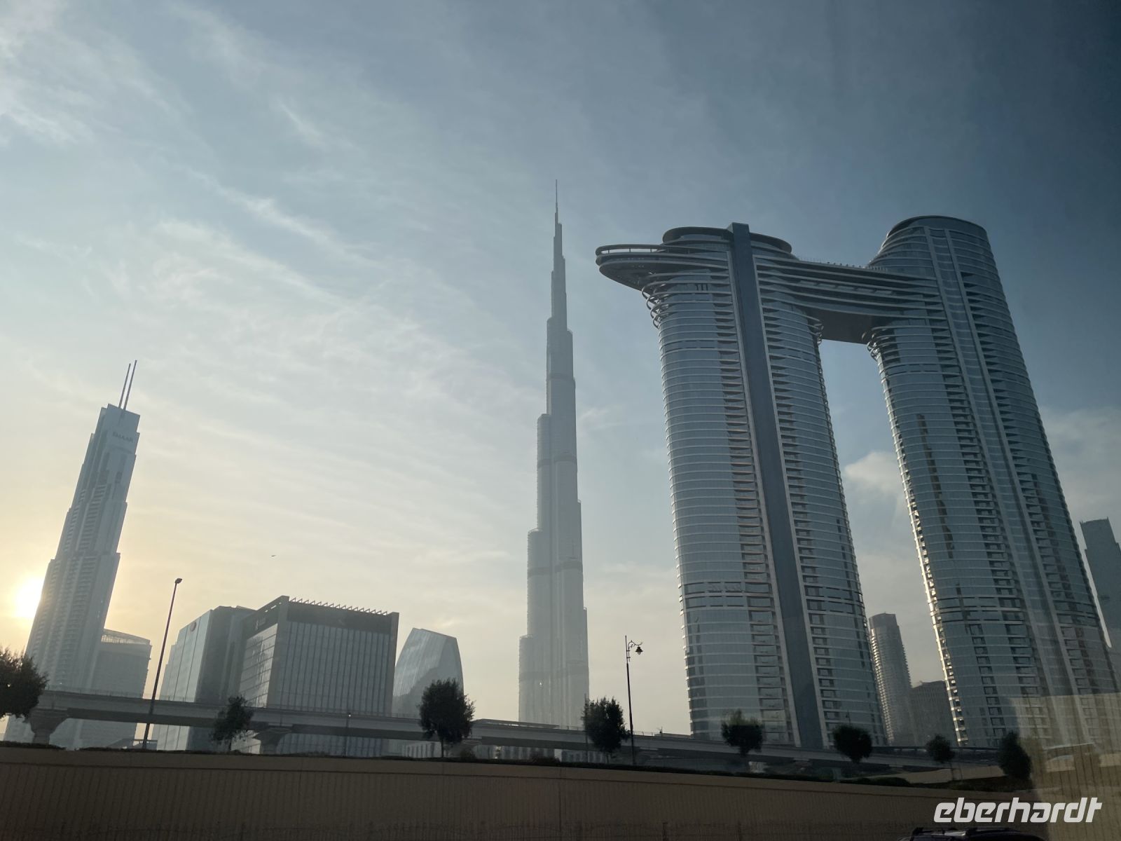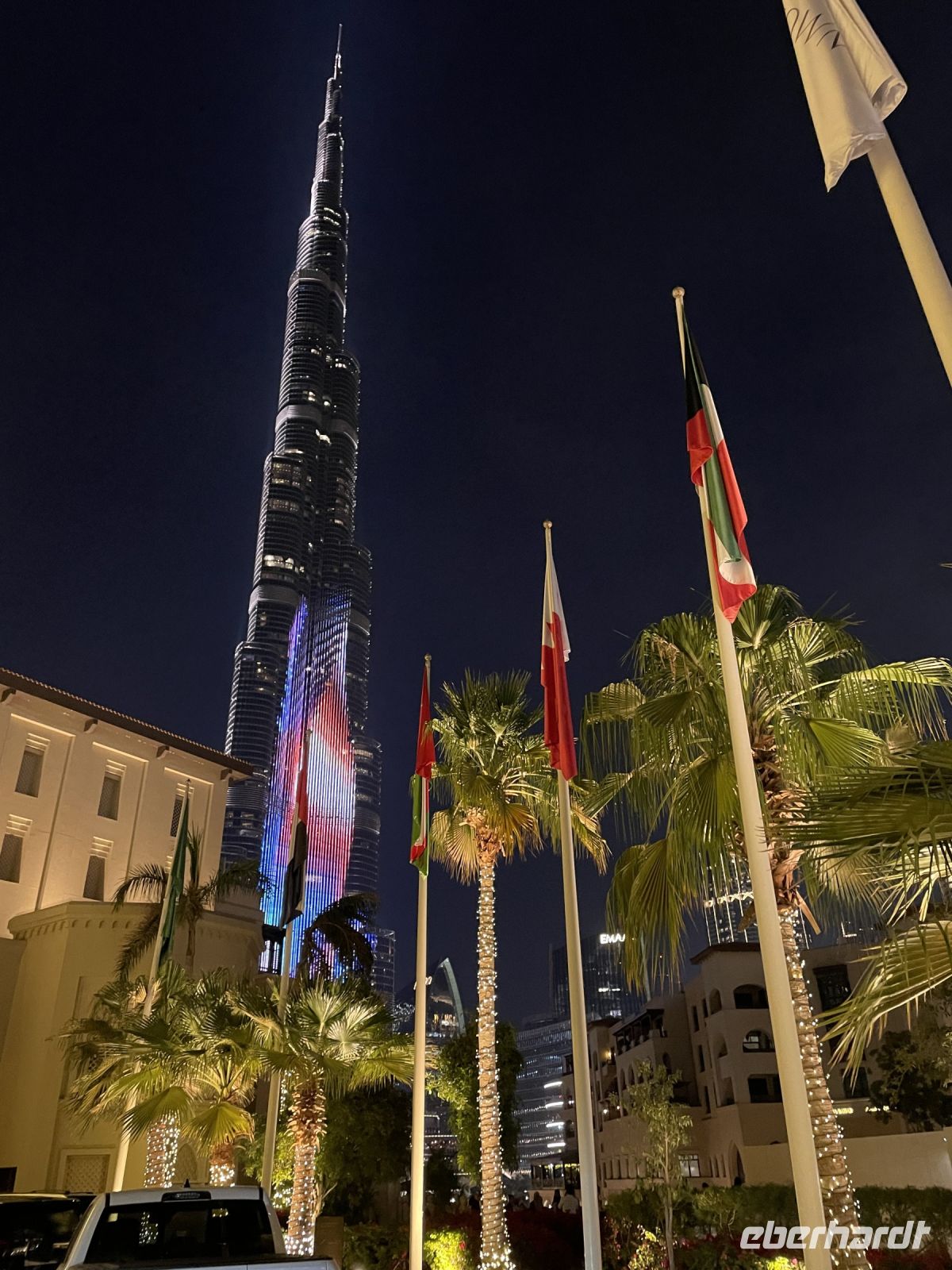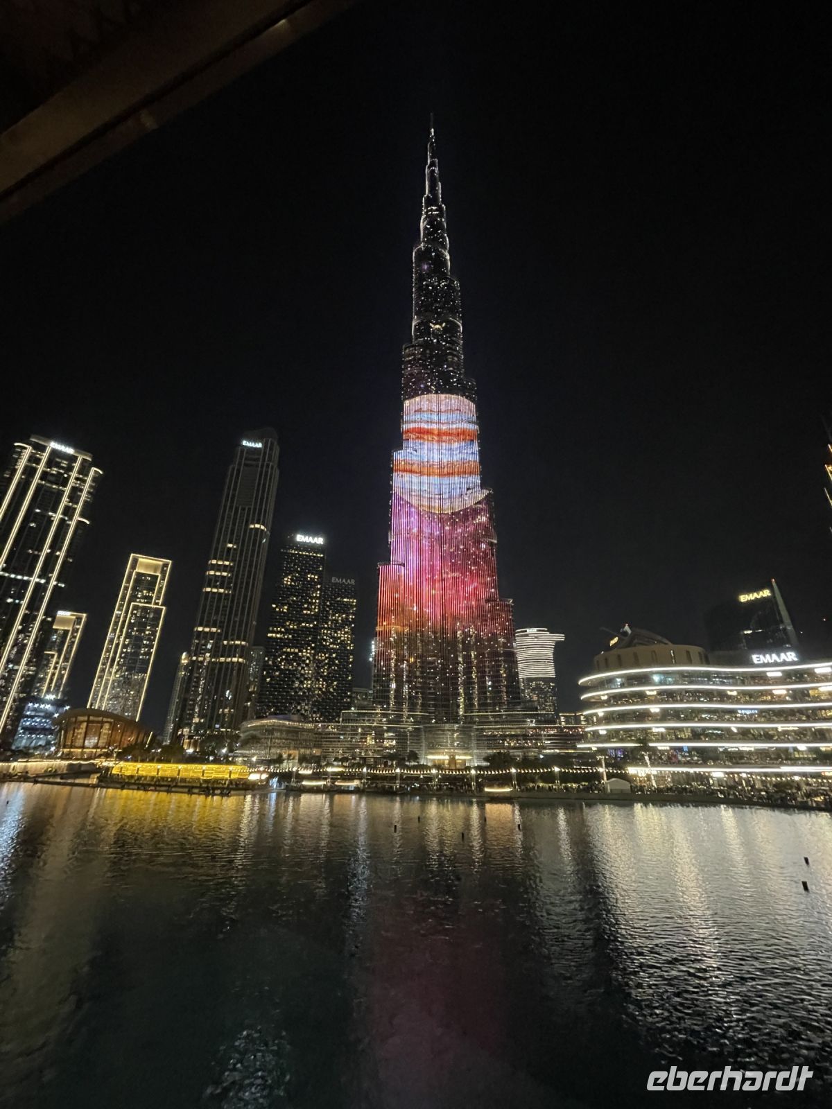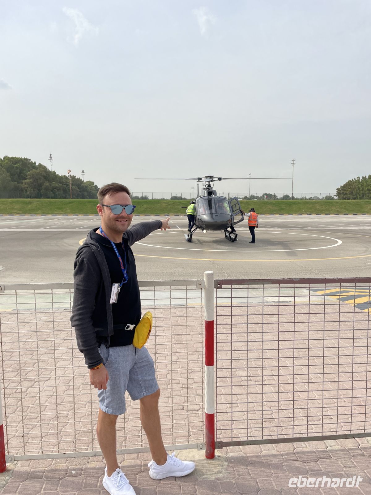 Willkommen im Jahr 2025! Um 11:30 Uhr werden sieben Gäste für den Helikopterflug abgeholt. Nach der Ankunft erfolgt der Check-in mit unserem Reisepass. Nachdem wir das Sicherheitsvideo angeschaut- und die Schwimmwesten angelegt haben, starten wir mit unseren beiden Helikoptern zu einem unvergesslichen Rundflug über Dubai. Um 13:15 Uhr sind alle Teilnehmer wieder sicher gelandet und wir fahren gemeinsam zum Hotel zurück. Um 14:00 Uhr treffen wir uns wieder mit allen anderen Reisegästen. Als Überraschung werden wir mit einer luxuriösen Stretchlimousine abgeholt, was für große Begeisterung sorgt. Den ersten Stopp legen wir am Scheichpalast ein, bevor es weiter zum „Museum of the Future“ geht. Dort angekommen organisiert Reiseleiter Ibrahim für uns die vorbestellten Tickets. Nach etwa einer Stunde Wartezeit erkunden wir die futuristischen Ausstellungen. Als Highlight, erreichen wir gegen Ende eine tolle Aussichtsterrasse, von wo aus wir die imposante Architektur bestaunen können. Alle sind begeistert. Zurück ins Hotel geht es dann schließlich wieder mit unserem normalen Reisebus. Im Hotel angekommen, haben wir eine Stunde Zeit, um uns frisch zu machen. Die meisten Gäste gehen abends mit mir ins Restaurant „Skafos“, gleich um die Ecke vom Hotel essen, wo ich für uns alle einen Tisch reserviert habe. Wir sitzen draußen, wo es allerdings an diesem Tag etwas windig und kühl ist. Trotzdem genießen alle das hervorragende Essen. Gegen 21:00 Uhr breche ich mit vier Gästen zu einer zusätzlichen Unternehmung auf: Wir fahren ins „Address Skyview Hotel“, von der aus wir eine beeindruckende Aussicht vom Rooftop-Pool auf den Burj Khalifa genießen. Um 22:45 Uhr fahren wir wieder hinunter und unternehmen noch einen gemütlichen Spaziergang durch Downtown Dubai. Gegen 23:15 Uhr kehren wir mit einem Taxi zum Hotel zurück und fallen hundemüde ins Bett.