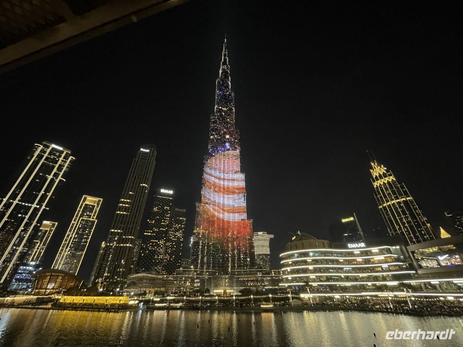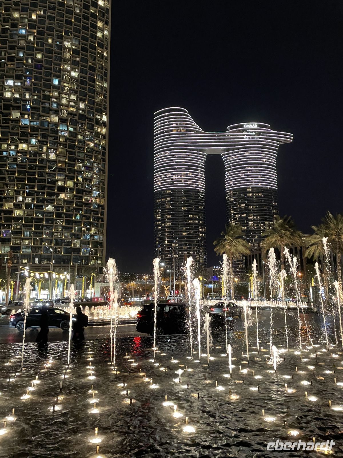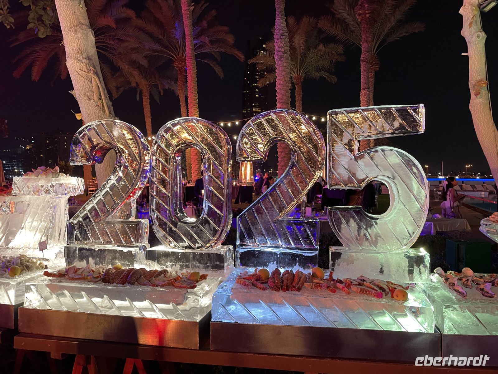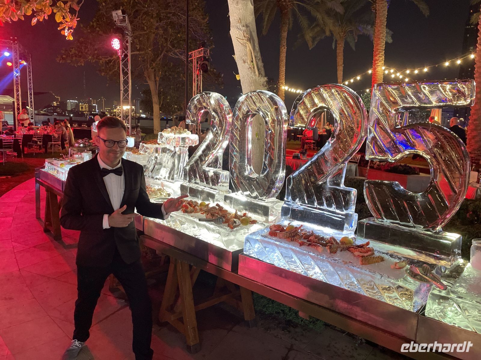 An unserem heutigen freien Tag können alle in Ruhe ausschlafen. Bis zum Treffpunkt am frühen Abend für die Silvesterfeier steht eine individuelle Ausgestaltung des Nachmittags auf dem Plan. Einige Reisegäste fahren jedoch mit mir in Richtung Dubai Marina. Hinzu nehmen wir die Metro und rückzu ein Taxi. Wir besuchen das Dubai Riesenrad, spazieren zum Adress Beach Hotel und gehen danach am JBR Strand Baden. Am späten Nachmittag erreichen wir wieder unser Hotel und haben noch etwas Freizeit bis wir wieder abgeholt werden. Um 19:30Uhr treffen wir uns wieder in der Lobby. Der Dresscode für unsere Silvesternacht lautet – Silber&Black. Dort angekommen, trinken wir erst einmal einen Begrüßungs-Sekt und begeben uns zu unseren Tischen im Außenbereich, wo uns nicht nur ein imposantes Buffet mit Lobster, Kaviar, Wagyu-Beef uvm. sondern auch ein einmaliges Show Programm geboten wird. Wir sitzen an einem großen Tisch und genießen Speiß- & Trank. Um 00:00Uhr heißt es… 3,2,1 – frohes neues Jahr! Das Feuerwerk ist einfach gigantisch! Alle sind begeistert! Nun geht die Party richtig los, mit Livemusik und einem DJ.